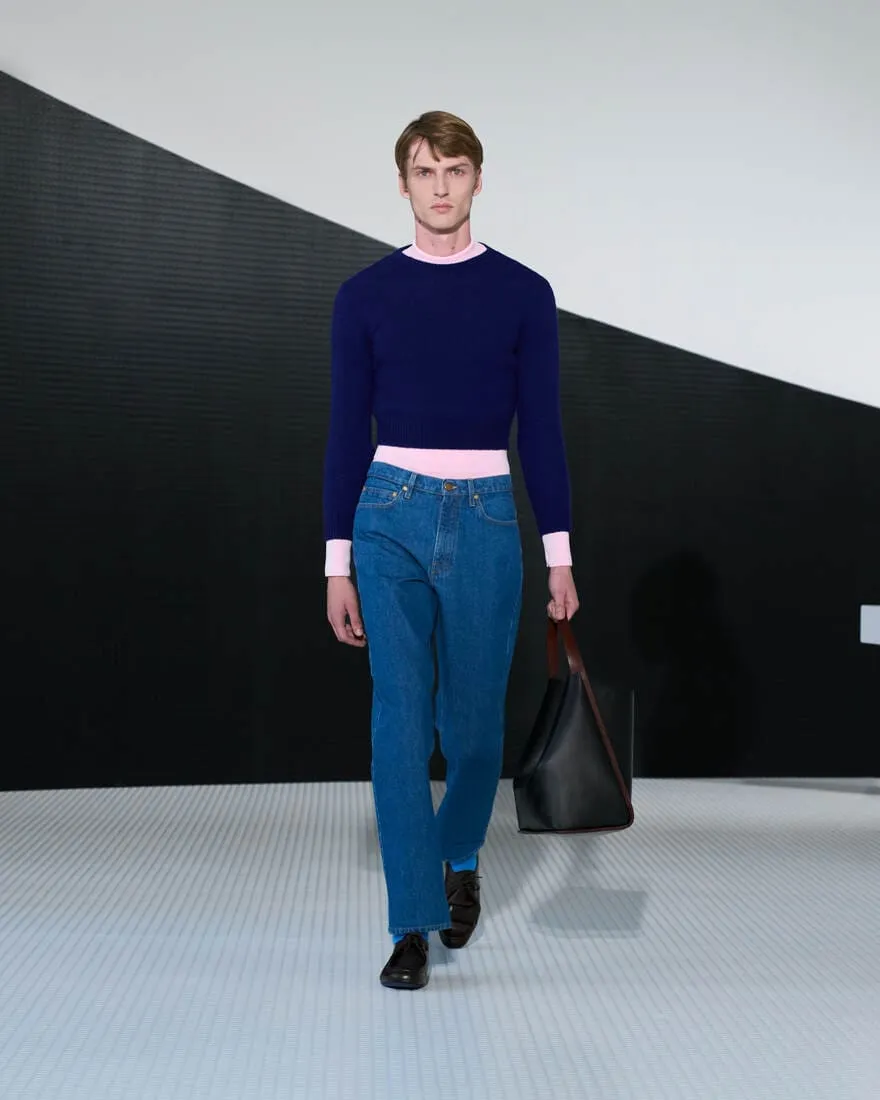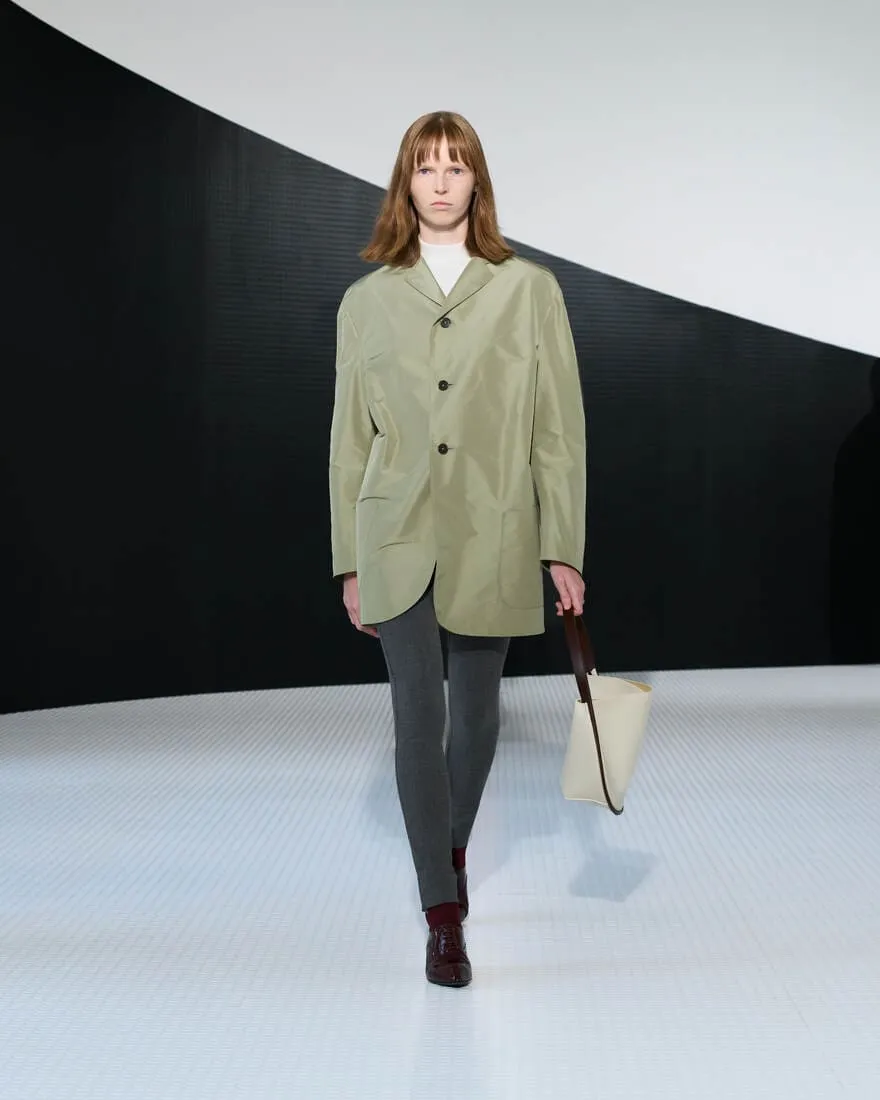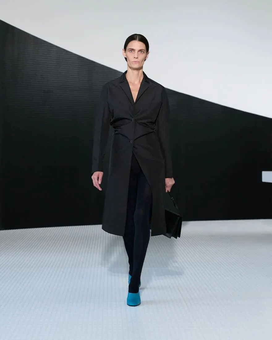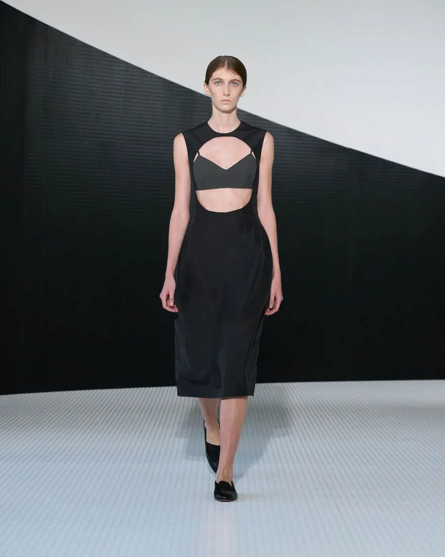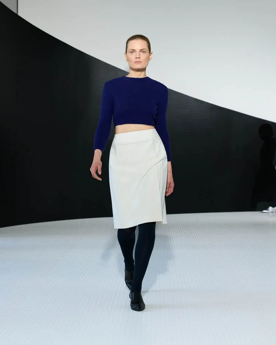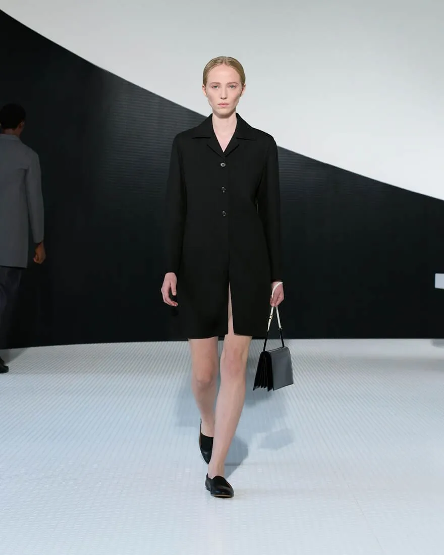 Dans l'ancien cinéma devenu siège de Jil Sander, baigné de blanc et traversé par une ligne noire, Simone Bellotti orchestre une collection printemps-été 2026 comme un acte fondateur. Ici, l'élégance se cherche, se questionne, se déconstruit. Le décor, minimal et vibrant, relie Castello à la modernité, Milan à Hambourg, dans une ambiance sonore signée Bochum Welt. Chaque silhouette verticale, chaque matière - cuir double face, georgette, laine architecturale - devient une page tournée, une réponse provisoire à des questions essentielles : peut-on ajouter en retirant ? La rigueur peut-elle cohabiter avec la grâce ? La collection, miroir entre féminin et masculin, joue sur les contrastes : tension et calme, transparence et protection, fleurs frivoles et armures modernes. Les coupes sont précises, parfois brisées par un ourlet brut ou un pli inattendu. Les accessoires - ballerines ajourées, sacs Pivot, brogues à talons - prolongent cette quête de sens et de forme. C'est une mode qui avance en posant des questions, qui célèbre la pureté non comme une limite, mais comme un langage. Une esthétique studieuse, tactile, où chaque couture est une pensée, chaque vêtement une hypothèse.