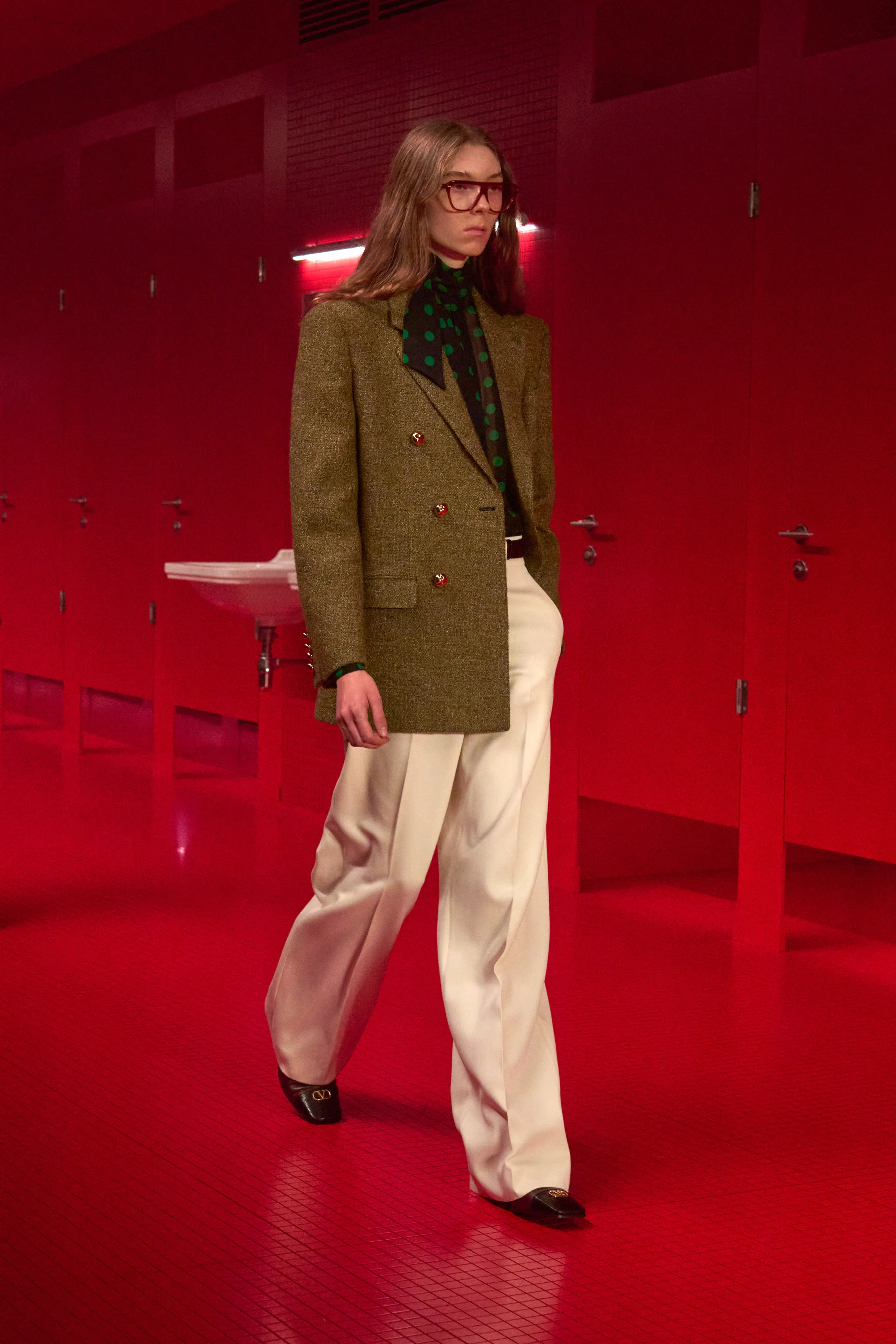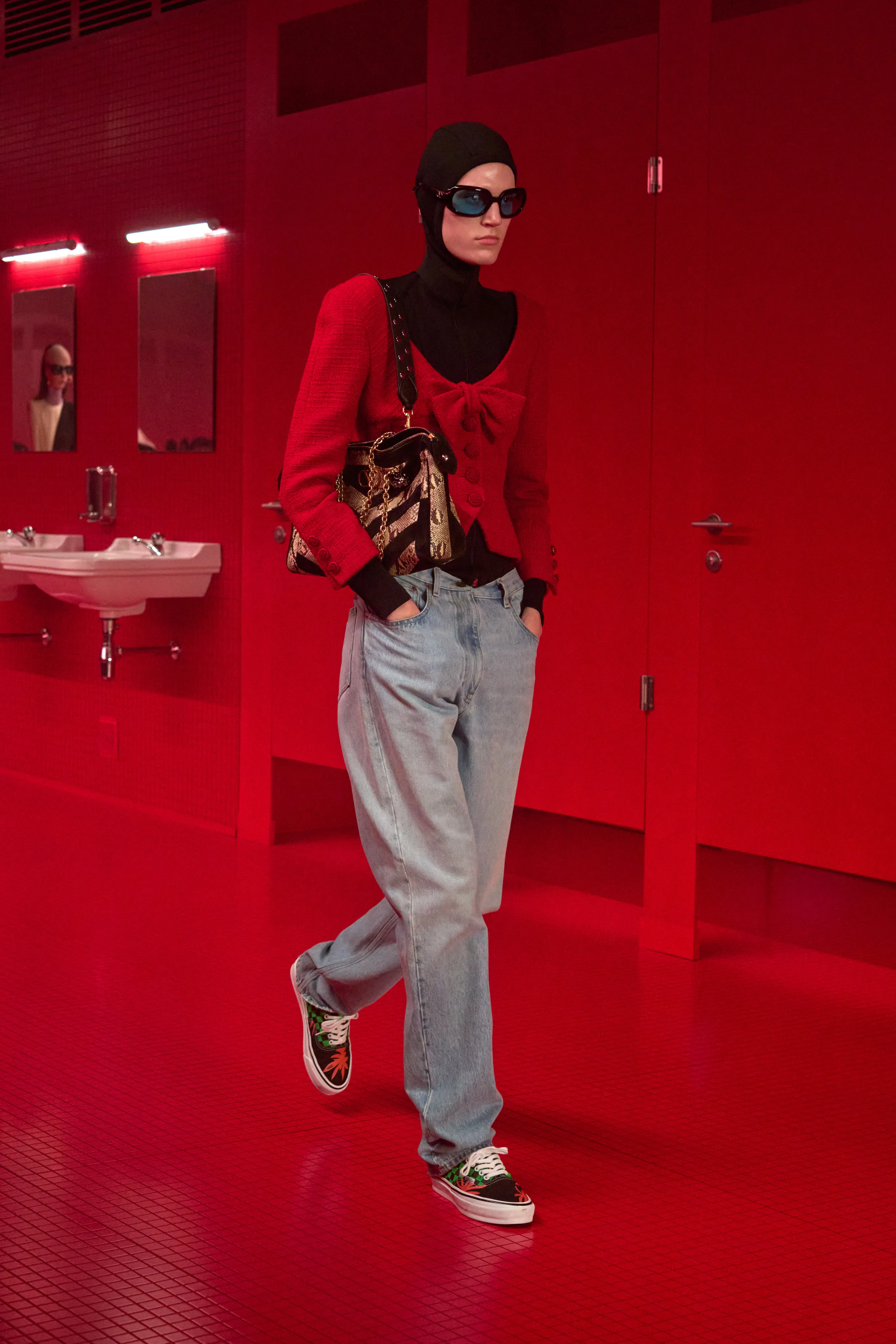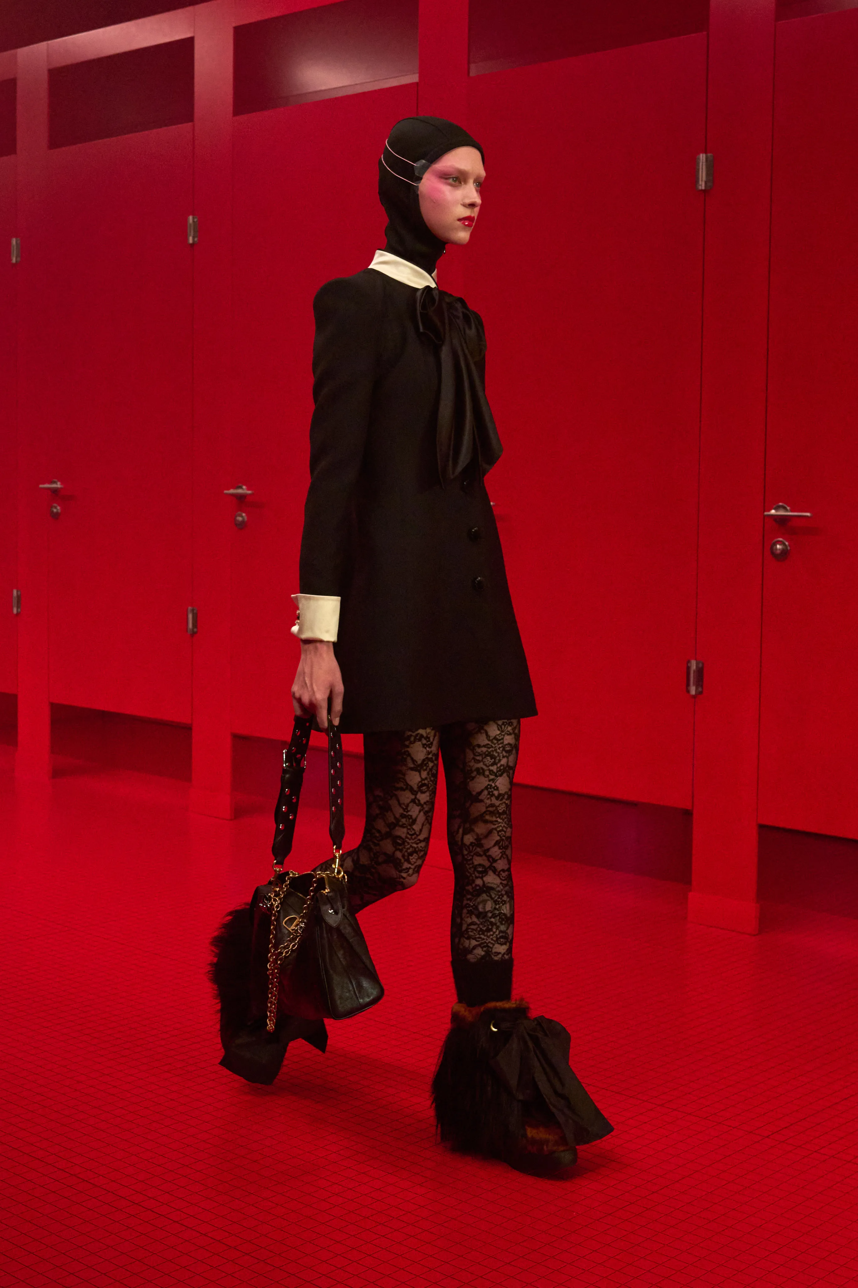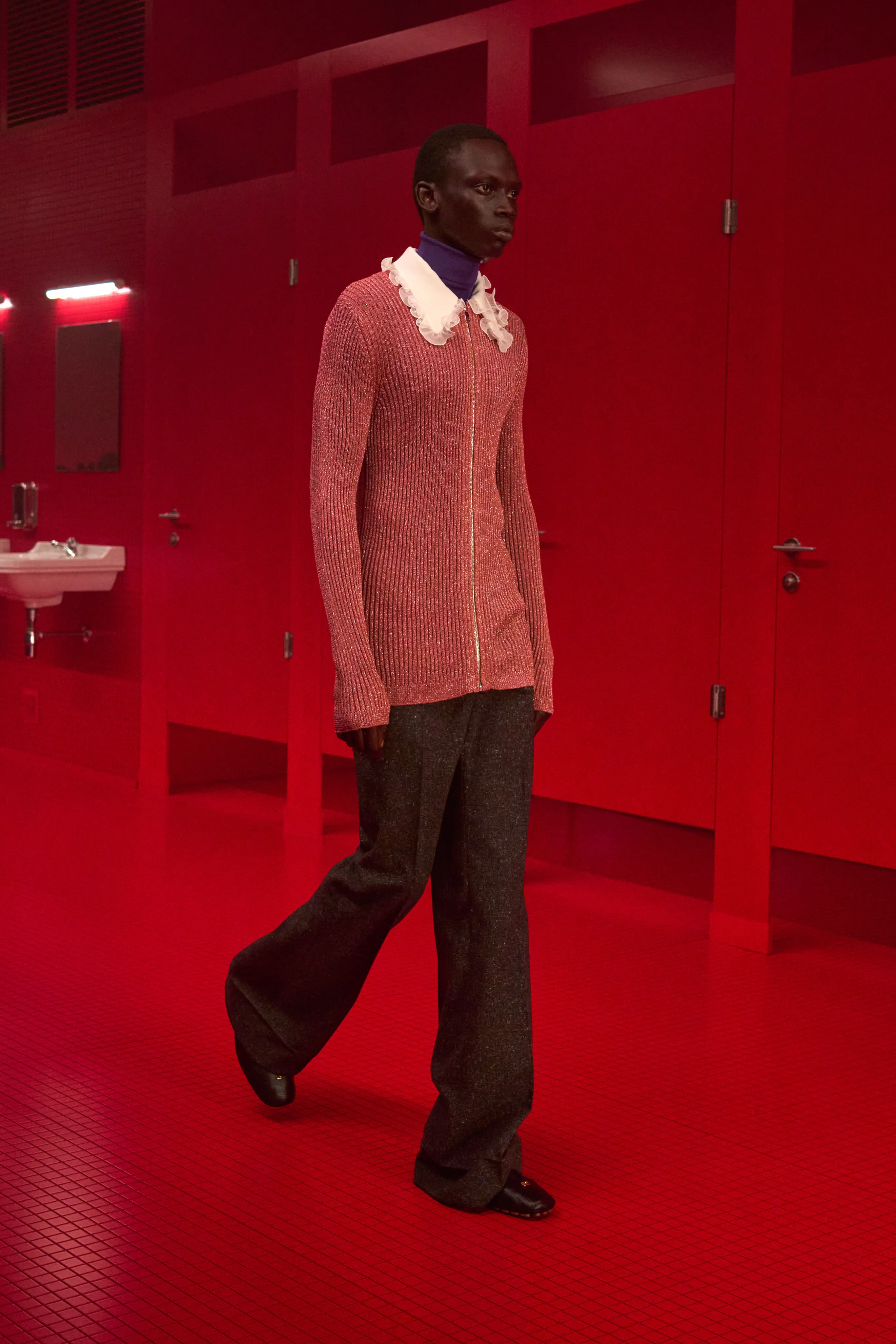 Pour cette collection de prêt à porter de maison Valentino, le directeur artistique Alessandro Michele dévoile une ambiance rouge Rosso. Le styliste italien a imaginé des toilettes publiques. Un lieu qui neutralise et suspend le dualisme entre intérieur et extérieur, entre ce qui est intime et ce qui est exposé, entre le personnel et le collectif, entre profondeur et surface. Une dimension "méta-théâtrale", dirait-il, explicitant cet espace-temps comme un lieu de coulisses présent dans le théâtre de l’existence. Cet endroit a cette dimension autonome à l’égard de la codification rigide des normes dans lequel l’intimité renaît entre habillement et déshabillement. 80 silhouettes déambulent vêtues de pièces aussi baroques qu’opulentes. Cagoules, dentelles ou cols montants répondent à la saison hivernale sous les notes des morceaux de l’artiste Lana Del Rey.