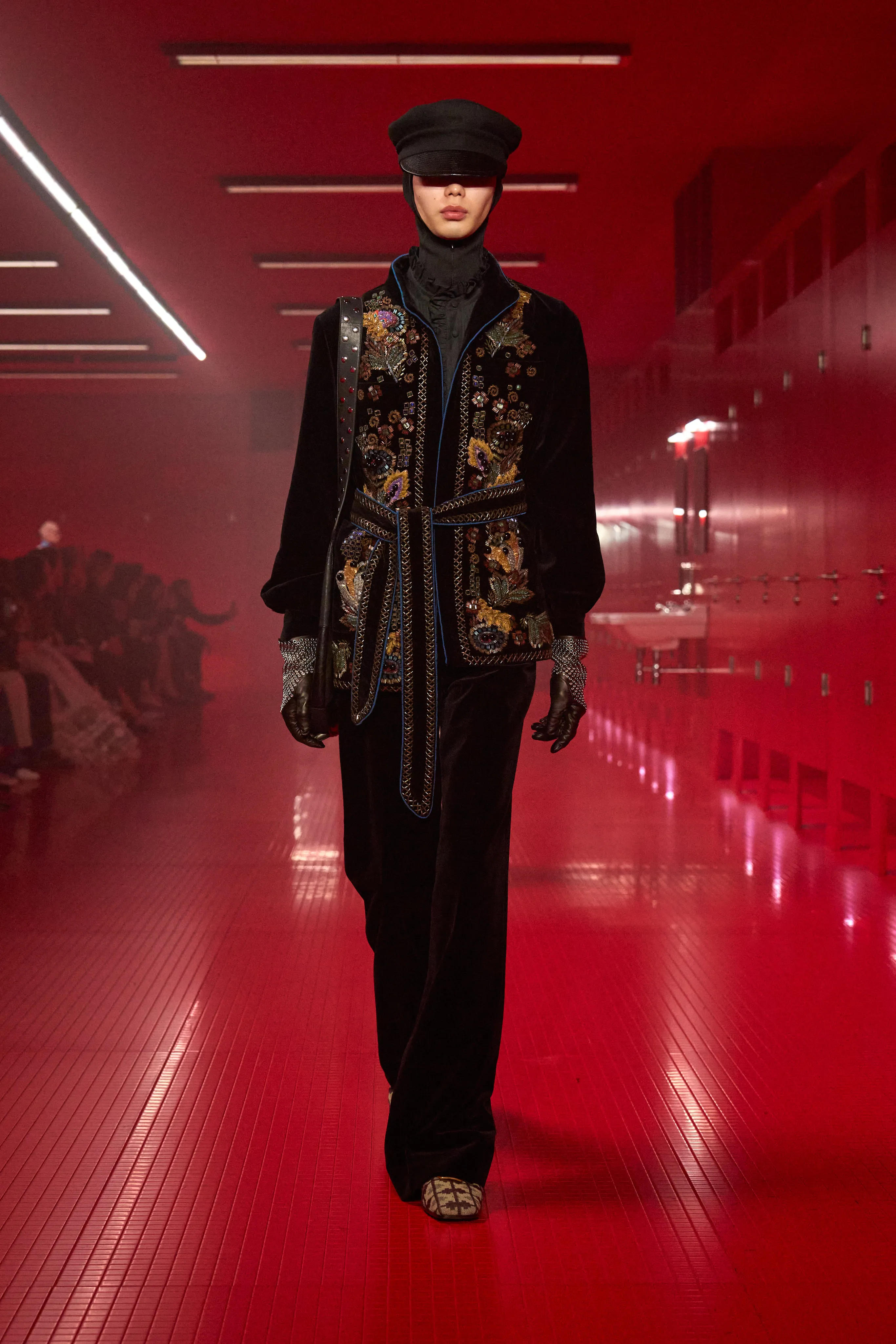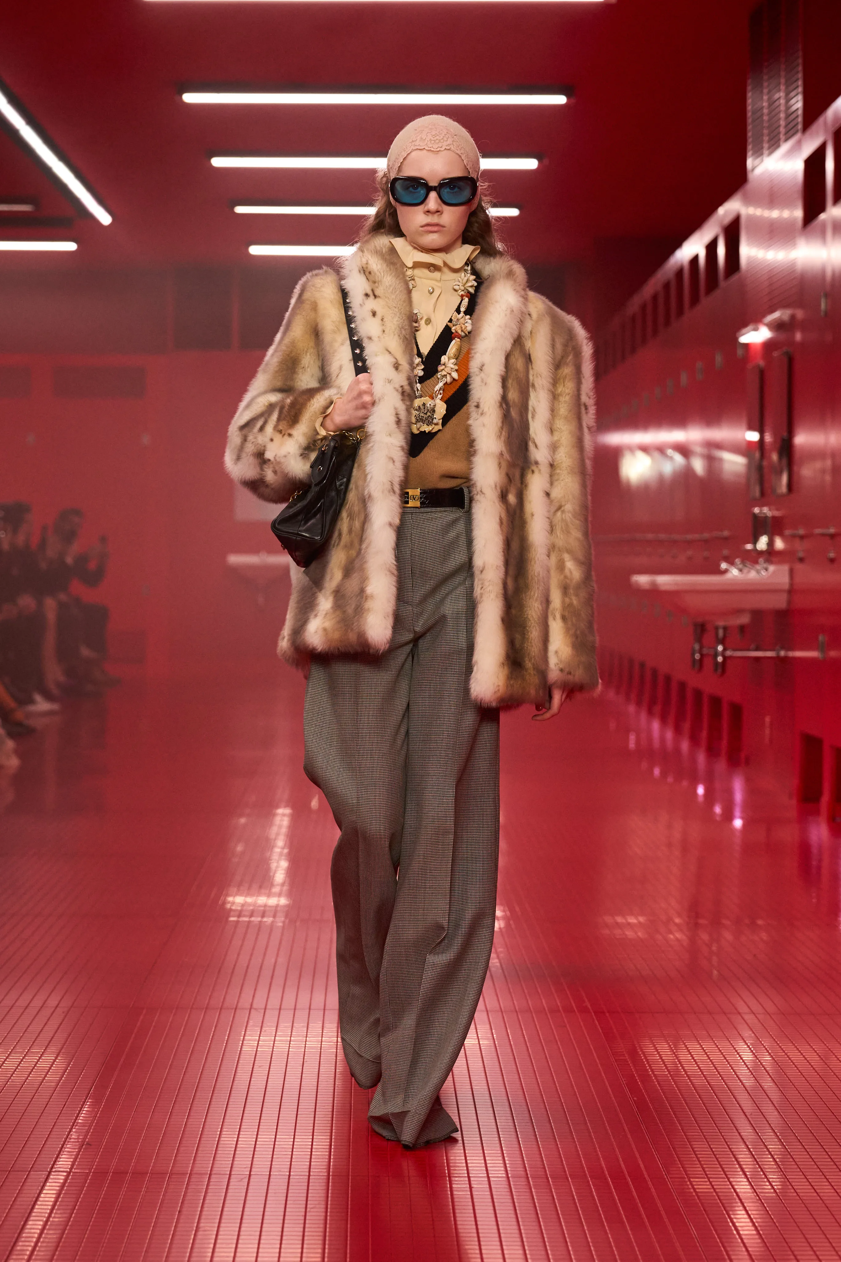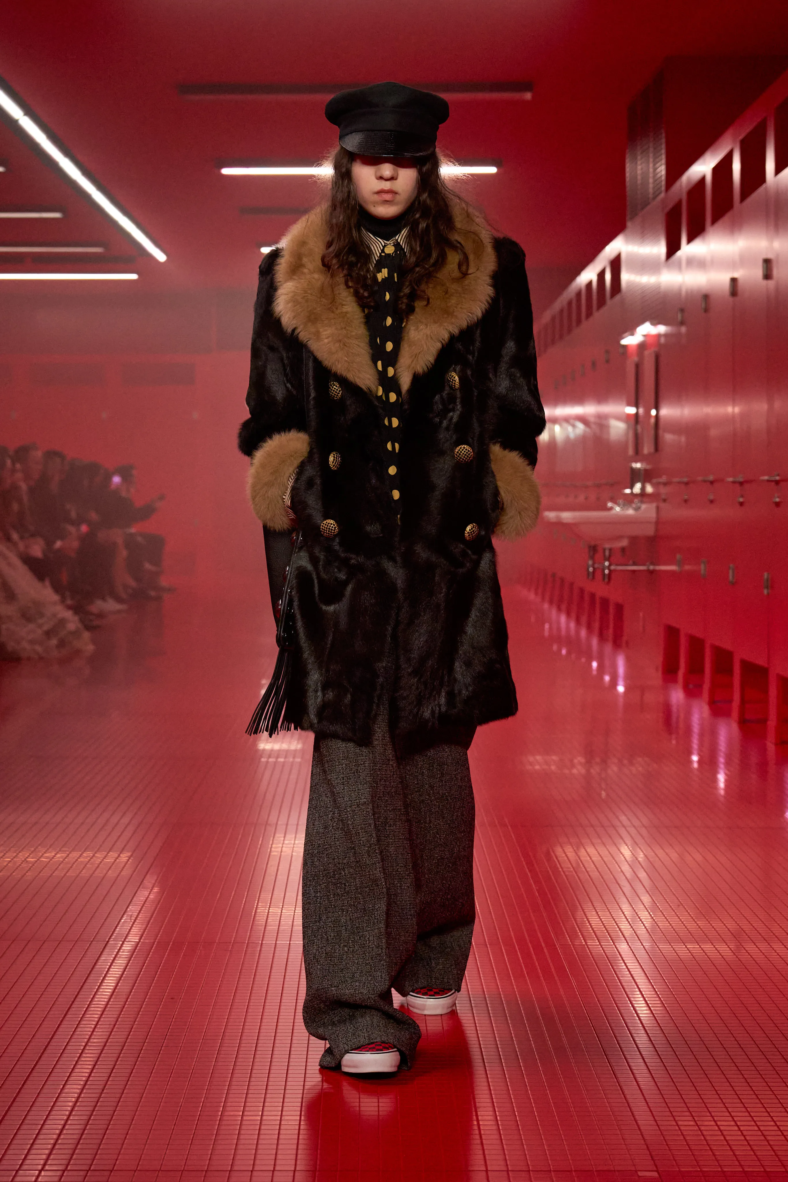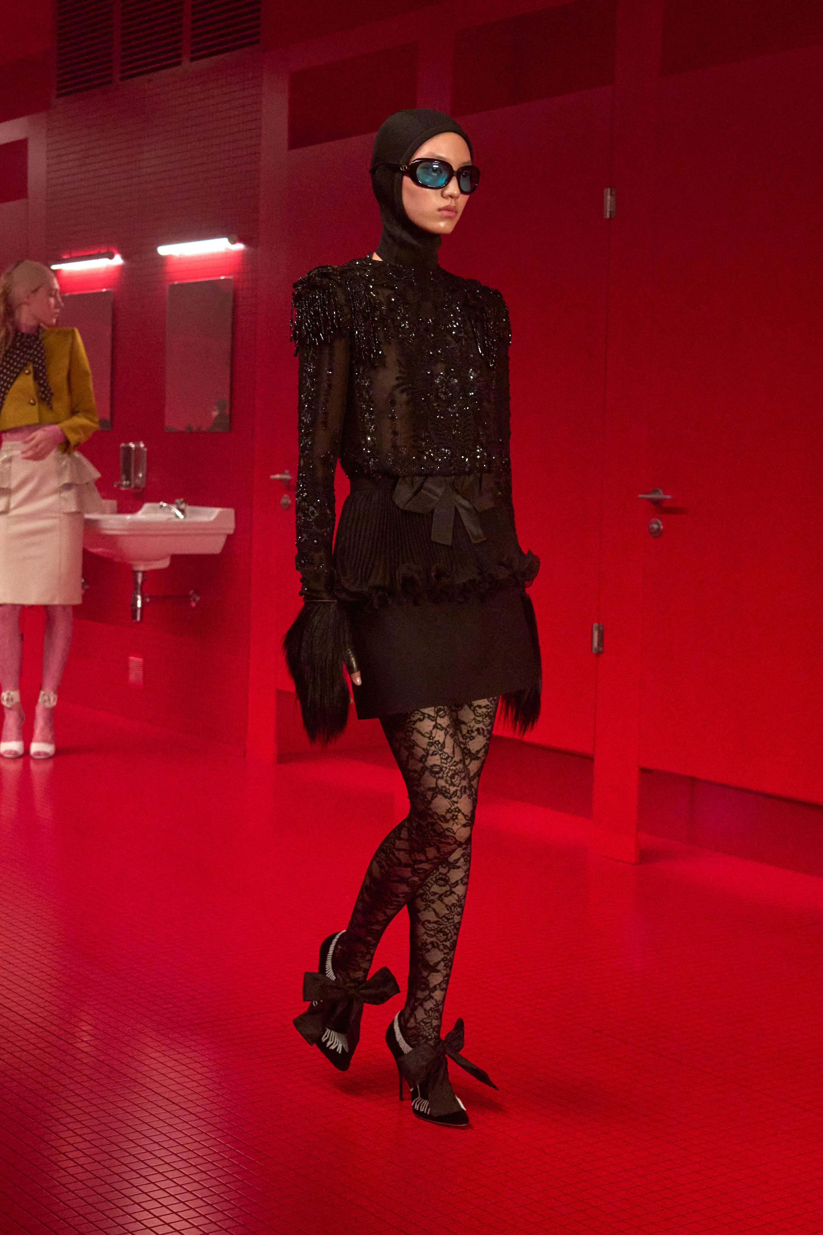 Pour cette collection de prêt à porter de maison Valentino, le directeur artistique Alessandro Michele dévoile une ambiance rouge Rosso. Le styliste italien a imaginé des toilettes publiques. Un lieu qui neutralise et suspend le dualisme entre intérieur et extérieur, entre ce qui est intime et ce qui est exposé, entre le personnel et le collectif, entre profondeur et surface. Une dimension "méta-théâtrale", dirait-il, explicitant cet espace-temps comme un lieu de coulisses présent dans le théâtre de l’existence. Cet endroit a cette dimension autonome à l’égard de la codification rigide des normes dans lequel l’intimité renaît entre habillement et déshabillement. 80 silhouettes déambulent vêtues de pièces aussi baroques qu’opulentes. Cagoules, dentelles ou cols montants répondent à la saison hivernale sous les notes des morceaux de l’artiste Lana Del Rey.