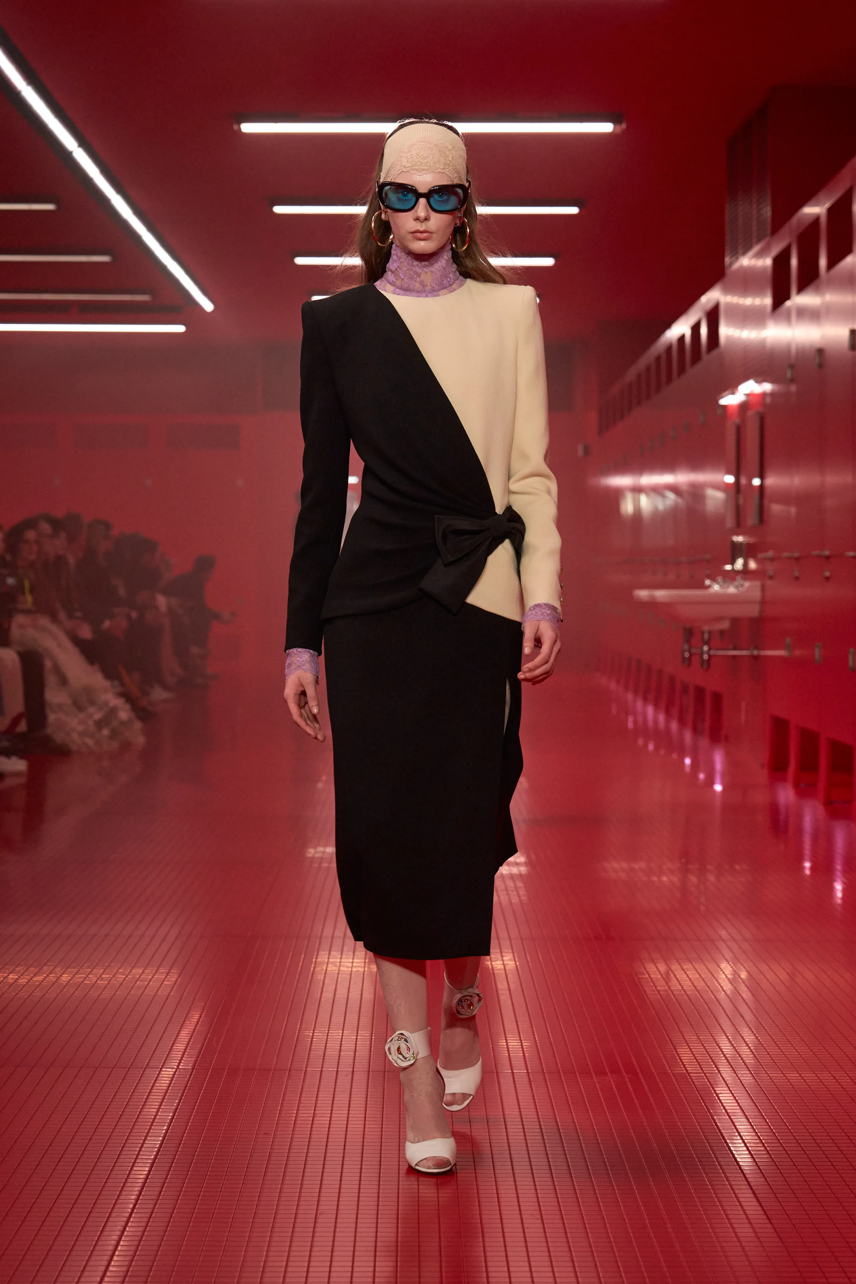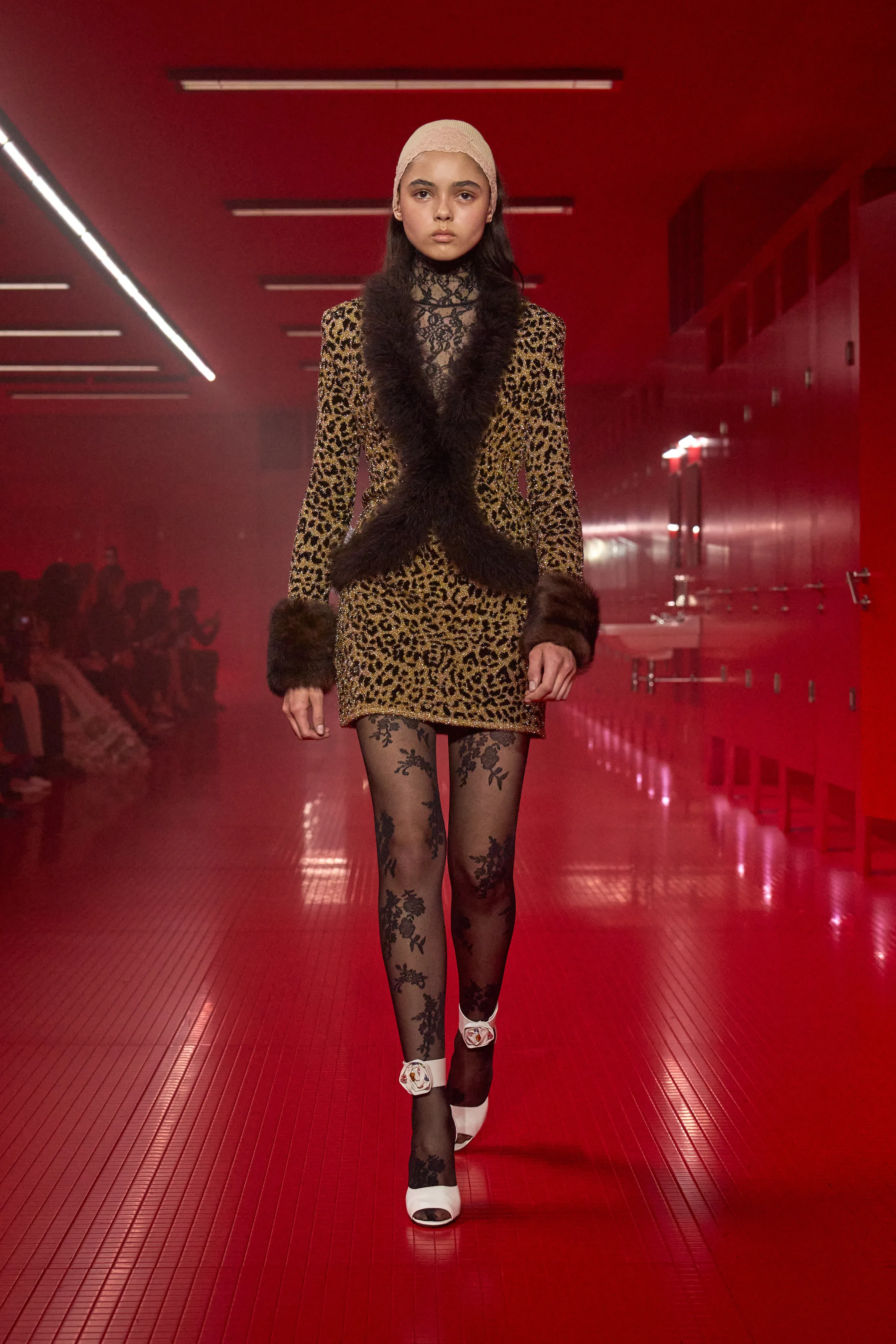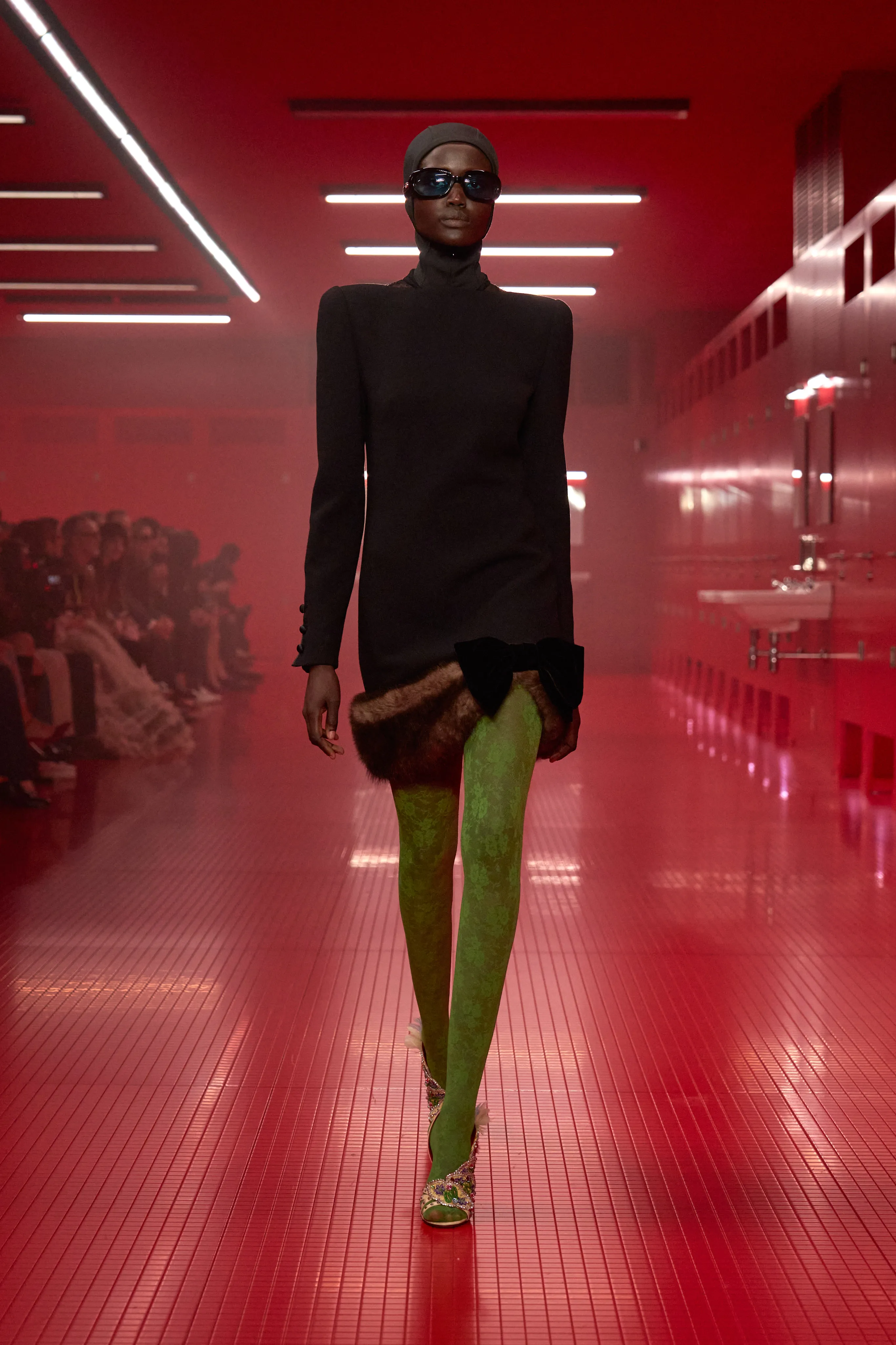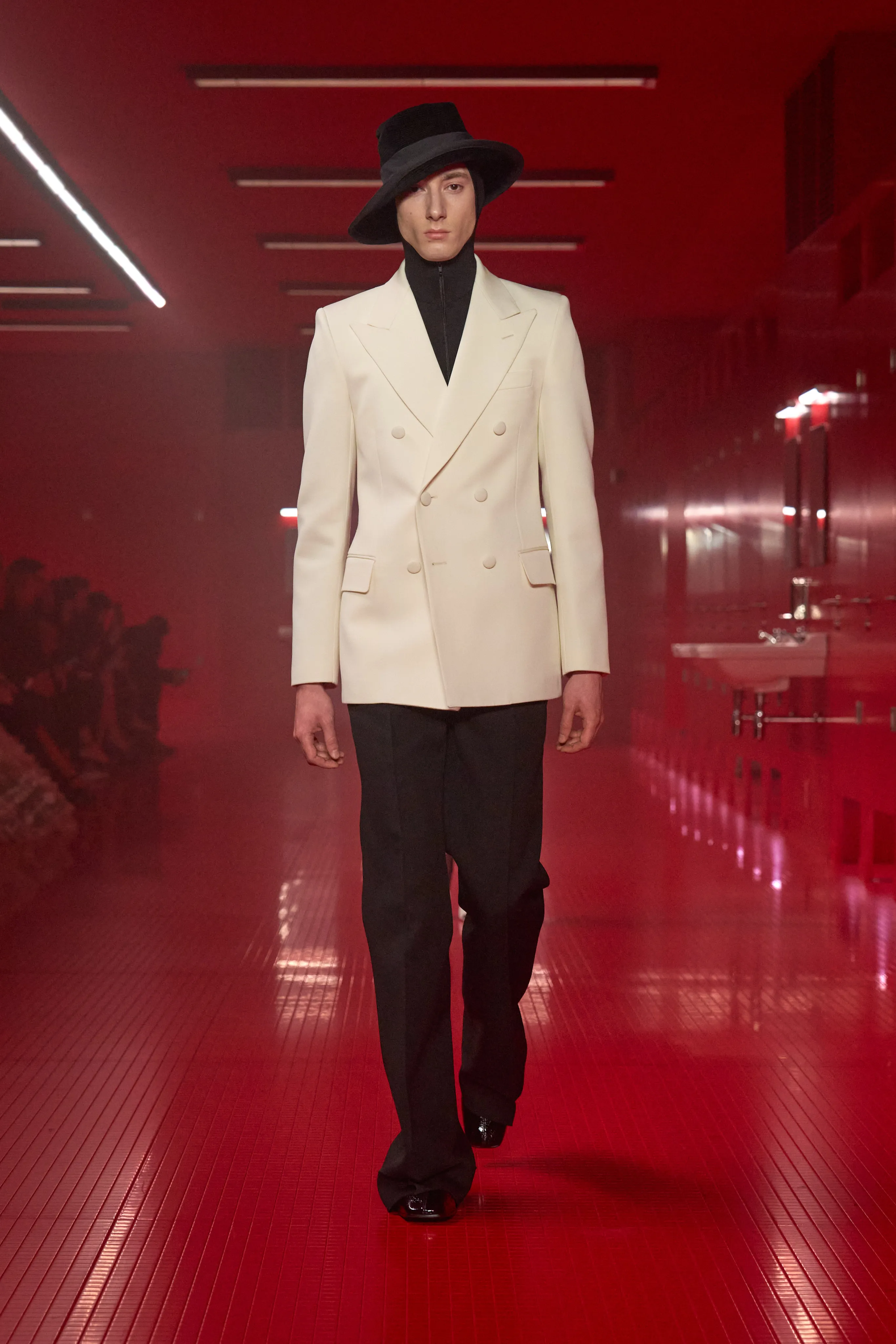 Pour cette collection de prêt à porter de maison Valentino, le directeur artistique Alessandro Michele dévoile une ambiance rouge Rosso. Le styliste italien a imaginé des toilettes publiques. Un lieu qui neutralise et suspend le dualisme entre intérieur et extérieur, entre ce qui est intime et ce qui est exposé, entre le personnel et le collectif, entre profondeur et surface. Une dimension "méta-théâtrale", dirait-il, explicitant cet espace-temps comme un lieu de coulisses présent dans le théâtre de l’existence. Cet endroit a cette dimension autonome à l’égard de la codification rigide des normes dans lequel l’intimité renaît entre habillement et déshabillement. 80 silhouettes déambulent vêtues de pièces aussi baroques qu’opulentes. Cagoules, dentelles ou cols montants répondent à la saison hivernale sous les notes des morceaux de l’artiste Lana Del Rey.