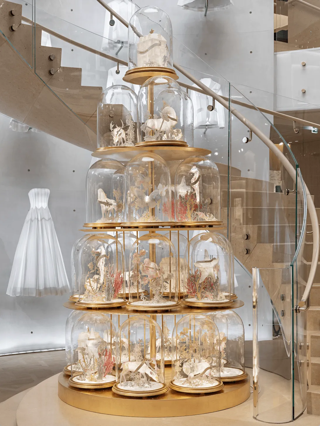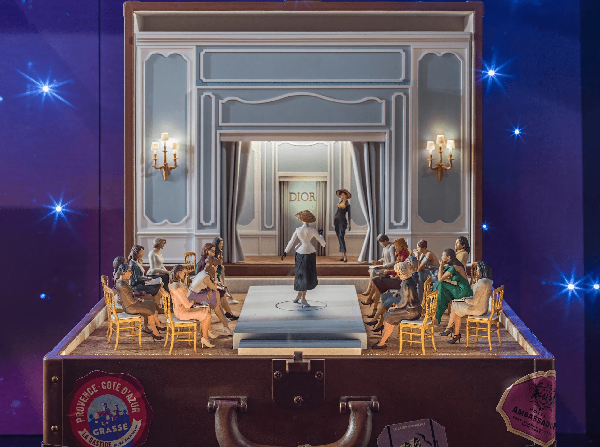 À l’approche des fêtes de fin d’année, l’adresse historique de la maison s’illumine d’éblouissantes animations reflétant la fabuleuse odyssée de Dior, fusionnant héritage unique et fascinantes innovations. Telle une invitation aux rêves et à l’évasion, la façade du 30 Avenue Montaigne se pare de joyeuses horloges à coucou ; une atmosphère enchantée, magnifiée de mille et un scintillements. Ces installations envoûtantes font rayonner les monuments parisiens parmi les plus emblématiques aux côtés des codes Dior éternels – de l’étoile porte-bonheur à l’iconique tailleur "Bar", en passant par les incontournables "Lady Dior" et "Saddle". Chaque soir, ces précieux symboles prennent vie comme par magie en une chorégraphie céleste. Odes à l’art de la miniature, de captivants tableaux habillent les vitrines, qui se muent en de petits théâtres du merveilleux, insufflant un supplément de féerie à tous les univers de la maison. Une incroyable aventure sonore accompagne d’irrésistibles saynètes qui retracent l’extraordinaire destinée de Dior d’hier à aujourd’hui : l’enfance de Christian Dior à Granville, la révolution triomphante du New Look, la formidable effervescence des défilés et de leurs coulisses secrètes, la naissance de La Galerie Dior ou encore les réinventions plurielles des créations Signature. Des récits se dévoilant notamment au gré de boules à neige et de délicates boîtes à bijoux constellées de modèles d’exception – du prêt-à-porter à la joaillerie – ; une célébration de la passion pour l’excellence perpétuée par les Ateliers. Ces oniriques mises en scène accueillent un décor recyclé à partir de celui de "Dior’s Carousel of Dreams at Saks" – un enchantement déployé l’an passé sur la façade et au cœur du grand magasin new-yorkais. Autant d’hommages au raffinement de la couture et à l’élégance Dior, repoussant plus que jamais les limites de l’imaginaire. À l’intérieur, licornes, lions, trèfles, coraux et hippocampes subliment poétiquement les lieux ; autant de fantastiques créatures oniriques évoquant les motifs "Dior Around The World, Millefiori Unicorn" et "Dior Cabinet de la Mer" de la collection Dior croisière 2025 imaginée par Maria Grazia Chiuri. Ultime surprise, un café éphémère offre aux visiteurs une parenthèse gourmande, un moment hors du temps au sein du bien nommé jardin d’hiver. Une expérience inédite, promesse d’instants empreints de plaisir, d’émotions et de partage.