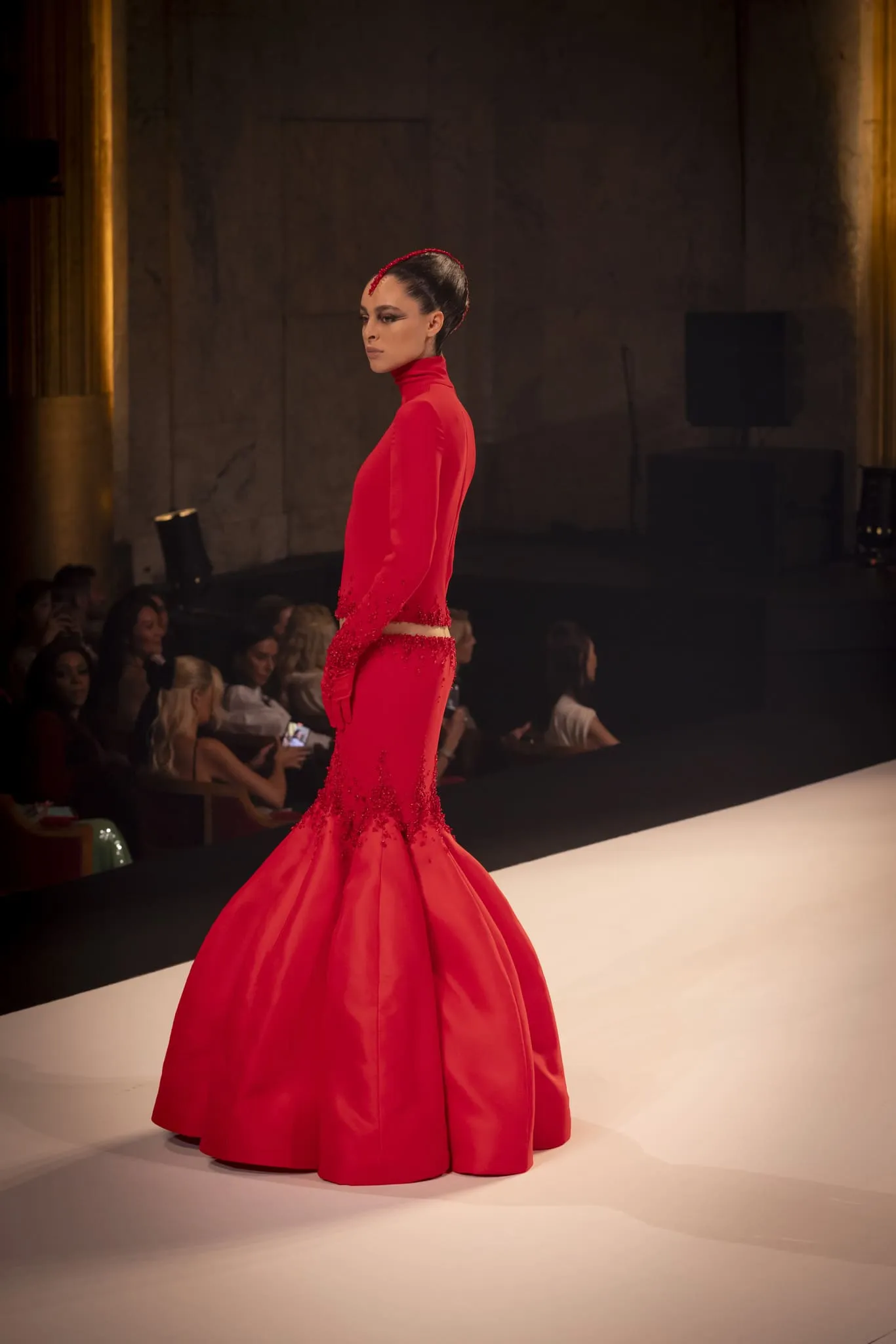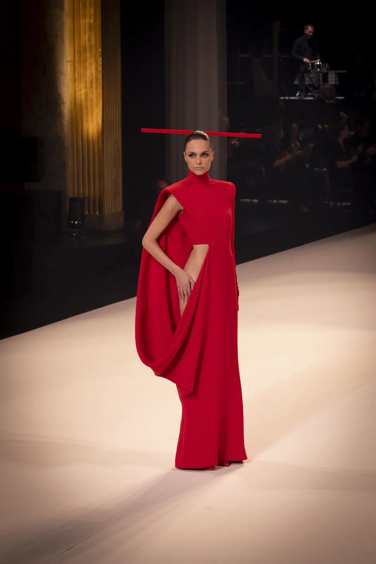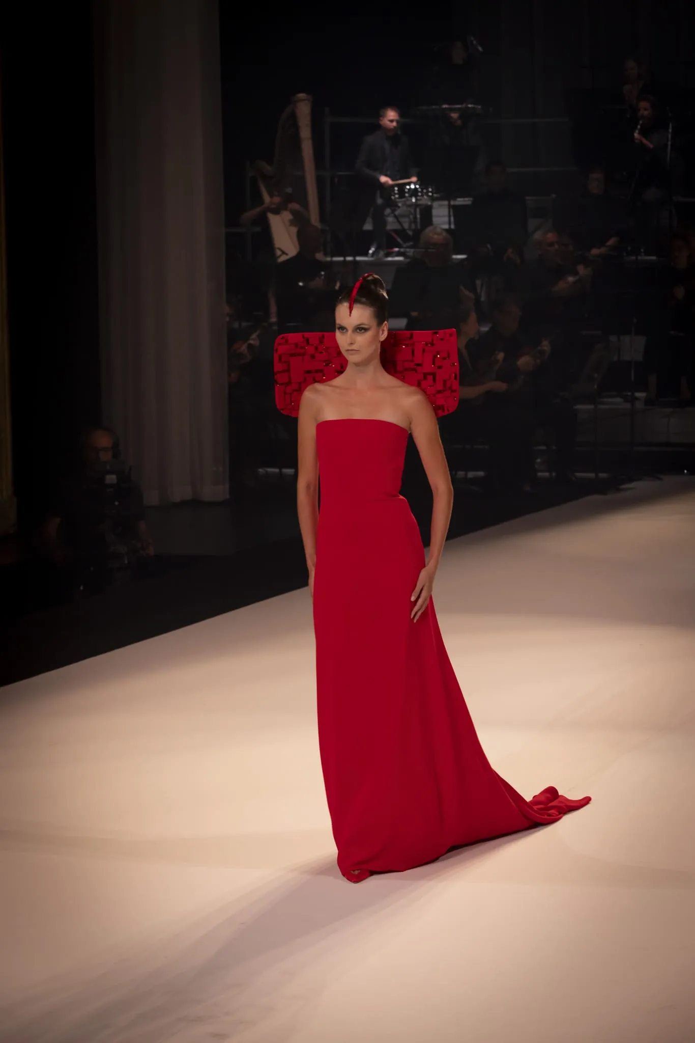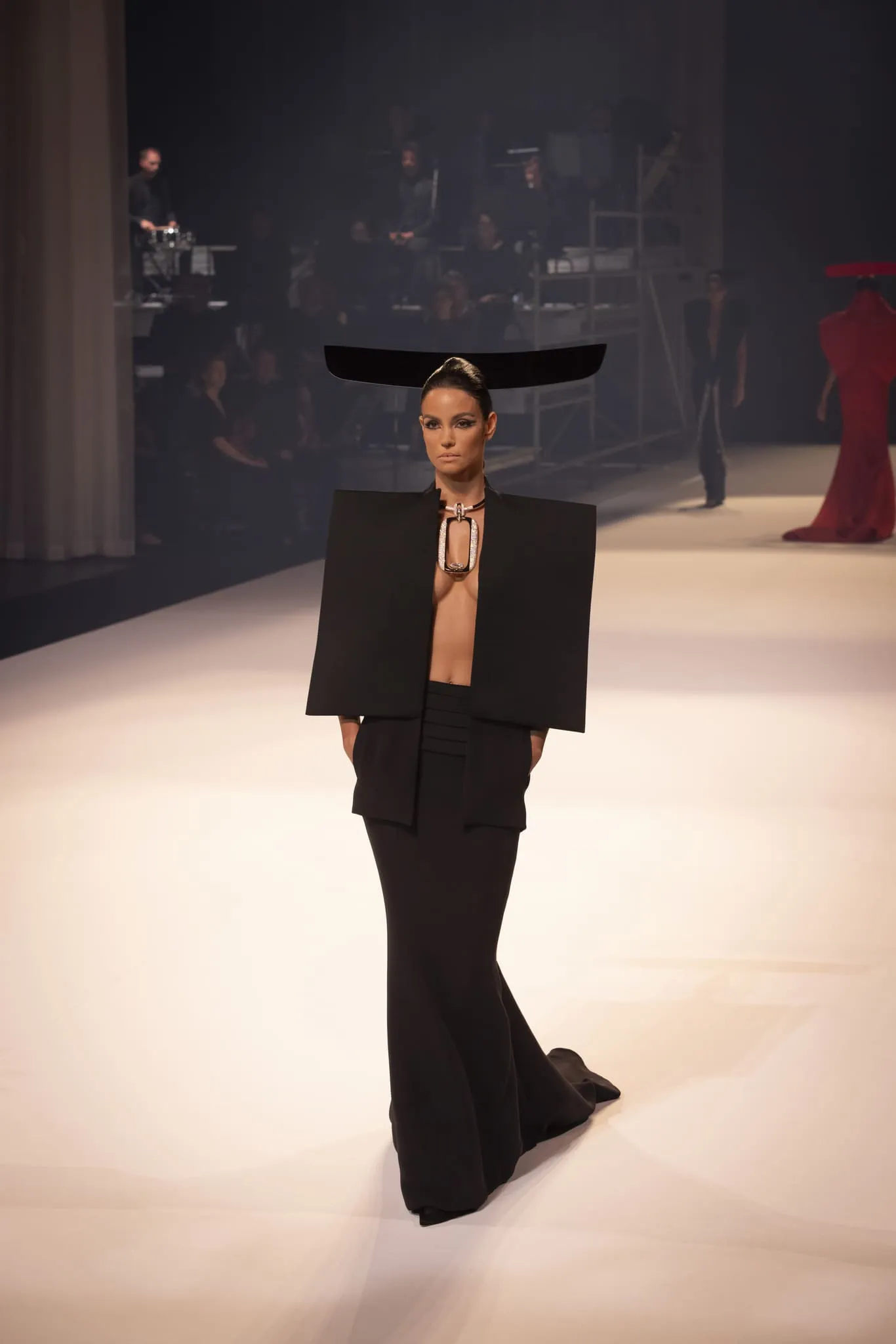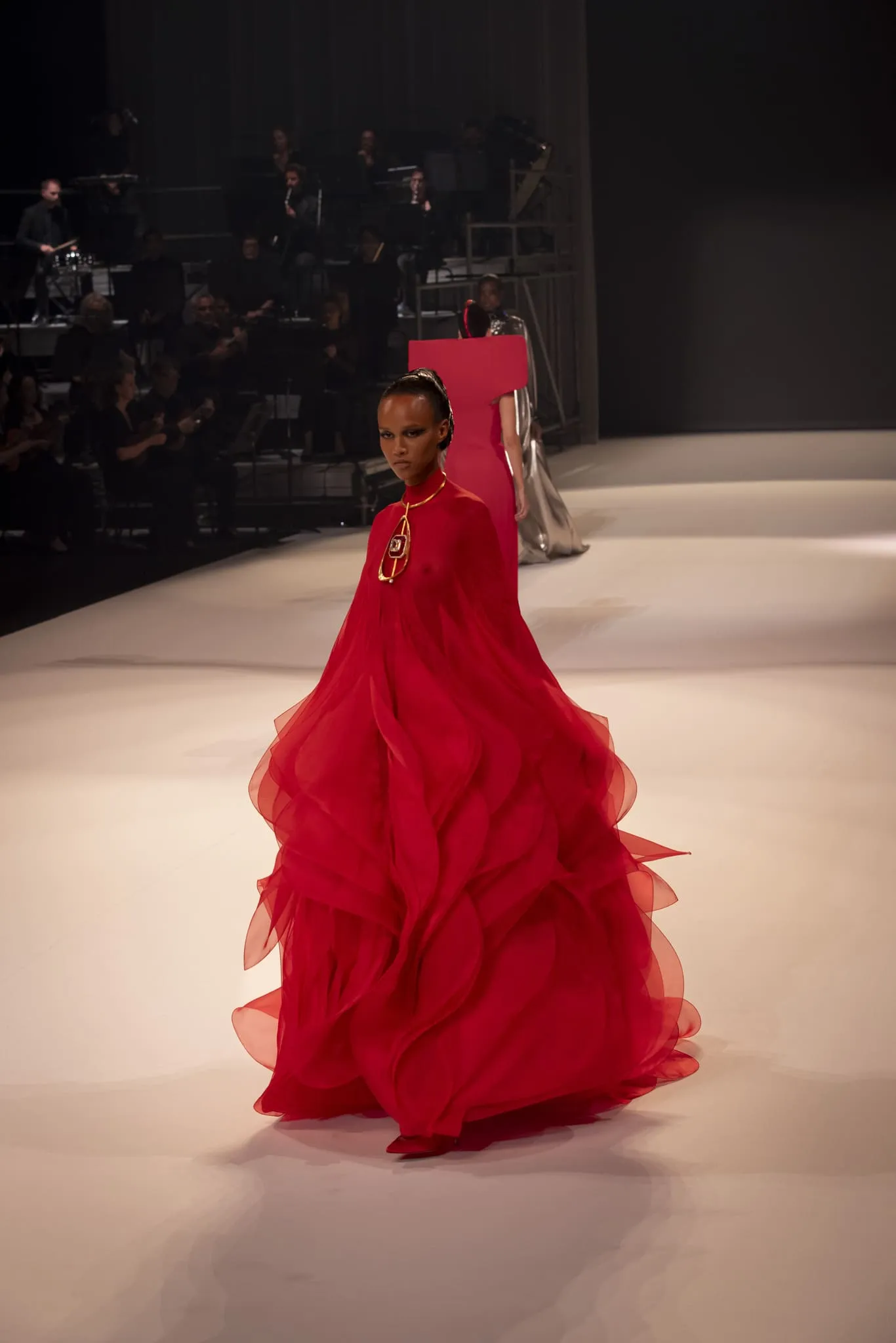 Stéphane Rolland a présenté sa collection haute couture automne-hiver 2025-2026 baptisée "Le Boléro" au théâtre des Champs Elysées, ponctué de tonalités rougeâtres et plus sombres. Une ligne qui puise son essence dans une rencontre fascinante entre deux imaginaires : celui de Maurice Ravel, architecte du rythme mécanique et abstrait, et celui d’Ida Rubinstein, muse en quête d’un rêve ibérique, sensuel et spectral. Des silhouettes sculpturales ont déambulé avec grâce sur le thème du Boléro de Ravel, magnifié par une musique d’orchestre.