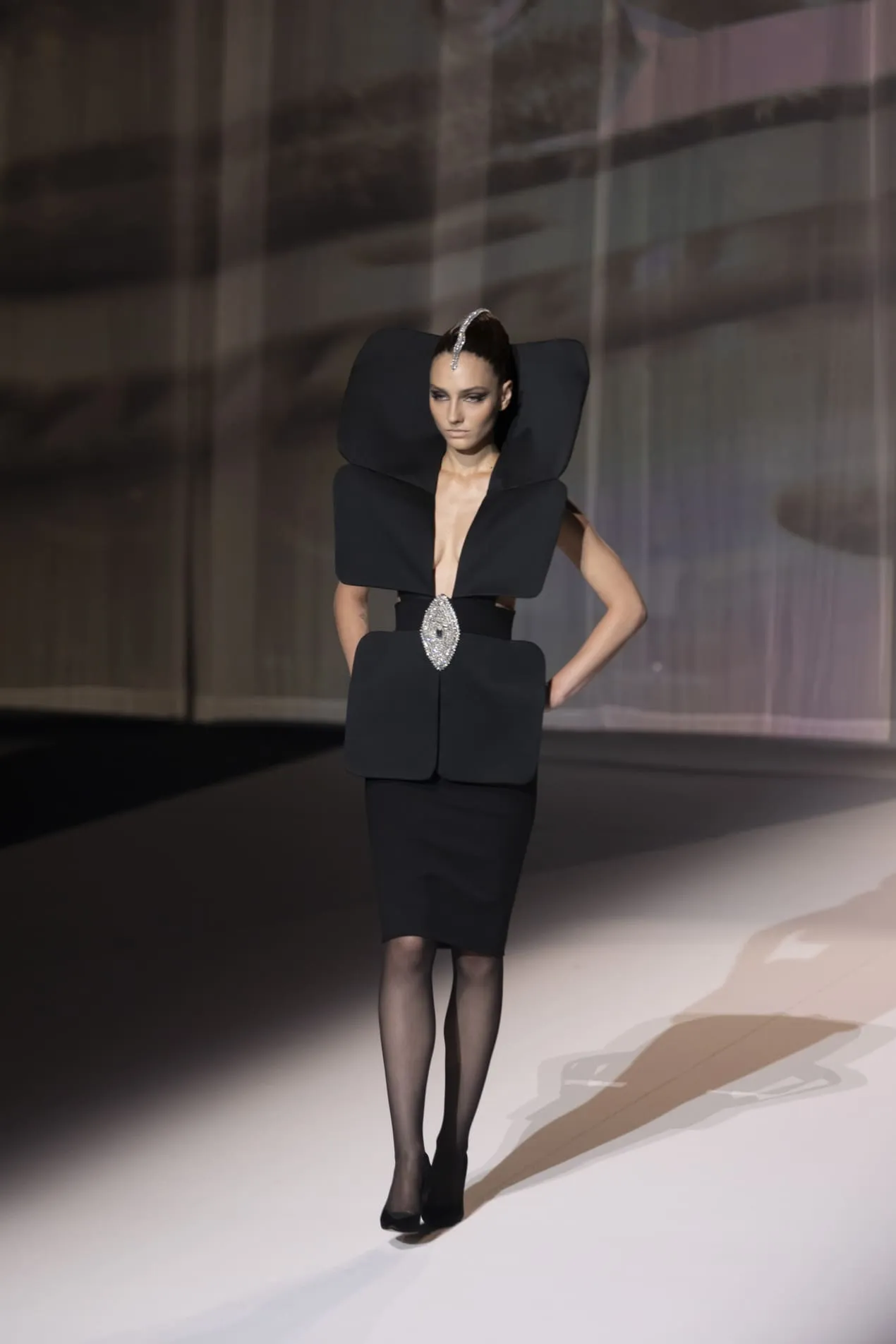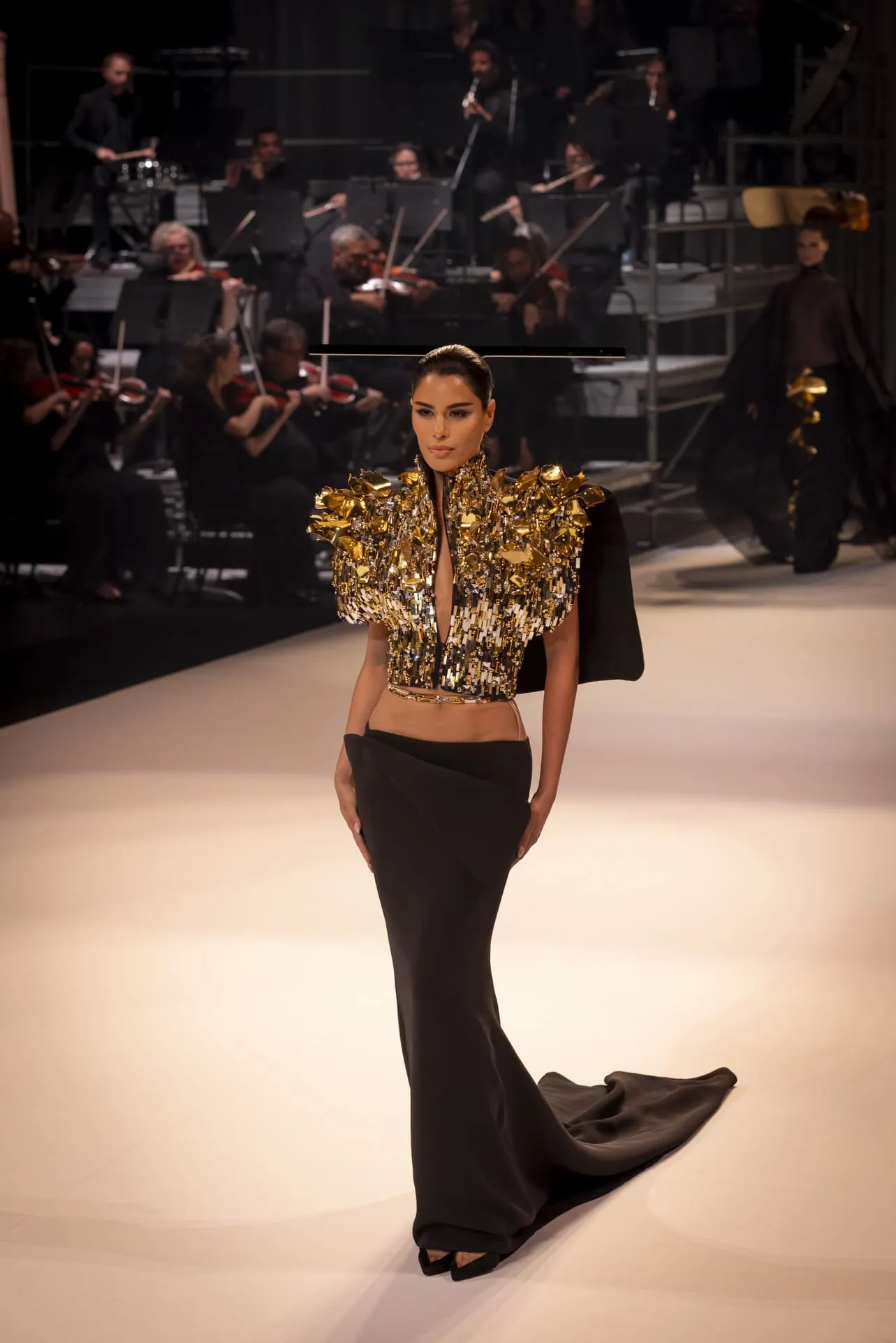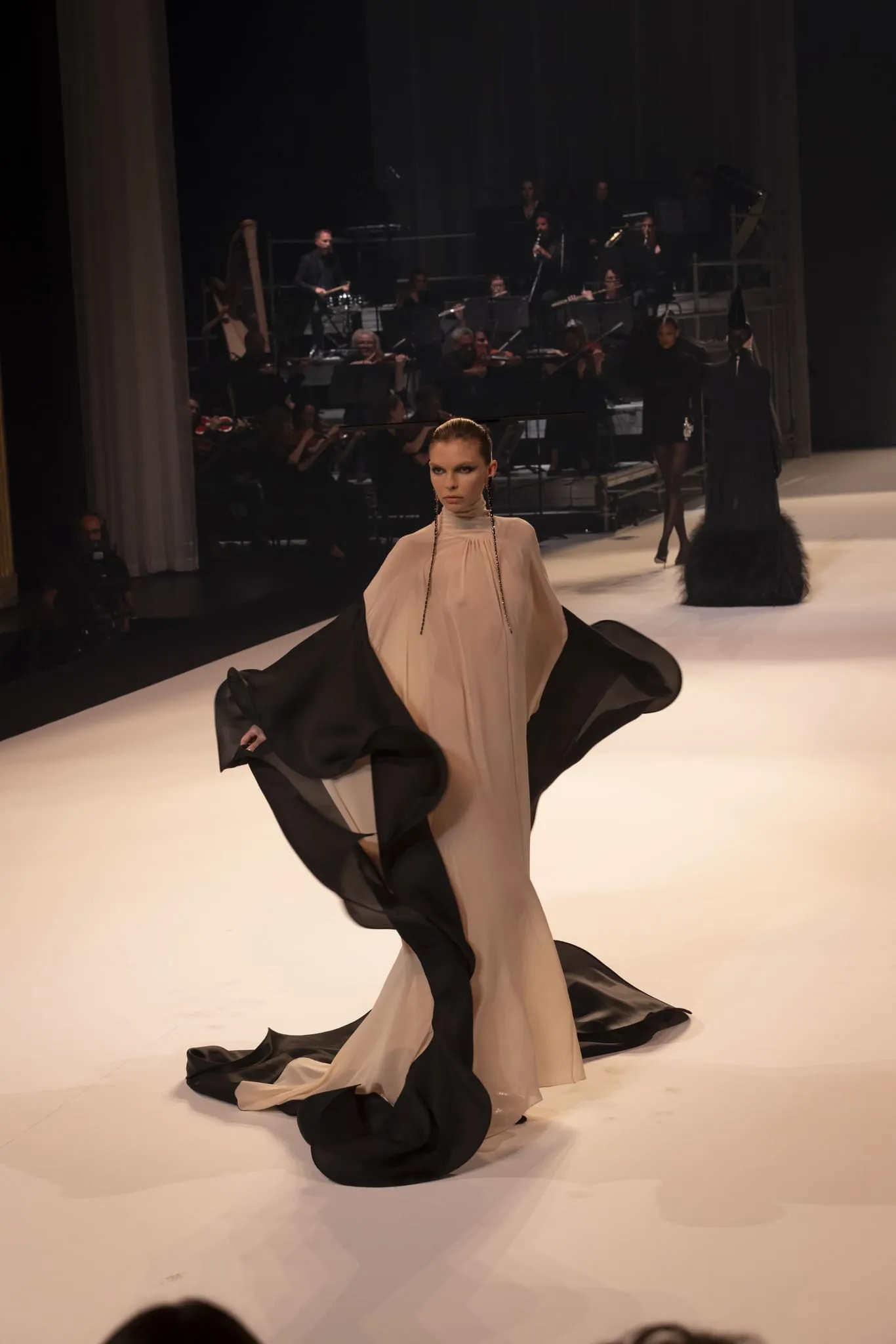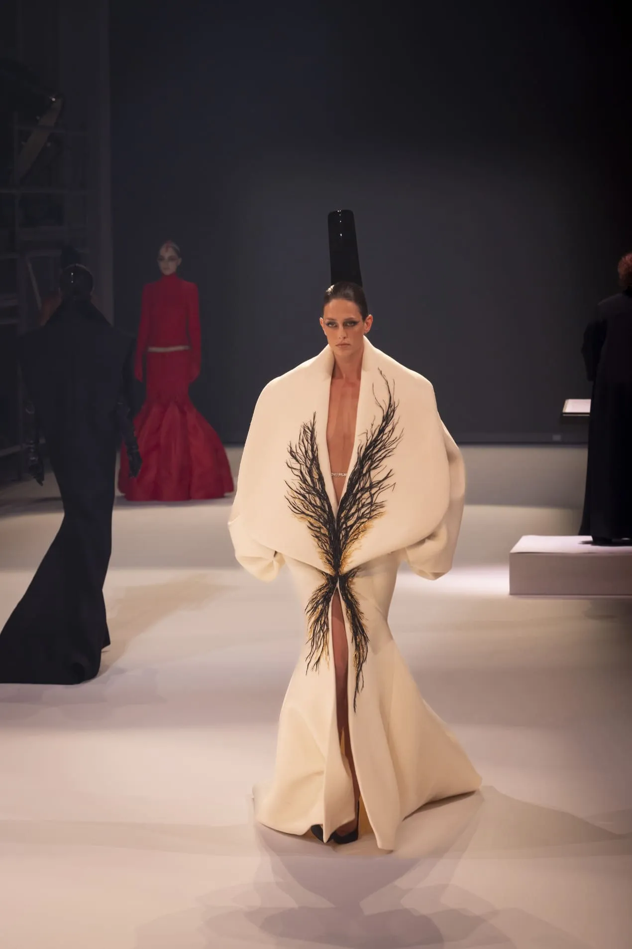 Stéphane Rolland a présenté sa collection haute couture automne-hiver 2025-2026 baptisée "Le Boléro" au théâtre des Champs Elysées, ponctué de tonalités rougeâtres et plus sombres. Une ligne qui puise son essence dans une rencontre fascinante entre deux imaginaires : celui de Maurice Ravel, architecte du rythme mécanique et abstrait, et celui d’Ida Rubinstein, muse en quête d’un rêve ibérique, sensuel et spectral. Des silhouettes sculpturales ont déambulé avec grâce sur le thème du Boléro de Ravel, magnifié par une musique d’orchestre.