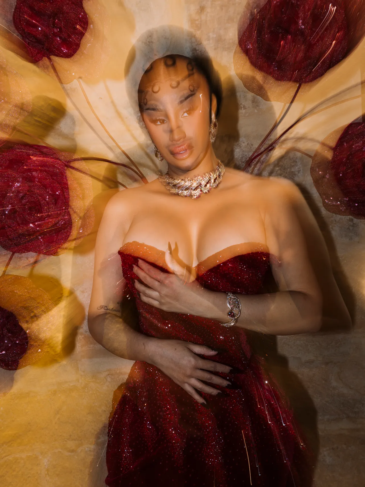 Présentée au Collège des Bernardins (Paris Ve), la collection haute couture Rahul Mishra automne-hiver 2025-2026 a célébré une des artistes musicales la plus influente de sa génération, Cardi B. Vêtue de la robe "Wild Rose", l’artiste a posé dès son arrivée au défilé et au côté du créateur de mode indien. Un véritable portfolio immortalisé avec audace et multi-expositions à l’image de la star surexposée.