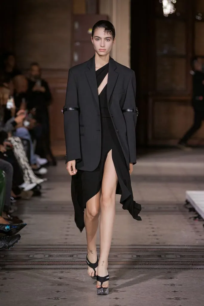 Cette année, la maison Coperni présente sa collection printemps-été 2023 à la salle des textiles au musée national des Arts et Métiers (Paris IIIe) construit par l’architecte Léon Vaudoyer. Dans ce lieu dédié à l’exposition des machines à fil et à tisser, les looks sur mesure sont réinventés en pièces hybrides. Les vestes pour homme sont transformées en robes ultra féminine qui tombent dans le dos, comme une crinoline moderne en représentation du changement. Un changement de nature, d’apparence et de temps. Les pantalons sont un peu trop grands, nonchalants, telle une trace de l’adolescence qui révèle les dessous. La douceur d’une pièce de lingerie, qui s’empare des robes et des jupes, est la touche finale de chaque look. Le corps se révèle avec des courbes affirmées, des pantalons remodelés et des bustes exagérés. Une robe rouge, portée façon Matrix, fait son apparition dans le show tandis que des spirales métalliques traduisent la transformation, le mouvement et la flexibilité de cette collection créative et avide d’innovation. Le label s’associe avec Fabrican Ltd en créant une robe unique en direct lors du défilé. Cette performance est menée par Dr Manel Torres, créateur de Fabrican Ltd et de la matière Spray-on fabric, et exécutée sur la mannequin Bella Hadid pour sublimer de la plus pure et la plus novatrice des manières le corps de la femme. Le Spray-on fabric est la solution la plus avant-gardiste du XXIe siècle, nous rappelant que le monde évolue et que le futur reste à dessiner.