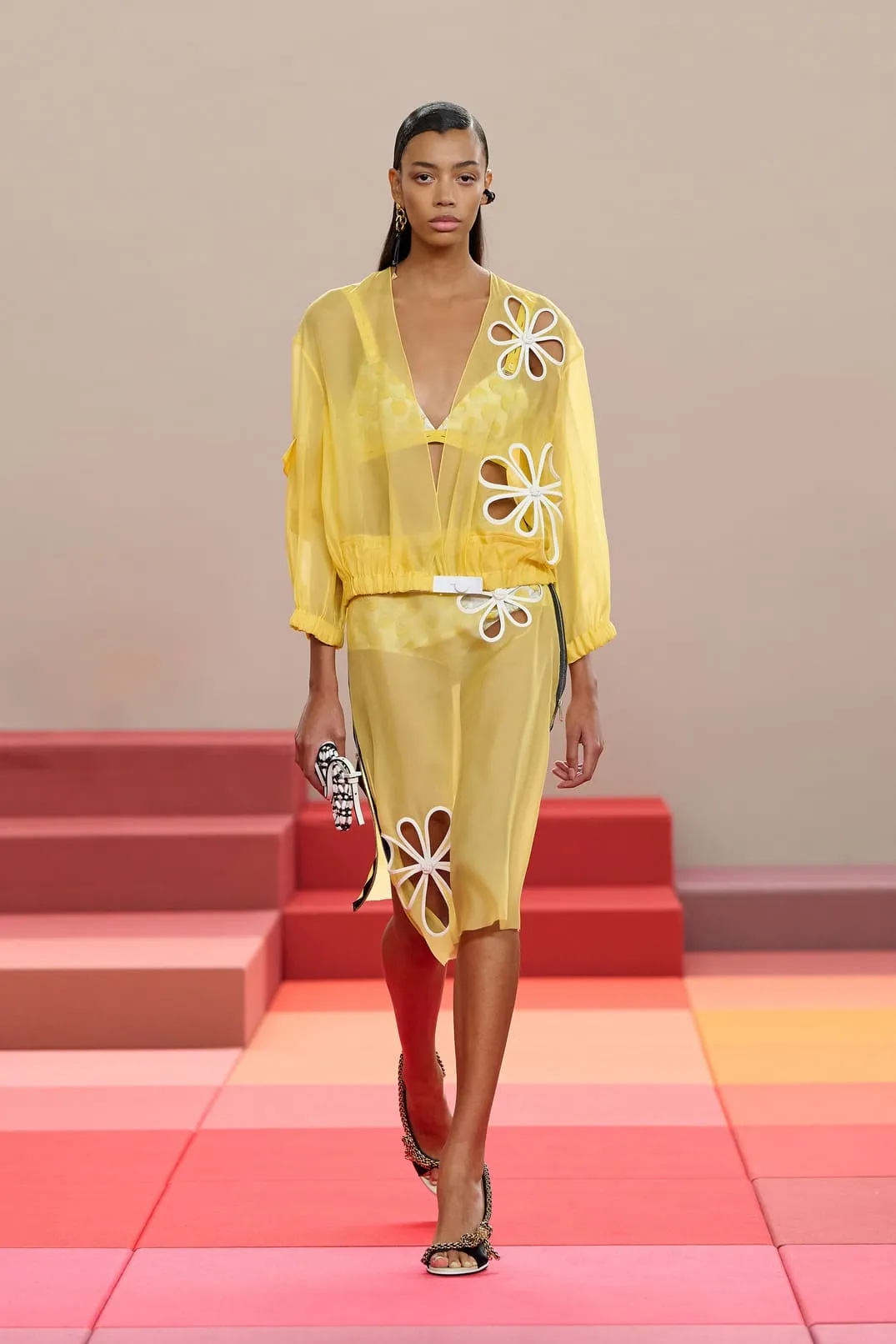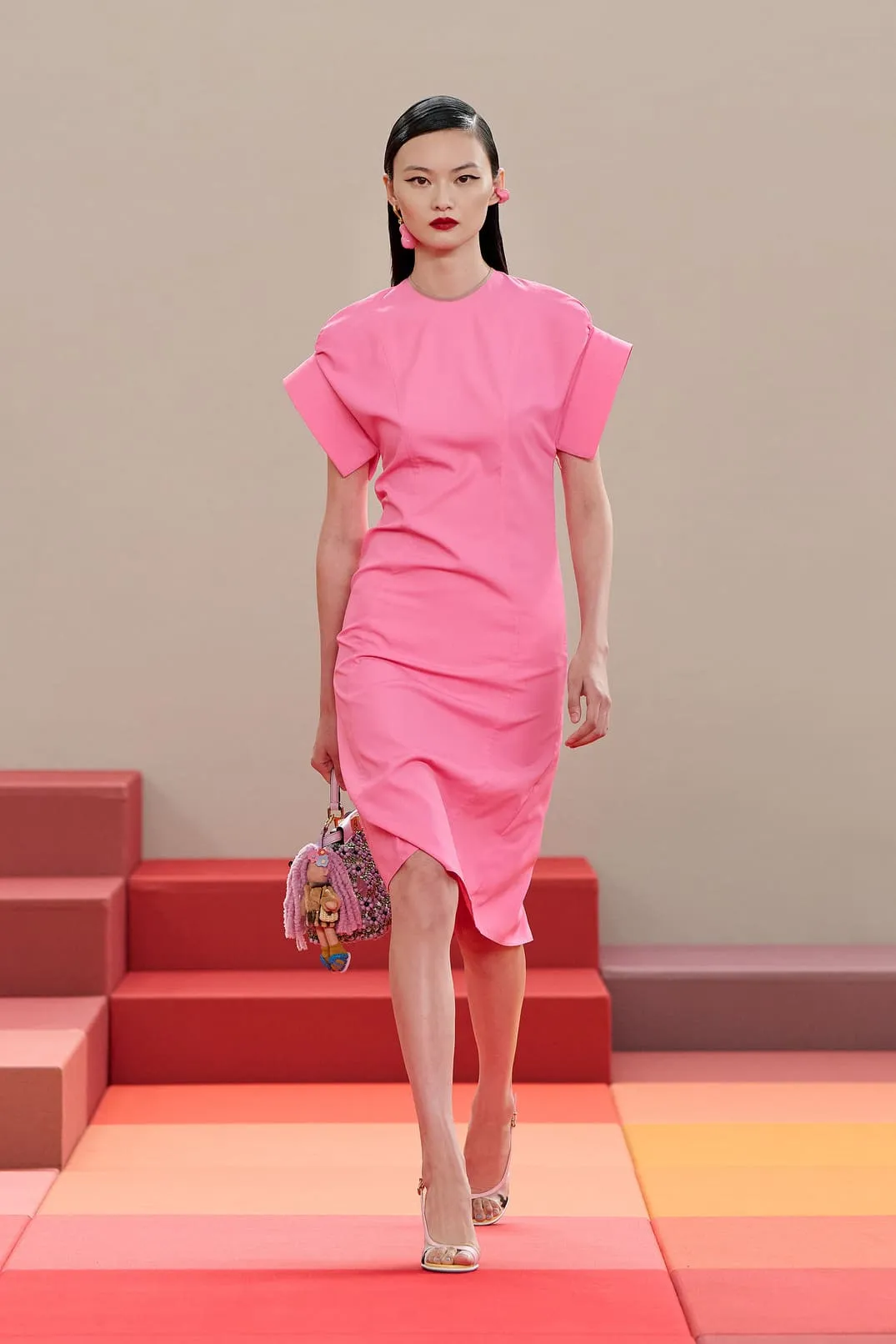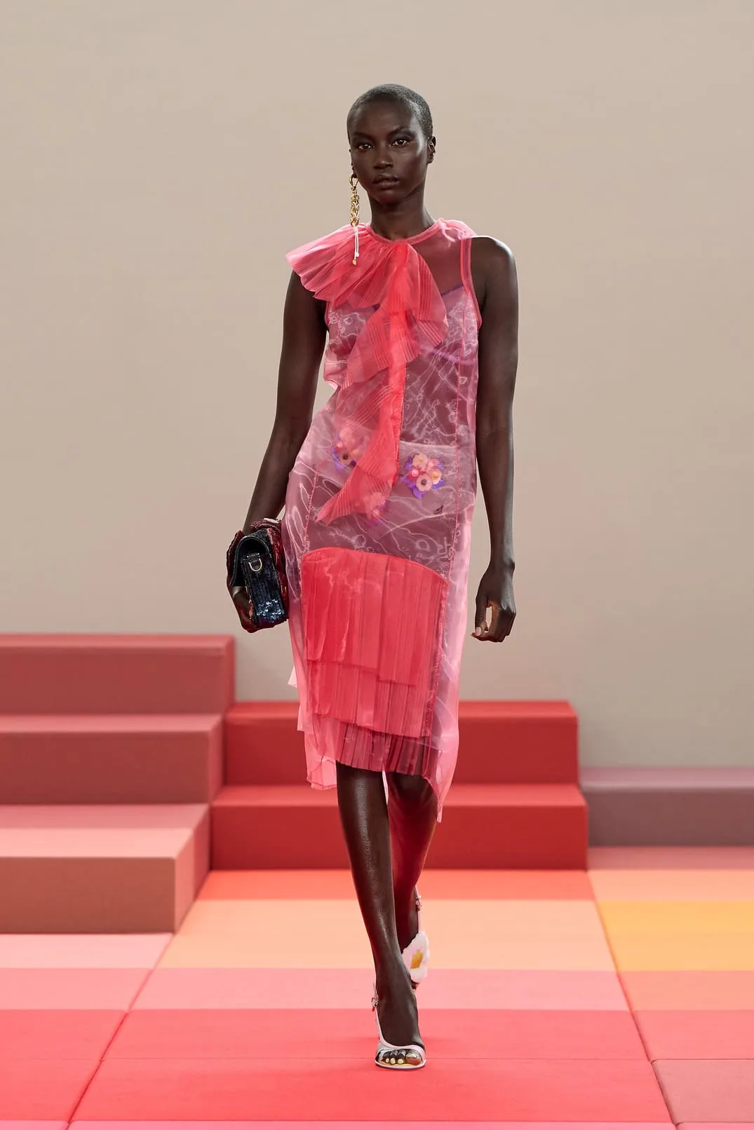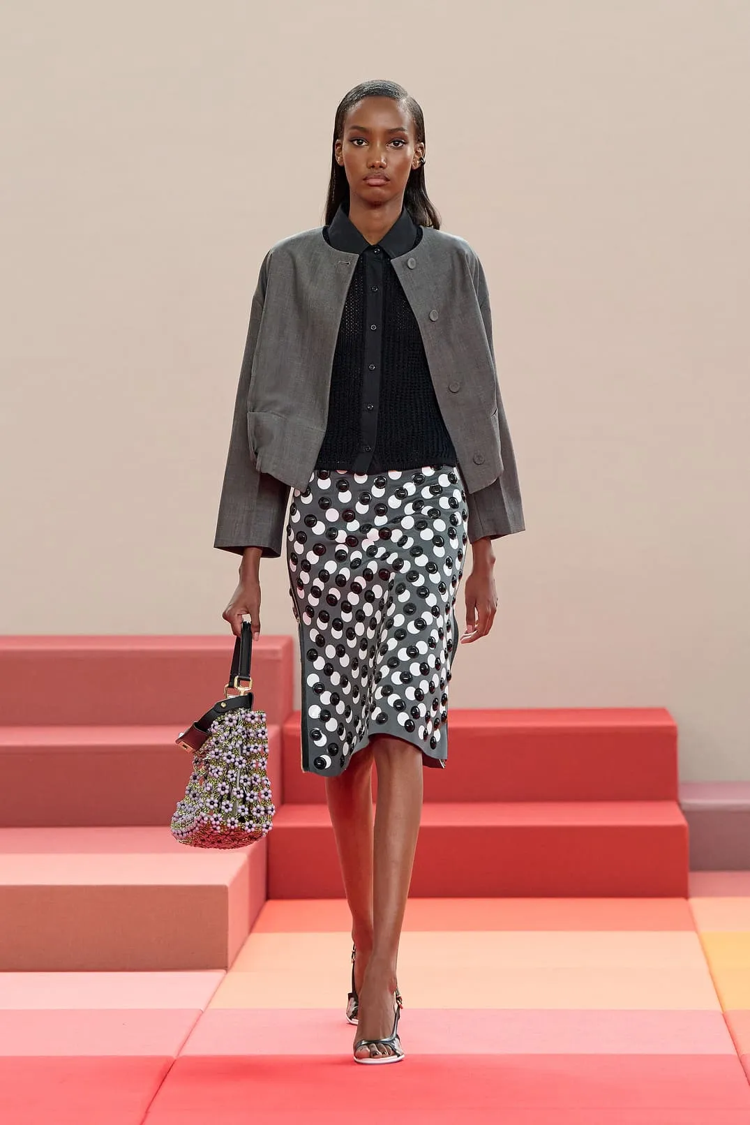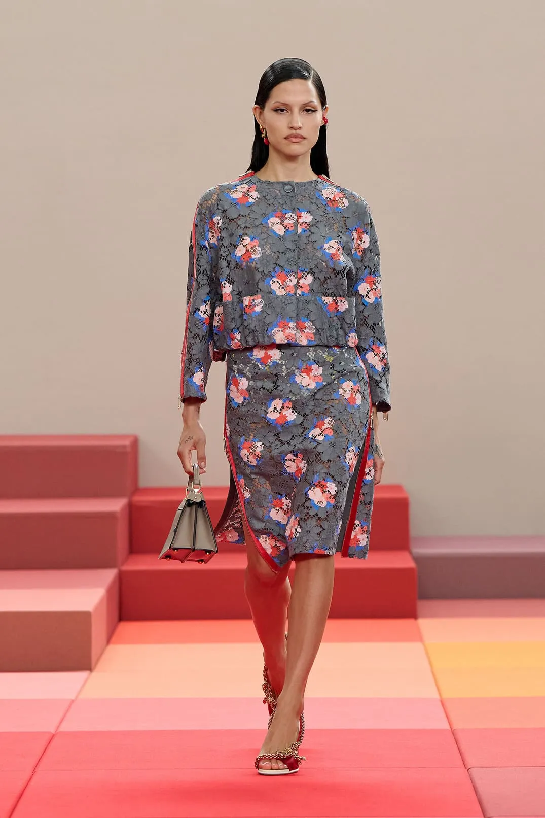 Dans la lumière éclatante d'un jour romain, Silvia Venturini Fendi dévoile une collection printemps-été 2026 où la couleur devient langage, mémoire et mouvement. Le décor, conçu par Marc Newson, s'inspire d'un motif floral Fendi pour se transformer en une mosaïque digitale, un quilt contemporain vibrant de teintes saturées. Chaque pixel, agrandi jusqu'à devenir une unité de lumière et de texture, évoque l'évolution de la couleur à l'écran et célèbre l'artisanat intergénérationnel. Ce paysage tactile et immersif efface les frontières entre spectateurs et spectacle, invitant à une expérience sensorielle sans hiérarchie. Les silhouettes, fluides et essentielles, dansent entre les espaces positifs et négatifs, entre le familier et l'inattendu. Les matières - organza, crochet, soie torsadée - célèbrent une opulence discrète, tandis que les broderies et motifs floraux insufflent une nostalgie graphique. La dualité chère à Fendi - tradition et innovation, artisanat et technologie - s'incarne dans chaque couture, chaque volume, chaque nuance. Comme le dit Silvia : "Innover tout en préservant la vision Fendi... avec une touche de fantaisie". Et cette fantaisie prend ici la forme d'un kaléidoscope vivant, où chaque vêtement devient une émotion à porter.