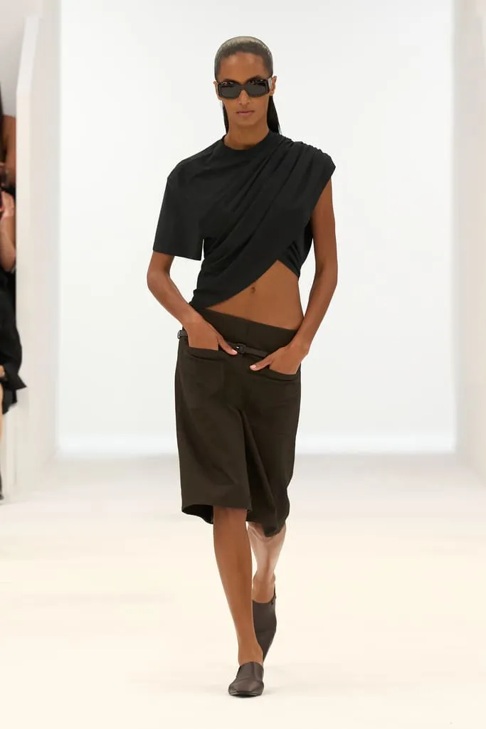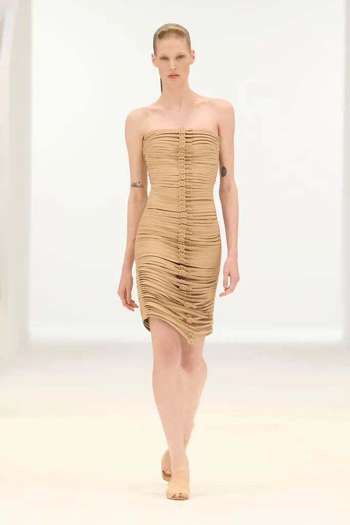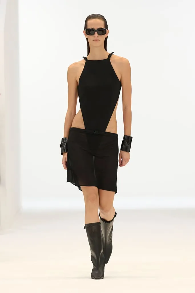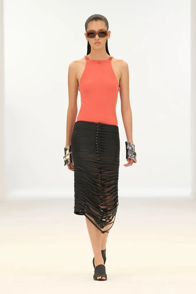 À mesure que le thermomètre grimpe, Nicolas Di Felice orchestre pour Courrèges une ascension solaire où chaque degré devient une étape de métamorphose. La collection printemps-été 2026 s'ouvre sur une lumière naissante, à 21 degrés, et s'élève jusqu'à 30 degrés dans une scénographie circulaire imaginée avec Remy Brière et Matiere Noire, baignée de trois rayons lumineux. Les silhouettes, d'abord glacées, se réchauffent en transparences incandescentes, glissant des bleus aquatiques aux orangés solaires. Les casquettes drapées, extraites des archives, fusionnent avec les bodys dans une harmonie de teintes aqua, pool blue et night blue. Les mini-jupes s'ornent de carreaux redimensionnés évoquant des panneaux solaires, tandis que les ceintures 'recouvertes' deviennent des éléments totémiques, accumulés sur des total looks en vinyle végétal. Les robes en jersey, soie ou sequins, conçues à partir d'armatures de pare-soleil, se transforment en artefacts anti-UV, protégeant même le visage d'un soleil aveuglant. Les accessoires ruissèlent sur les corps, les sacs souples à sangles réglables parachèvent une silhouette versatile et fonctionnelle. Portée par une musique originale co-composée par Di Felice et Erwan Sene, cette collection est une montée en intensité, une célébration de la sensualité graphique et du mouvement, où les codes Courrèges se fluidifient dans une danse lumineuse jusqu'à l'éblouissement total.