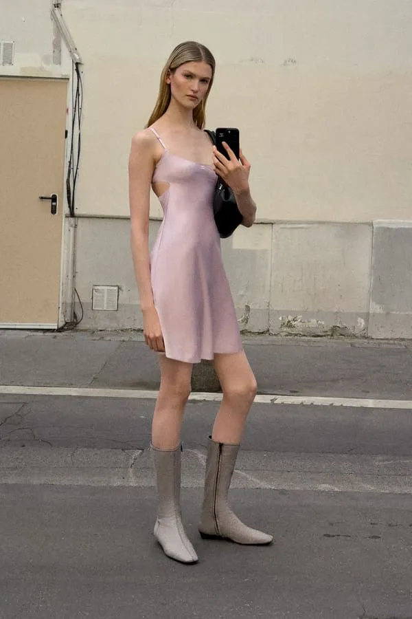 Côté chaussures, la collection puise dans les archives pour offrir des alternatives pratiques aux talons. Des kitten-heels à bouts carrés pointant sous les pantalons évasés aux bottes aiguisées revisitant les mythiques bottes plates de 1965, chaque modèle porte en lui cet esprit libre des sixties qui continue d'irriguer l'identité Courrèges.