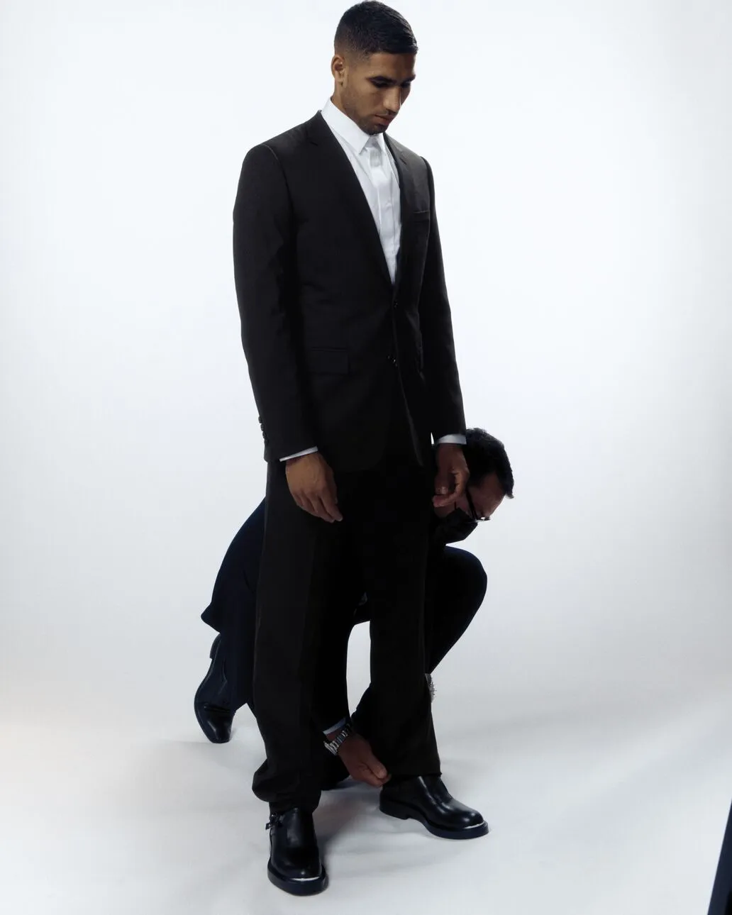 Autant de détails peaufinés pour sublimer le savoir-faire des équipes créatives autour d’une tenue composée d’un manteau et d’une écharpe en cachemire, d’un costume, d’une chemise mais aussi d’une paire de Monk en cuir noir, d’une cravate en soie et d’une ceinture réversible noire ou bleu marine. Un tir mode en pleine lucarne pour les adeptes de foot… et de style.