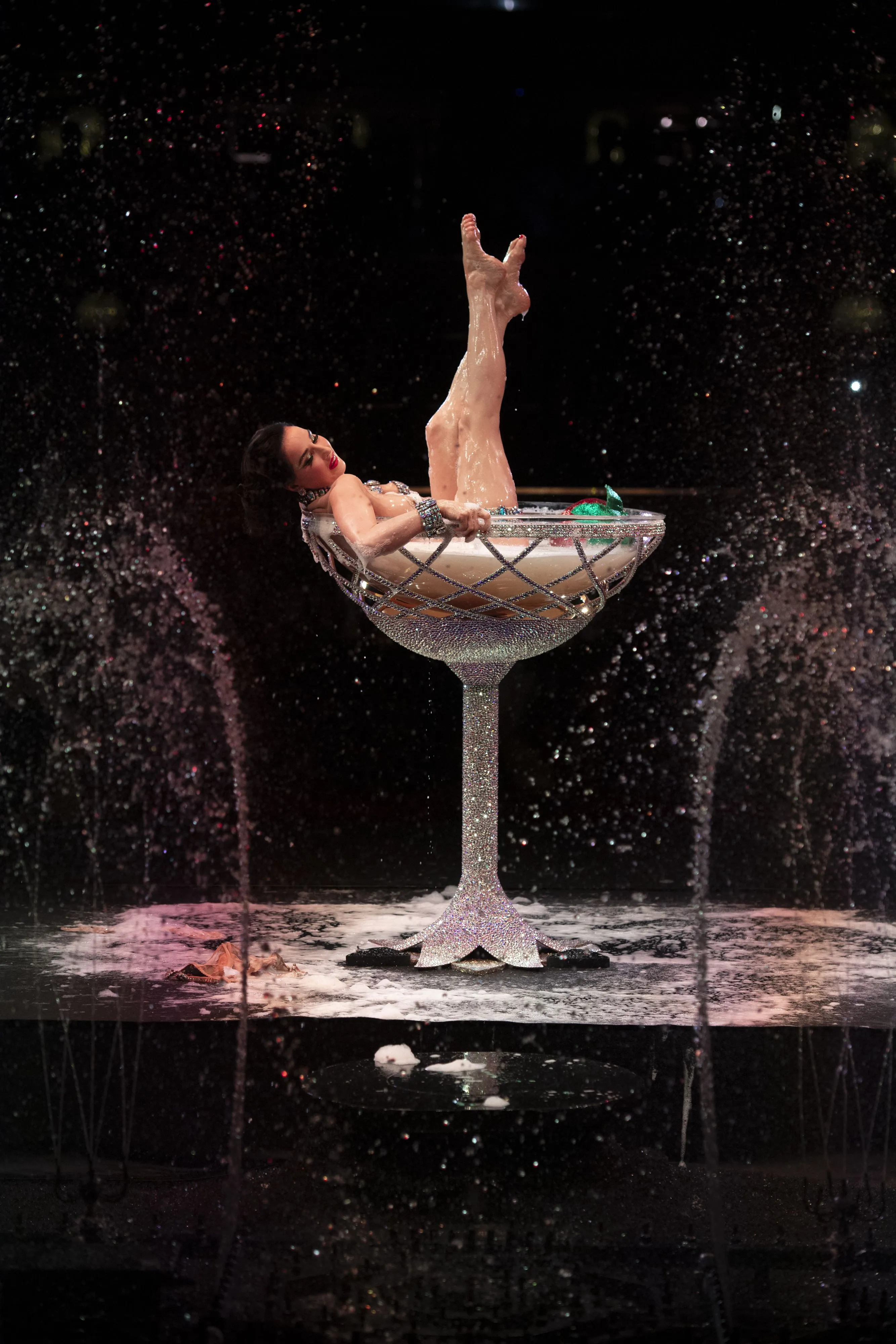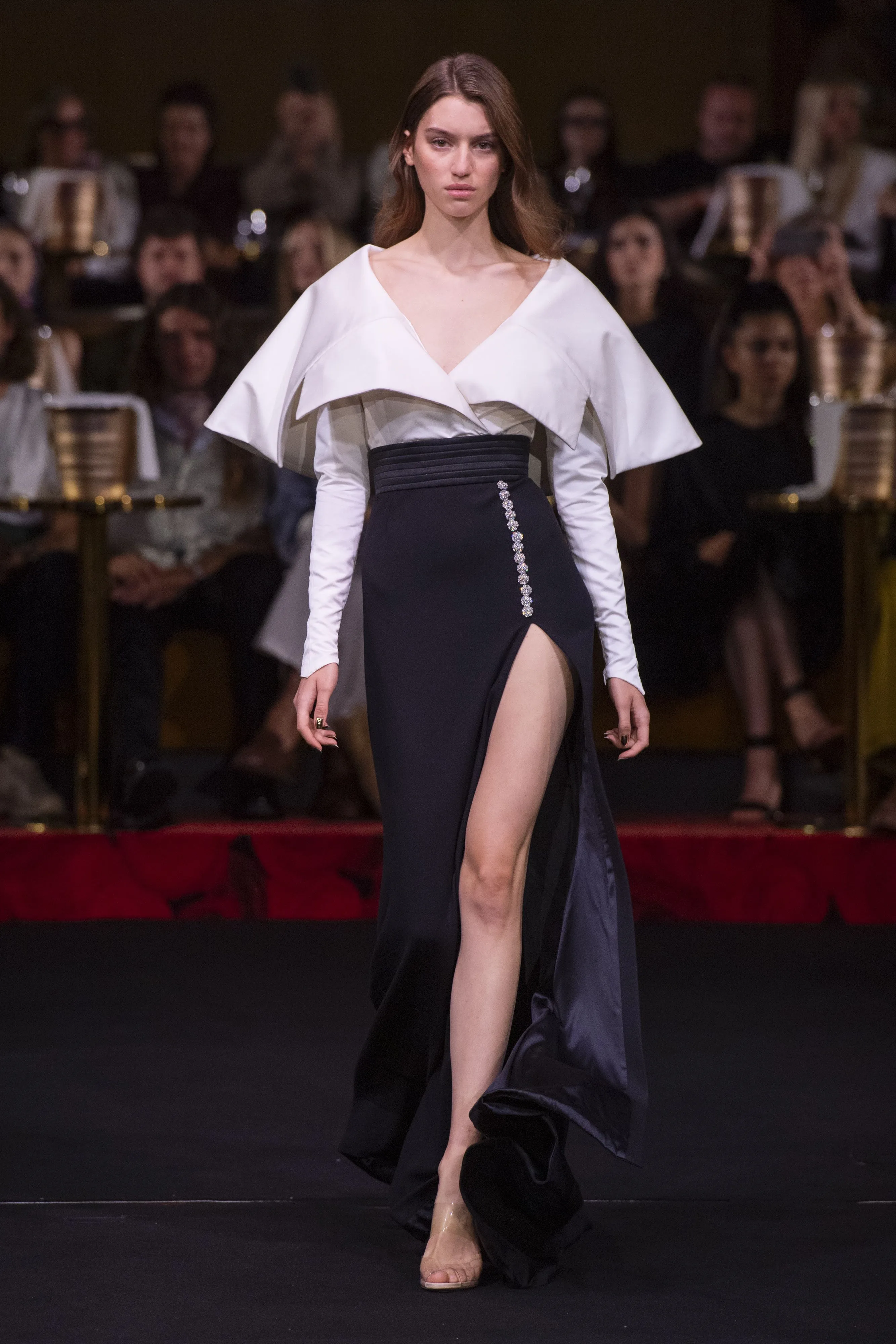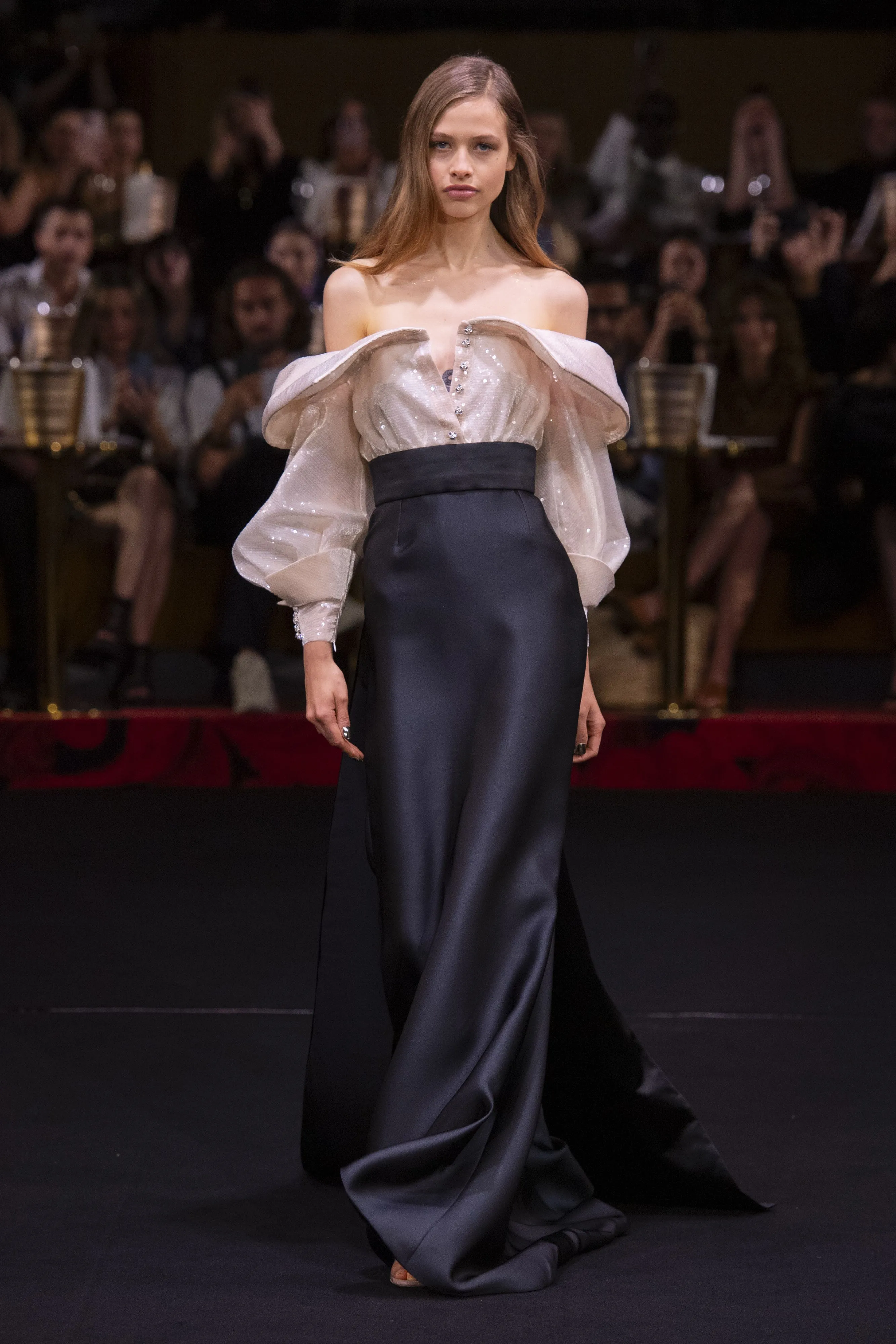 C’est dans la salle mythique du Lido, qu’Alexis Mabille a présenté sa collection haute couture automne-hiver 2024. Un choix de lieu doublement significatif puisque plus tôt, dans l’année, le créateur avait lui-même repensé la décoration de la salle. A 46 ans, il a su éblouir ses invités avec 41 robes de fête colorées et surprenantes. Les pièces jouent avec la lumière des matières : souplesse du crêpe, sensualité du jersey, maintien du satin, brillance du lamé, frémissement du velours, scintillement des paillettes… La palette est diversifiée et éveille les sens. Les couleurs vives et éclatantes du spectre ont défilé dans cette salle aux tons rougeâtres. Pour clôturer le show en beauté, la star du burlesque, Dita Von Teese a fait son apparition sur la scène du cabaret dans une coupe de champagne grandeur nature, se livrant à un effeuillage sensuel et glamour. Jeux de lumière et d’eau ont fini de ravir l’assemblée.
