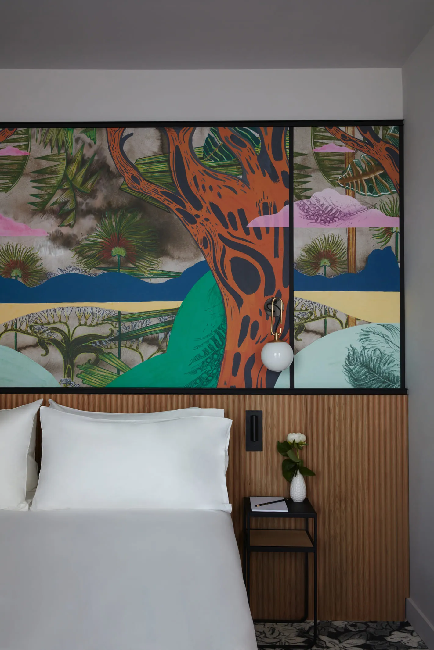Chaque niveau raconte une histoire différente. Aux étages 1 à 3, Mathieu Dufois plonge les visiteurs dans Crypta, une expédition nocturne forestière. Ses dessins à la pierre noire capturent des animaux surpris par la lumière d'une lampe torche, créant un réalisme photographique saisissant. Les errances de l'artiste dans la forêt de Lascaux prennent vie sous nos yeux. Plus haut, aux étages 4 à 6, Karine Rougier déploie La balade des vents. Née pendant le confinement, l'œuvre libère l'atelier de ses murs : pages volantes, oiseaux chevauchés par de petits personnages, Cupidon échangeant son arc contre un seau de dés. Une ode au hasard et à la liberté qui transforme les couloirs en terrains de jeu poétiques. Le voyage culmine aux étages 7 à 9 avec Élisée, une géographie (Colombie) d'Alexandre et Florentine Lamarche-Ovize. Papiers peints nuageux évoquant l'envol, moquettes rappelant la terre, forêt sauvage exotique sous un ciel nocturne : c'est la carte postale d'un monde lointain, un clin d'œil à l'explorateur français Élisée Reclus. On dort littéralement dans une œuvre d'art.