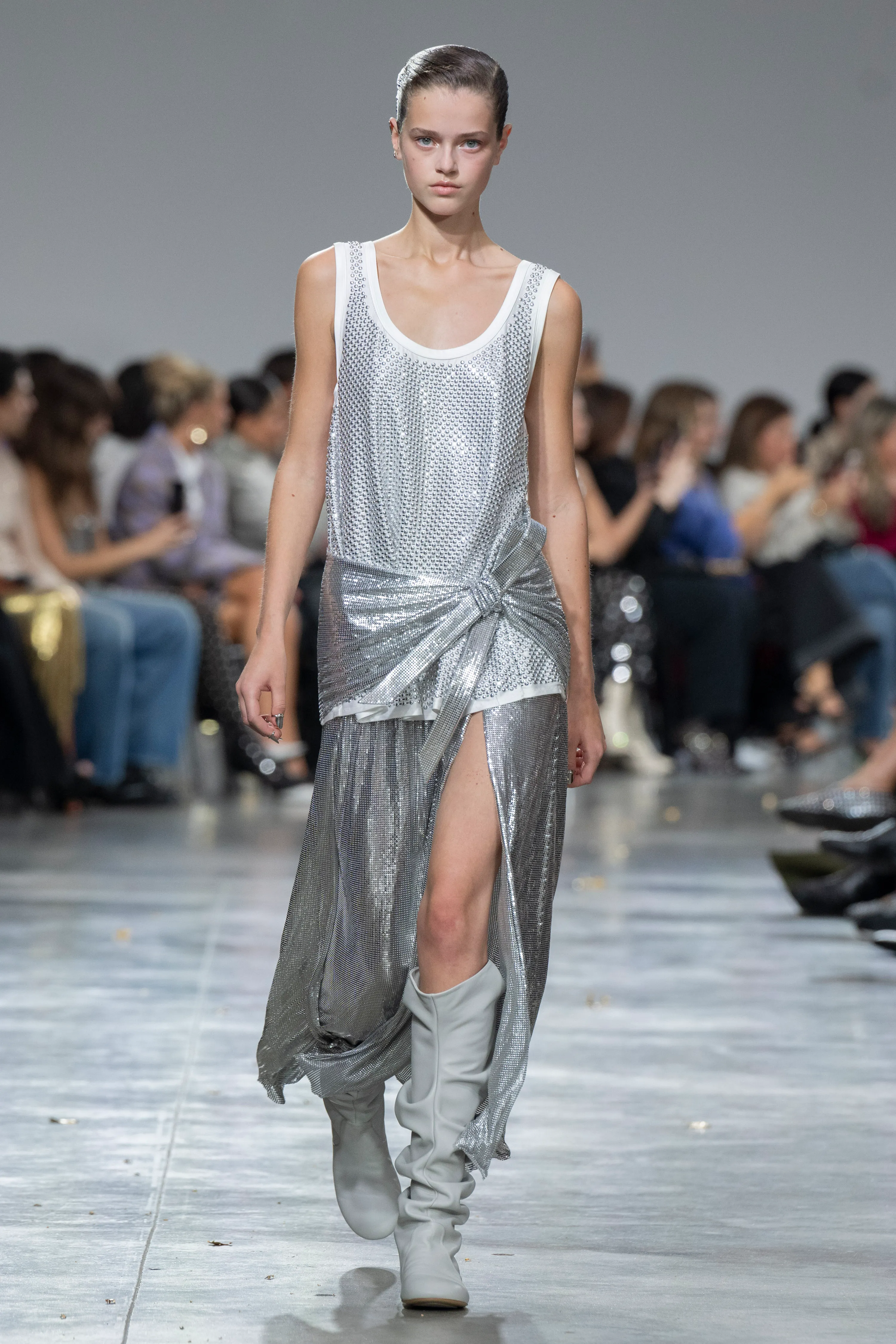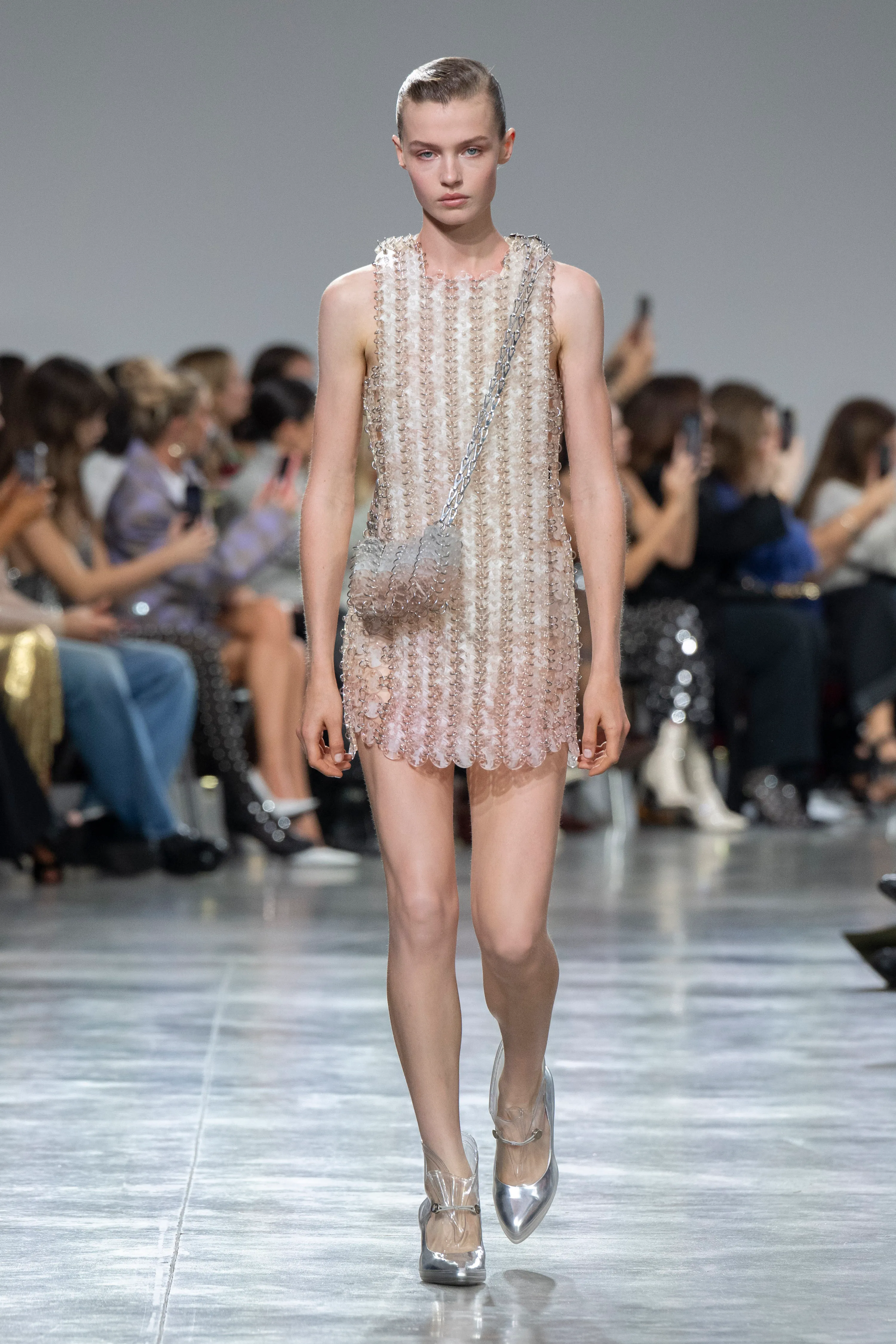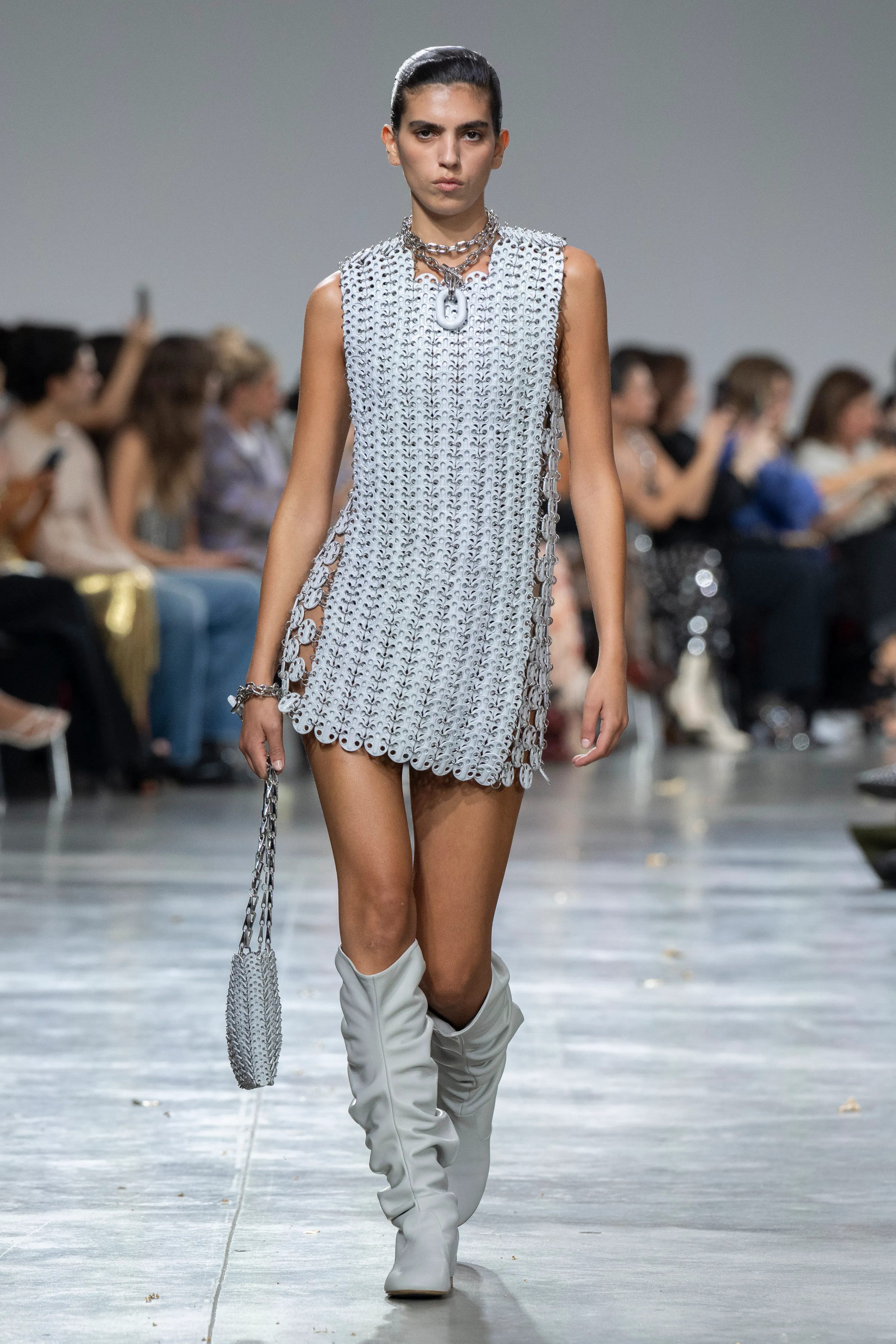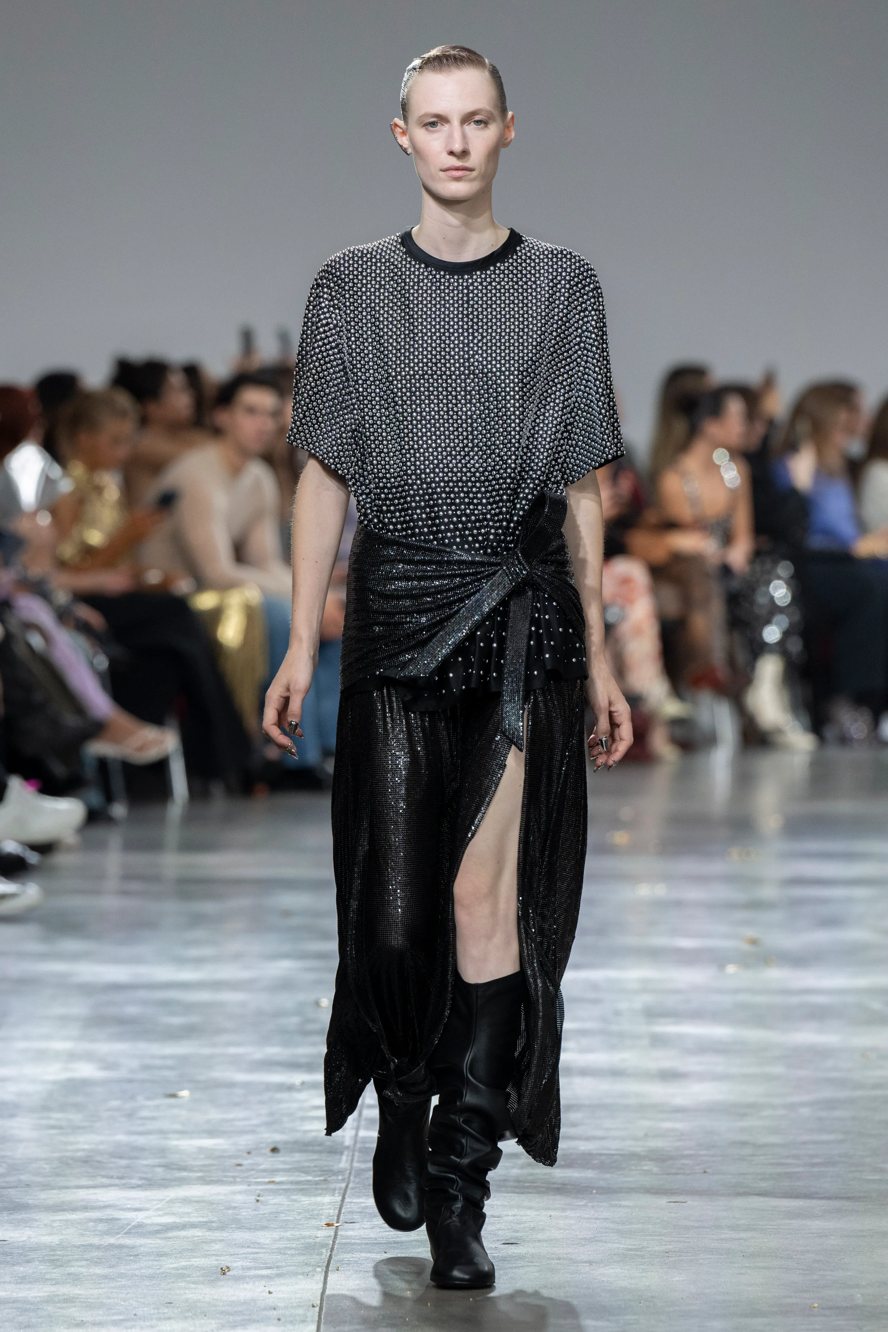 La radicalité est relative. La radicalité n’est pas toujours révolutionnaire, ni instantanée, ni même évidente. Mais la radicalité est ce qui motivera toujours rabanne à travers les matériaux, l'artisanat et le style. La collection printemps-été 2025 continue de pousser la dualité du quotidien et de l'exquis. Julien Dossena commence par des looks courts et superposés qui attirent le regard. Des mailles torsadées givrées, des dentelles guipure métallisées et des jacquards argentés qui simultanément suggèrent l’aspect industriel du packaging et le lustre du futur. L'influence parisienne qui transforme les standards preppy – hauts de rugby, cravates repp et caleçons rayés – en des coupe-vent doublés d'argent, des jupes utilitaires à boucles et des hauts en popeline de papier qui s'ouvrent dans le dos. Au milieu de ces pièces spéciales, la simplicité du vêtement quotidien : un blouson en chambray lavé, un caban en cuir ou des blazers pour hommes dotés d'une taille à cordon. Une ample veste noire aux revers de sequins réfléchissants apparaît comme une boîte ouverte, révélant une couche de tablier semblable à une armure cloutée et un kilt porté sur une chemise blanche impeccable. Du contenu au libéré, la lingerie et les robes tablier effleurent et embellissent le corps au milieu de fabrications de plus en plus somptueuses qui donnent naissance à des silhouettes assemblées à partir de panneaux géométriques minutieusement brodés entre chaîne délicate et diaphane mousseline. Avec cette collection, rabanne dévoilera les Editions Artisan. Fidèle à la poursuite de l'expérimentation matérielle, les disques métalliques issus des tabliers de boucher ont été minutieusement réinventé à travers trois collaborations exceptionnelles avec Arthus Bertrand en médailles, Astier de Villatte en céramique et Venini en verre soufflé. En appliquant des techniques de couture aux créations portables, Dossena joue avec les pièces qui définissent rabanne comme s'il s'agissait d'un puzzle sophistiqué, respectant la relativité et la radicalité avant tout, sur une bande son "So 2000" avec "Gourmandises", titre phare de la chanteuse Alizée.