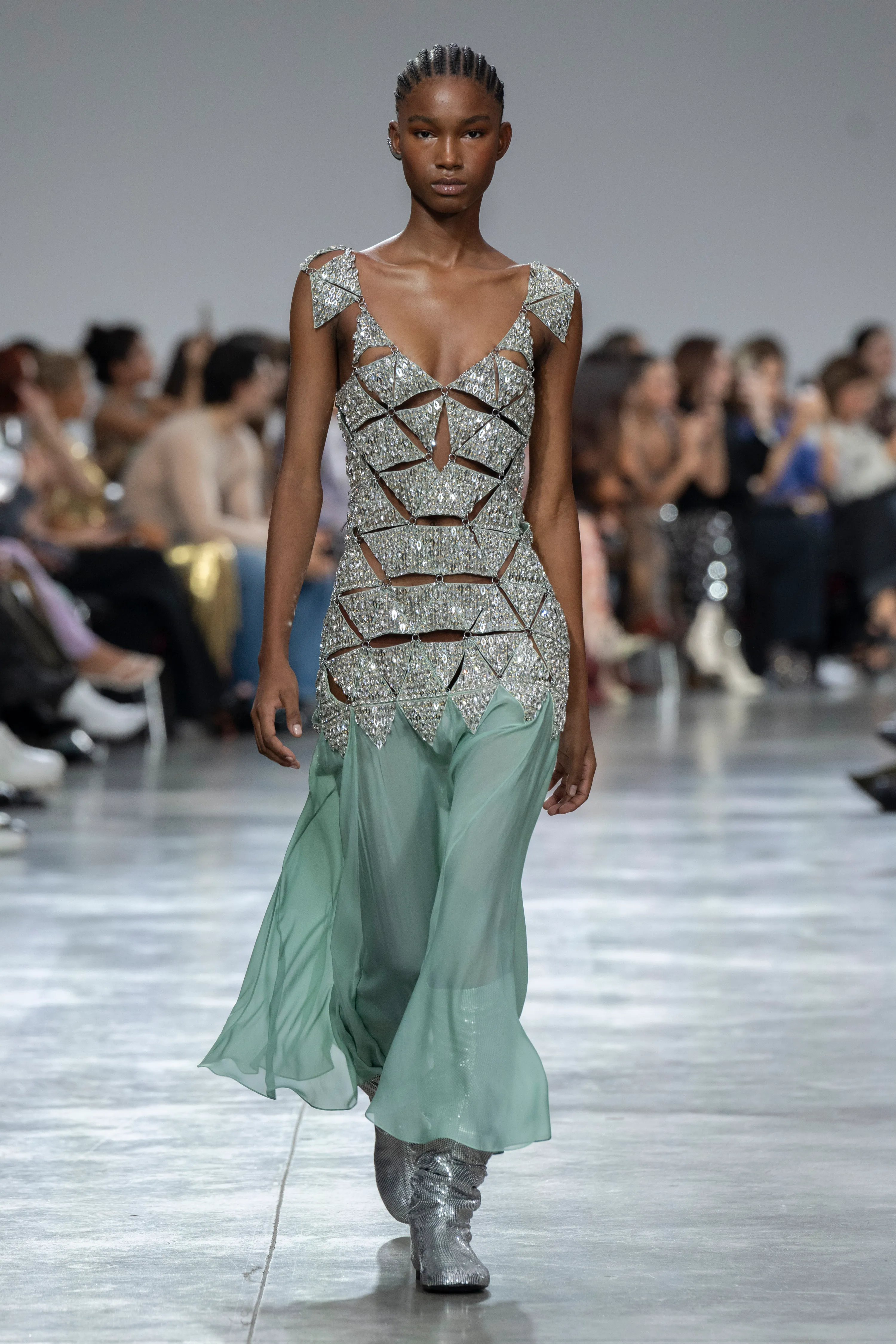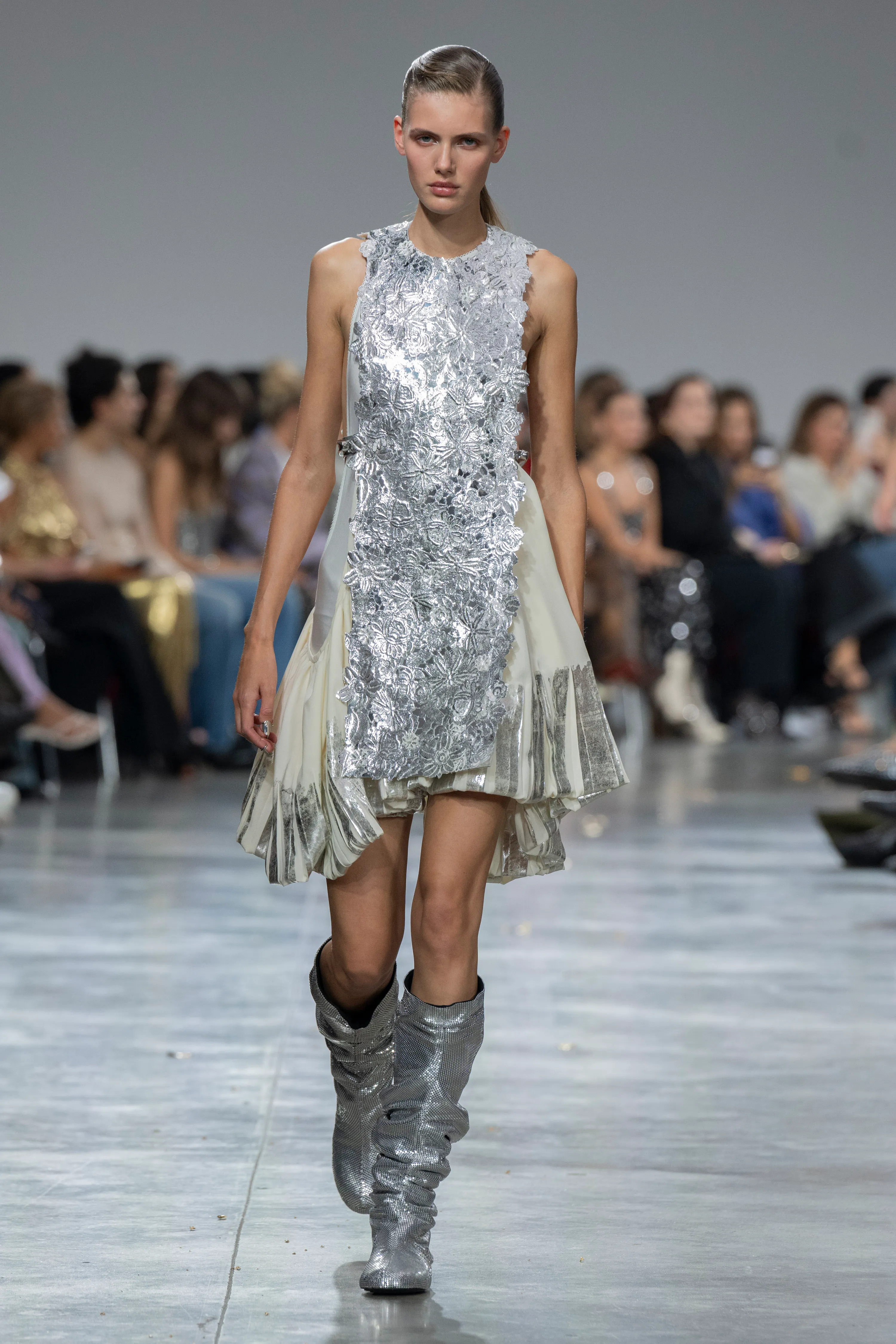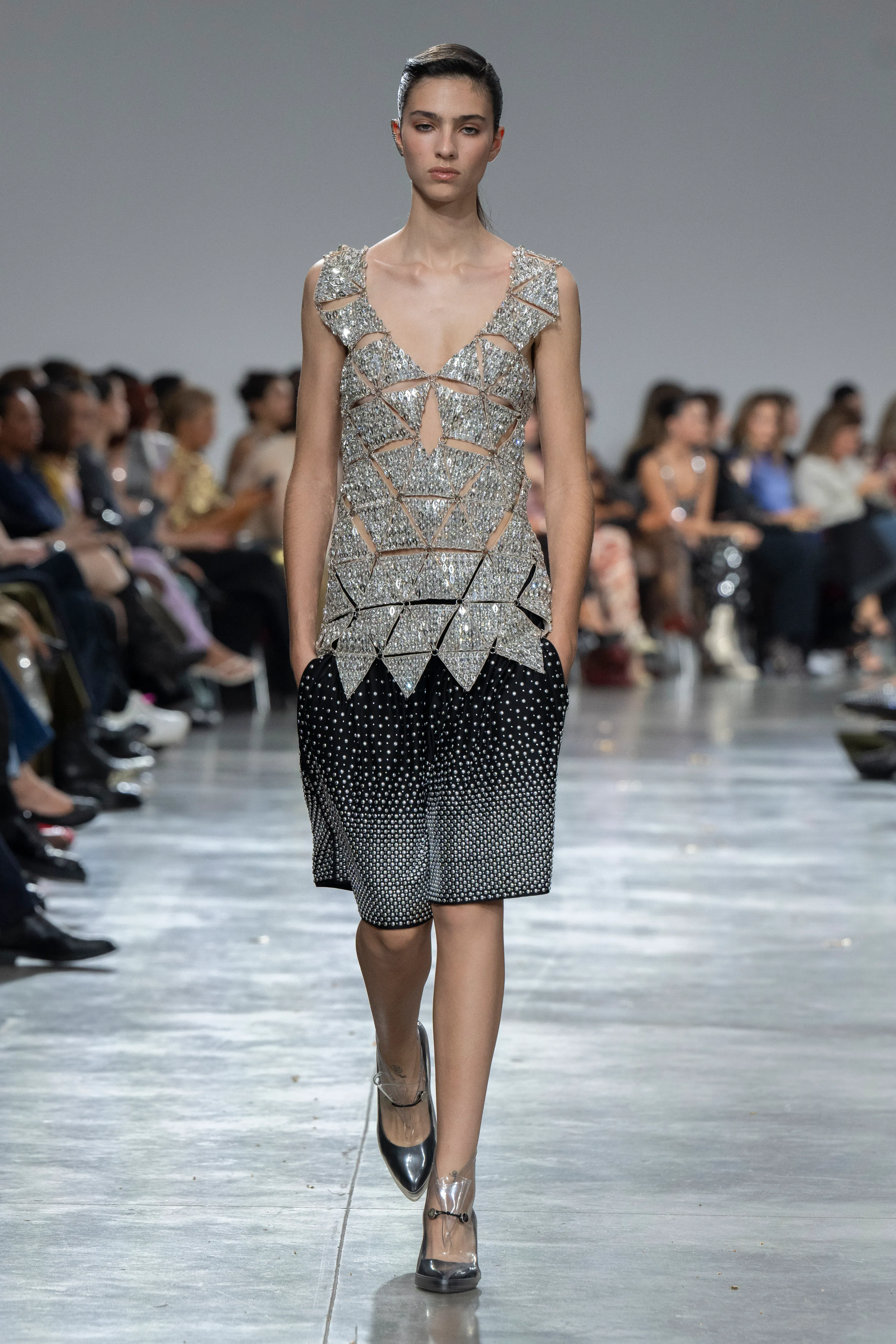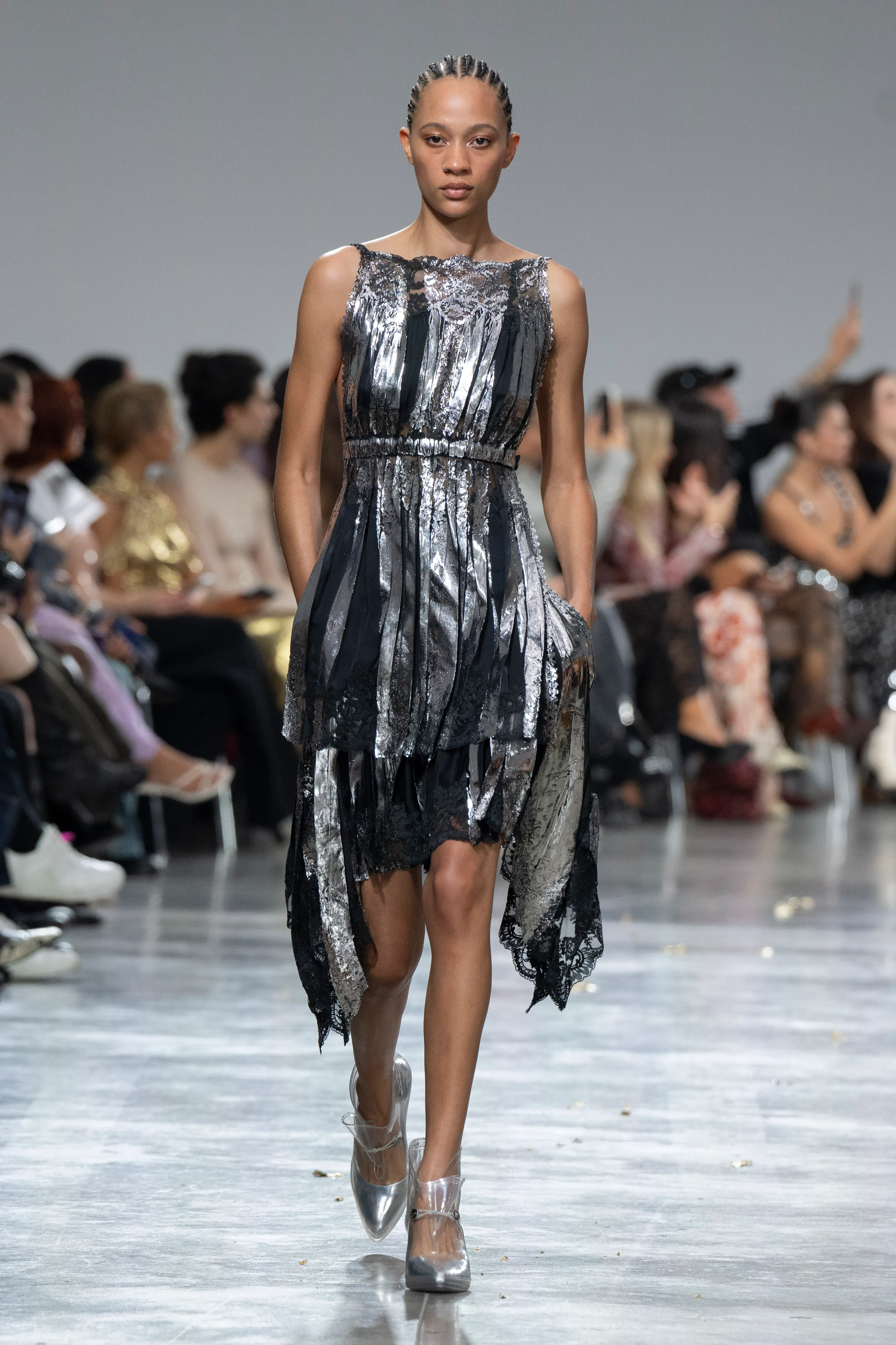 La radicalité est relative. La radicalité n’est pas toujours révolutionnaire, ni instantanée, ni même évidente. Mais la radicalité est ce qui motivera toujours rabanne à travers les matériaux, l'artisanat et le style. La collection printemps-été 2025 continue de pousser la dualité du quotidien et de l'exquis. Julien Dossena commence par des looks courts et superposés qui attirent le regard. Des mailles torsadées givrées, des dentelles guipure métallisées et des jacquards argentés qui simultanément suggèrent l’aspect industriel du packaging et le lustre du futur. L'influence parisienne qui transforme les standards preppy – hauts de rugby, cravates repp et caleçons rayés – en des coupe-vent doublés d'argent, des jupes utilitaires à boucles et des hauts en popeline de papier qui s'ouvrent dans le dos. Au milieu de ces pièces spéciales, la simplicité du vêtement quotidien : un blouson en chambray lavé, un caban en cuir ou des blazers pour hommes dotés d'une taille à cordon. Une ample veste noire aux revers de sequins réfléchissants apparaît comme une boîte ouverte, révélant une couche de tablier semblable à une armure cloutée et un kilt porté sur une chemise blanche impeccable. Du contenu au libéré, la lingerie et les robes tablier effleurent et embellissent le corps au milieu de fabrications de plus en plus somptueuses qui donnent naissance à des silhouettes assemblées à partir de panneaux géométriques minutieusement brodés entre chaîne délicate et diaphane mousseline. Avec cette collection, rabanne dévoilera les Editions Artisan. Fidèle à la poursuite de l'expérimentation matérielle, les disques métalliques issus des tabliers de boucher ont été minutieusement réinventé à travers trois collaborations exceptionnelles avec Arthus Bertrand en médailles, Astier de Villatte en céramique et Venini en verre soufflé. En appliquant des techniques de couture aux créations portables, Dossena joue avec les pièces qui définissent rabanne comme s'il s'agissait d'un puzzle sophistiqué, respectant la relativité et la radicalité avant tout, sur une bande son "So 2000" avec "Gourmandises", titre phare de la chanteuse Alizée.