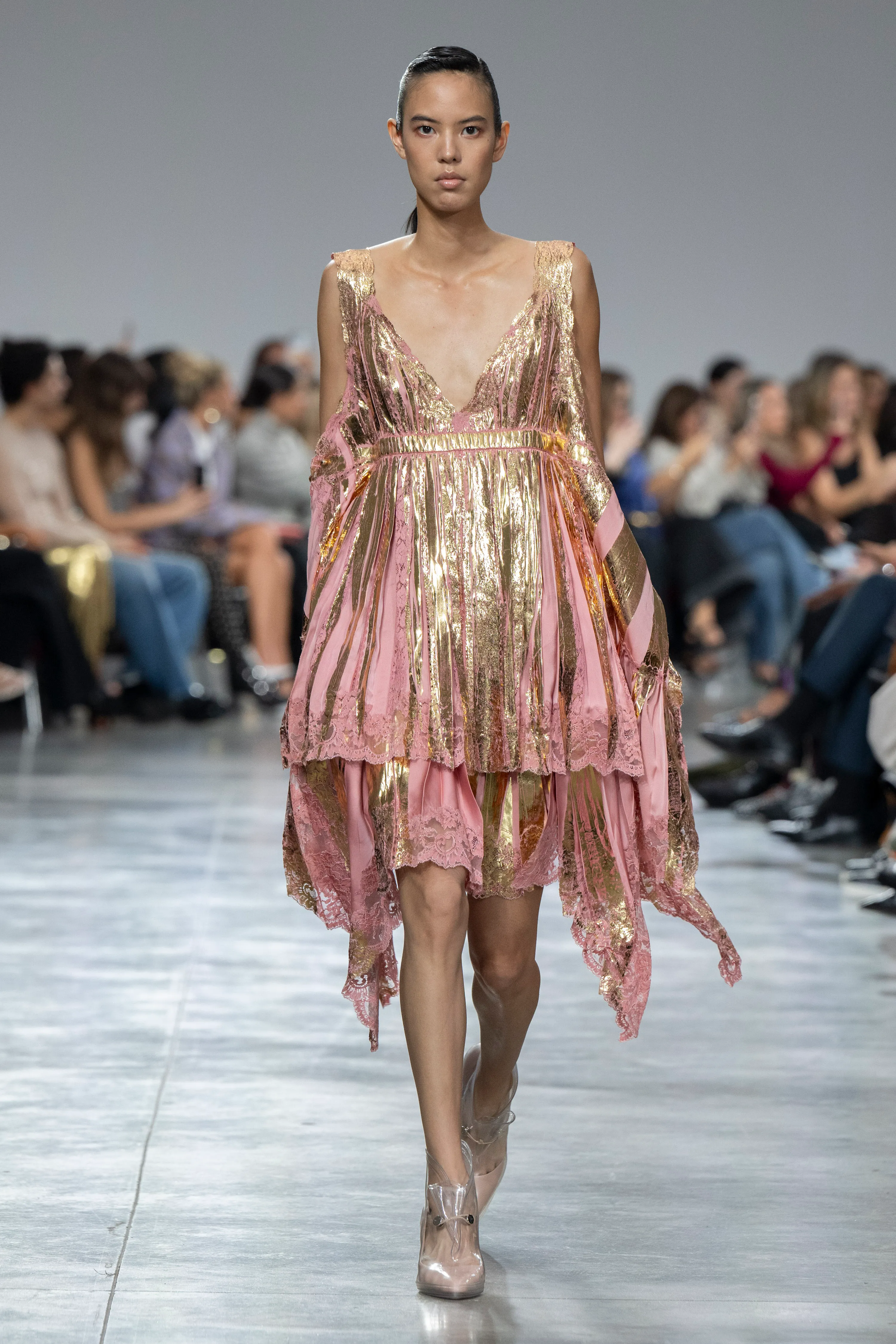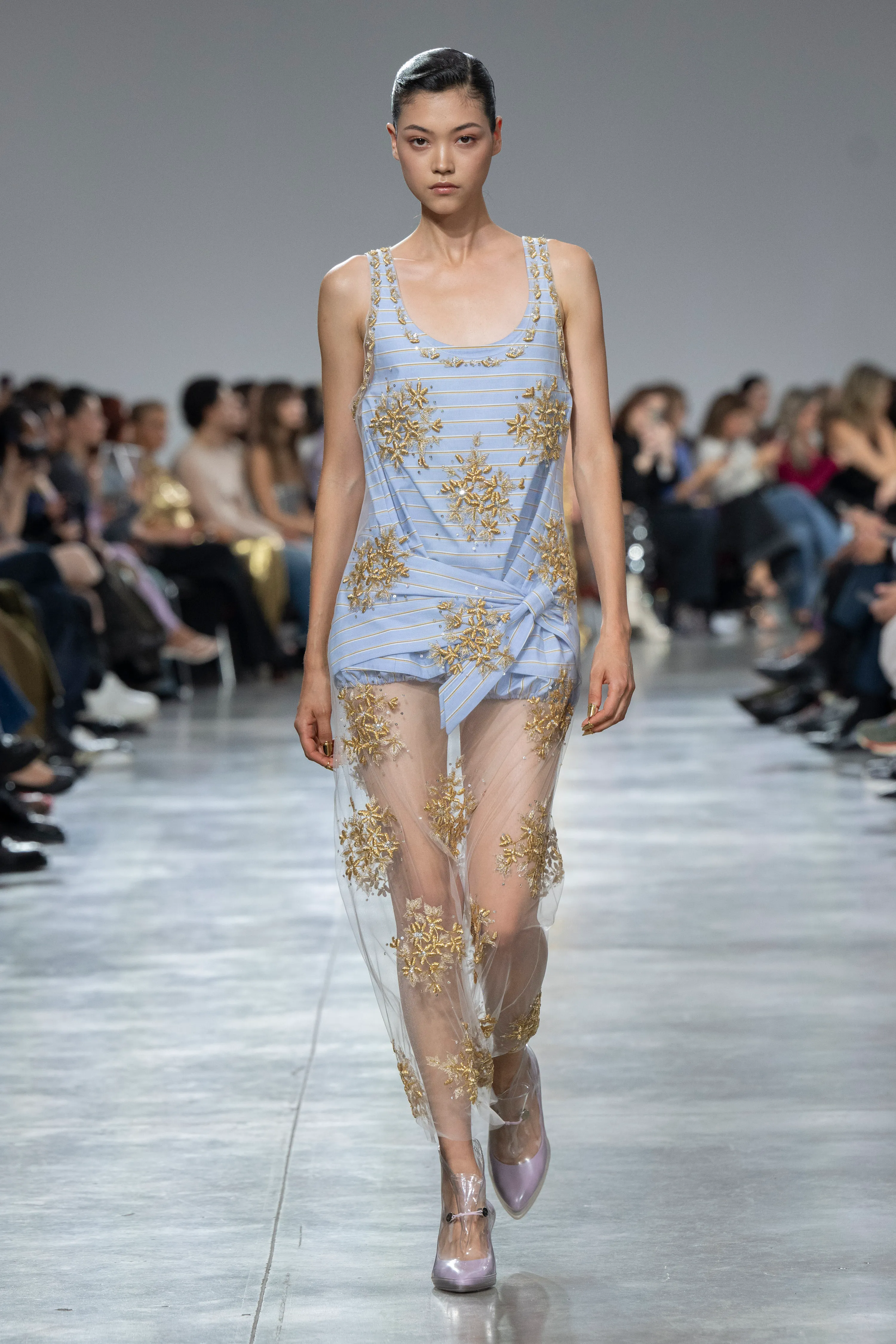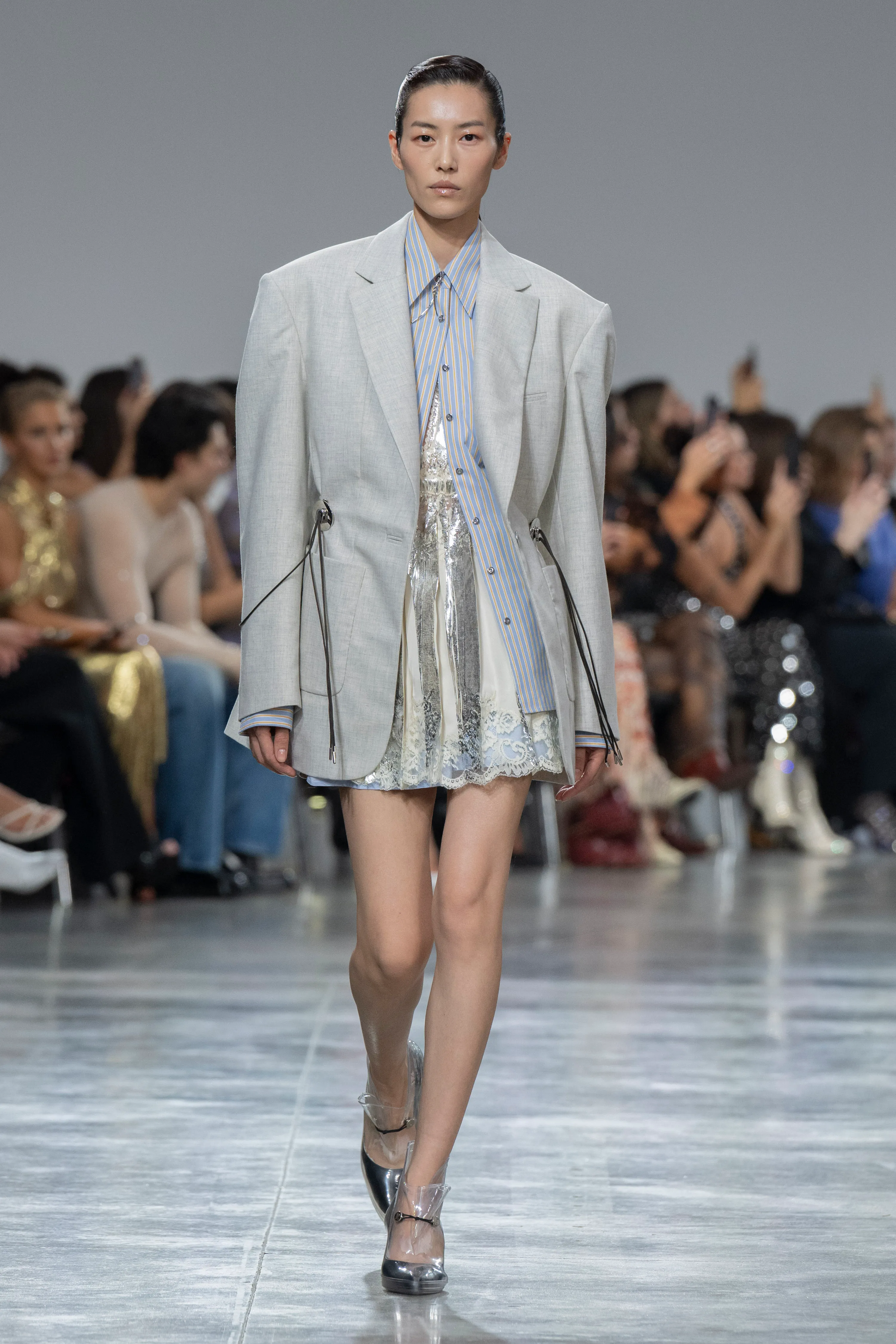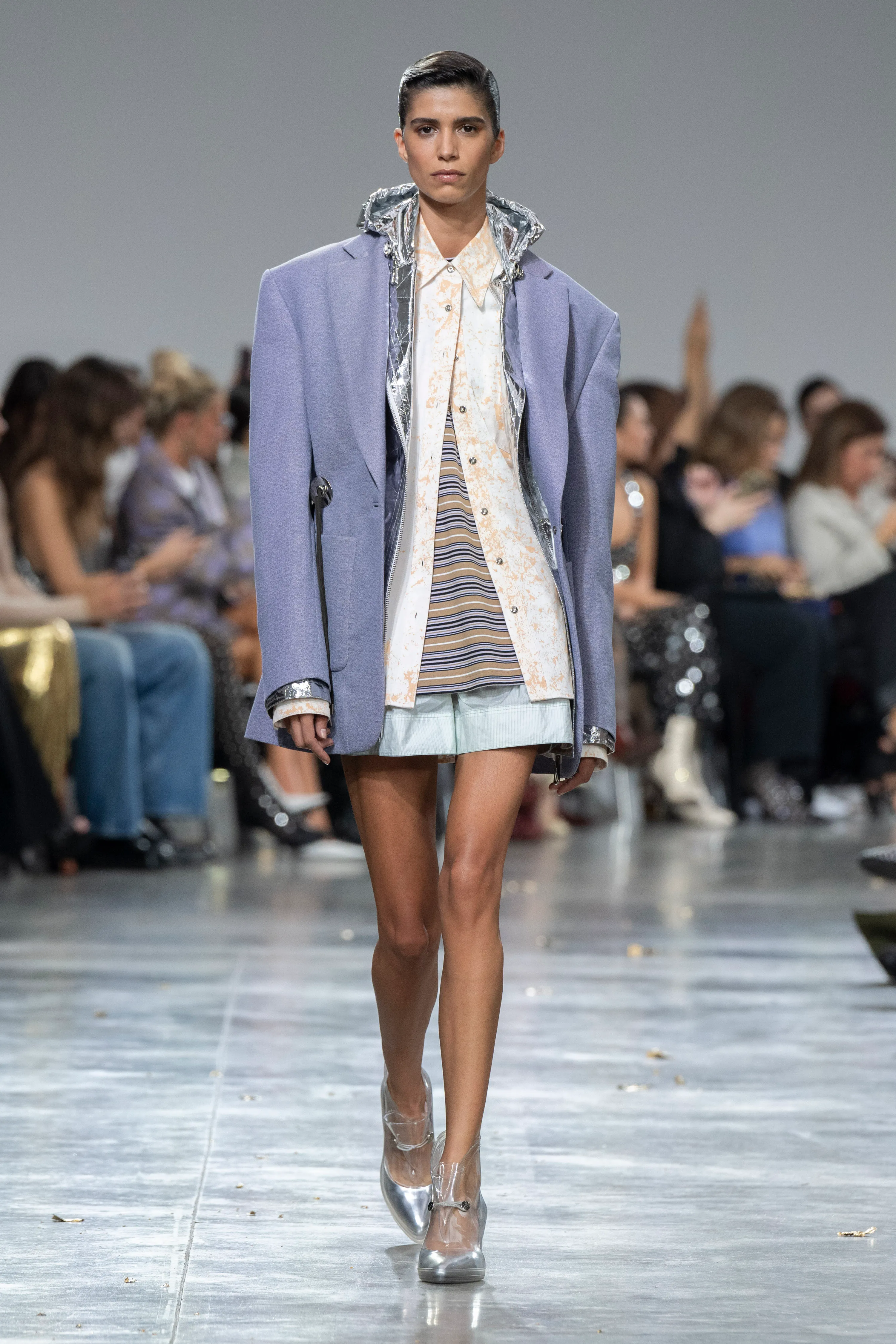 La radicalité est relative. La radicalité n’est pas toujours révolutionnaire, ni instantanée, ni même évidente. Mais la radicalité est ce qui motivera toujours rabanne à travers les matériaux, l'artisanat et le style. La collection printemps-été 2025 continue de pousser la dualité du quotidien et de l'exquis. Julien Dossena commence par des looks courts et superposés qui attirent le regard. Des mailles torsadées givrées, des dentelles guipure métallisées et des jacquards argentés qui simultanément suggèrent l’aspect industriel du packaging et le lustre du futur. L'influence parisienne qui transforme les standards preppy – hauts de rugby, cravates repp et caleçons rayés – en des coupe-vent doublés d'argent, des jupes utilitaires à boucles et des hauts en popeline de papier qui s'ouvrent dans le dos. Au milieu de ces pièces spéciales, la simplicité du vêtement quotidien : un blouson en chambray lavé, un caban en cuir ou des blazers pour hommes dotés d'une taille à cordon. Une ample veste noire aux revers de sequins réfléchissants apparaît comme une boîte ouverte, révélant une couche de tablier semblable à une armure cloutée et un kilt porté sur une chemise blanche impeccable. Du contenu au libéré, la lingerie et les robes tablier effleurent et embellissent le corps au milieu de fabrications de plus en plus somptueuses qui donnent naissance à des silhouettes assemblées à partir de panneaux géométriques minutieusement brodés entre chaîne délicate et diaphane mousseline. Avec cette collection, rabanne dévoilera les Editions Artisan. Fidèle à la poursuite de l'expérimentation matérielle, les disques métalliques issus des tabliers de boucher ont été minutieusement réinventé à travers trois collaborations exceptionnelles avec Arthus Bertrand en médailles, Astier de Villatte en céramique et Venini en verre soufflé. En appliquant des techniques de couture aux créations portables, Dossena joue avec les pièces qui définissent rabanne comme s'il s'agissait d'un puzzle sophistiqué, respectant la relativité et la radicalité avant tout, sur une bande son "So 2000" avec "Gourmandises", titre phare de la chanteuse Alizée.