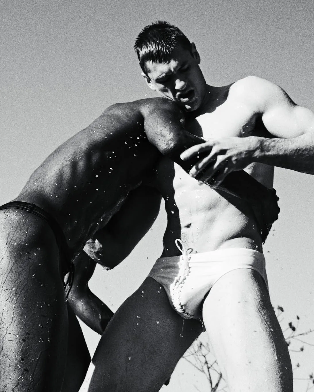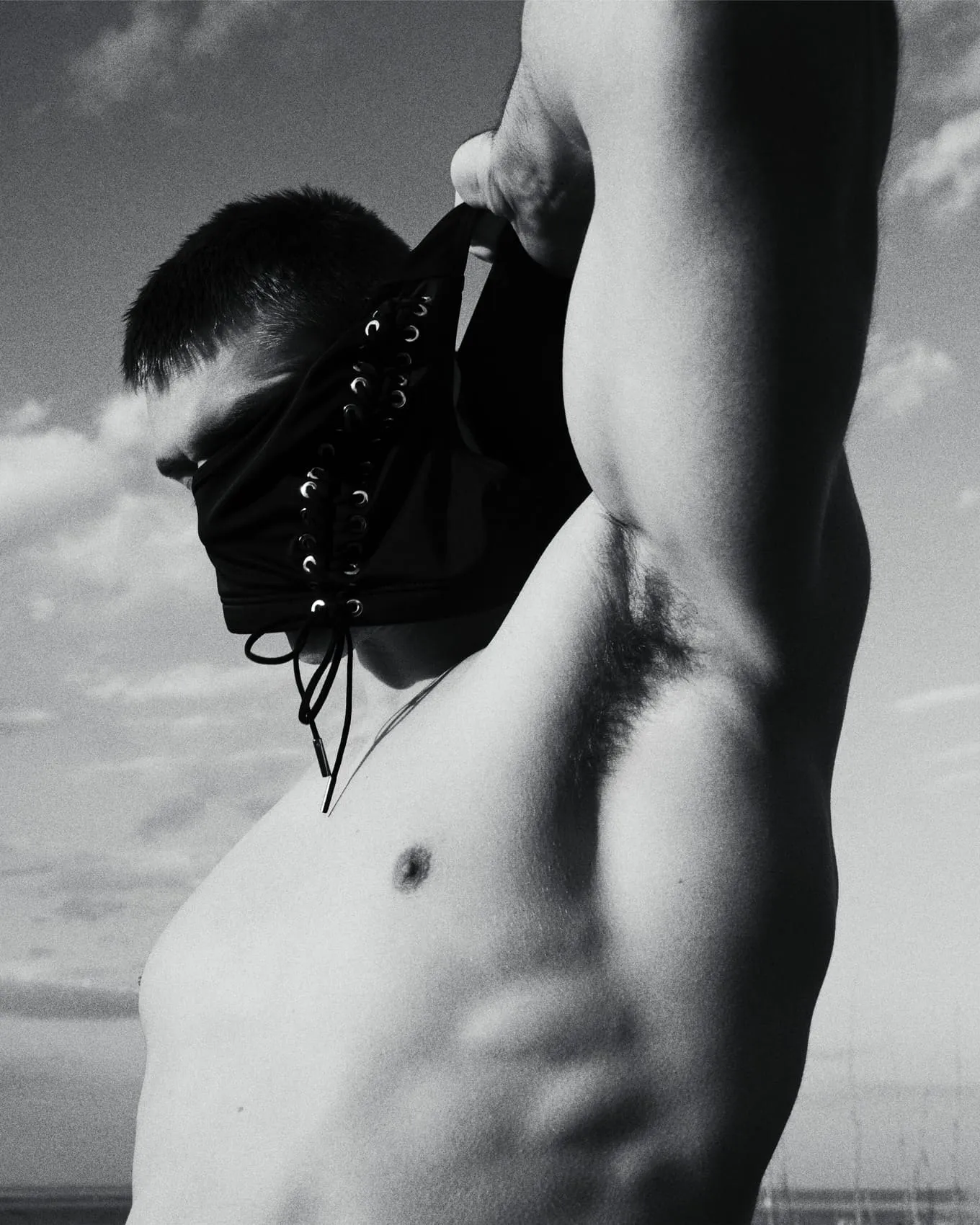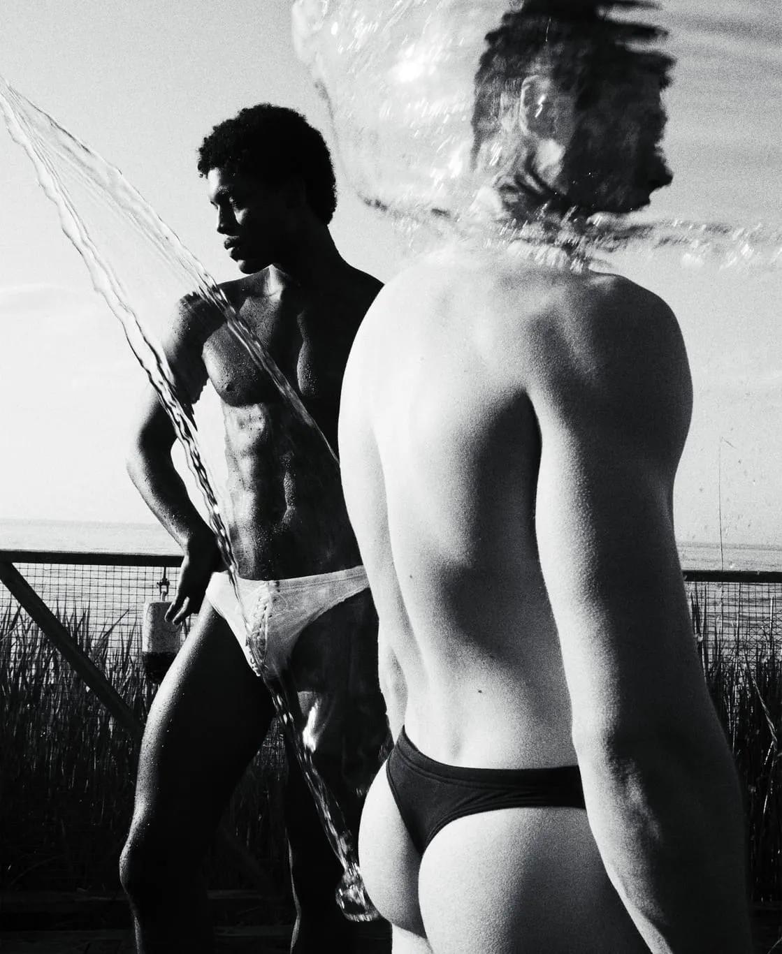Capturée par l'objectif de Stuart Winecoff au 231 Bay Walk, cette série d'images transcende la simple présentation produit pour devenir un véritable manifeste visuel. Les photographies saisissent l'essence même de l'esprit Fire Island : l'expression libre, l'érotisme brut et le respect profond de la culture queer qui animent la vision créative de Ludovic de Saint Sernin. Les images révèlent une intimité palpable : des corps baignés de sueur se prélassent côte à côte sur les plages de sable fin, les fines ceintures des strings de bain sont tirées avec une désinvolture ludique, tandis que des regards complices s'échangent dans les miroirs des salles de bain et par-dessus les balustrades du front de mer.