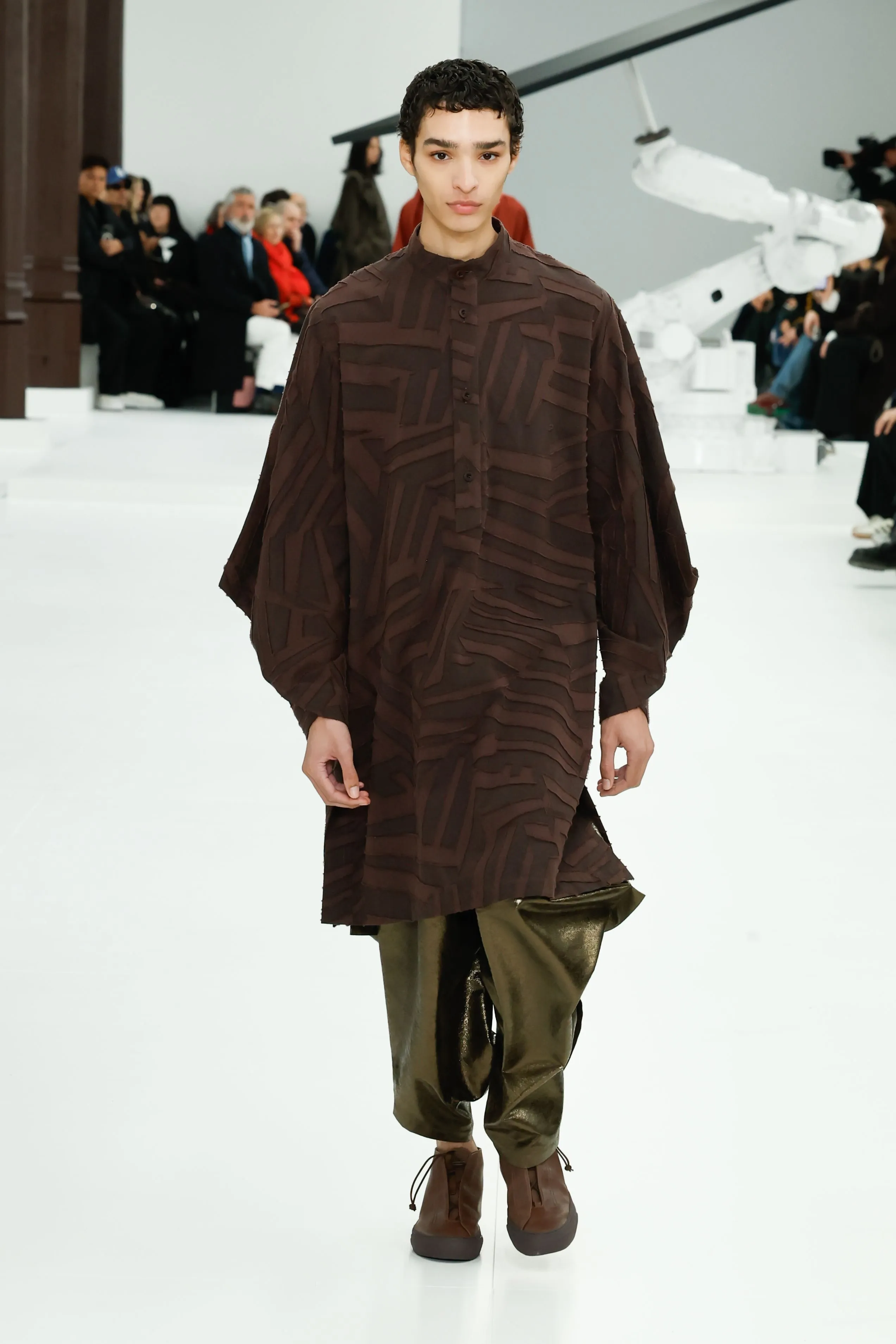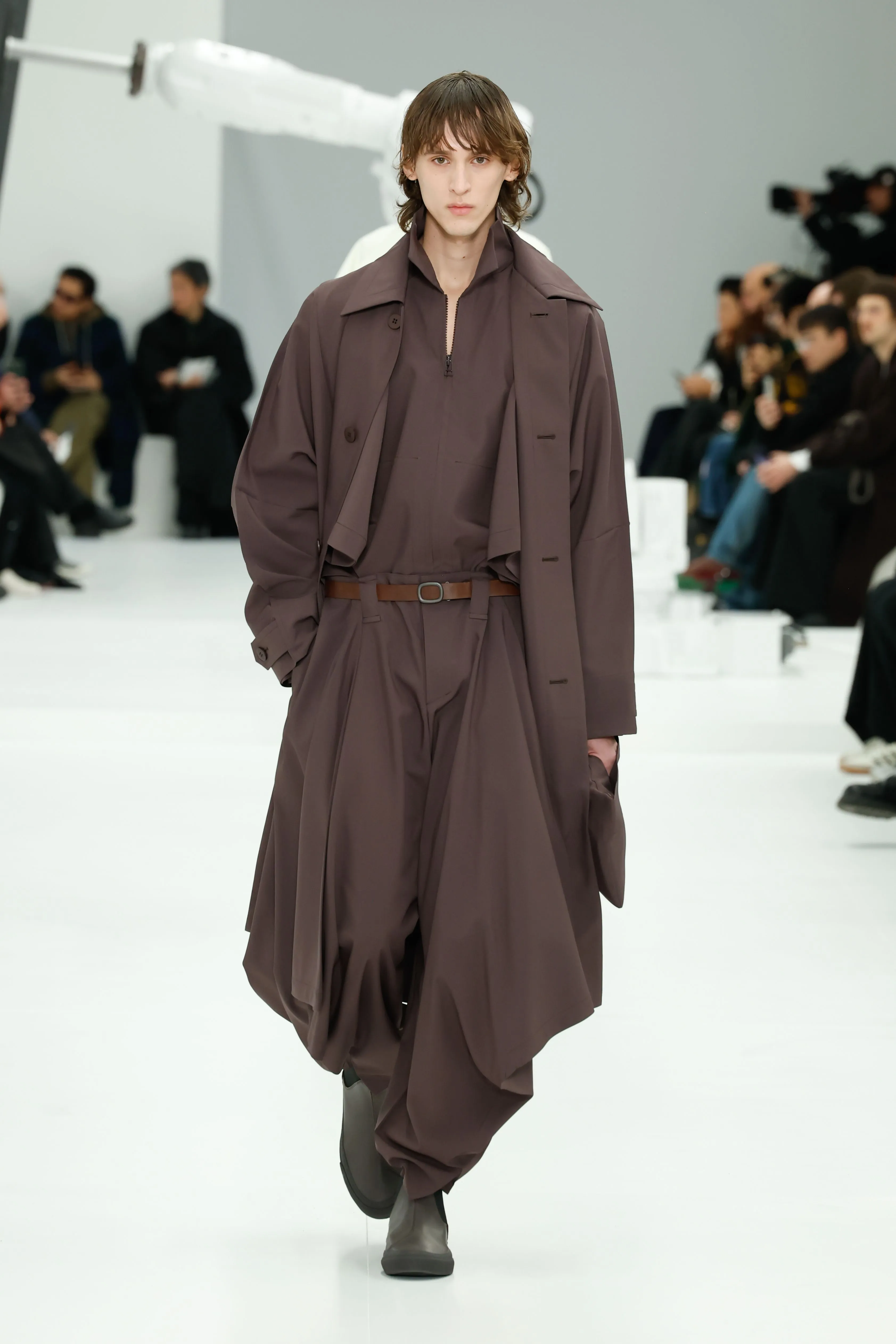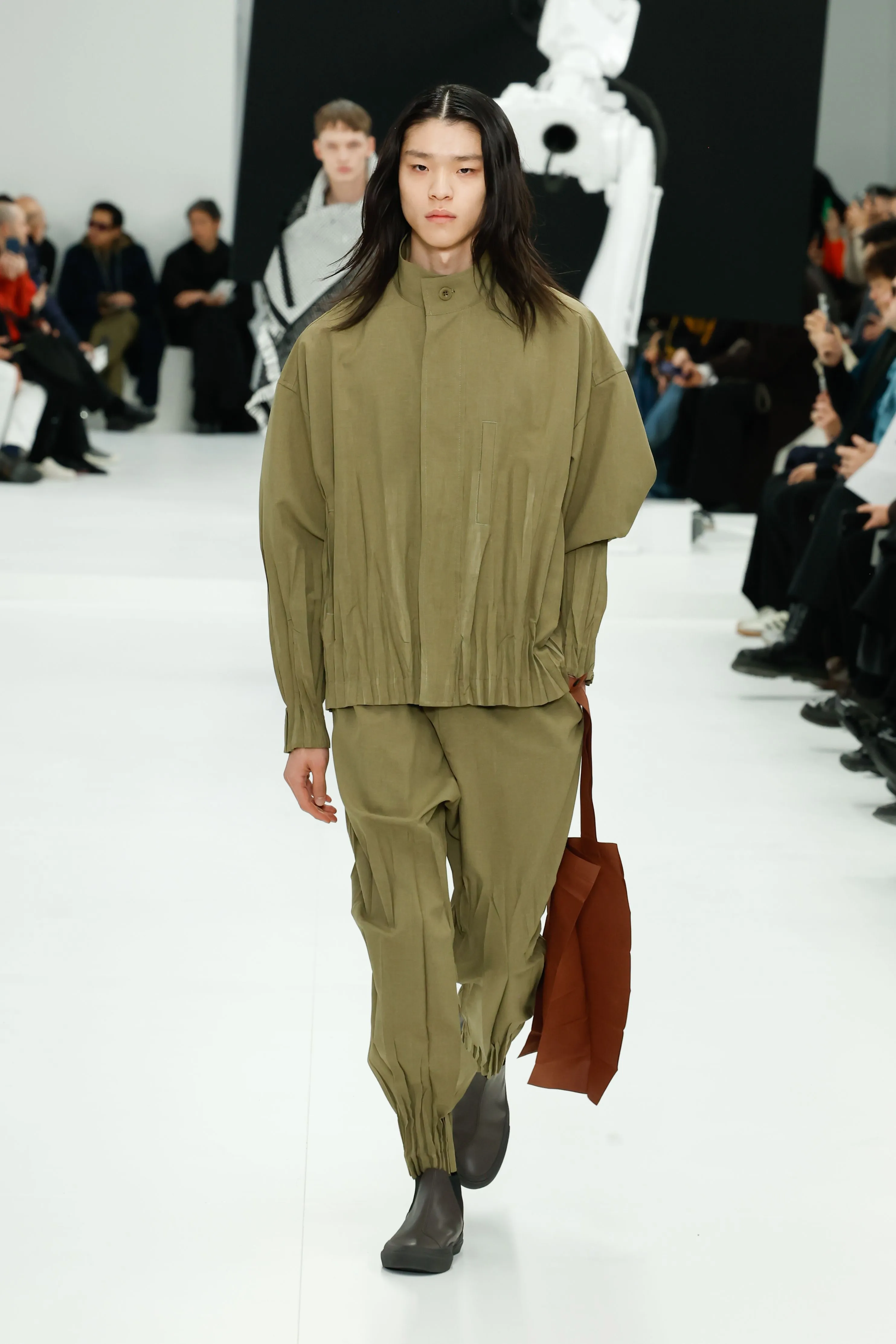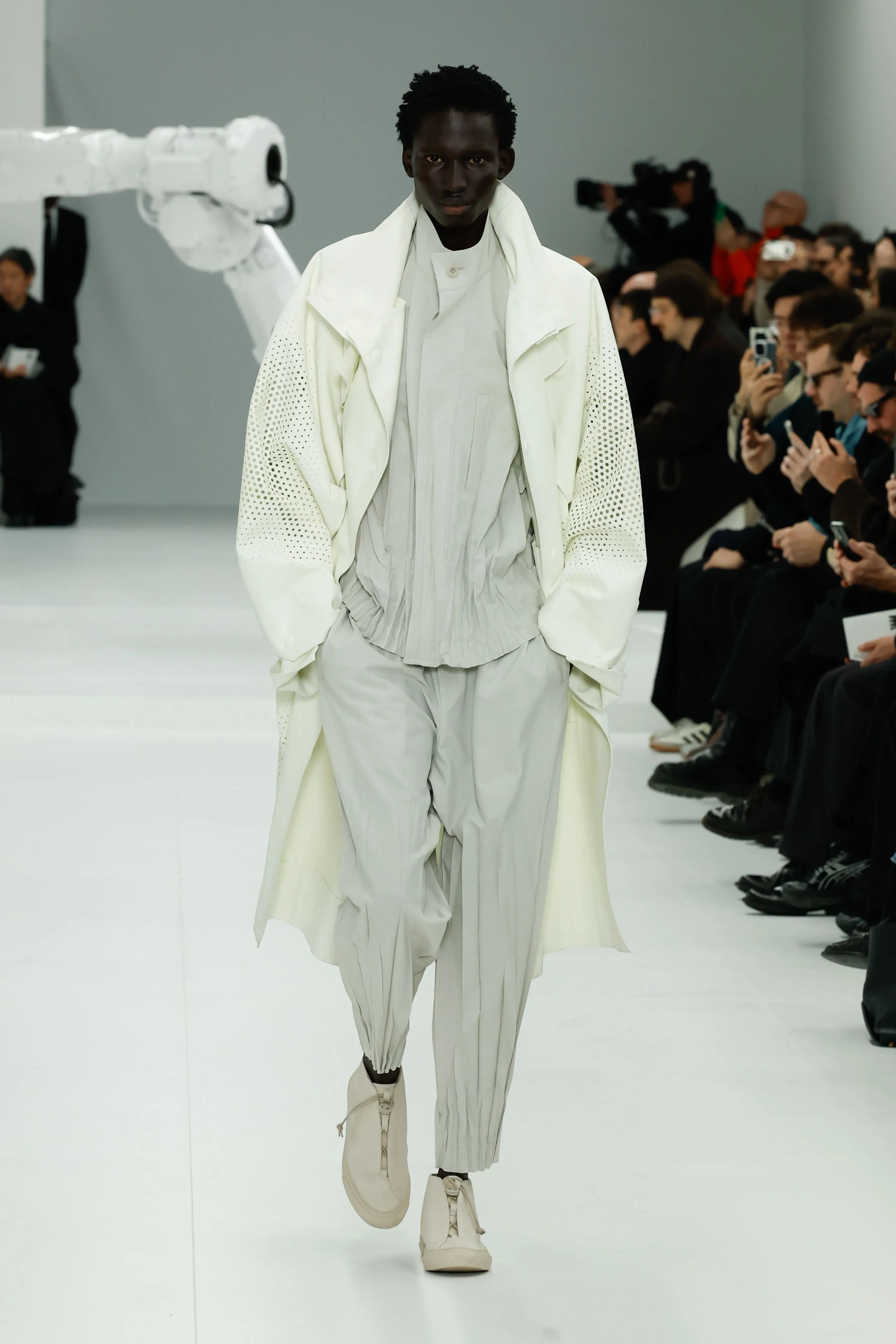 Présentée ce jeudi au Réfectoire des Cordeliers, un ancien couvent construit au début du XVIe siècle à Paris, la collection Issey Miyake automne-hiver 2025-2026 est intitulée "FLY WITH IM MEN". Lancée en 2021, cette ligne explore des approches innovantes dans la conception de vêtements en harmonie avec le corps humain, en s'inspirant du concept d'Issey Miyake a piece of cloth. L’équipe de design s’attache à redéfinir l’essence même du vêtement, en s’intéressant à la fois à sa forme et à sa structure, dans une démarche alliant design et ingénierie. Avec cette collection présentée pour la toute première fois à Paris, l’intention d’"IM MEN" est de proposer des produits qui franchissent toutes les frontières et offrent de nouvelles perspectives à un large public à travers des idées affranchies de toutes contraintes. L’installation, conçue par Tokujin Yoshioka, s’inspire du concept a piece of cloth. Une pièce de tissu, présente au cœur de l’espace commence à se mouvoir comme si elle prenait vie. Cette présentation illustre une ère où le dialogue entre artisanat traditionnel et technologie moderne prend tout son sens.