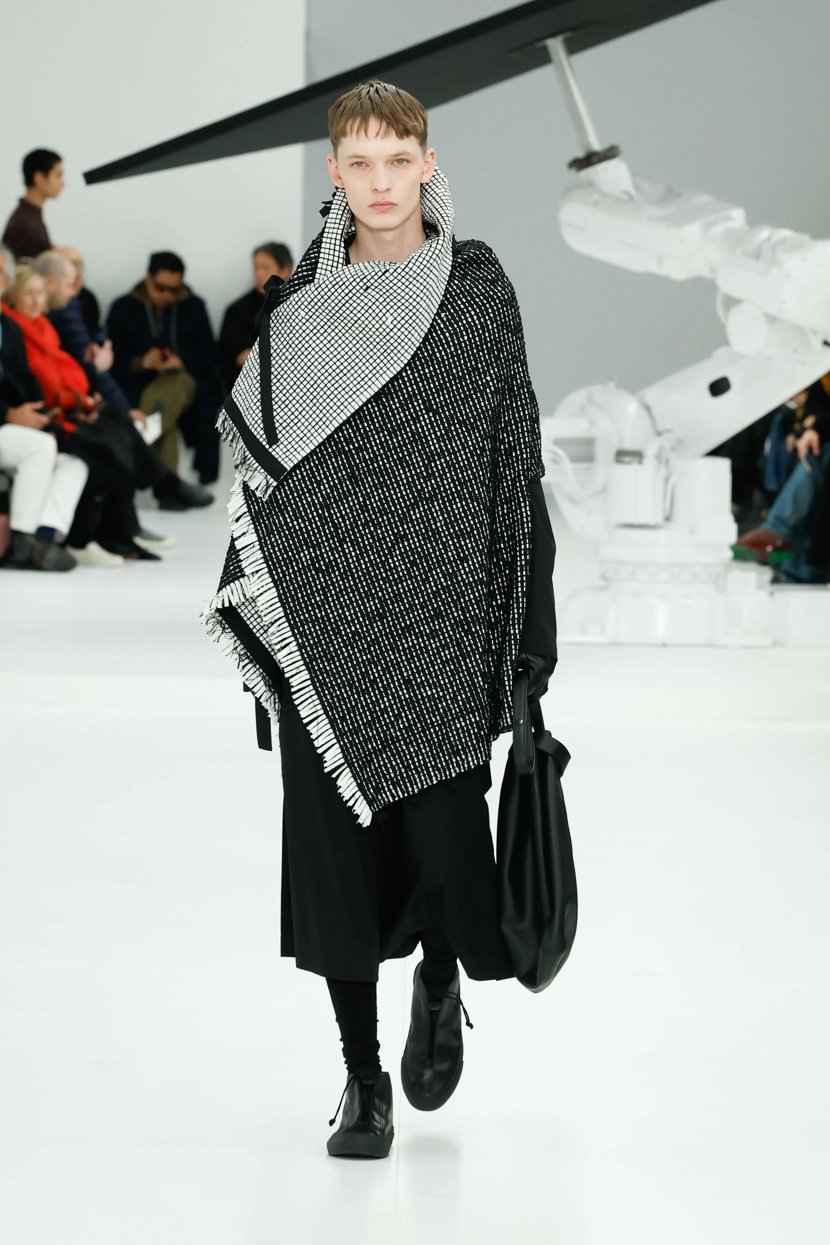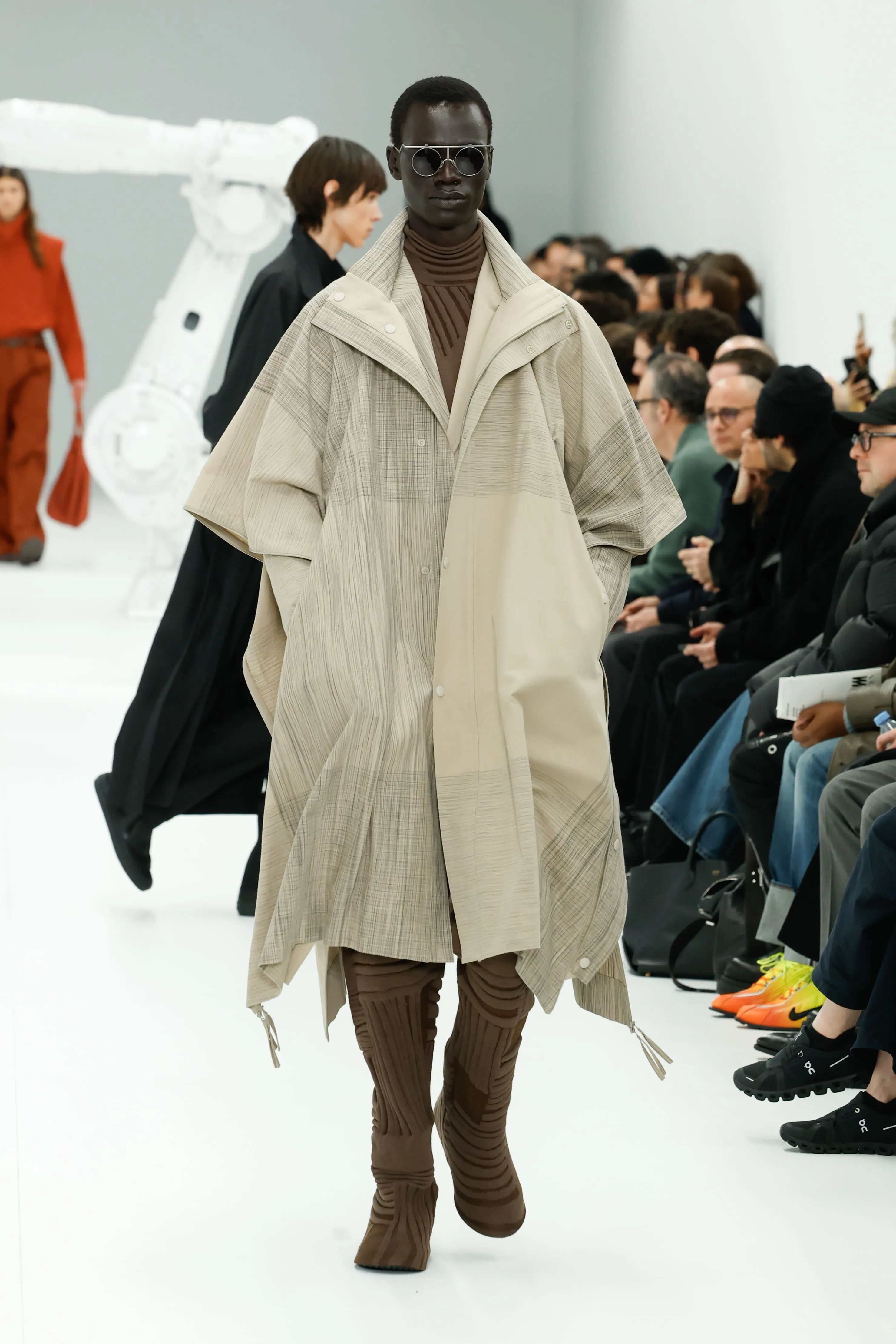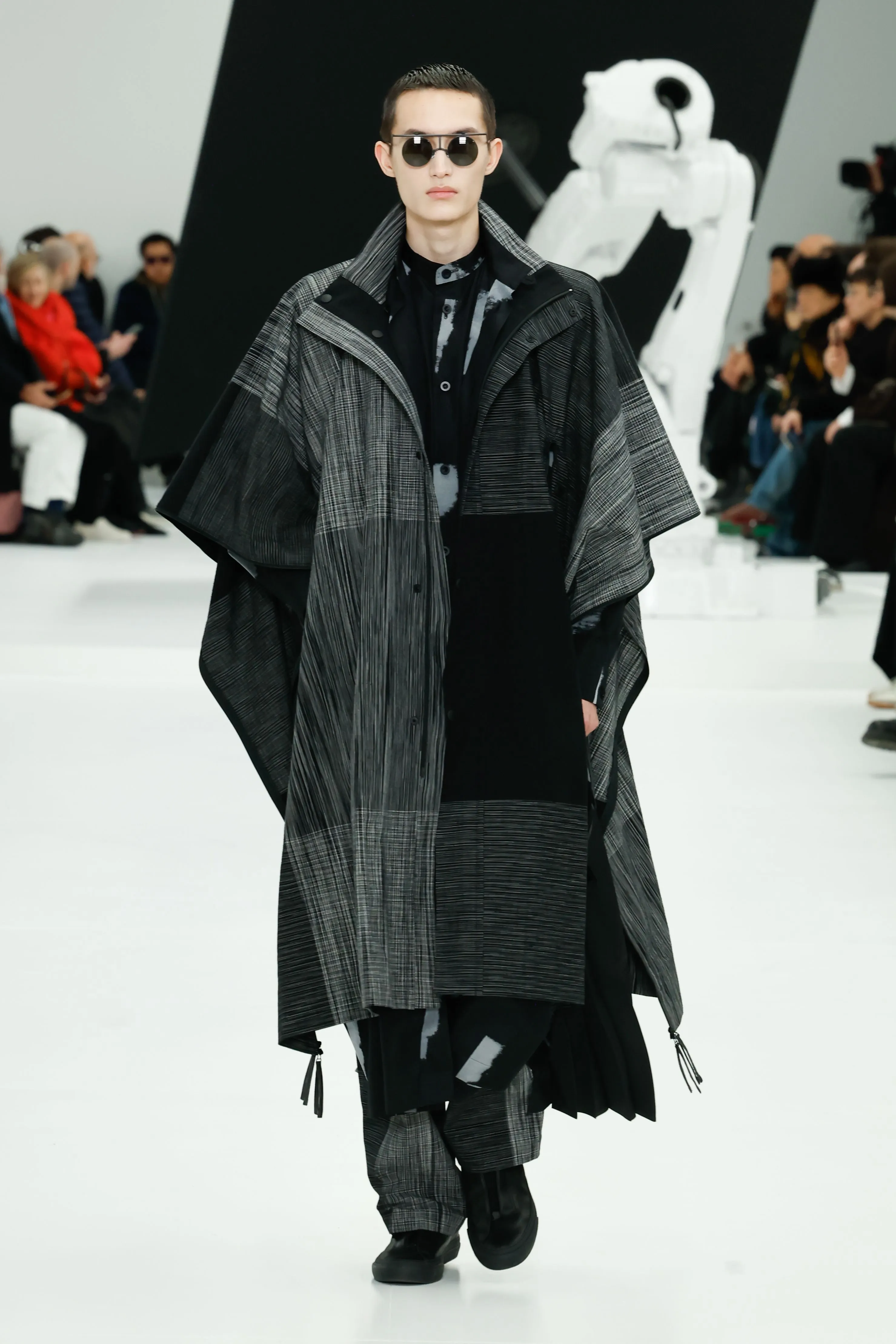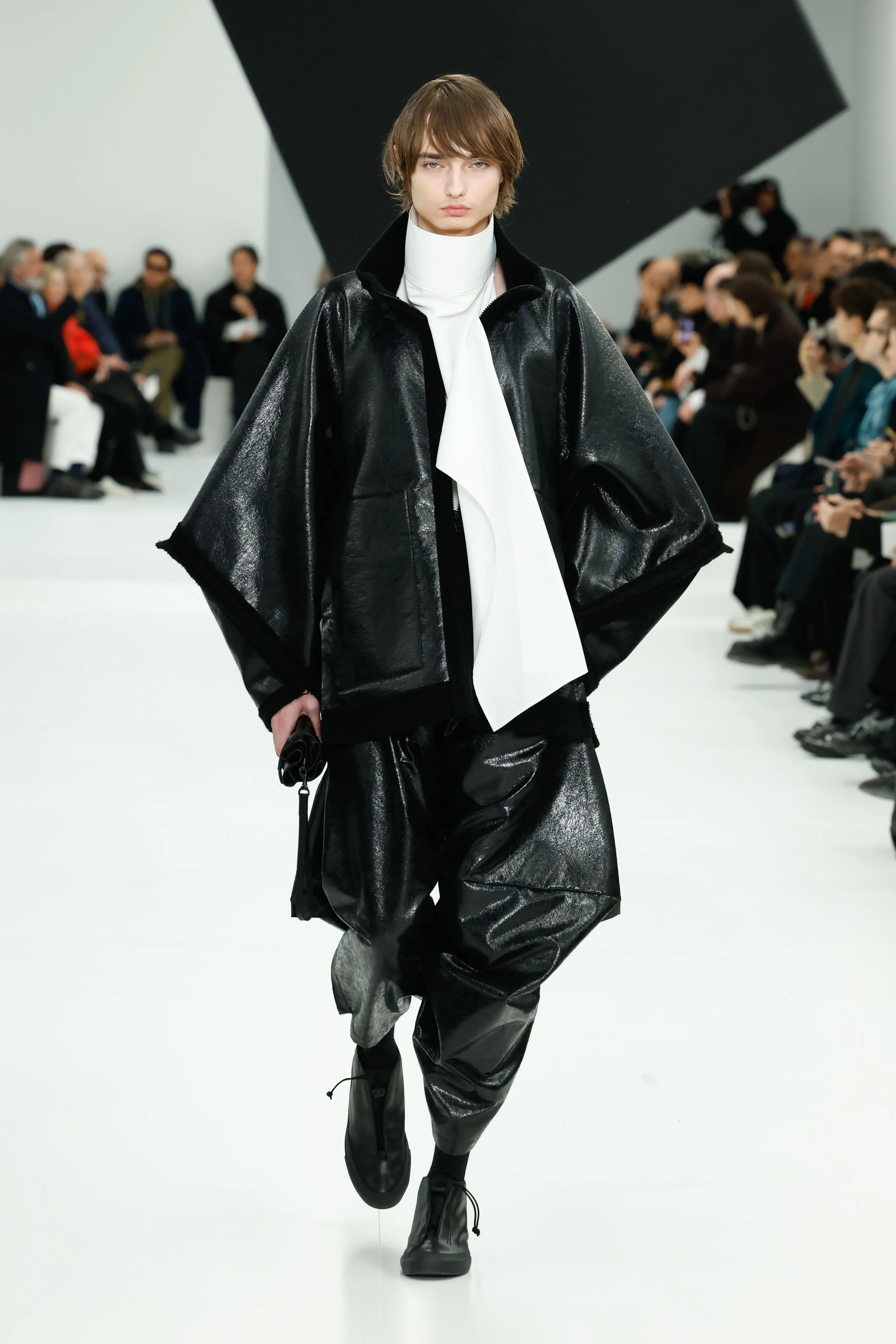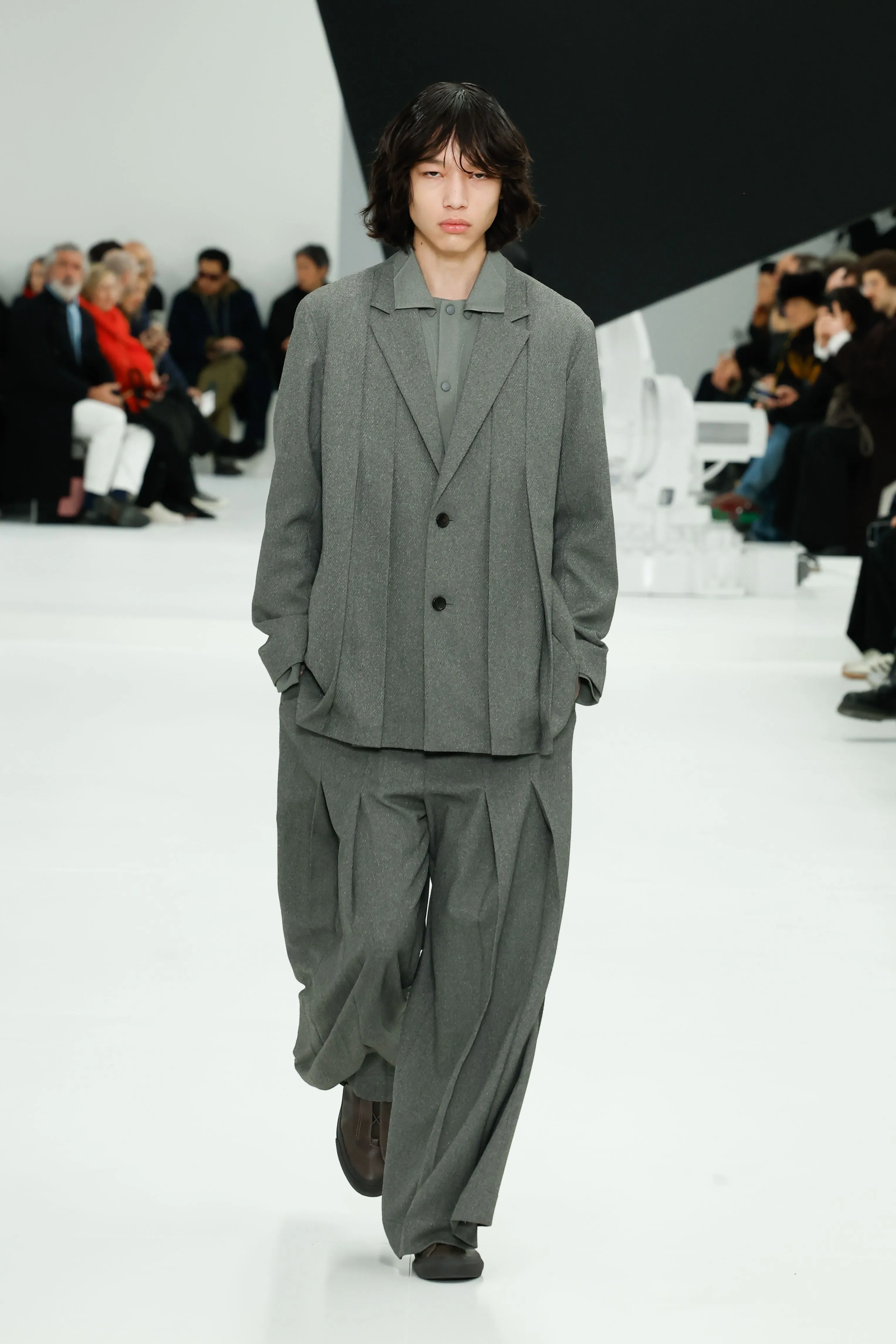 Présentée ce jeudi au Réfectoire des Cordeliers, un ancien couvent construit au début du XVIe siècle à Paris, la collection Issey Miyake automne-hiver 2025-2026 est intitulée "FLY WITH IM MEN". Lancée en 2021, cette ligne explore des approches innovantes dans la conception de vêtements en harmonie avec le corps humain, en s'inspirant du concept d'Issey Miyake a piece of cloth. L’équipe de design s’attache à redéfinir l’essence même du vêtement, en s’intéressant à la fois à sa forme et à sa structure, dans une démarche alliant design et ingénierie. Avec cette collection présentée pour la toute première fois à Paris, l’intention d’"IM MEN" est de proposer des produits qui franchissent toutes les frontières et offrent de nouvelles perspectives à un large public à travers des idées affranchies de toutes contraintes. L’installation, conçue par Tokujin Yoshioka, s’inspire du concept a piece of cloth. Une pièce de tissu, présente au cœur de l’espace commence à se mouvoir comme si elle prenait vie. Cette présentation illustre une ère où le dialogue entre artisanat traditionnel et technologie moderne prend tout son sens.