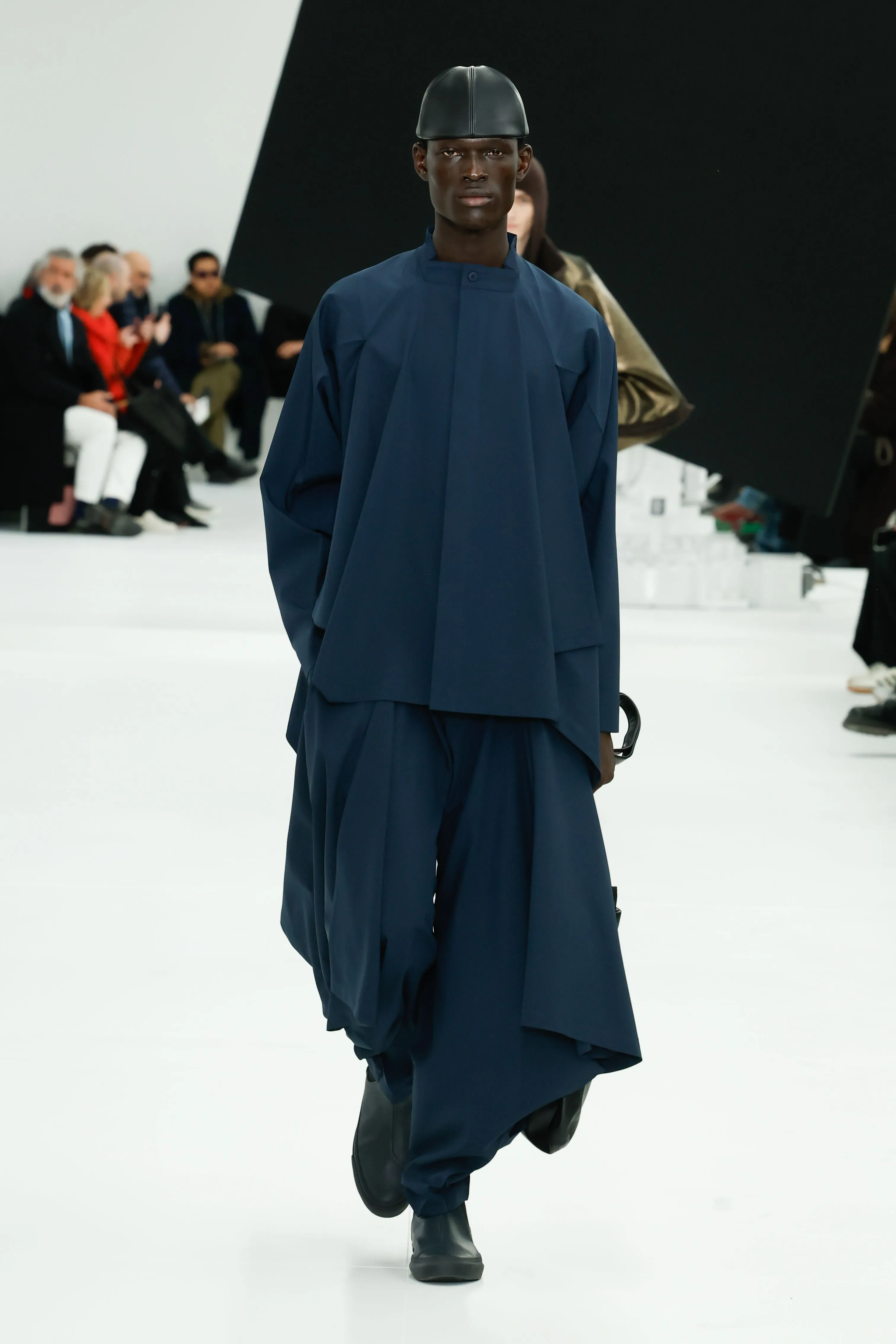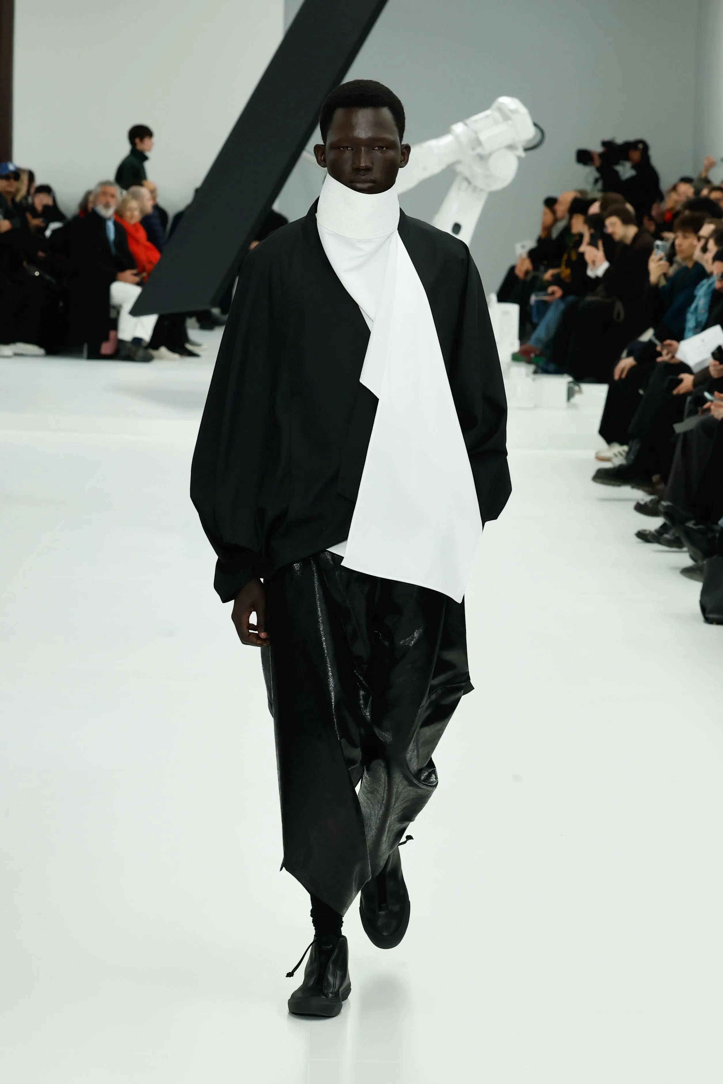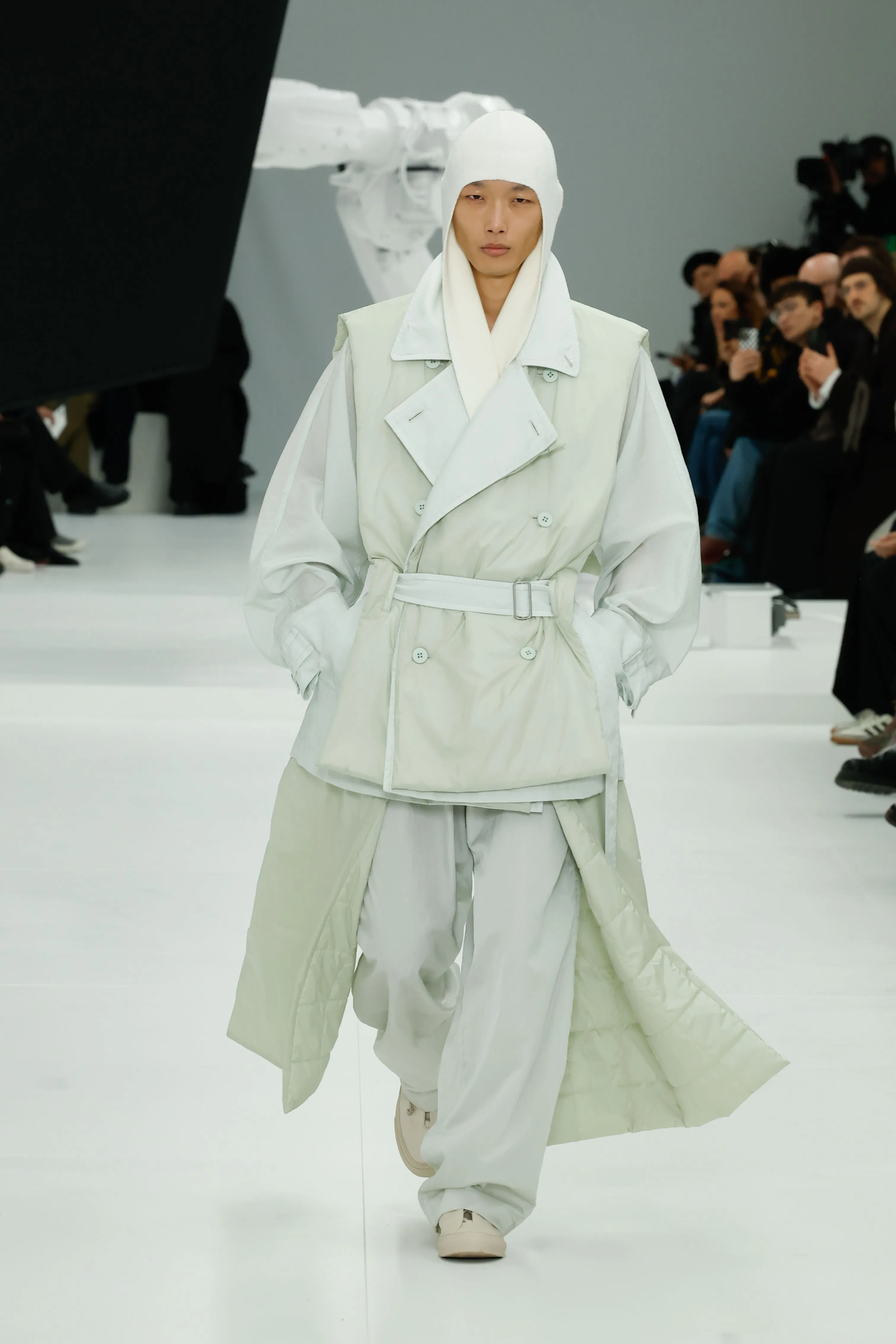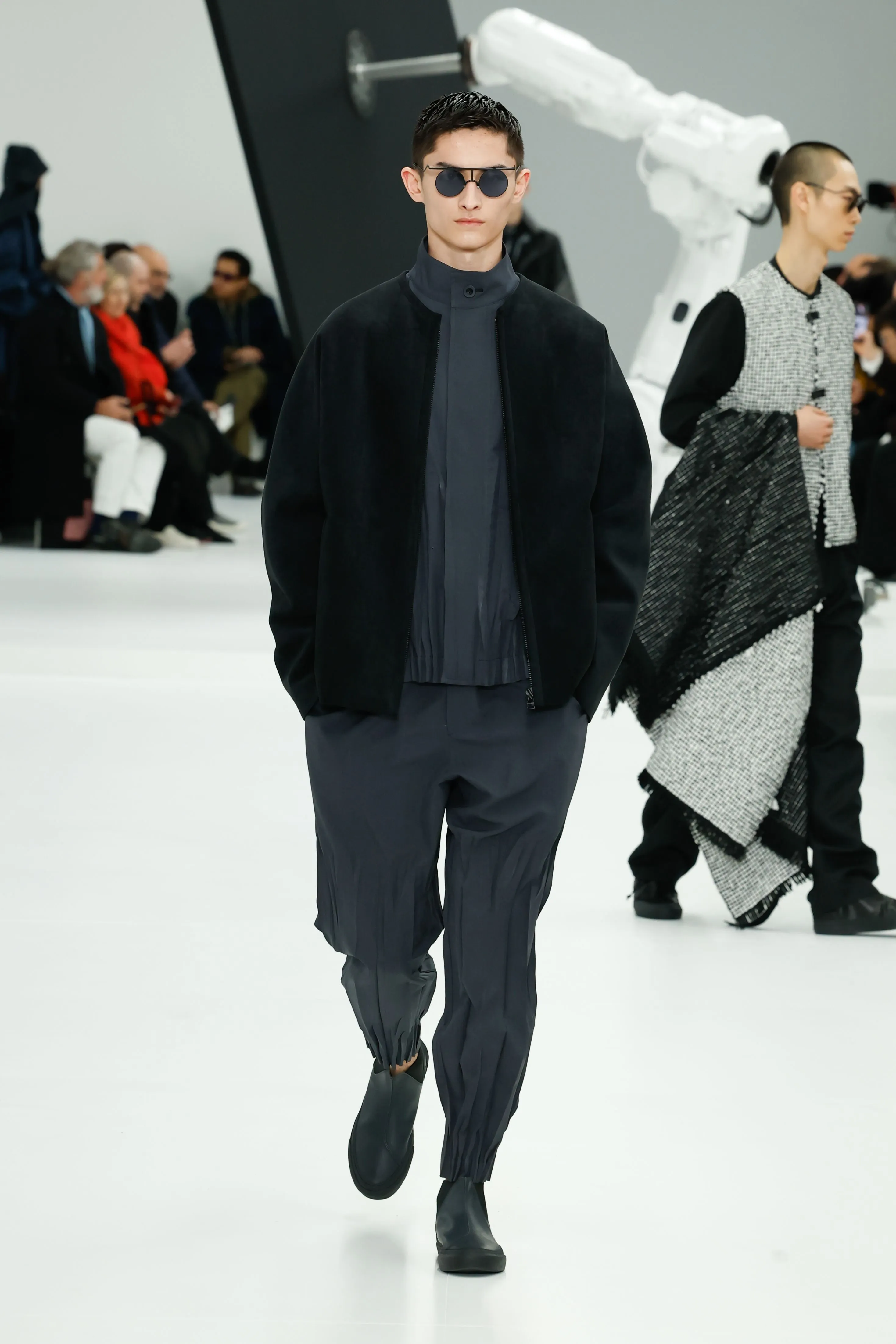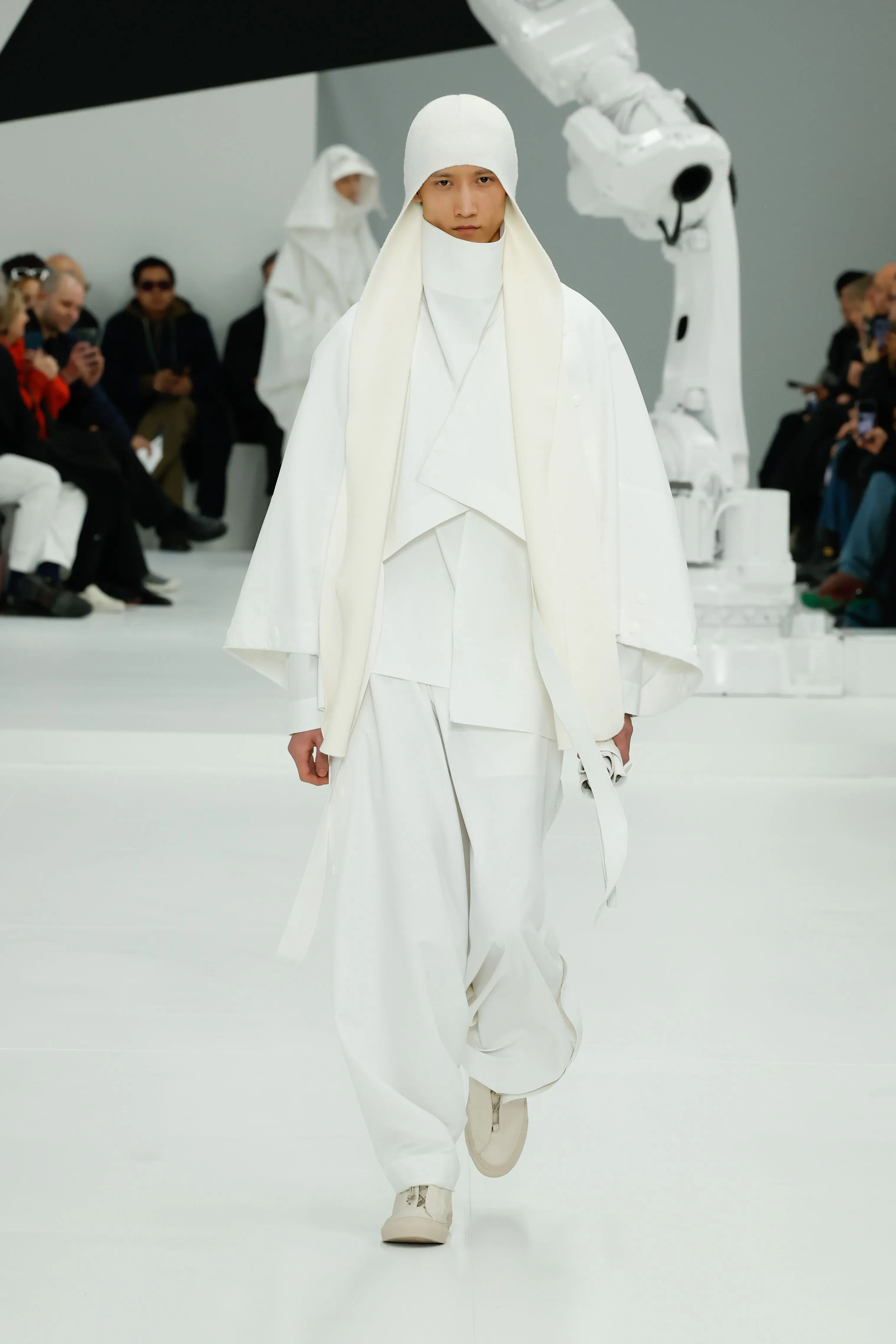 Présentée ce jeudi au Réfectoire des Cordeliers, un ancien couvent construit au début du XVIe siècle à Paris, la collection Issey Miyake automne-hiver 2025-2026 est intitulée "FLY WITH IM MEN". Lancée en 2021, cette ligne explore des approches innovantes dans la conception de vêtements en harmonie avec le corps humain, en s'inspirant du concept d'Issey Miyake a piece of cloth. L’équipe de design s’attache à redéfinir l’essence même du vêtement, en s’intéressant à la fois à sa forme et à sa structure, dans une démarche alliant design et ingénierie. Avec cette collection présentée pour la toute première fois à Paris, l’intention d’"IM MEN" est de proposer des produits qui franchissent toutes les frontières et offrent de nouvelles perspectives à un large public à travers des idées affranchies de toutes contraintes. L’installation, conçue par Tokujin Yoshioka, s’inspire du concept a piece of cloth. Une pièce de tissu, présente au cœur de l’espace commence à se mouvoir comme si elle prenait vie. Cette présentation illustre une ère où le dialogue entre artisanat traditionnel et technologie moderne prend tout son sens.