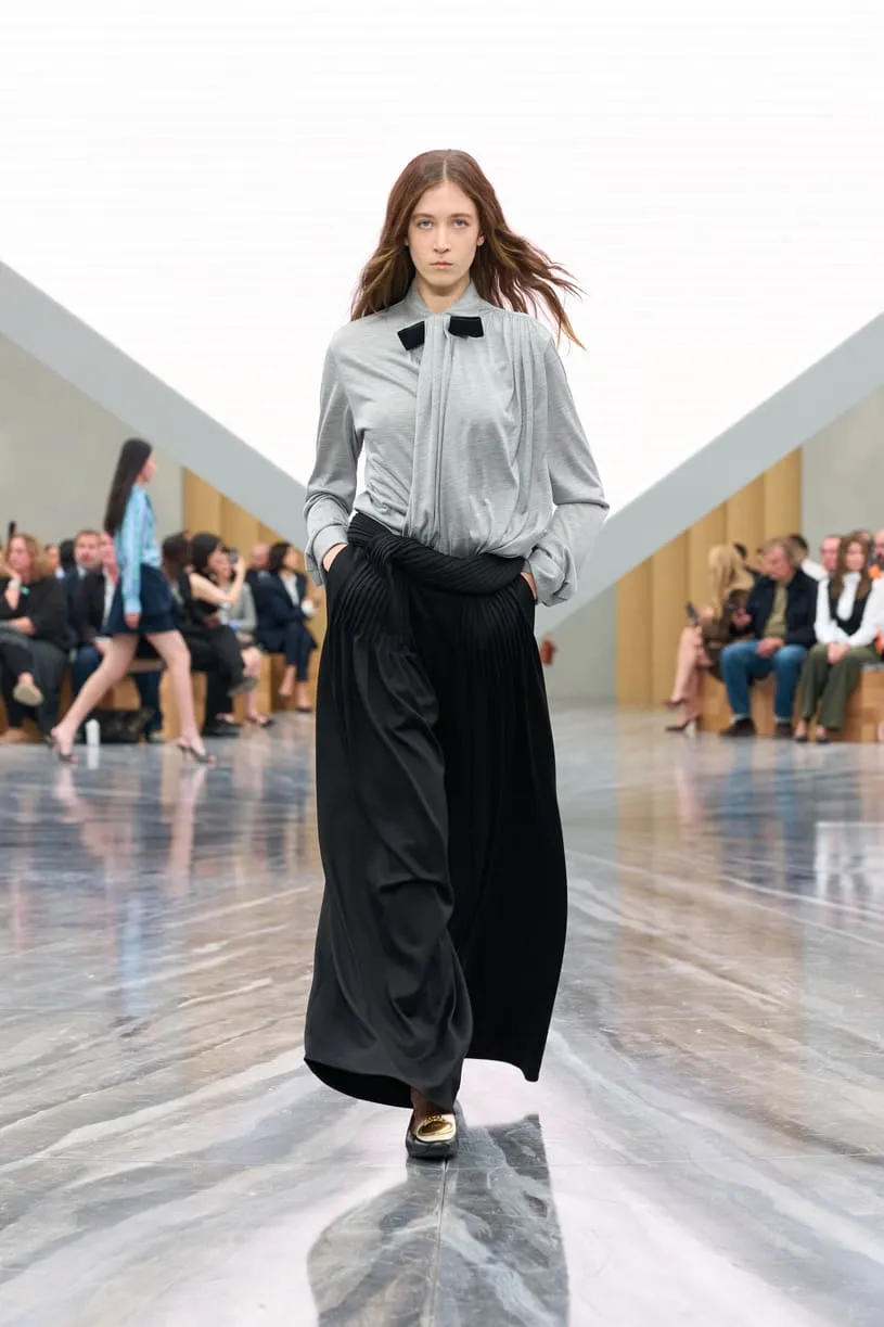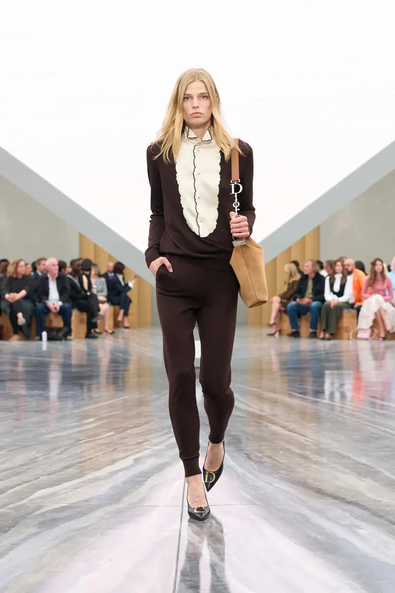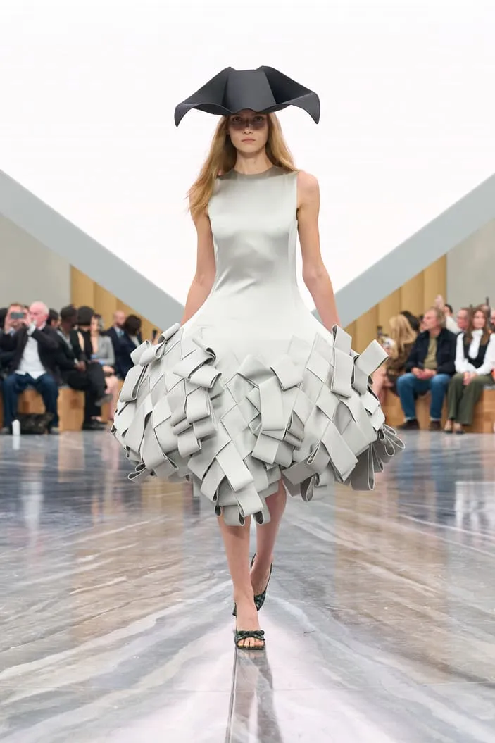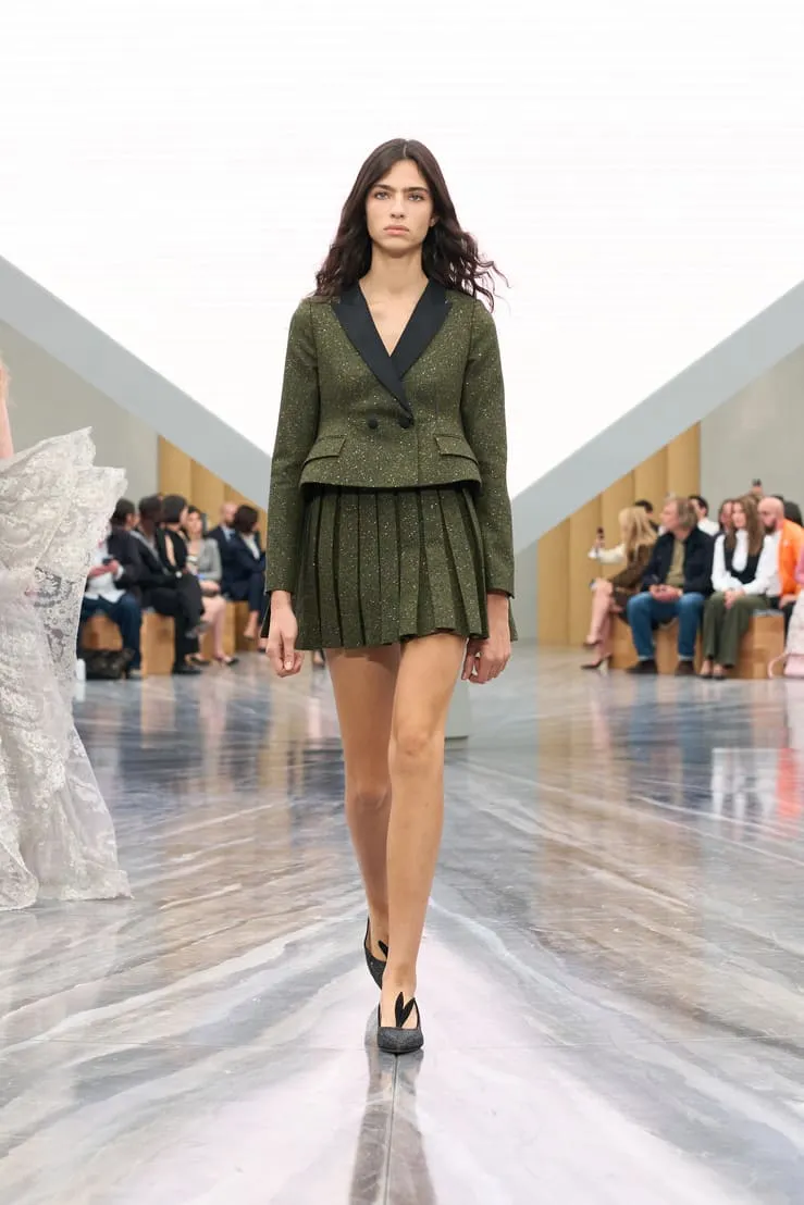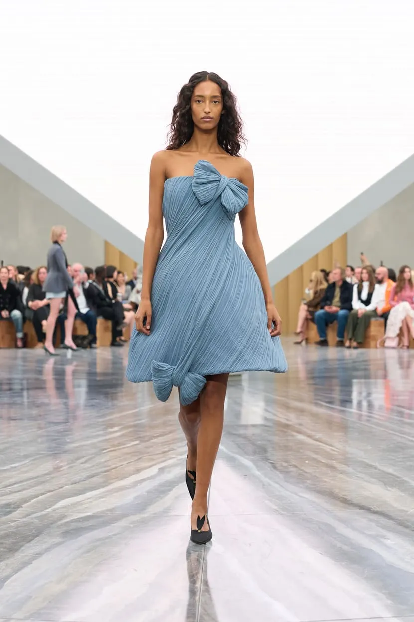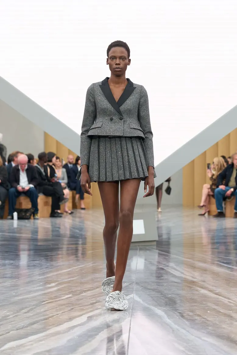 Dévoilée hier au Jardin des Tuileries à Paris, la collection Dior de Jonathan Anderson explore le langage de la Maison à travers une relecture empathique de son héritage. Le directeur artistique a nourri sa vision d’éléments d’Archives interprétés avec inventivité. Les nœuds - un code intemporel - ont été déclinés sous de multiples formes : des manteaux à pinces sur le devant et des minijupes drapées en coton drill aux robes en dentelle aérienne et aux sacs à main - à anse unique - Dior Cigale. Les vestes Bar rétrécies adoptent des volumes sculpturaux, tandis que les longues capes ondulantes et les shorts volumineux nouent un lien avec les débuts de Jonathan Anderson chez Dior, en juin dernier. Le résultat, d'une tension captivante, offre une multitude d'attitudes et d'expressions de soi. L'espace épuré du défilé, conçu par Luca Guadagnino et Stefano Baisi, a fusionné le numérique et le physique. Racontée à travers les images d'une œuvre spécialement commandée au documentariste Adam Curtis, l'histoire de la Maison défilait devant les yeux des invités sur une pyramide en LED inversée, avant de s'évanouir comme par magie dans une boîte à chaussures Dior. Elle symbolise un passé conservé qui peut être revisité comme des souvenirs.