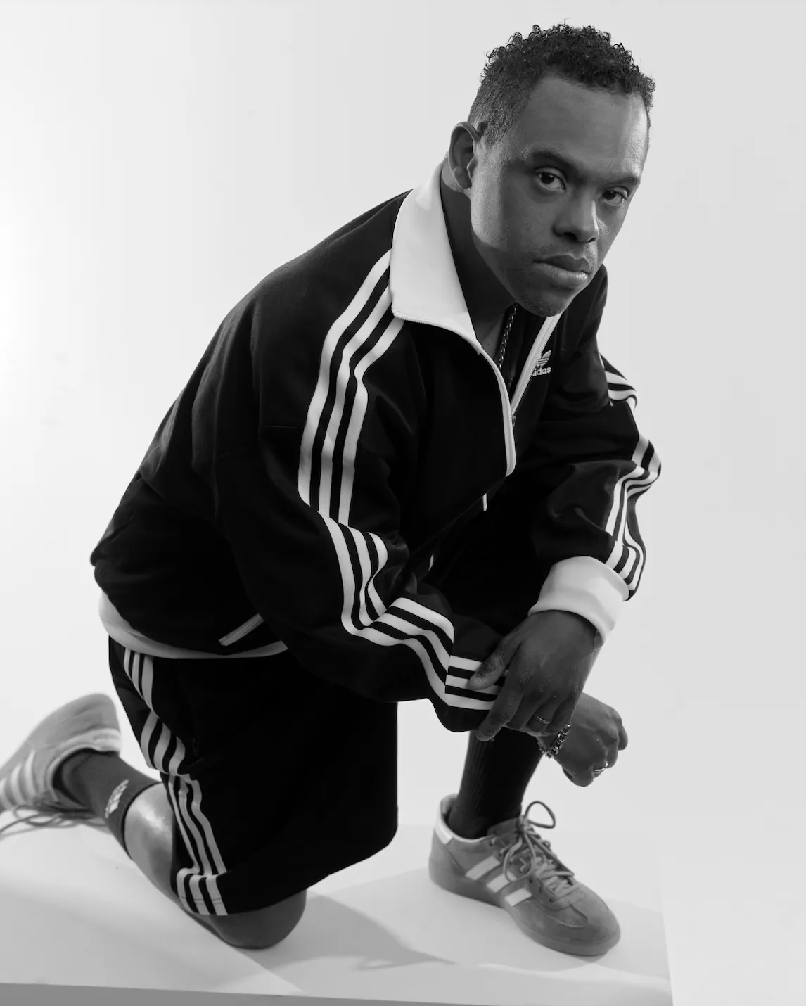 A peine le survêtement et les baskets enfilés, Karrel a pris la pose avec aisance devant l’objectif. Entre expressions aussi déterminées que nonchalantes, l’homme de 49 ans a saisi immédiatement l’esprit mode de la série. En coulisse, il demande à l’équipe si son look "fait bien homme" ? Car sur un shooting, comme sur un terrain de foot, qu’il pratique depuis des années tous les week-end avec une association sportive, l’athlète aime les tenues viriles et élégantes, à l’instar des costumes chic. Un tempérament sérieux ? Juste ce qu’il faut car le rire n’est jamais loin lorsqu’il s’agit d’aborder les sujets du quotidien. Curieux et observateur, Karrel ne manque pas à l’appel pour vanner son entourage ! Son style, c’est aussi les accessoires qu’il affectionne. "Il aime beaucoup les bagues", nous confie sa mère. Mais aussi les bracelets, les colliers et les lunettes de soleil dont il se pare dans la vie de tous les jours, aussi bien avec sa famille et ses amis qu’à l’ESAT où il travaille en semaine. Son rêve : celui de continuer de s’épanouir dans le sport, sans aucun doute !