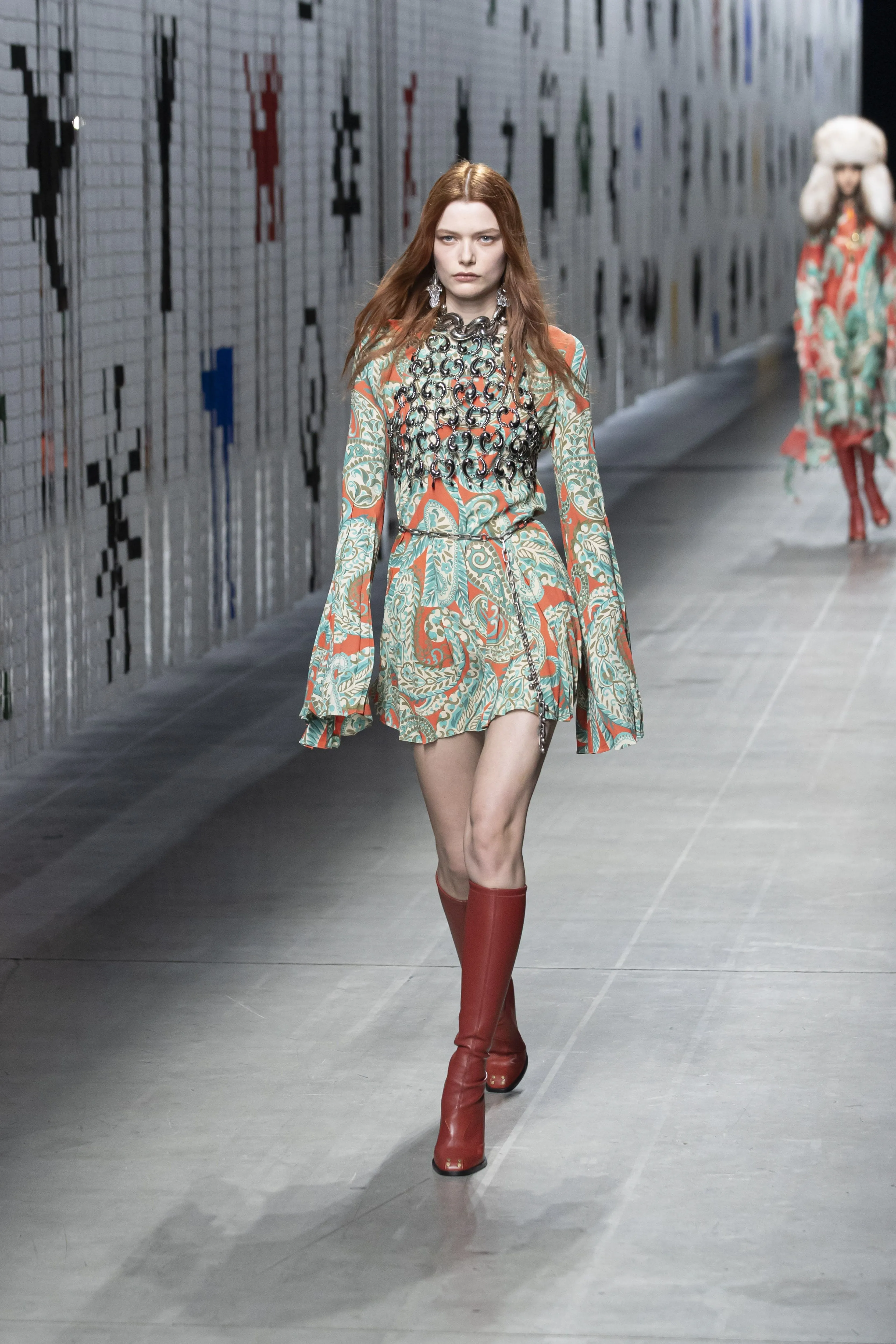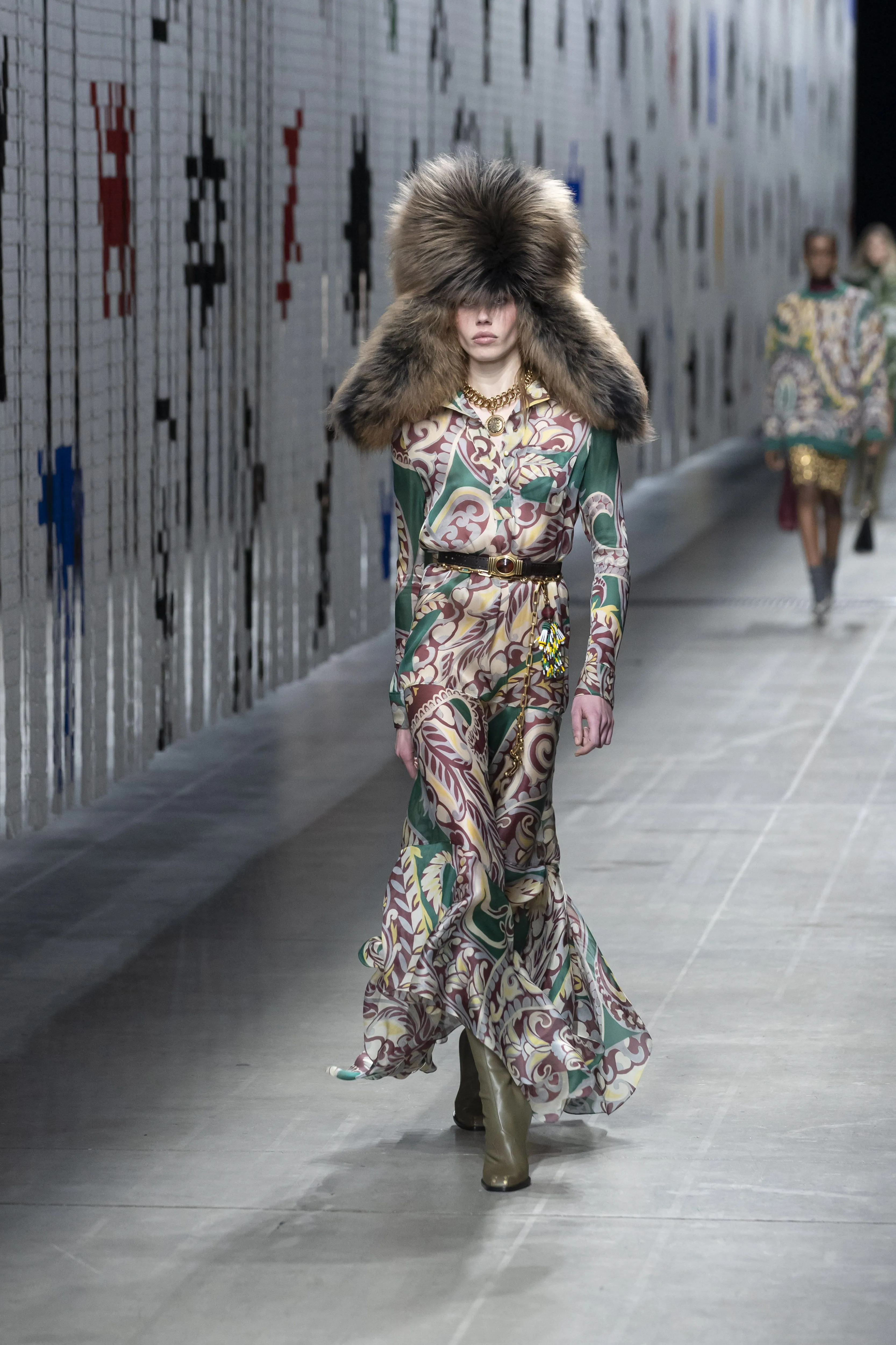 Pour William Burroughs, le langage est un virus, tandis que selon d'autres théories, nous sommes nés d'extraterrestres. Autant de mythes racontés au fil du temps et des cultures pour répondre aux mêmes questions insolubles : identifier les origines de la création, tenter de saisir le mystère, identifier la source d'où est partie la ligne droite qui mène à l'ici et au maintenant. Cette ligne tracée depuis une origine lointaine devient tangible sur le podium : c'est un rideau, probablement un filtre. Pour la saison automne-hiver 2025-2026, Marco De Vincenzo évolue dans une matière dense et primordiale, et imagine la collection Etro à partir de la matière elle-même, tactile, épaisse, tangible, faite de superpositions dans laquelle même les imprimés sont un vernis, un caoutchouc, une broderie, sur la texture sous-jacente. Les lignes se déplacent avec fluidité autour du corps : elles le marquent et le caressent, puis s'évasent, courtes ou longues, asymétriques et frangées. Les plis soulignent la taille, tandis qu'une flore fantastique envahit le denim et le velours côtelé. Les laines sont brossées, les pulls sont brodés, les paillettes vivent à l'intérieur de facettes géométriques. Des broderies d'une zoologie fantastique nées de la collaboration avec l'artiste coréenne Maria Jeon enveloppent vêtements et sacs aux formes douces et arrondies, ou aux lignes nettes et précises.