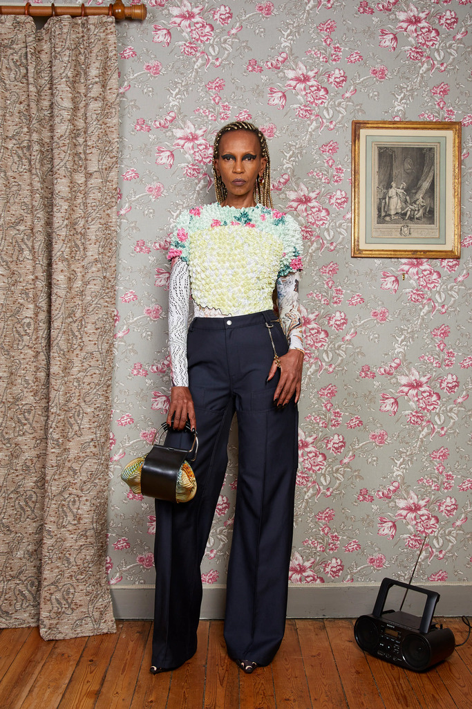 Pour sa collection printemps-été 2022, Fichu pour Fichu, la créatrice française Marine Serre imagine un futur où chacun changerait ses habitudes : son mode de consommation, sa manière d’avancer au quotidien et de porter les vêtements. Autour de ses pièces et des différents accessoires, la designer s’empare du mal de l’époque lié au sentiment de solitude et d’isolement, en rappelant pourtant la nécessité de ces temps creux pour se reconnecter avec soi-même. Composées de matières recyclées et régénérées, les créations signées par Marine Serre sont ancrées dans la mode durable.