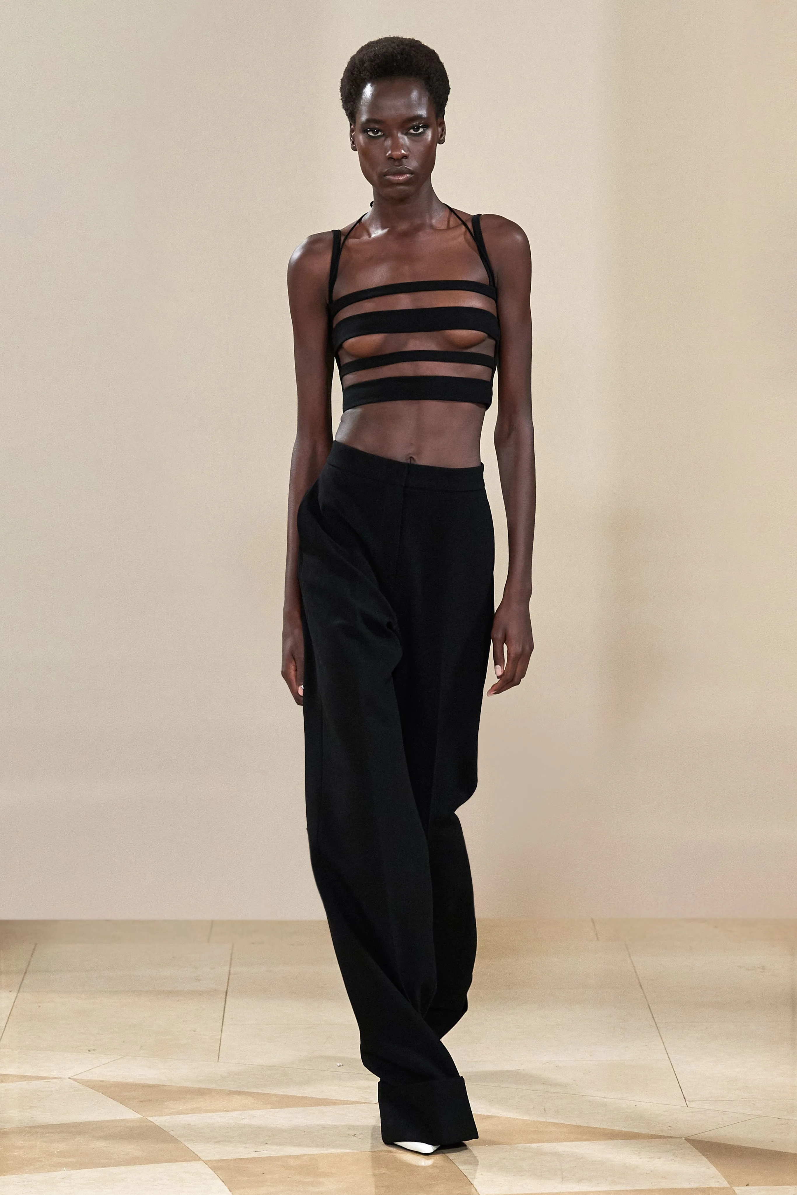 "Elégante asymétrie" tels sont les maîtres-mots pour décrire la collection Mônot printemps-été 2022 présentée au Ritz par son designer Eli Mizrahi. Des lignes géométriques maîtrisées et une architecture du vêtement très structurée, oscillant entre opulence et minimalisme, subliment les courbes naturelles des silhouettes. Les pièces laissent entrevoir la peau des mannequins qui fait partie intégrante des looks. Nul doute que ces sublimes et modernes robes de soirée ne traduisent l'esprit sexy et libéré de l'époque.