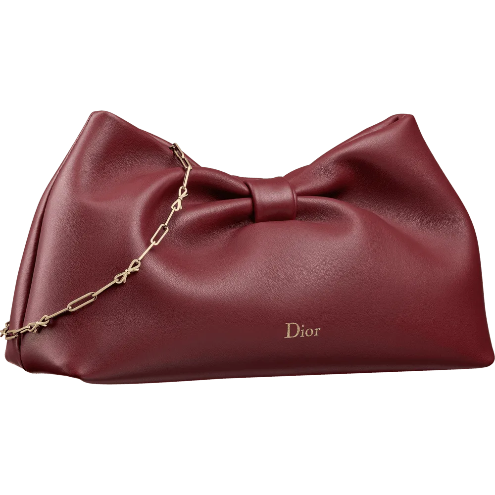 Le nœud n'est plus un simple ornement mais devient la forme même du sac. Réalisé en cuir grainé, l'accessoire se distingue par ses lignes épurées qui concilient douceur et praticité. La fermeture invisible préserve la pureté du design, tandis que la chaîne amovible – entremêlant maillons et nœuds métalliques – offre un porté épaule léger et contemporain.