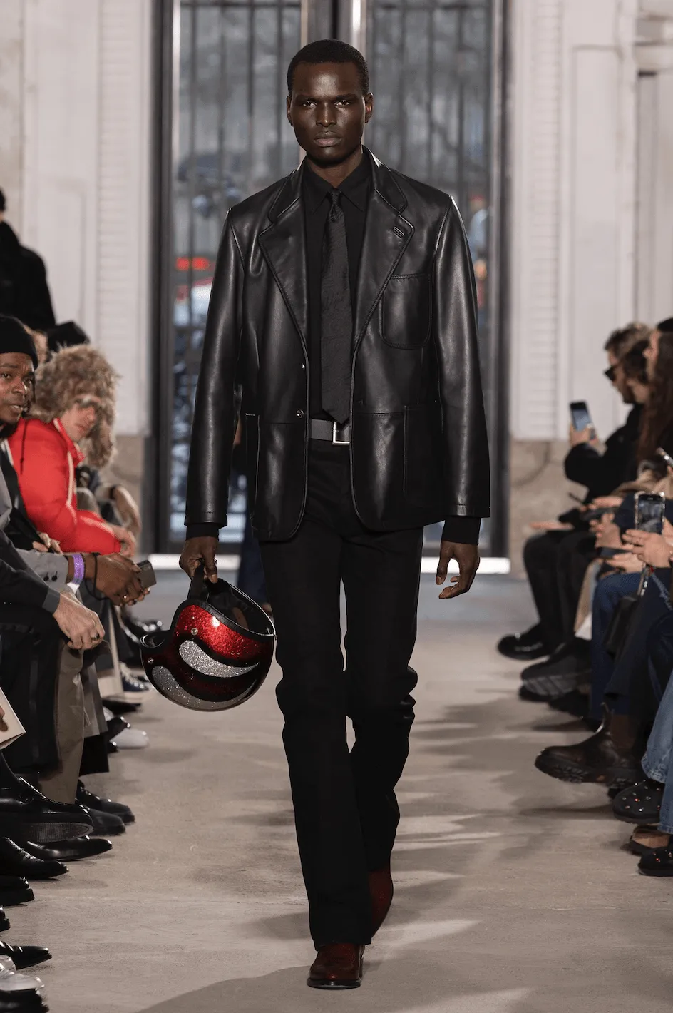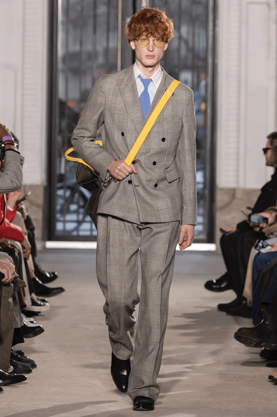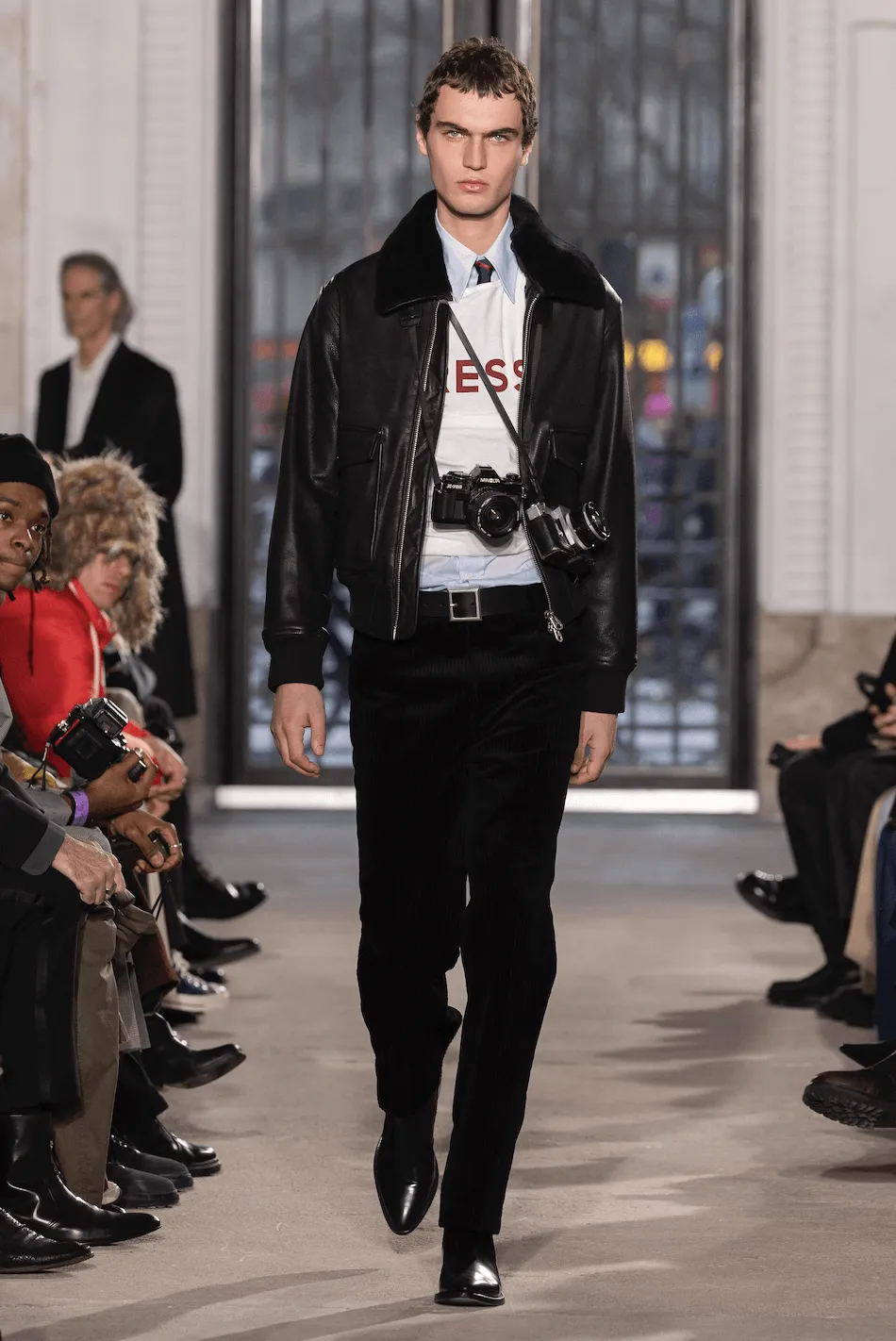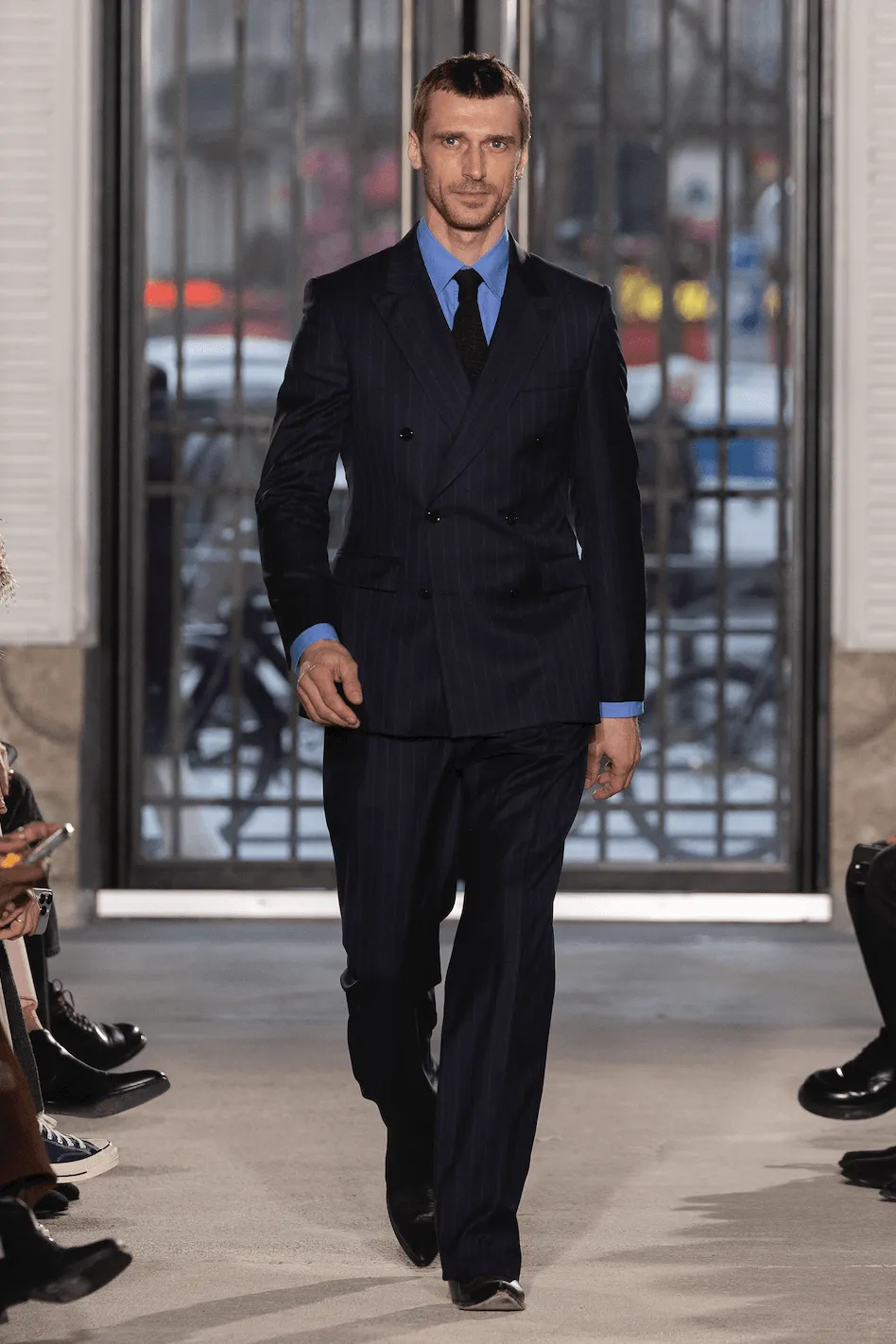 53 Boulevard Haussmann. Dans un espace au béton apparent, où des effluves de gasoil et fumée rappellent un garage automobile, l’atmosphère évoque l’évasion. Avec une allure déterminée et une élégance décomplexée, les hommes Fursac investissent ce lieu brut. Leurs pas sont rythmés par le son du post punk français imaginé par Michel Gaubert, mêlé aux bourdonnements de la ville. Grand reporter dansant au Palace, cadre d’entreprise passionné de moto, intellectuel au bar de quartier, artiste engagé, documentariste collectionneur… Pour sa collection automne-hiver 2025-2026, le directeur de la création de Fursac, Gauthier Borsarello, mise sur une élégance hybride. Attachés au vestiaire formel tout en rêvant d’aventures, les mannequins reflètent un monde en ébullition. La silhouette en superpositions s’adapte à tous les terrains, conçue pour un mode de vie évoluant au rythme de la journée. Chemise col hirondelle, cravate décontractée, jean évasé, manteau de soirée, bottes usées et traces de cambouis composent l’allure de cette ligne. La veste fonctionnelle se retire au bureau pour révéler une chemise au col raffiné. Les coupes s’ajustent, les manches se retroussent et les poches se multiplient, offrant une liberté de mouvement au service d’un art de vivre. Un vestiaire hivernal instinctif, pensé comme un uniforme modulaire et agrémenté de pièces aussi versatiles que ceux qui les portent, du petit matin au grand soir.