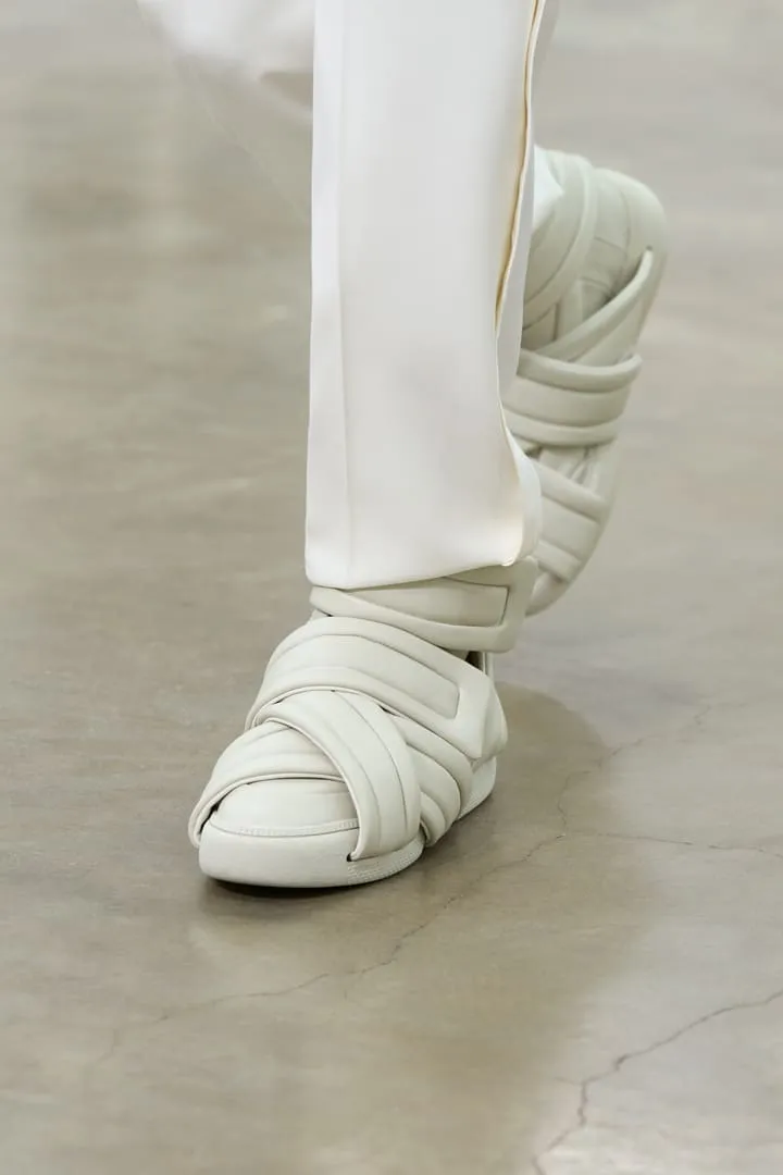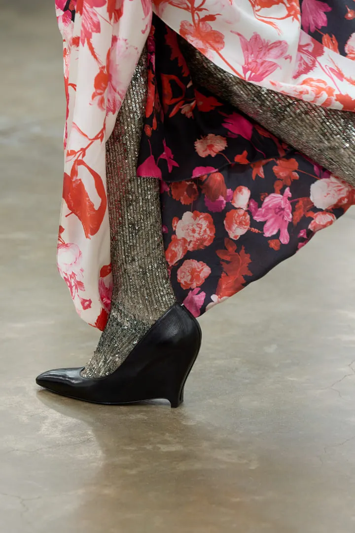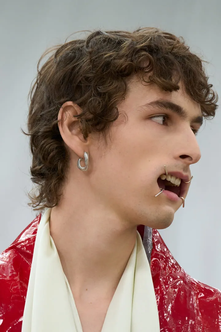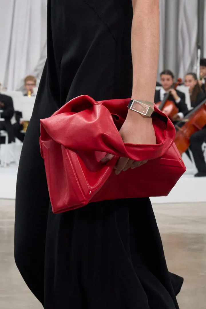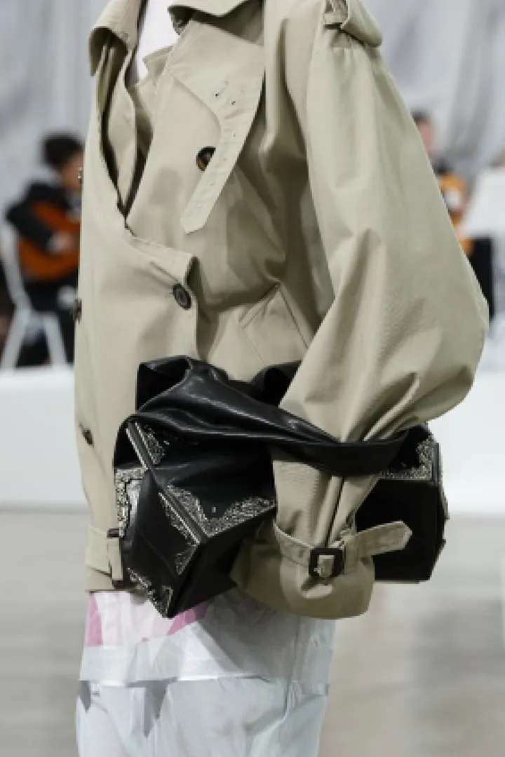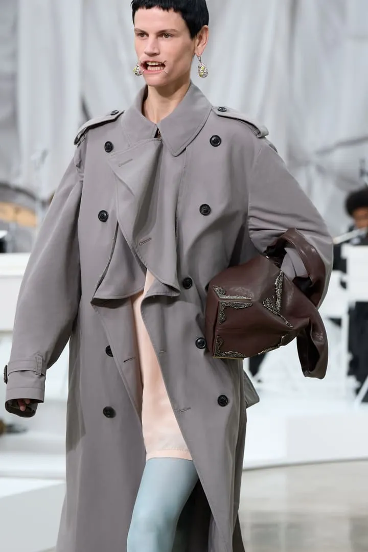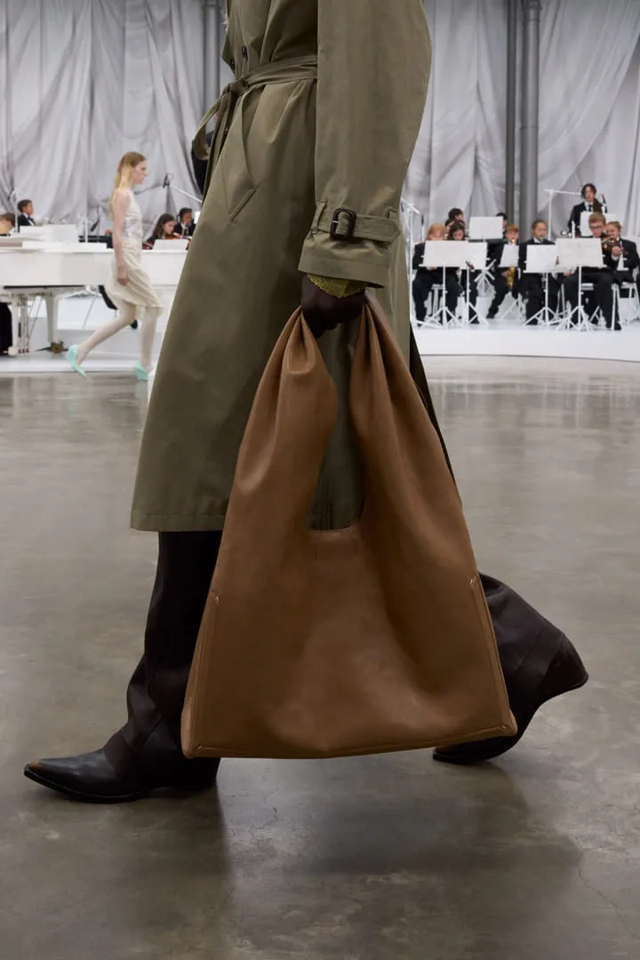 Maison Margiela a présenté sa collection printemps-été Co-Ed 2026, une série de propositions entre nouvelles créations et réinterprétations d'archives. Le défilé s'ouvre sur un tailoring radical aux épaules arrondies et entre-jambes extrêmement bas, décliné en cuir, laine et denim. La ligne "tuxedo waistcoat" s'intègre aux basiques – perfecto, trench – créant des revers drapés dissimulables. Les robes lingerie deviennent couche extérieure, ajustées de manière brute avec du ruban adhésif. L'effet de papier peint floral du XVIe siècle qui se détache des murs apparaît sur les mailles grâce à du papier imprimé embossé, évolution d'un concept Artisanal 2025. La plasticisation se poursuit avec des bijoux upcyclés et des vestes de soie transformées en imperméables. Les mannequins portent des Four Stitch mouthpieces, perpétuant l'exploration de l'anonymat. Les chaussures sans talon – concept d'archives – s'étendent aux escarpins et cuissardes. La Tabi Claw fait ses débuts en prêt-à-porter avec un talon en plexi. Le Box Bag en cuir thermoformé se transforme en clutch. Le défilé est accompagné par un orchestre de 61 jeunes musiciens âgés de 7 à 15 ans de Romilly-sur-Seine, réunis par l'association Orchestre à l'École, interprétant Strauss, Tchaïkovsky, Mozart, Beethoven, Prokofiev et Bizet.