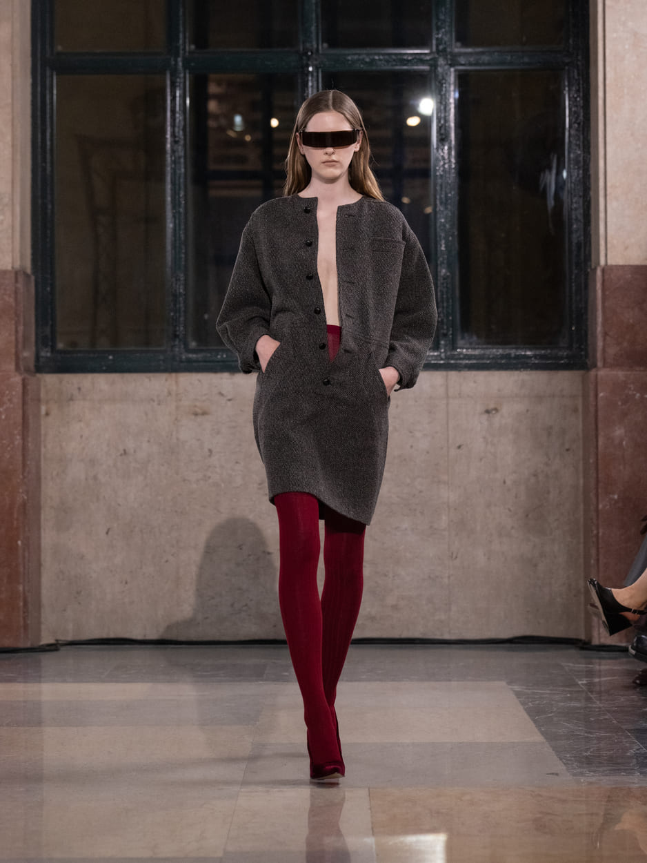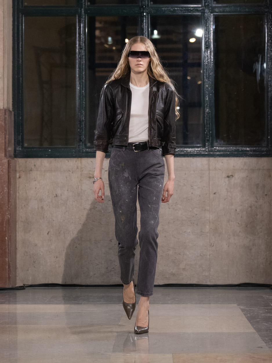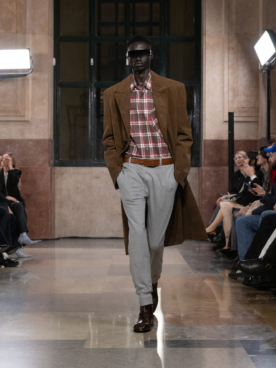 Pour l'automne-hiver 2026, MM6 Maison Margiela a investi Milano Centrale, gare emblématique de la capitale lombarde, pour y déployer un défilé à la frontière du quotidien et du spectacle. Dans ce théâtre de passage où se croisent anonymat et désir d'être vu, la maison a mis en scène une galerie d'archétypes contemporains — lunettes de soleil teintées d'un arc-en-ciel de nouvelles couleurs vissées sur le nez — dont les silhouettes explorent les fondamentaux de l'ADN MM6 : réduction, normalité amplifiée, franchise vestimentaire. Chemises à carreaux, vestes en jean, blazers raccourcis, jupes amples, survêtements, fleeces zippés et long-johns composent une garde-robe du réel que la maison s'amuse à dérégler subtilement — dos en jersey côtelé qui affine la silhouette en un trait vertical, doublures exposées ou tirées hors des pièces, ourlets relevés et fixés par des pressions, clin d'œil aux années 80, détails équestres. Le résultat : une normalité apparente qui bascule dans l'exagération, un vestiaire familier que l'on ne regardait plus et que MM6 nous donne soudain envie de regarder autrement.