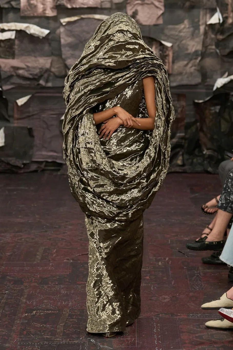Présentée hier, au Centquatre, la collection Maison Margiela Artisanal 2025, conçue par le directeur artistique Glenn Martens, s'inspire de l'architecture et de l'atmosphère médiévales des Flandres et des Pays-Bas. La verticalité et les volumes des silhouettes reflètent les structures (gothiques) des tours. Les formes statuaires évoquent les figures (saintes) des façades d'églises. Corsetterie, drapés et illusions d'optique accentuent l'anatomie et sculpturalisent le corps. Les intérieurs des maisons (Renaissance nord-européenne) sont abstraits dans leurs motifs et leurs techniques. Des images de papiers peints floraux en cuir gaufré peints à la main (flamands du XVIe siècle) sont imprimées sur du papier photocopieur utilisé en superposition. Elles apparaissent également sous forme d'imprimés et de gaufrages sur tissu. Le trompe-l’œil des vêtements peints à la main imite les coups de pinceau (du peintre symboliste Gustave Moreau) et transforme le corps en toile. La dentelle est utilisée comme un prolongement de la peau. Le drapé humide des sculptures en marbre est traduit en silhouettes voilées et répercuté dans des constructions anatomiques. Les masques, caractéristiques des codes d'anonymat de la maison, déplacent l'attention du visage vers l'artisanat. La botte Tabi, emblématique, est réincarnée dans une botte en cuir à bout griffe et une sandale compensée en plastique, tandis que la botte en cuir Santiago apparaît sans talon. La bande sonore est une déconstruction d'œuvres de Smashing Pumpkins.