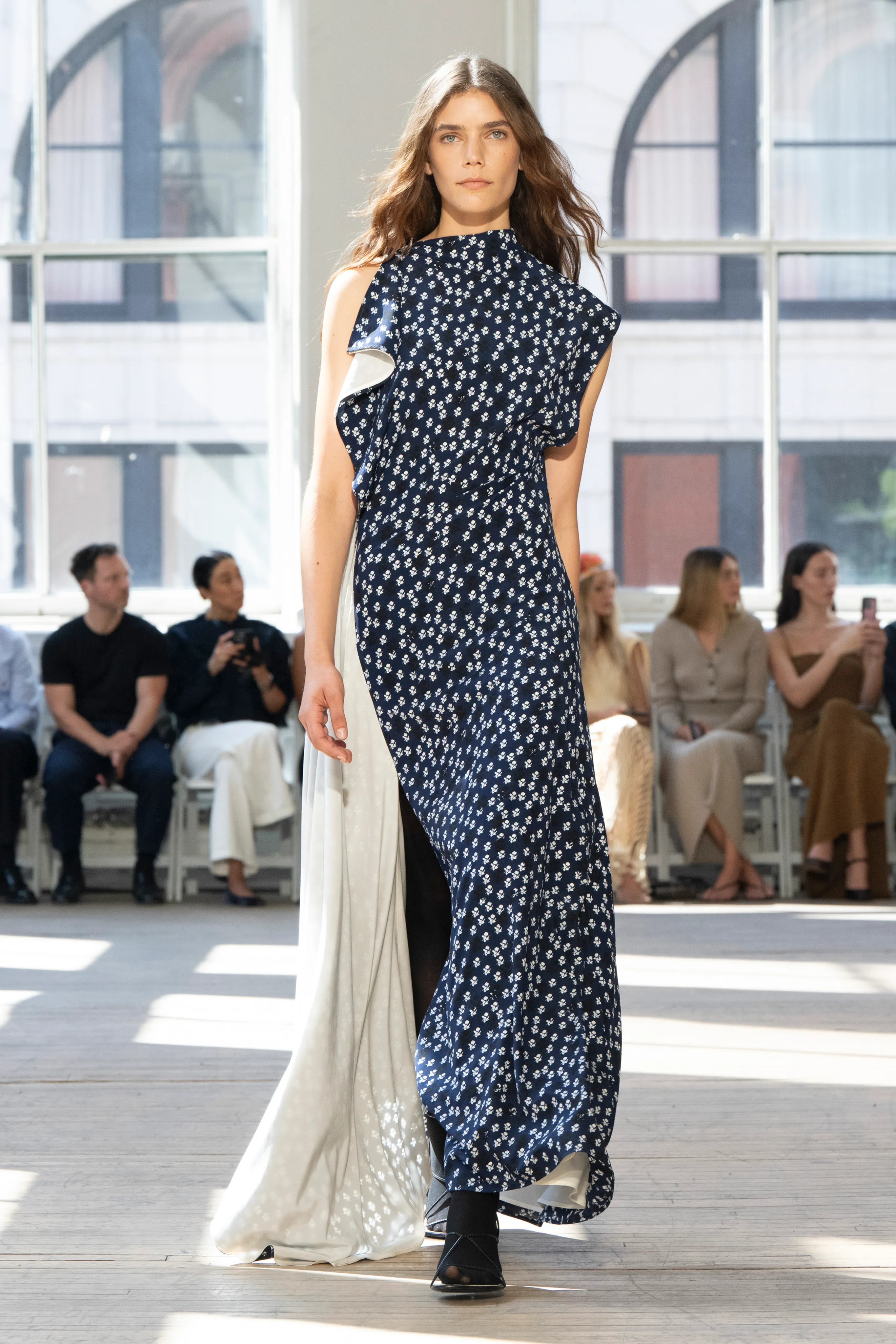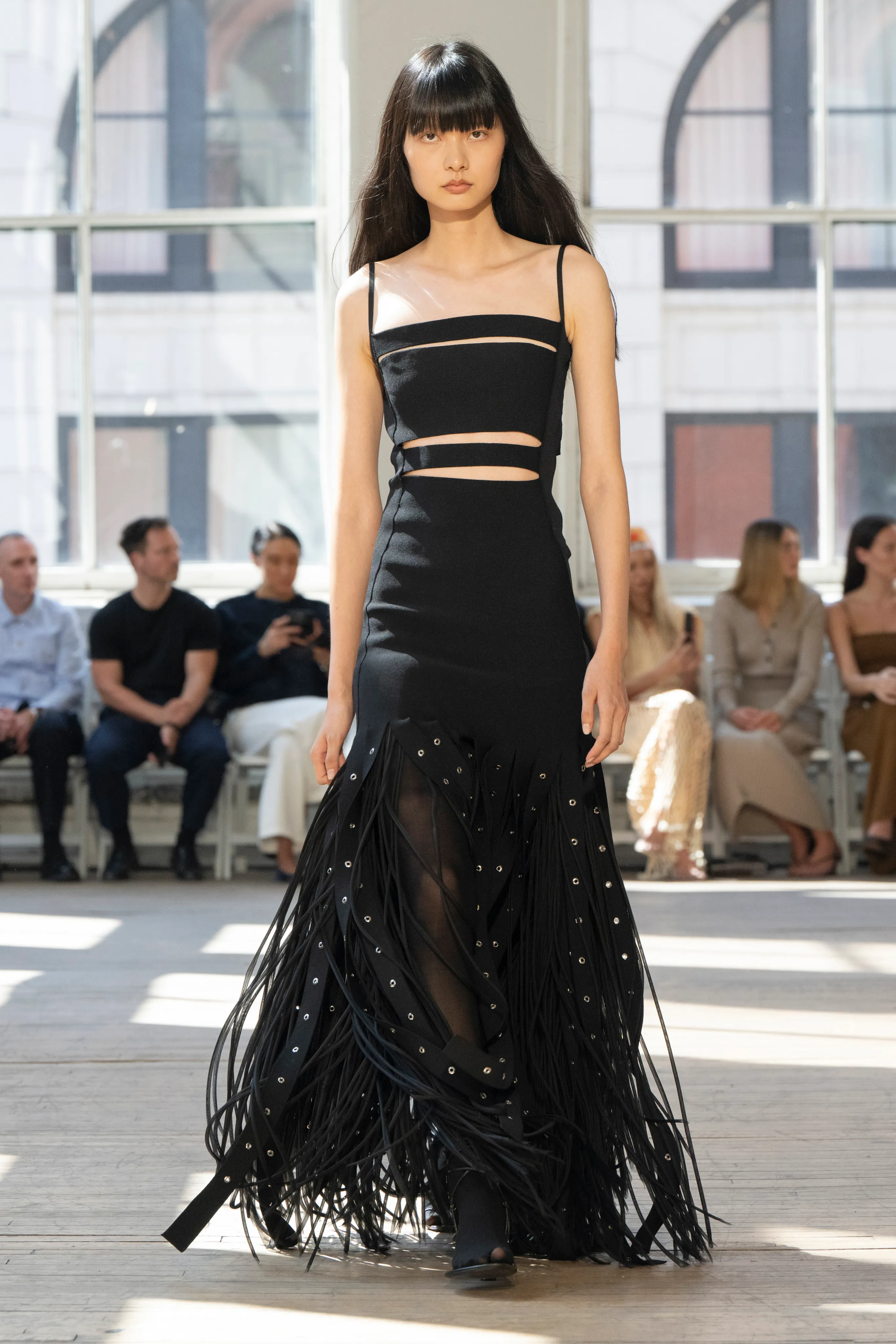 Comment pouvons-nous préserver une identité fondamentale tout en nous efforçant de pénétrer dans des territoires nouveaux et inexplorés ? "Tout acte de création est d'abord un acte de destruction", aurait répondu Pablo Picasso. Pour sa collection printemps-été 2025, la maison new-yorkaise Proenza Schouler cherche à trouver l’harmonie dans des éléments traditionnellement incongrus. Les rayures constituent un motif dominant de la collection et font autant référence au travail du peintre américain Barnett Newman qu'à des références maritimes plus traditionnelles. Les imprimés sont picturaux et abstraits par endroit, mais aussi petits, floraux et délicats à d’autres égards. Ces derniers étant rendus modernes lorsqu'ils sont découpés avec de grands panneaux de « voile » flottants. Des franges effilochées et défaites se retrouvent partout, parfois percées d'œillets. Les ceintures sont tissées tout au long de la collection, coupées principalement dans du cuir noir robuste et donnent une nouvelle perspective lorsqu'elles sont utilisées pour attacher des jerseys plissés aux teintes pastel. Les sacs à main donnent un air de réalité ou de praticité à la gamme et comprennent le Tate Tote, le nouveau sac à bandoulière Tetra et le sac Silo, un héros récent de la marque.