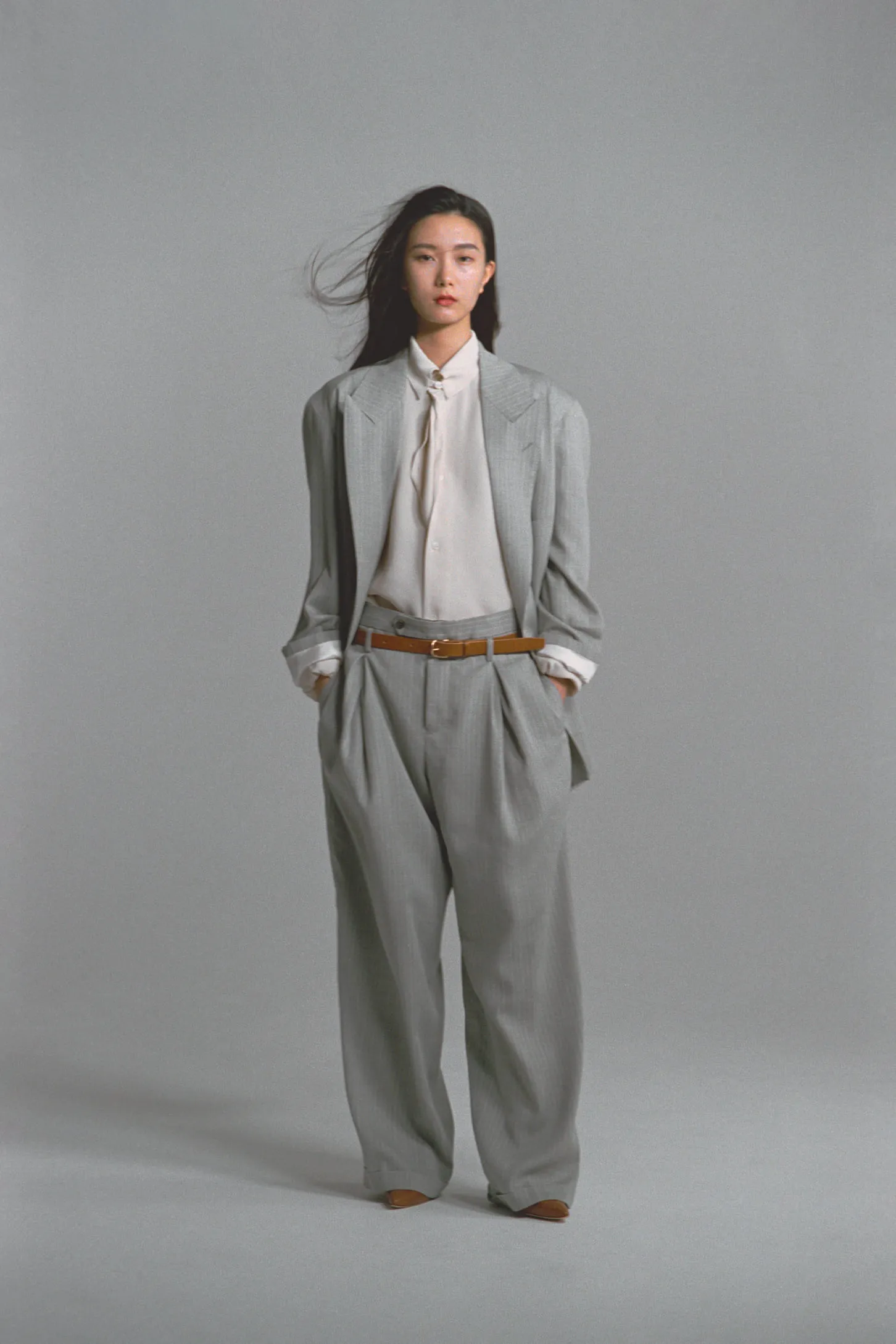 Parmi ces influences, Soshi Otsuki trouve sa propre voie en se nourrissant de l’héritage des traditions japonaises. Comme Rei Kawakubo ou Yohji Yamamoto dans les années 1980, il réinterprète les codes occidentaux avec un regard venu d’ailleurs, en apportant une sensibilité nouvelle au tailoring. Chaque pièce devient ainsi un terrain d’expérimentation où l’élégance se conjugue à la discipline, comme dans sa collection printemps-été 2025, inspirée par les employés de la bubble era japonaise (1986-1991). Fine cravate, poignets mousquetaires, épaules arrondies, boutonnage croisé, pantalons larges… Le designer expose sa propre version de ce que serait le vestiaire d’un dandy moderne. Loin de l’exubérance tapageuse du loud luxury, Soshi Otsuki propose un tailoring discret, précis, presque architectural, qui assurerait confiance et élégance à celui qui le porte.