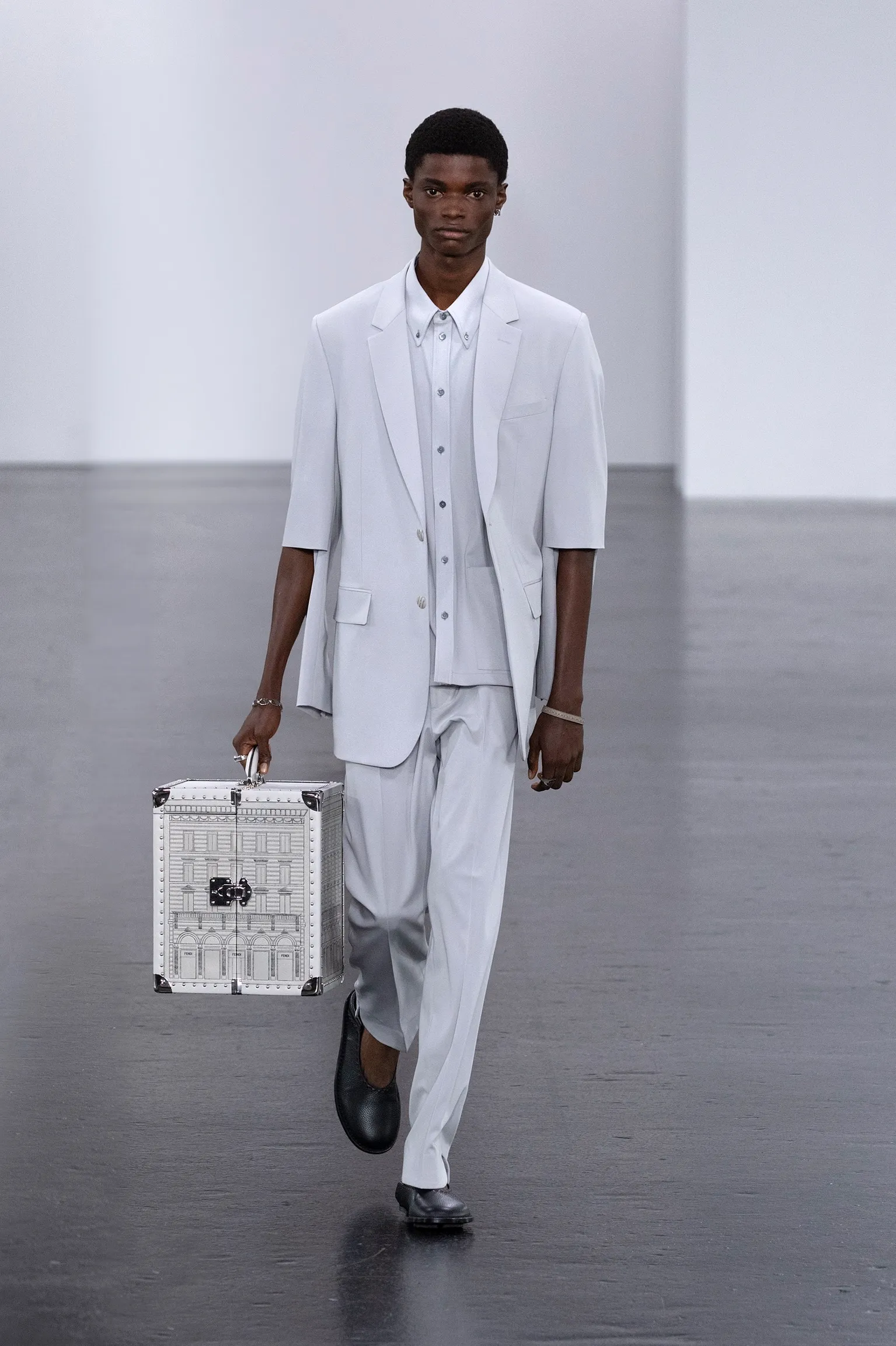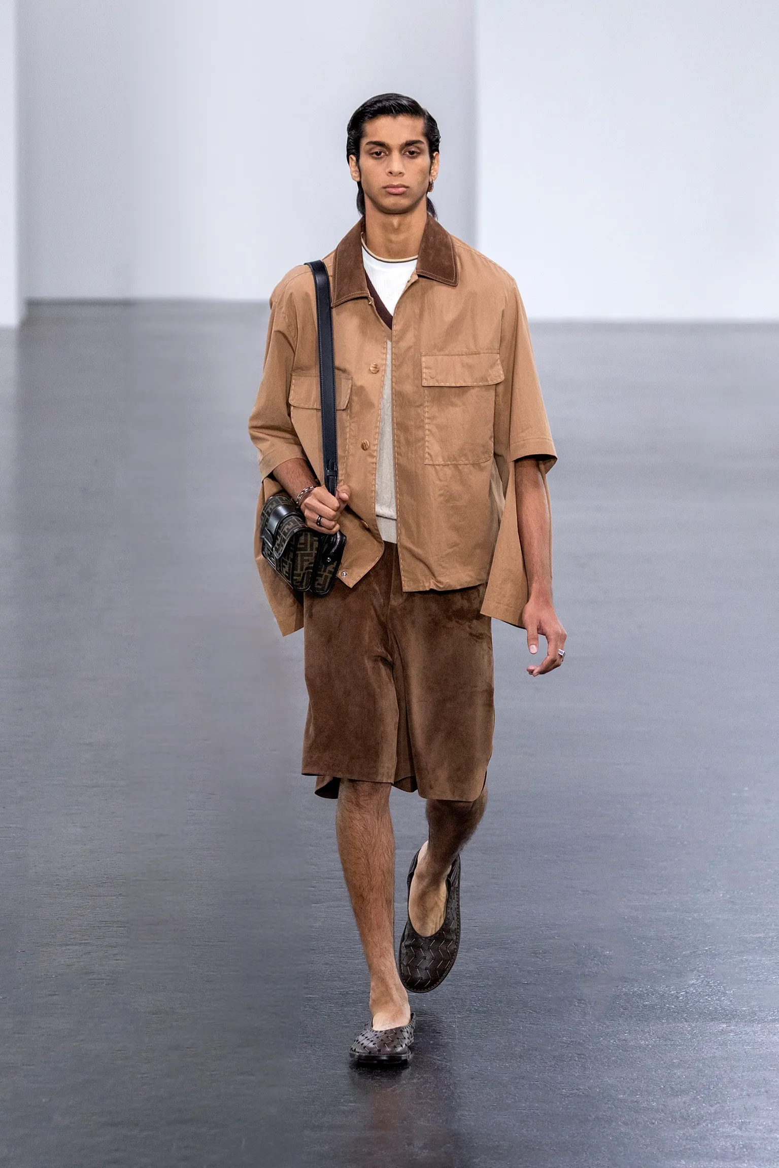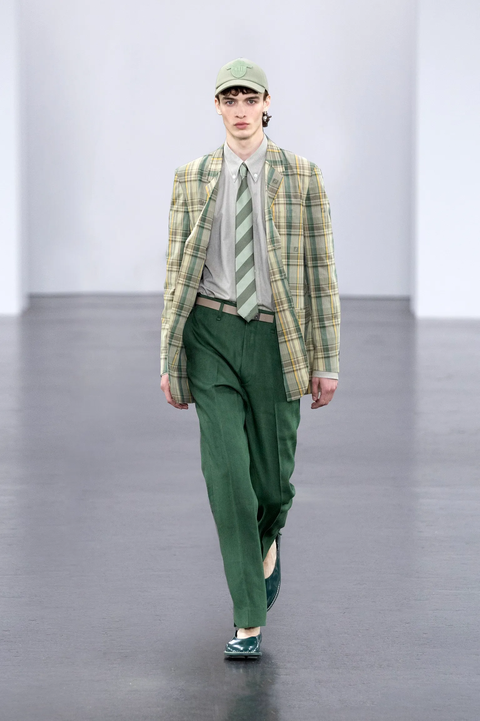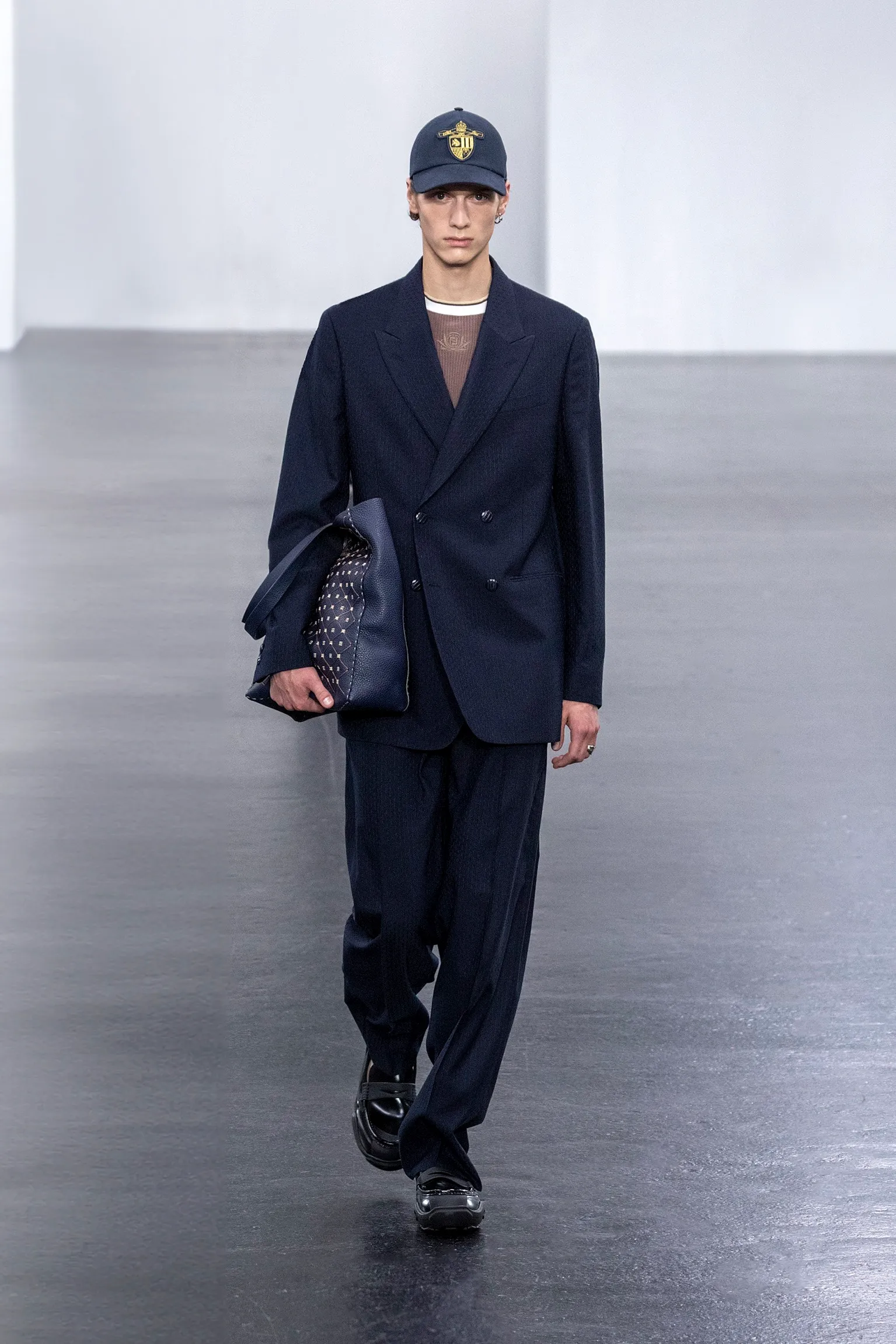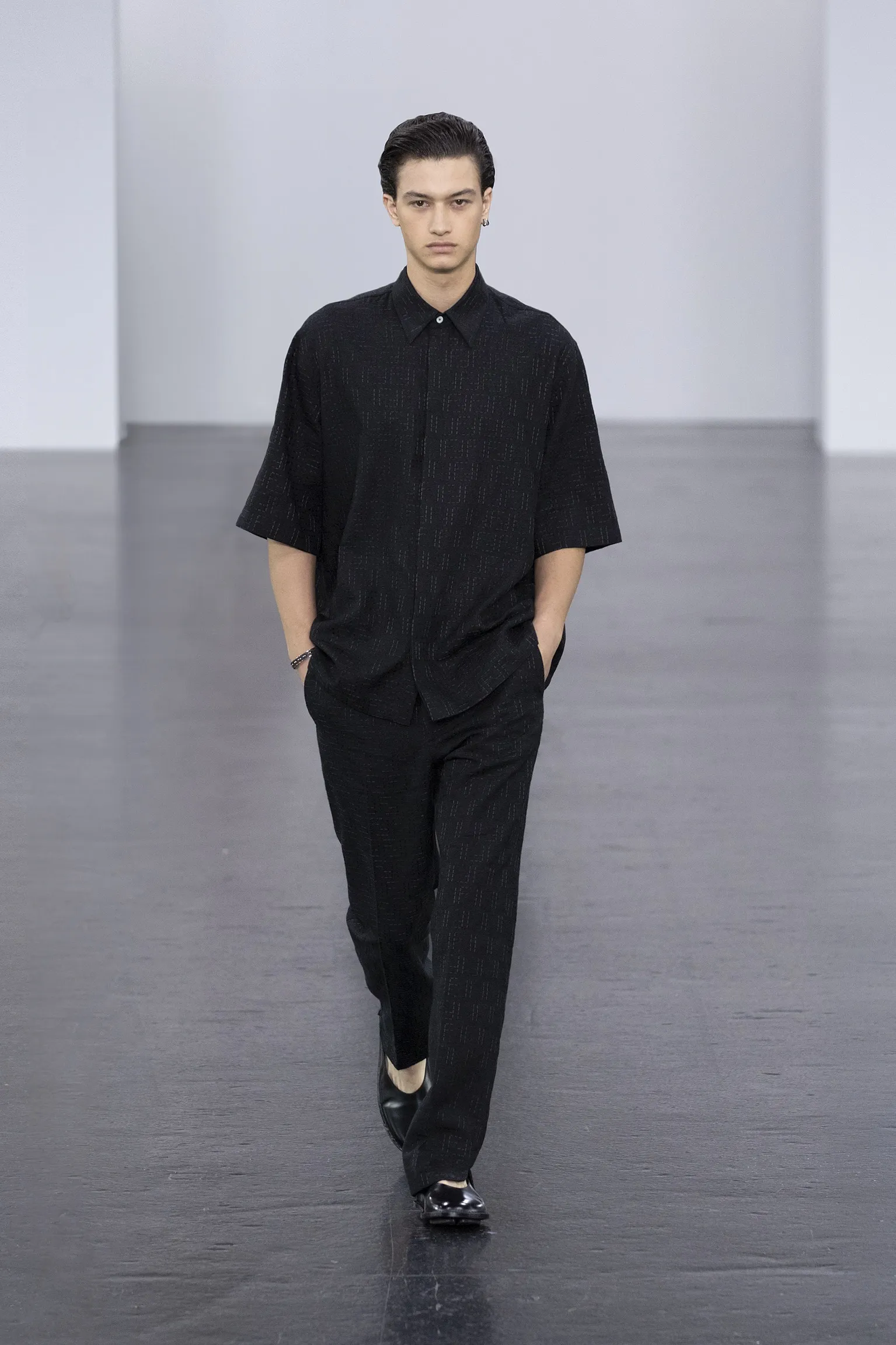 À l’approche du centenaire de Fendi, la nostalgie est forte et l’avenir s’annonce radieux. Silvia Venturini Fendi, directrice artistique des accessoires et du prêt-à-porter masculin, considère Fendi comme une capsule temporelle voyageuse avec l'artisanat italien comme étoile du Nord pour toujours. La collection Homme printemps-été 2025 est un hommage à l'universel, sublimant les codes, dès la première silhouette masculine révélée de la maison italienne en 1990. De la tête aux pieds, la collection se délecte de la virtuosité du point Selleria, une technique transmise à la famille Fendi par des maîtres selliers romains en 1925. Agrandi et réduit, il est réinterprété comme une fine rayure brisée convenant au jacquard et enfilé sous forme de rayures ou de logo FF. Sur des shorts plissés, de longues surchemises à poches plaquées et des liens en soie se superposent sous des vestes d'été courtes. La collection accessoires Homme printemps-été 2025 fait écho à l'obsession Selleria de la saison, du Peekaboo ISeeU. Du sac et des cabas souples en diagonale, au nouveau sac bandoulière zippé Baguette Double, et un patchwork Baguette confectionné à partir de chutes multicolores des ateliers de la maison. Enfin, des baskets Fendi Force, aux côtés de mocassins moulés à semelle crantée et de chaussures plates à enfiler en cuir verni ou brodées de fils cirés.