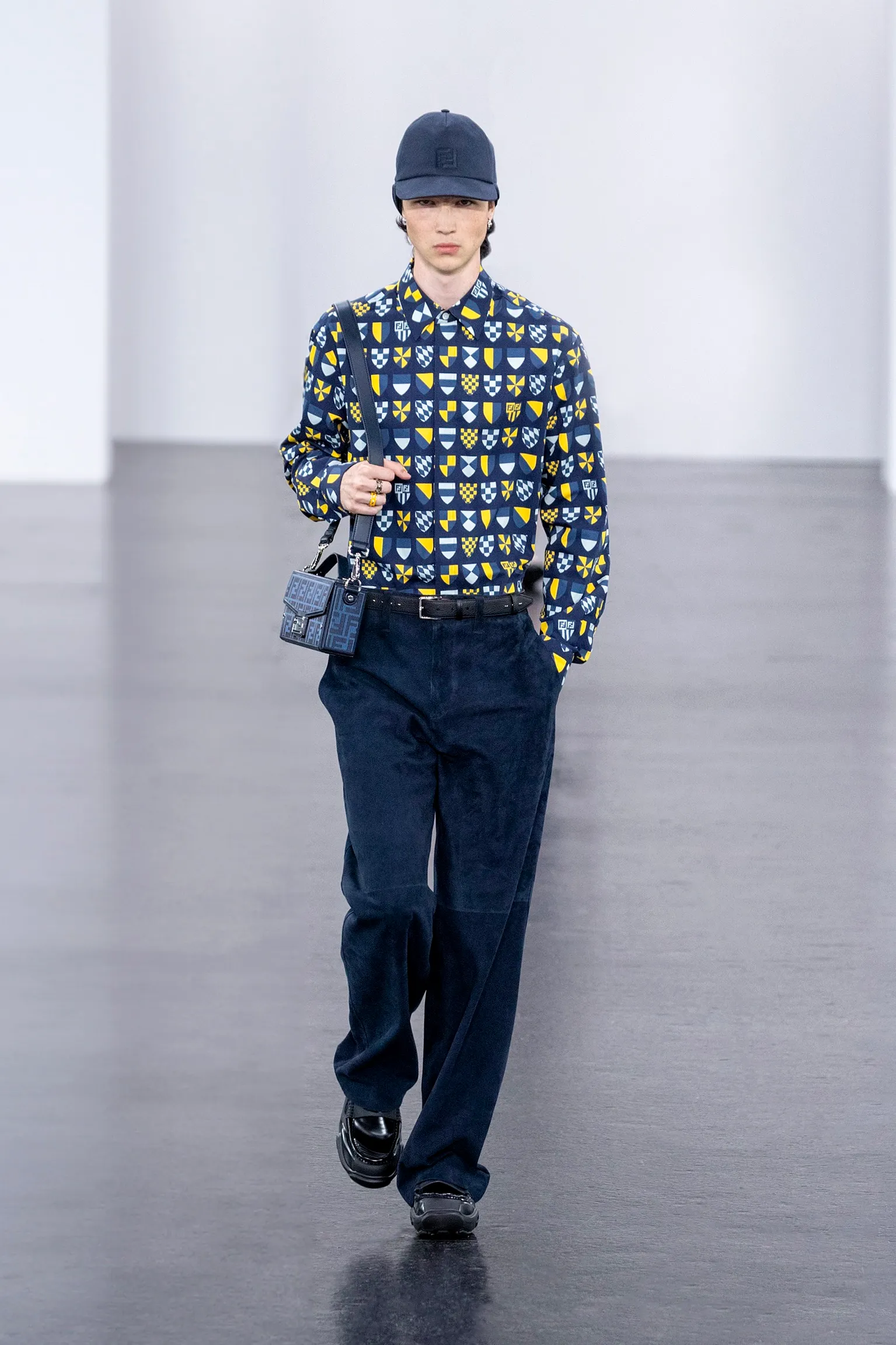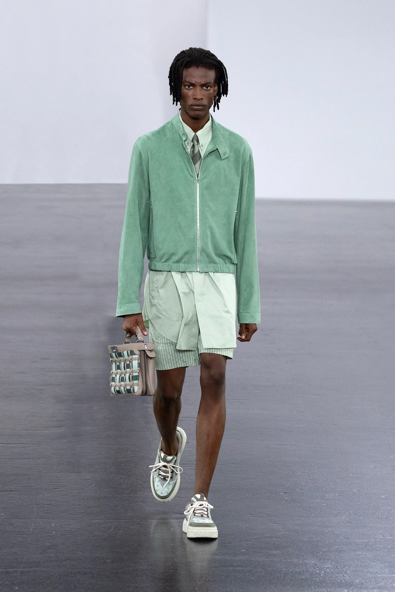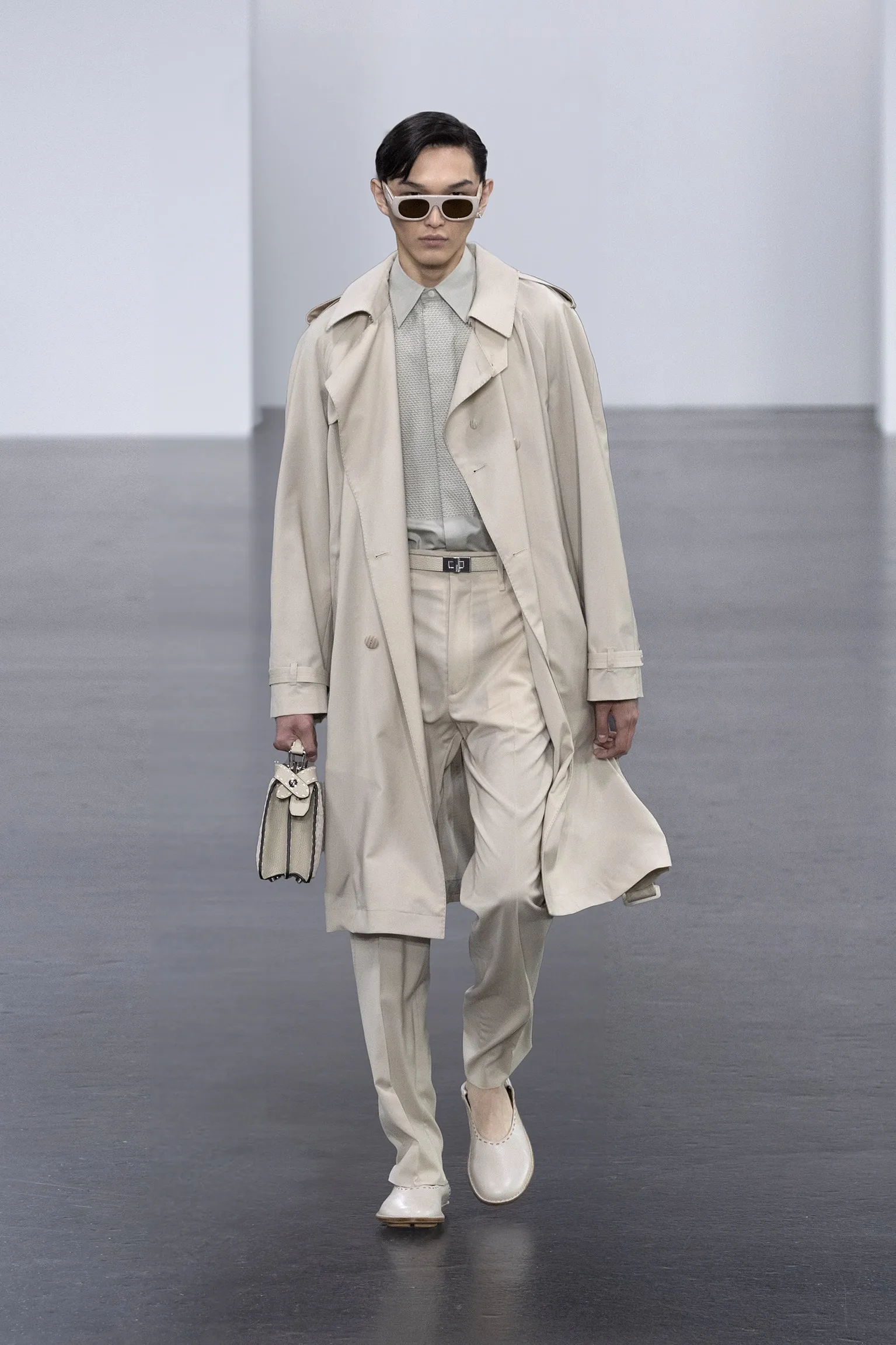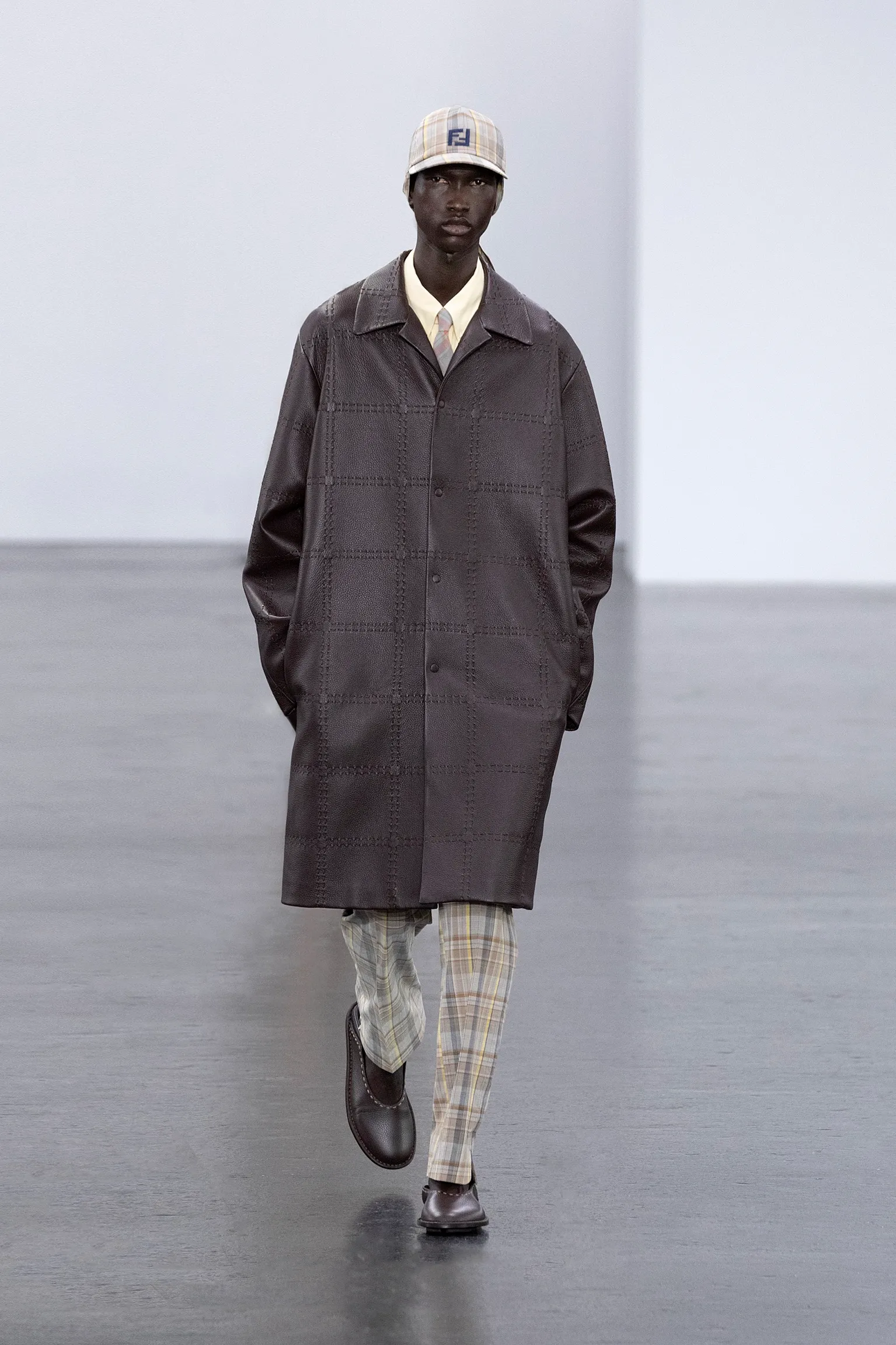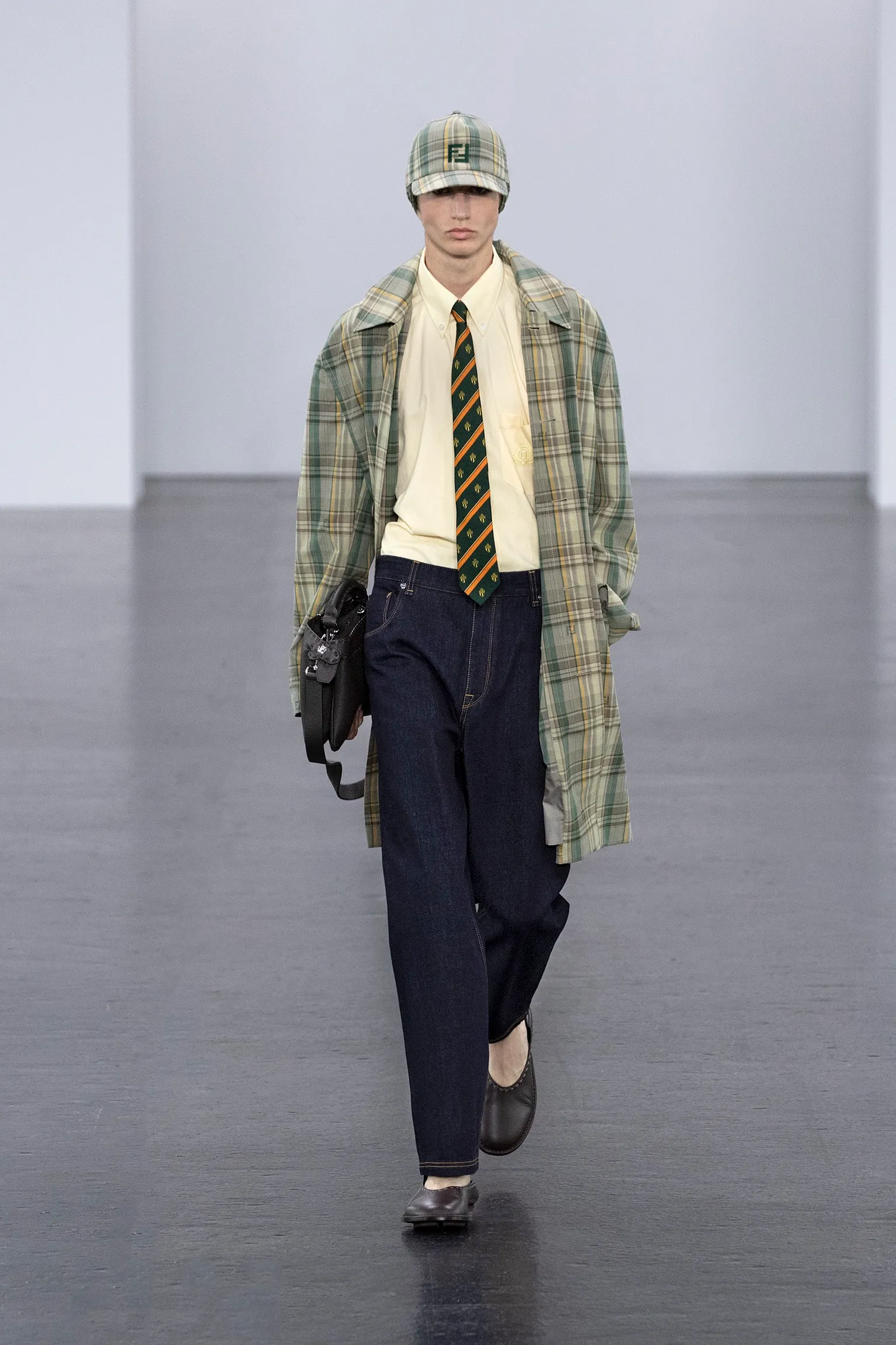 À l’approche du centenaire de Fendi, la nostalgie est forte et l’avenir s’annonce radieux. Silvia Venturini Fendi, directrice artistique des accessoires et du prêt-à-porter masculin, considère Fendi comme une capsule temporelle voyageuse avec l'artisanat italien comme étoile du Nord pour toujours. La collection Homme printemps-été 2025 est un hommage à l'universel, sublimant les codes, dès la première silhouette masculine révélée de la maison italienne en 1990. De la tête aux pieds, la collection se délecte de la virtuosité du point Selleria, une technique transmise à la famille Fendi par des maîtres selliers romains en 1925. Agrandi et réduit, il est réinterprété comme une fine rayure brisée convenant au jacquard et enfilé sous forme de rayures ou de logo FF. Sur des shorts plissés, de longues surchemises à poches plaquées et des liens en soie se superposent sous des vestes d'été courtes. La collection accessoires Homme printemps-été 2025 fait écho à l'obsession Selleria de la saison, du Peekaboo ISeeU. Du sac et des cabas souples en diagonale, au nouveau sac bandoulière zippé Baguette Double, et un patchwork Baguette confectionné à partir de chutes multicolores des ateliers de la maison. Enfin, des baskets Fendi Force, aux côtés de mocassins moulés à semelle crantée et de chaussures plates à enfiler en cuir verni ou brodées de fils cirés.