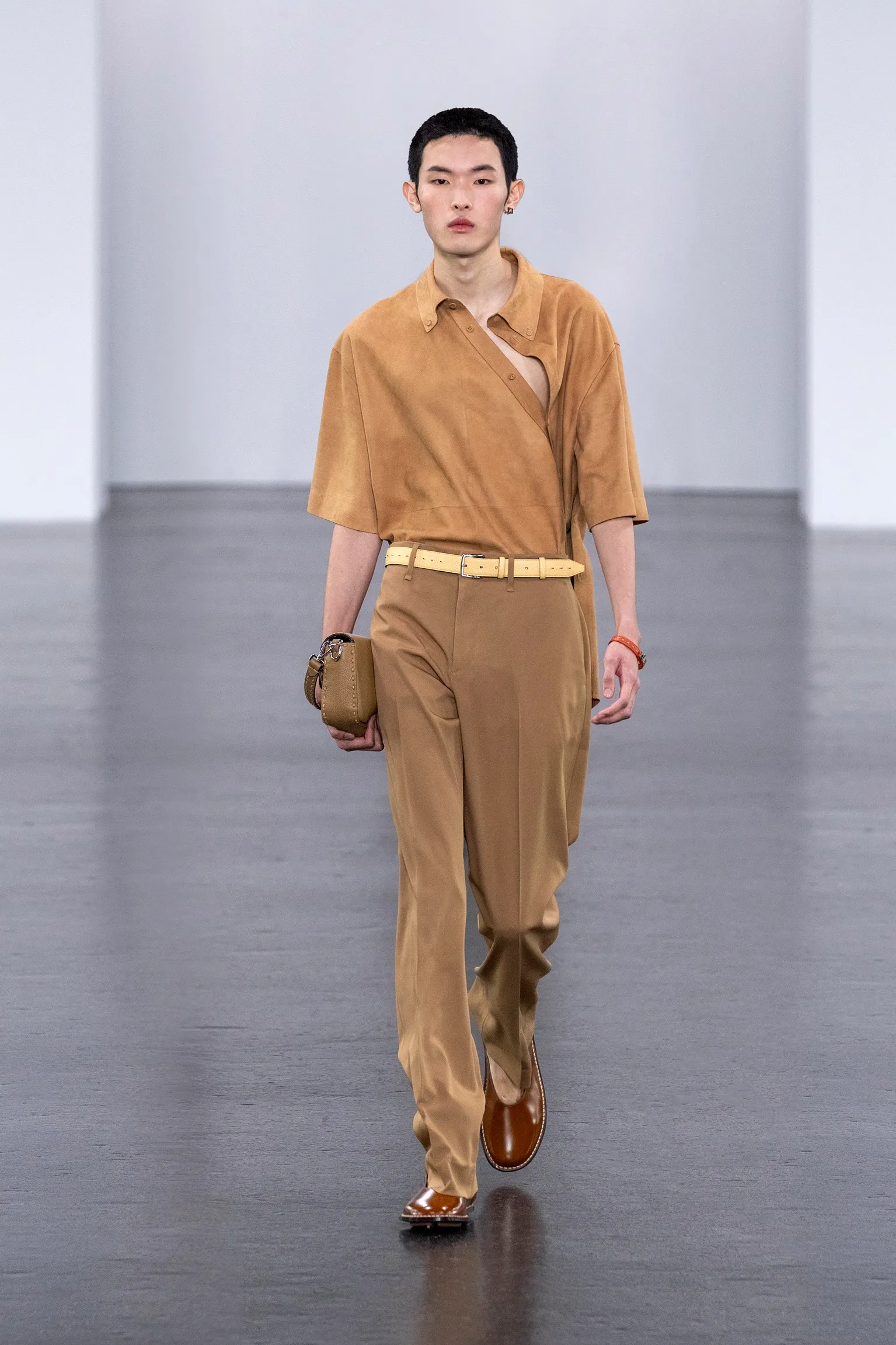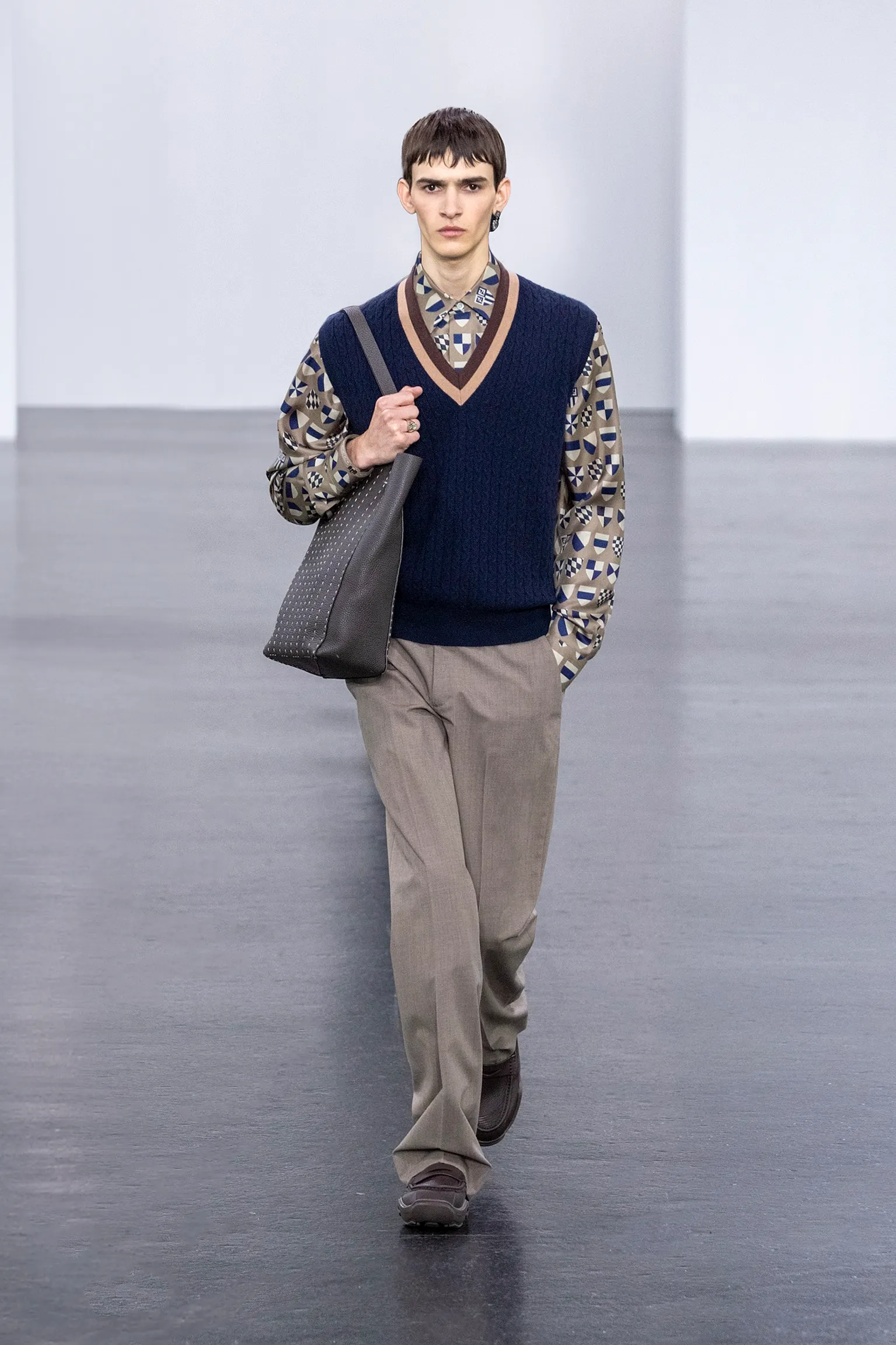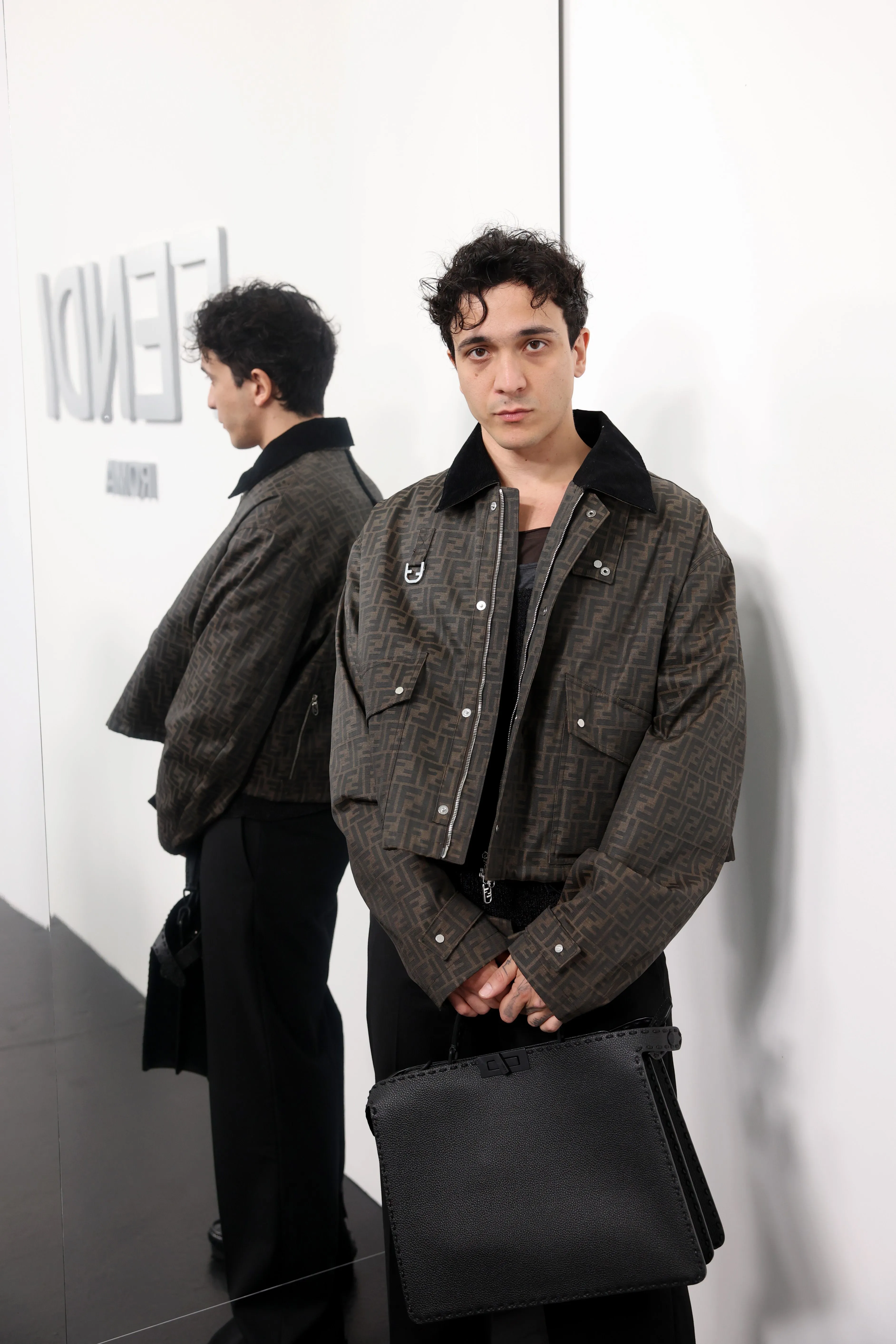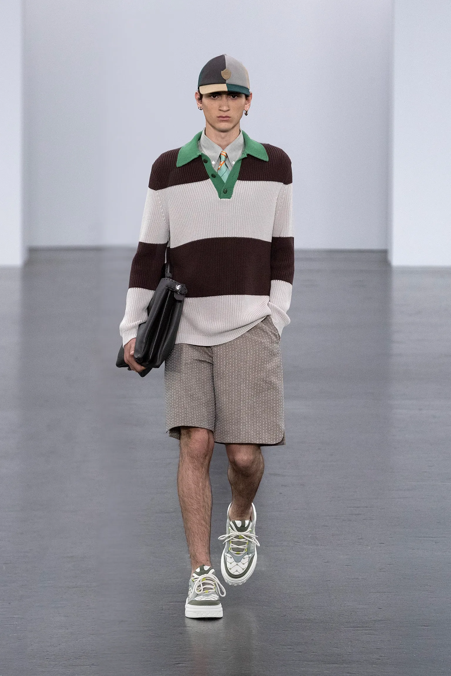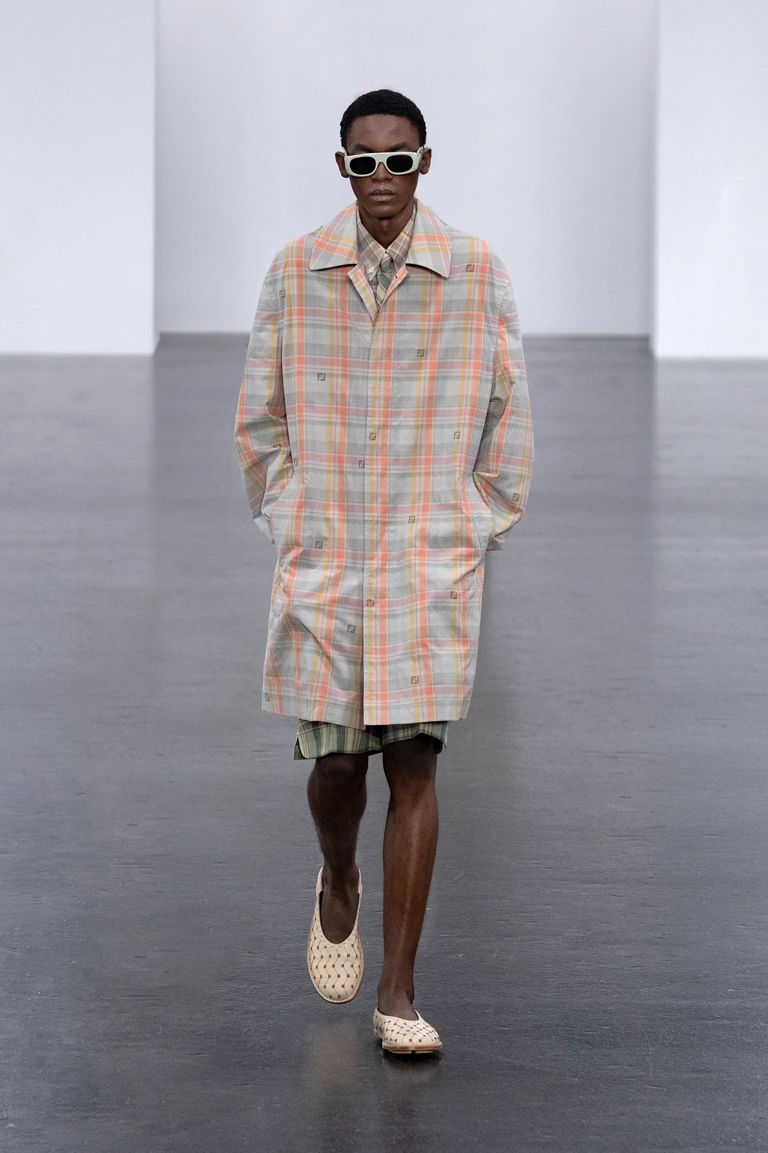 À l’approche du centenaire de Fendi, la nostalgie est forte et l’avenir s’annonce radieux. Silvia Venturini Fendi, directrice artistique des accessoires et du prêt-à-porter masculin, considère Fendi comme une capsule temporelle voyageuse avec l'artisanat italien comme étoile du Nord pour toujours. La collection Homme printemps-été 2025 est un hommage à l'universel, sublimant les codes, dès la première silhouette masculine révélée de la maison italienne en 1990. De la tête aux pieds, la collection se délecte de la virtuosité du point Selleria, une technique transmise à la famille Fendi par des maîtres selliers romains en 1925. Agrandi et réduit, il est réinterprété comme une fine rayure brisée convenant au jacquard et enfilé sous forme de rayures ou de logo FF. Sur des shorts plissés, de longues surchemises à poches plaquées et des liens en soie se superposent sous des vestes d'été courtes. La collection accessoires Homme printemps-été 2025 fait écho à l'obsession Selleria de la saison, du Peekaboo ISeeU. Du sac et des cabas souples en diagonale, au nouveau sac bandoulière zippé Baguette Double, et un patchwork Baguette confectionné à partir de chutes multicolores des ateliers de la maison. Enfin, des baskets Fendi Force, aux côtés de mocassins moulés à semelle crantée et de chaussures plates à enfiler en cuir verni ou brodées de fils cirés.