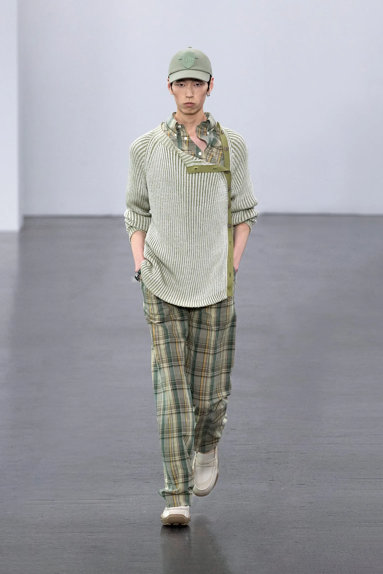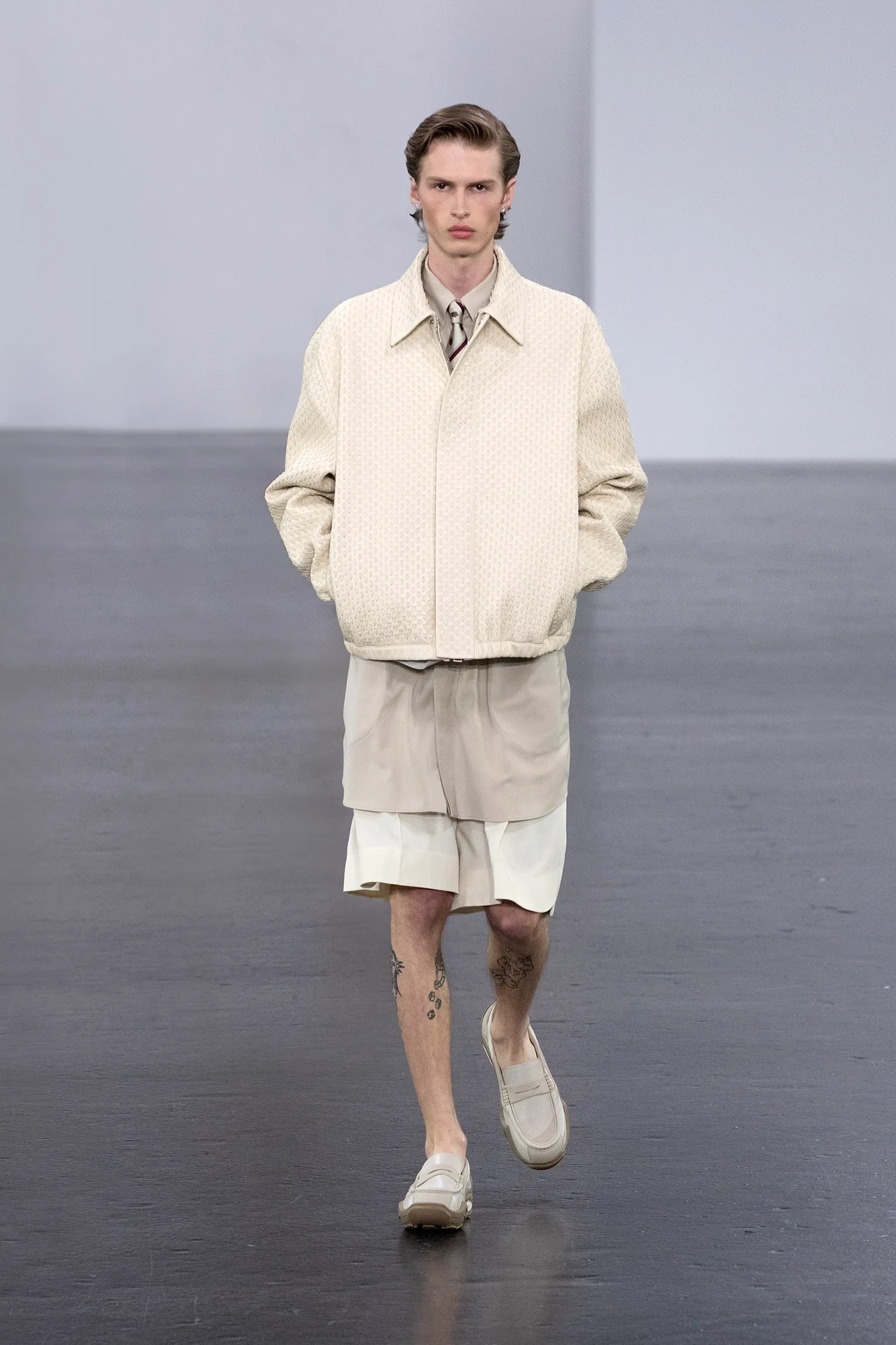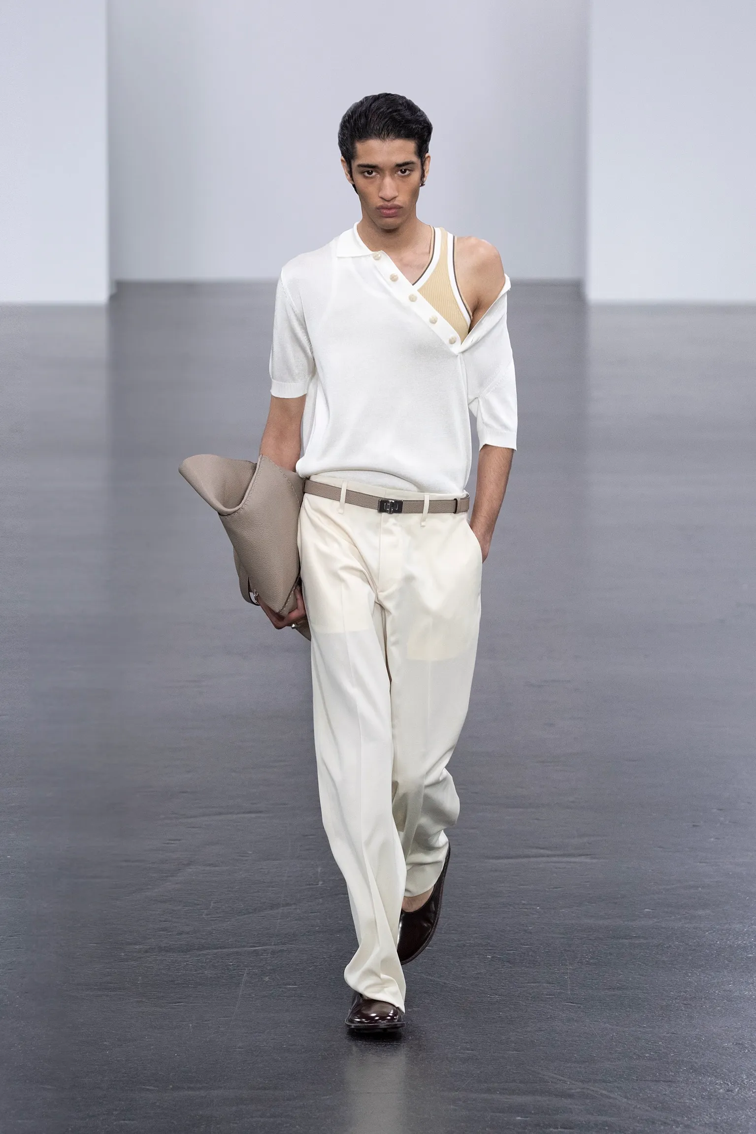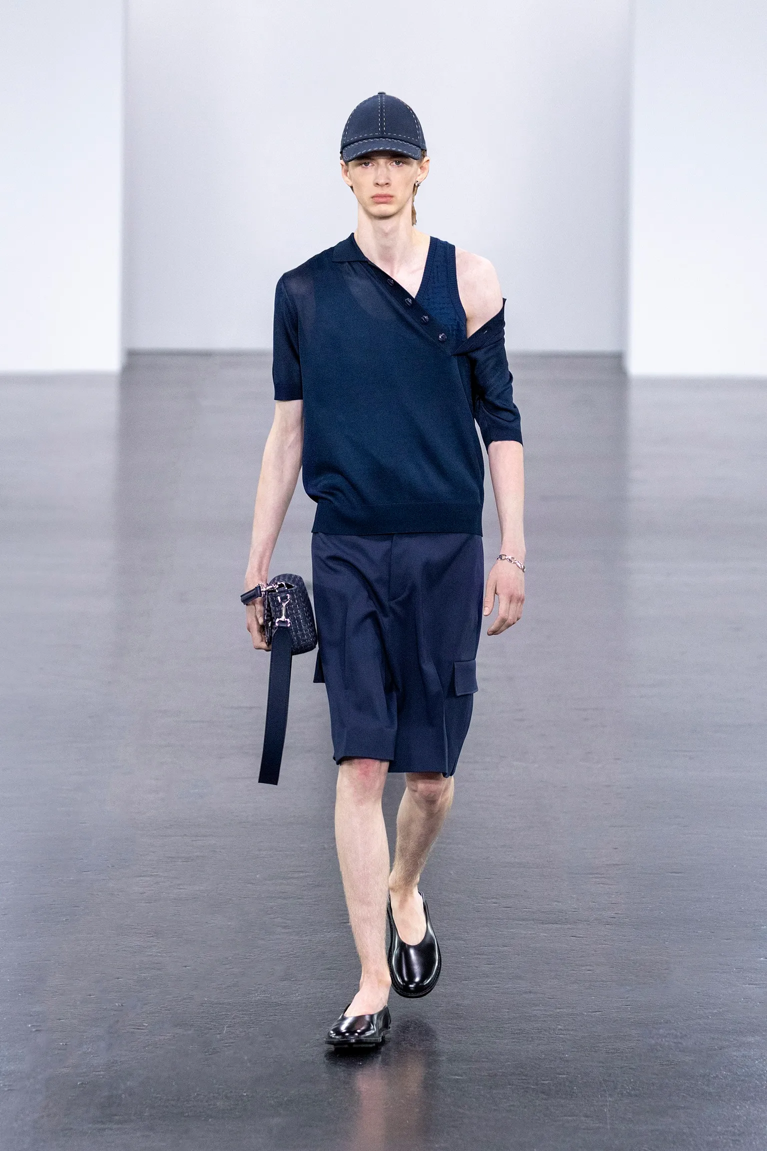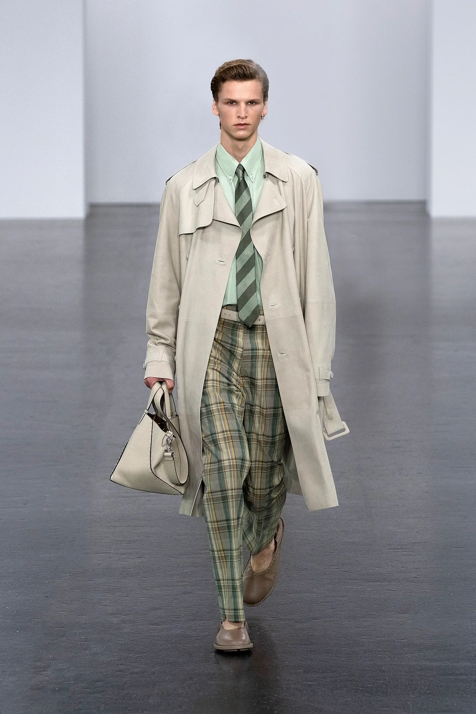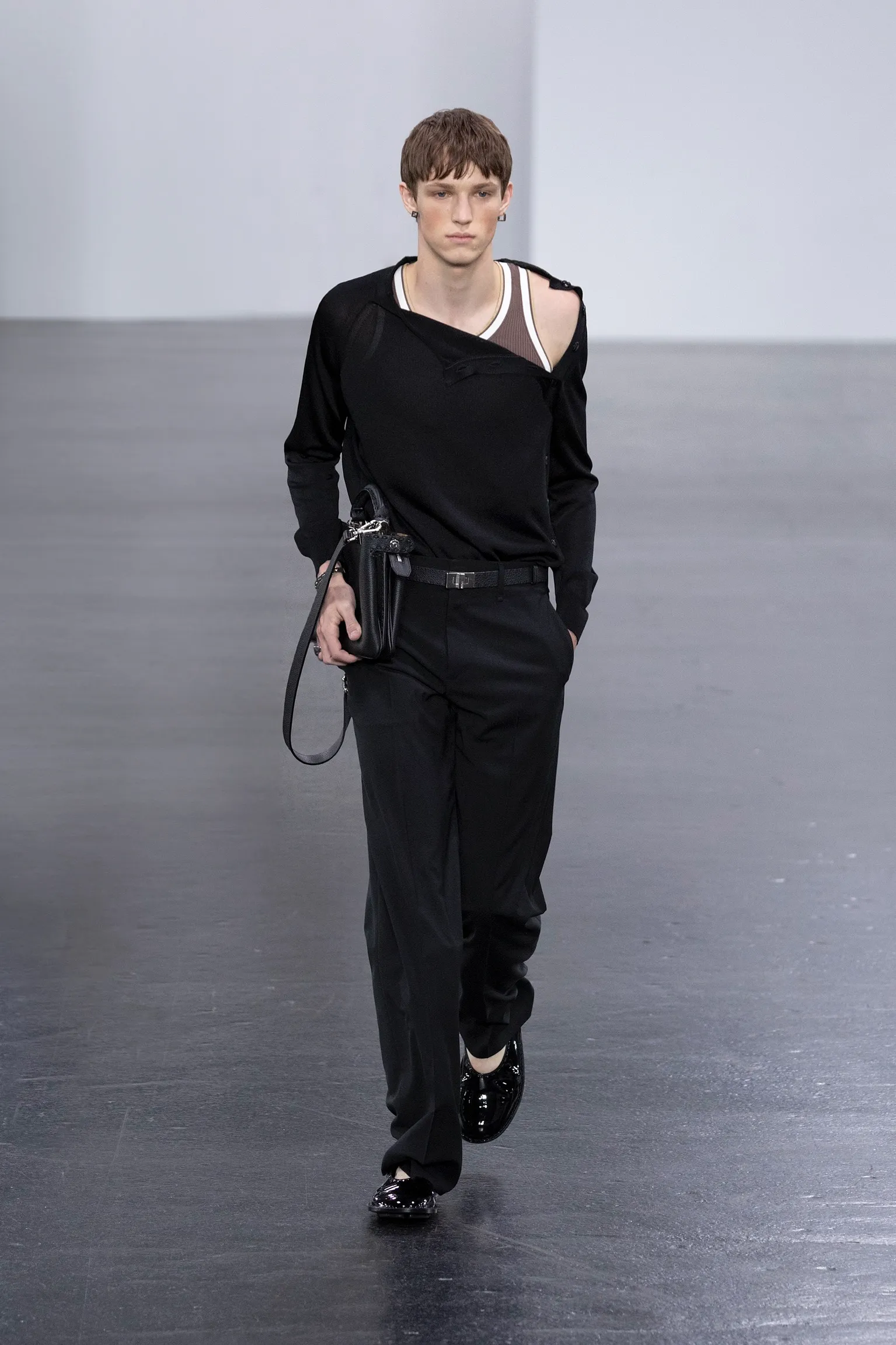 À l’approche du centenaire de Fendi, la nostalgie est forte et l’avenir s’annonce radieux. Silvia Venturini Fendi, directrice artistique des accessoires et du prêt-à-porter masculin, considère Fendi comme une capsule temporelle voyageuse avec l'artisanat italien comme étoile du Nord pour toujours. La collection Homme printemps-été 2025 est un hommage à l'universel, sublimant les codes, dès la première silhouette masculine révélée de la maison italienne en 1990. De la tête aux pieds, la collection se délecte de la virtuosité du point Selleria, une technique transmise à la famille Fendi par des maîtres selliers romains en 1925. Agrandi et réduit, il est réinterprété comme une fine rayure brisée convenant au jacquard et enfilé sous forme de rayures ou de logo FF. Sur des shorts plissés, de longues surchemises à poches plaquées et des liens en soie se superposent sous des vestes d'été courtes. La collection accessoires Homme printemps-été 2025 fait écho à l'obsession Selleria de la saison, du Peekaboo ISeeU. Du sac et des cabas souples en diagonale, au nouveau sac bandoulière zippé Baguette Double, et un patchwork Baguette confectionné à partir de chutes multicolores des ateliers de la maison. Enfin, des baskets Fendi Force, aux côtés de mocassins moulés à semelle crantée et de chaussures plates à enfiler en cuir verni ou brodées de fils cirés.