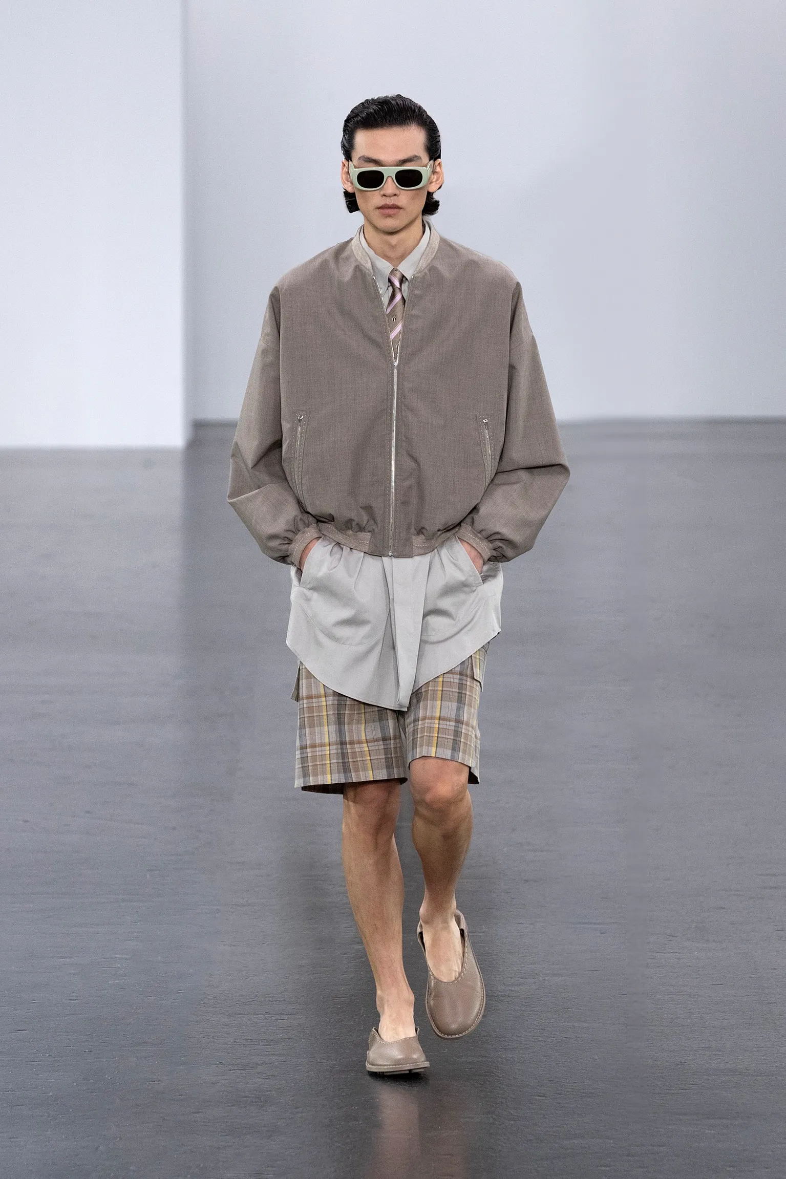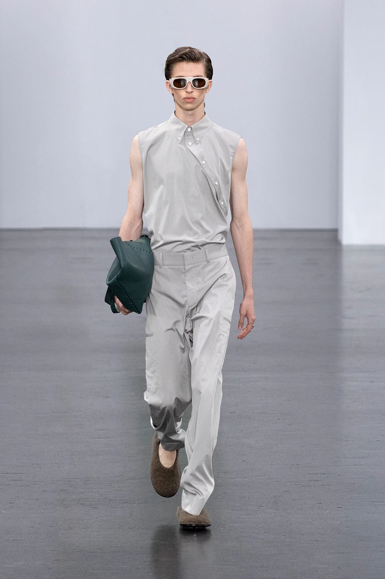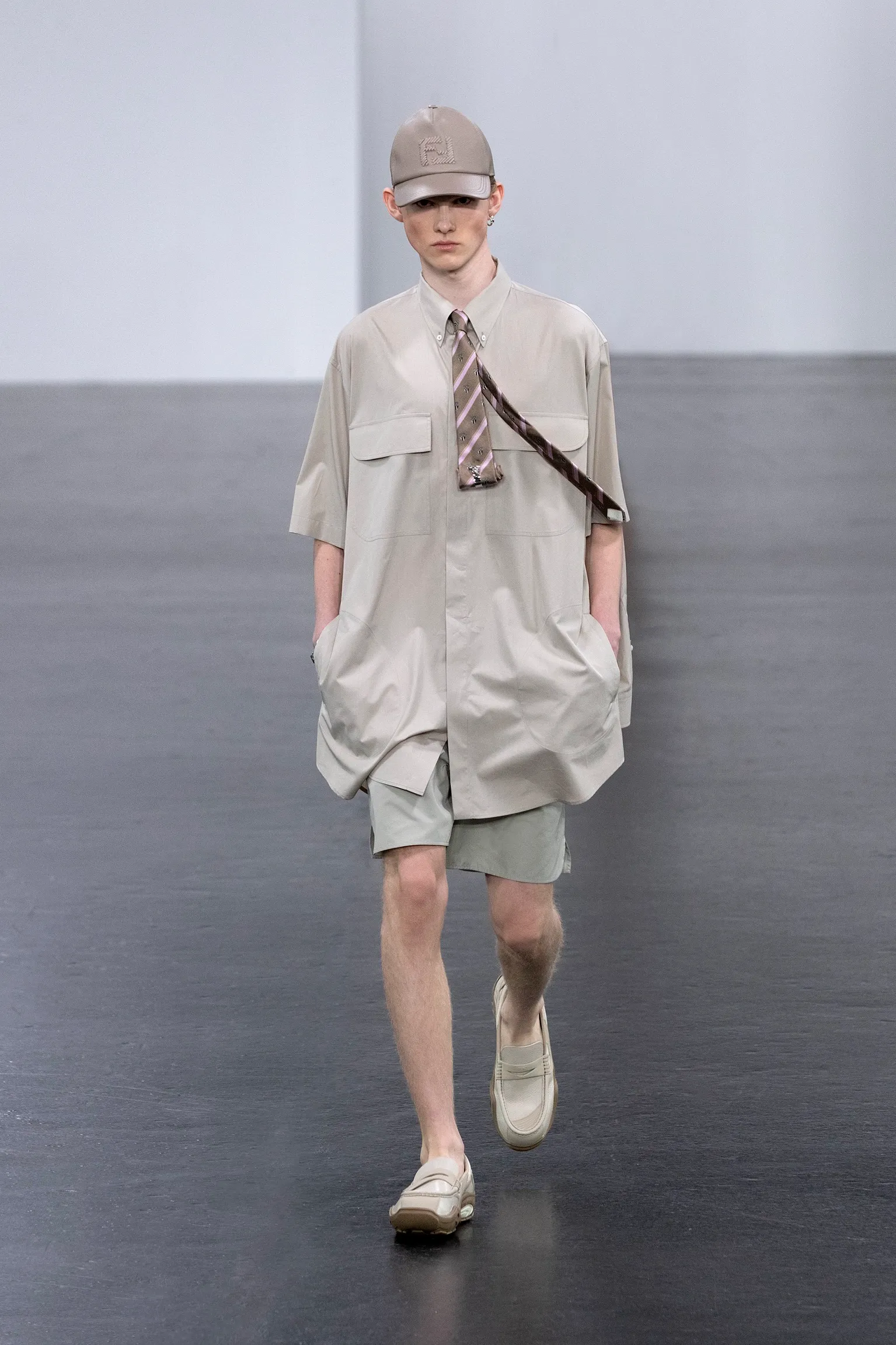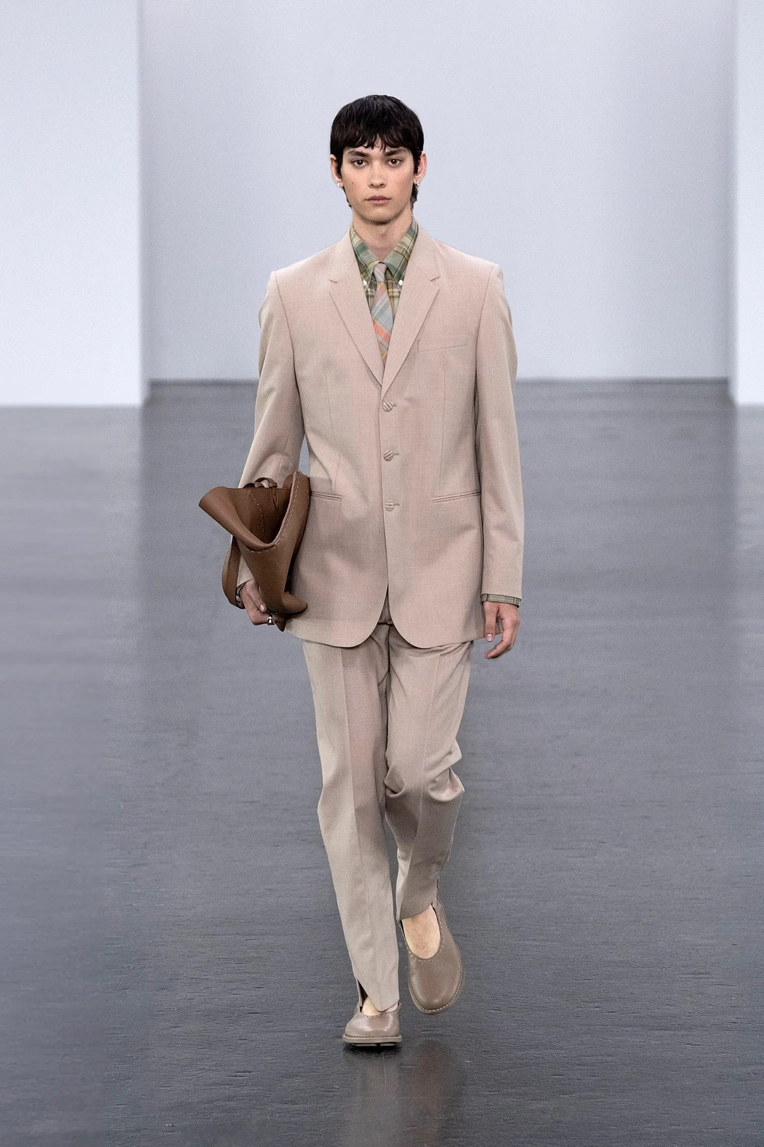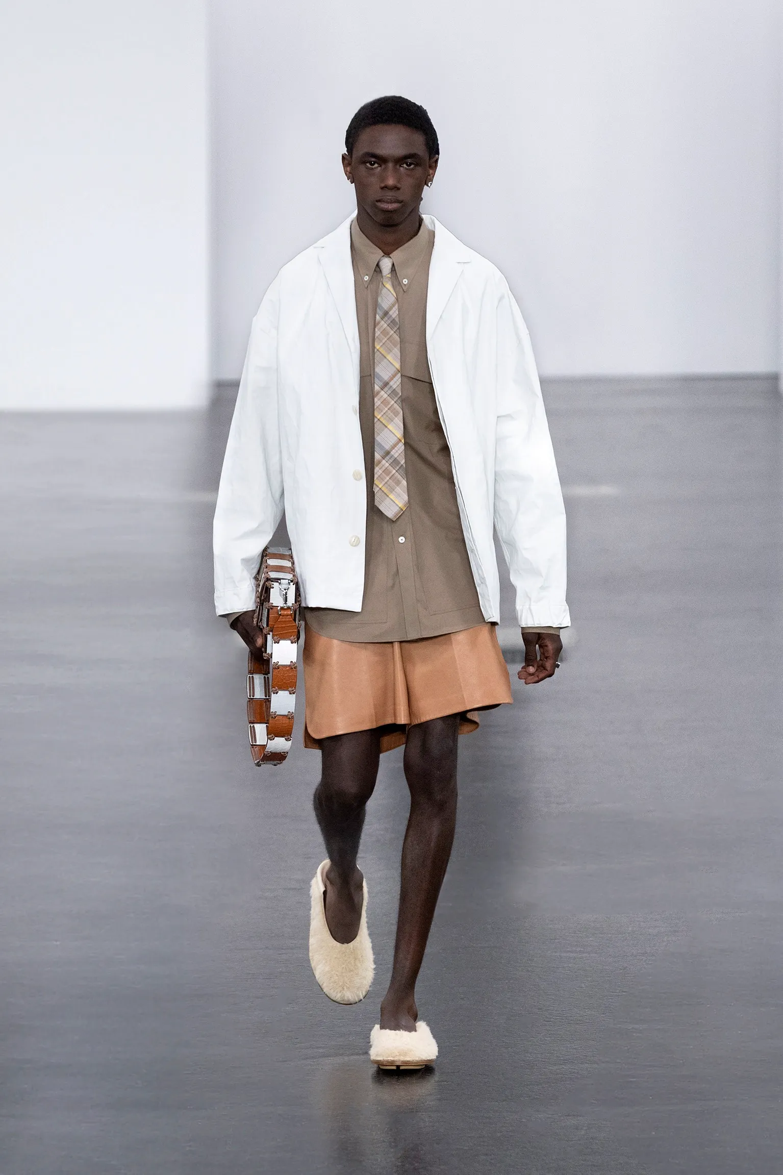 À l’approche du centenaire de Fendi, la nostalgie est forte et l’avenir s’annonce radieux. Silvia Venturini Fendi, directrice artistique des accessoires et du prêt-à-porter masculin, considère Fendi comme une capsule temporelle voyageuse avec l'artisanat italien comme étoile du Nord pour toujours. La collection Homme printemps-été 2025 est un hommage à l'universel, sublimant les codes, dès la première silhouette masculine révélée de la maison italienne en 1990. De la tête aux pieds, la collection se délecte de la virtuosité du point Selleria, une technique transmise à la famille Fendi par des maîtres selliers romains en 1925. Agrandi et réduit, il est réinterprété comme une fine rayure brisée convenant au jacquard et enfilé sous forme de rayures ou de logo FF. Sur des shorts plissés, de longues surchemises à poches plaquées et des liens en soie se superposent sous des vestes d'été courtes. La collection accessoires Homme printemps-été 2025 fait écho à l'obsession Selleria de la saison, du Peekaboo ISeeU. Du sac et des cabas souples en diagonale, au nouveau sac bandoulière zippé Baguette Double, et un patchwork Baguette confectionné à partir de chutes multicolores des ateliers de la maison. Enfin, des baskets Fendi Force, aux côtés de mocassins moulés à semelle crantée et de chaussures plates à enfiler en cuir verni ou brodées de fils cirés.