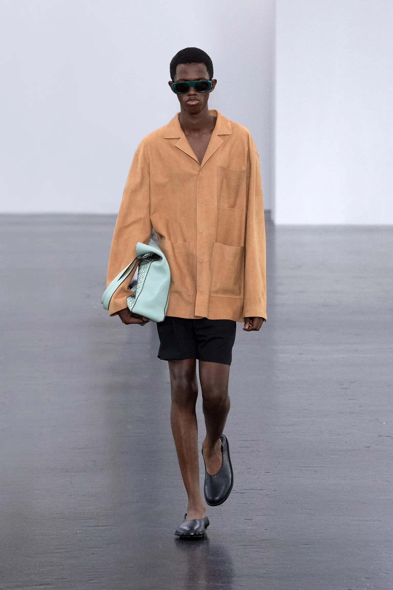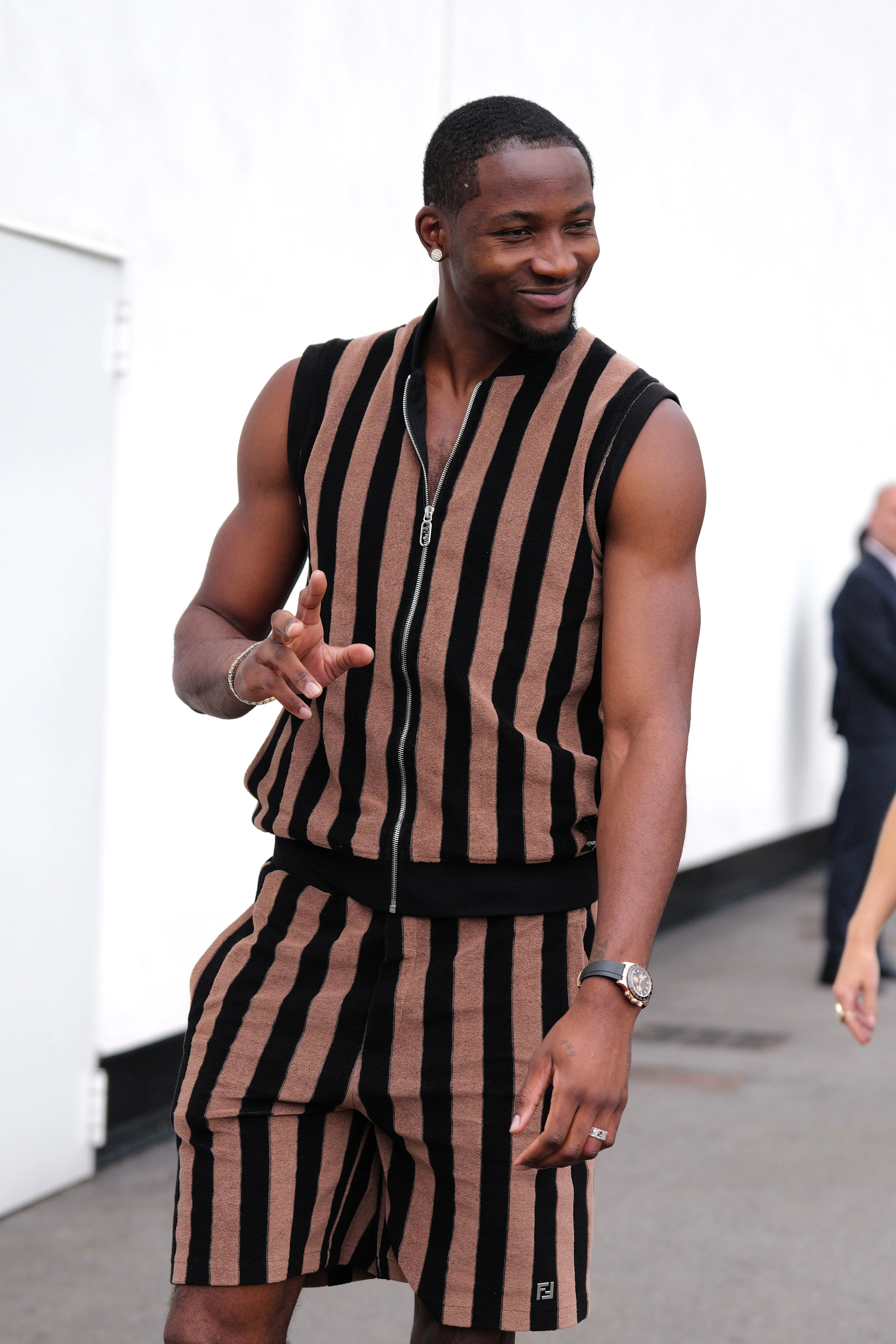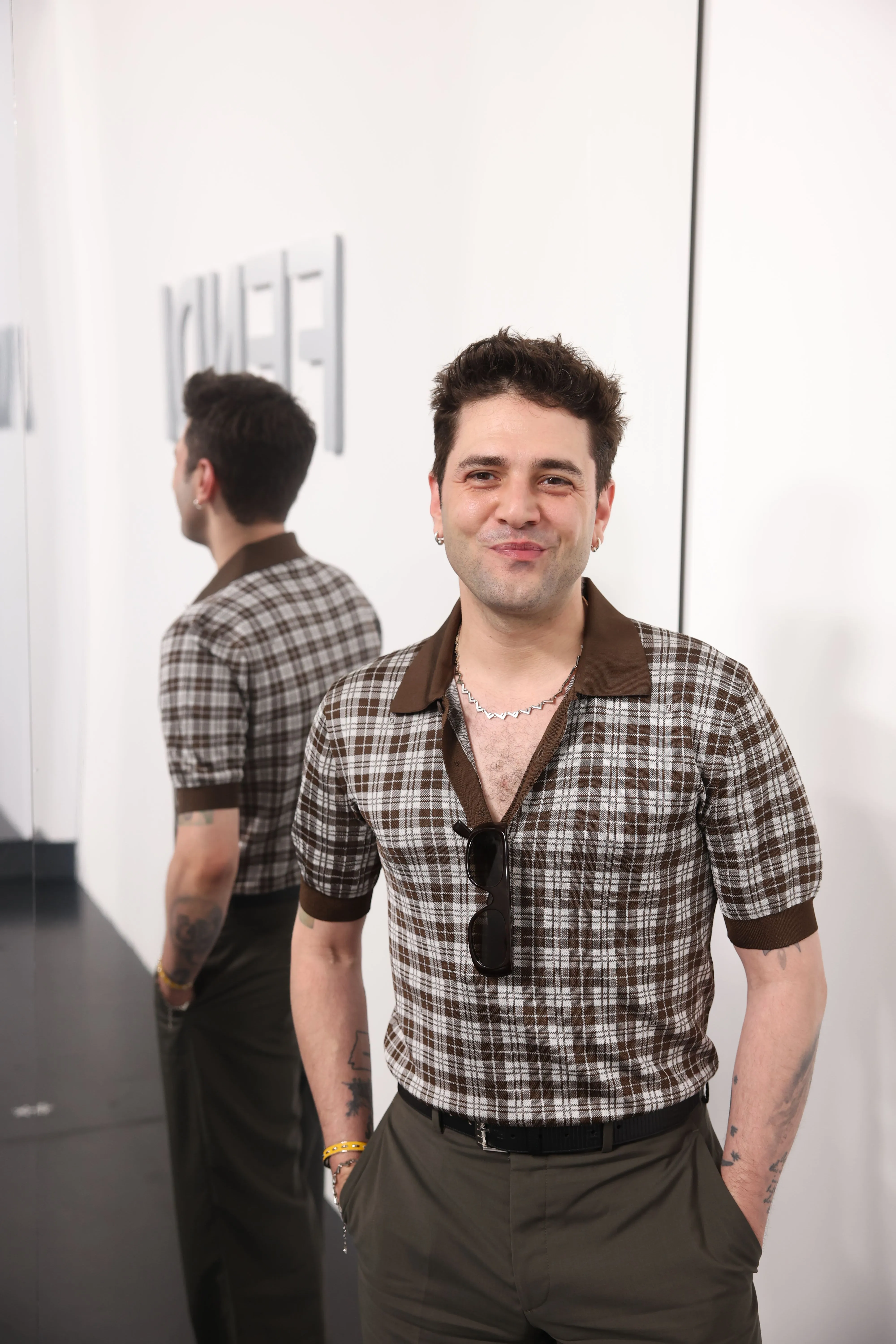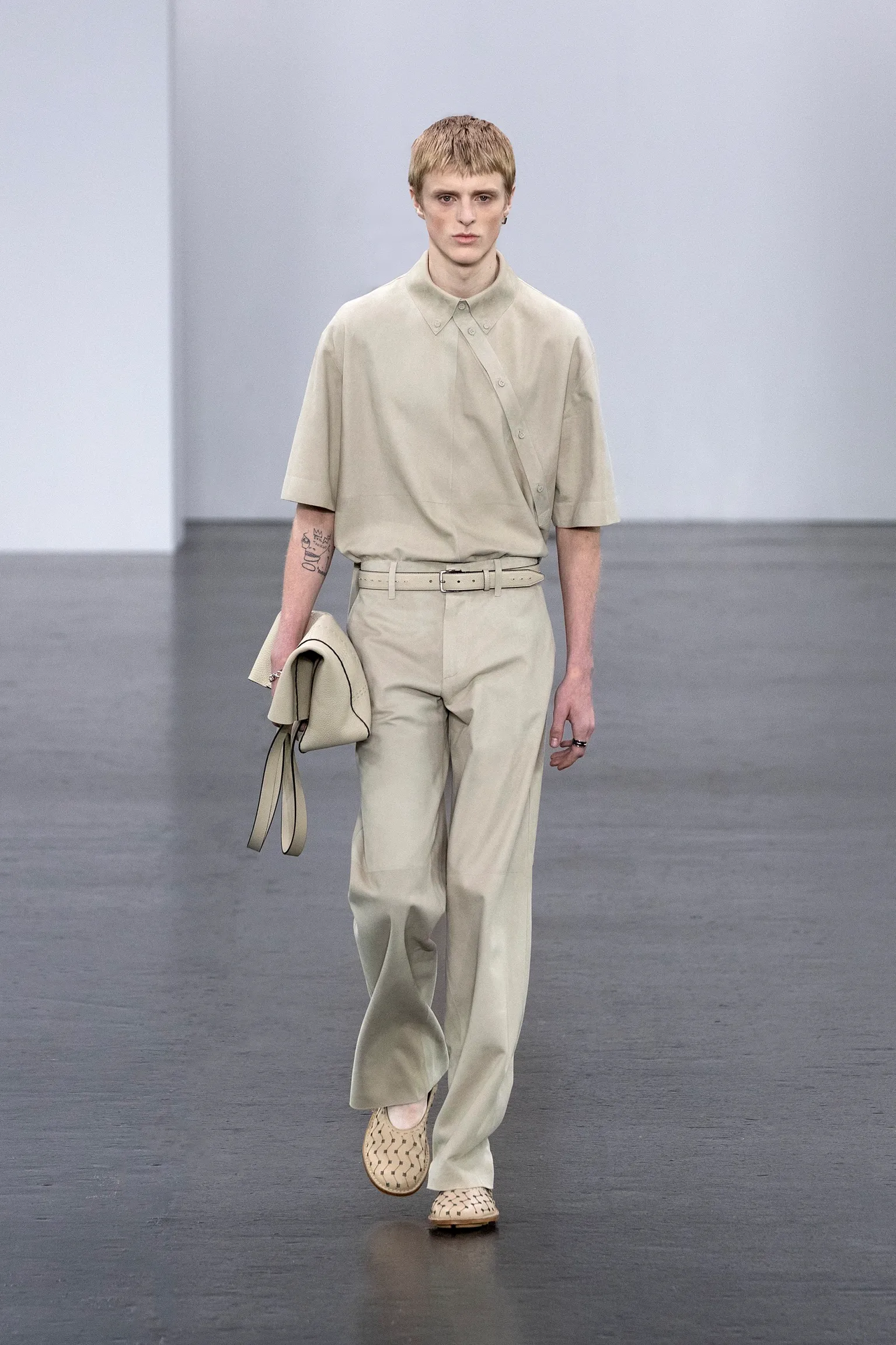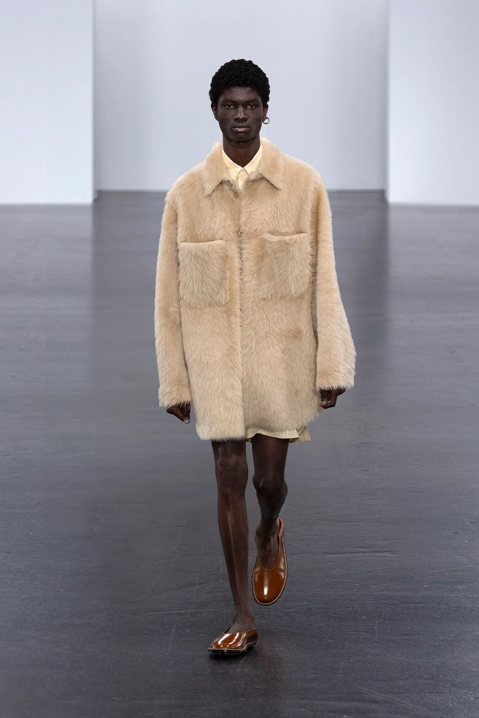 À l’approche du centenaire de Fendi, la nostalgie est forte et l’avenir s’annonce radieux. Silvia Venturini Fendi, directrice artistique des accessoires et du prêt-à-porter masculin, considère Fendi comme une capsule temporelle voyageuse avec l'artisanat italien comme étoile du Nord pour toujours. La collection Homme printemps-été 2025 est un hommage à l'universel, sublimant les codes, dès la première silhouette masculine révélée de la maison italienne en 1990. De la tête aux pieds, la collection se délecte de la virtuosité du point Selleria, une technique transmise à la famille Fendi par des maîtres selliers romains en 1925. Agrandi et réduit, il est réinterprété comme une fine rayure brisée convenant au jacquard et enfilé sous forme de rayures ou de logo FF. Sur des shorts plissés, de longues surchemises à poches plaquées et des liens en soie se superposent sous des vestes d'été courtes. La collection accessoires Homme printemps-été 2025 fait écho à l'obsession Selleria de la saison, du Peekaboo ISeeU. Du sac et des cabas souples en diagonale, au nouveau sac bandoulière zippé Baguette Double, et un patchwork Baguette confectionné à partir de chutes multicolores des ateliers de la maison. Enfin, des baskets Fendi Force, aux côtés de mocassins moulés à semelle crantée et de chaussures plates à enfiler en cuir verni ou brodées de fils cirés.