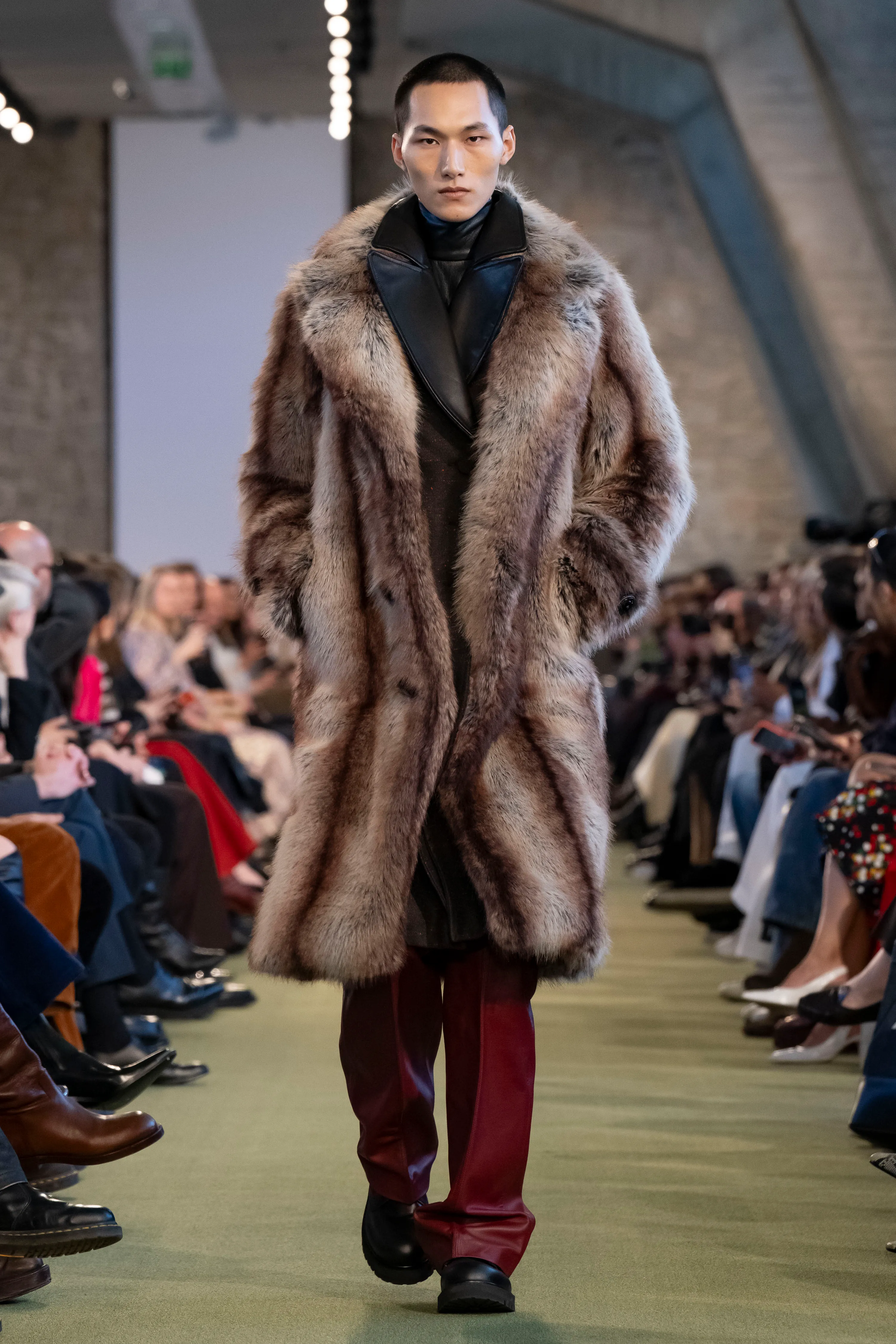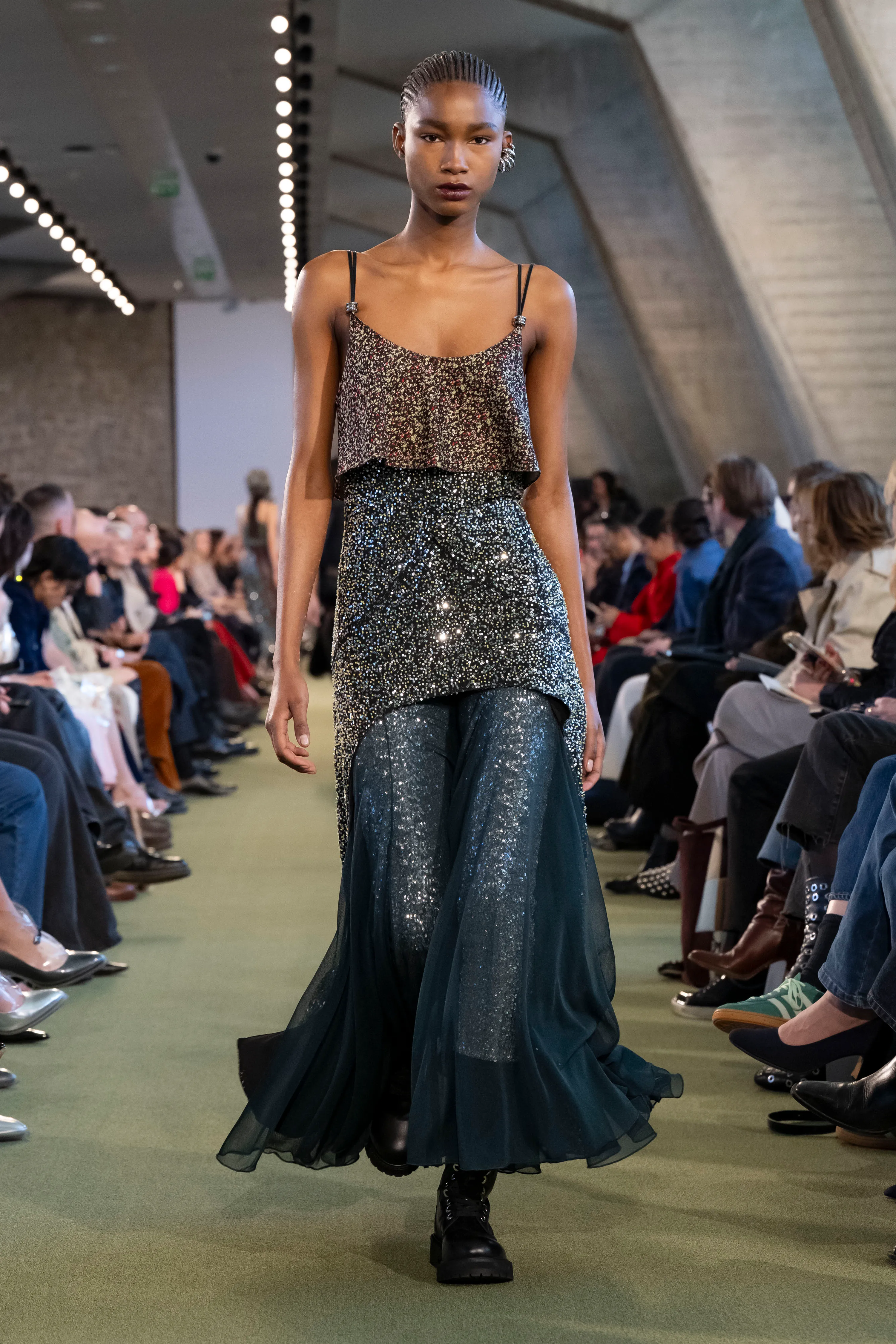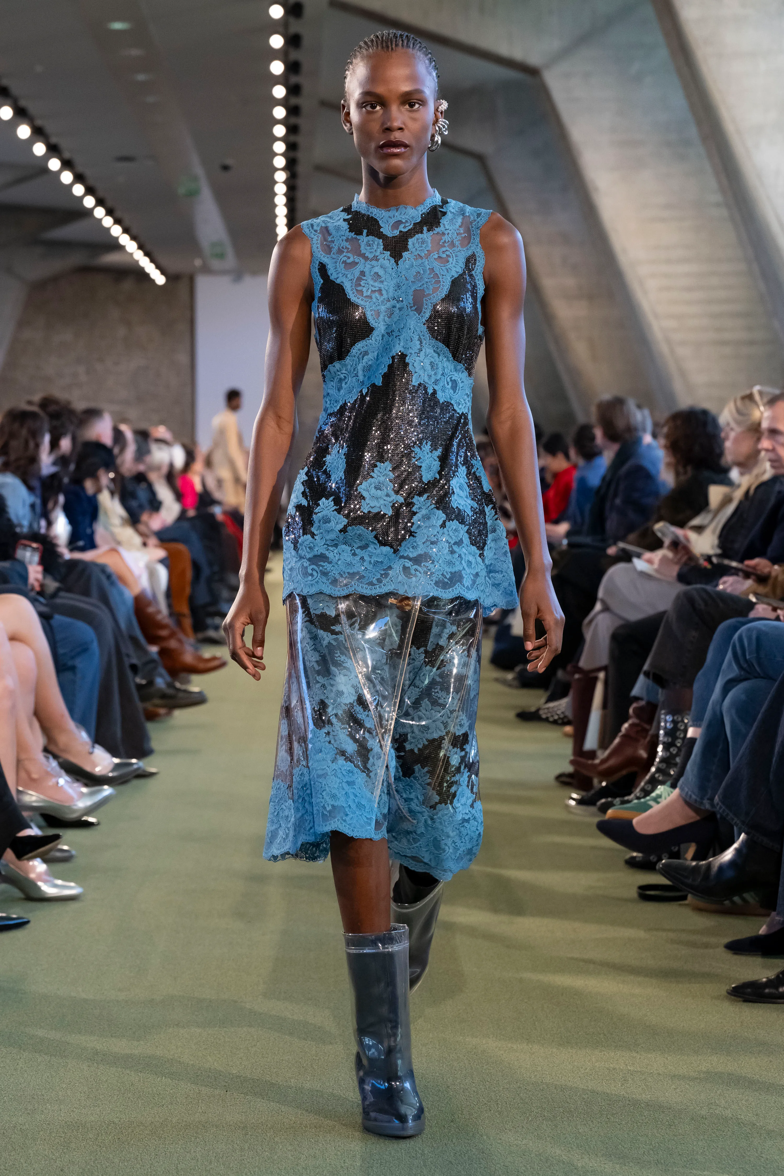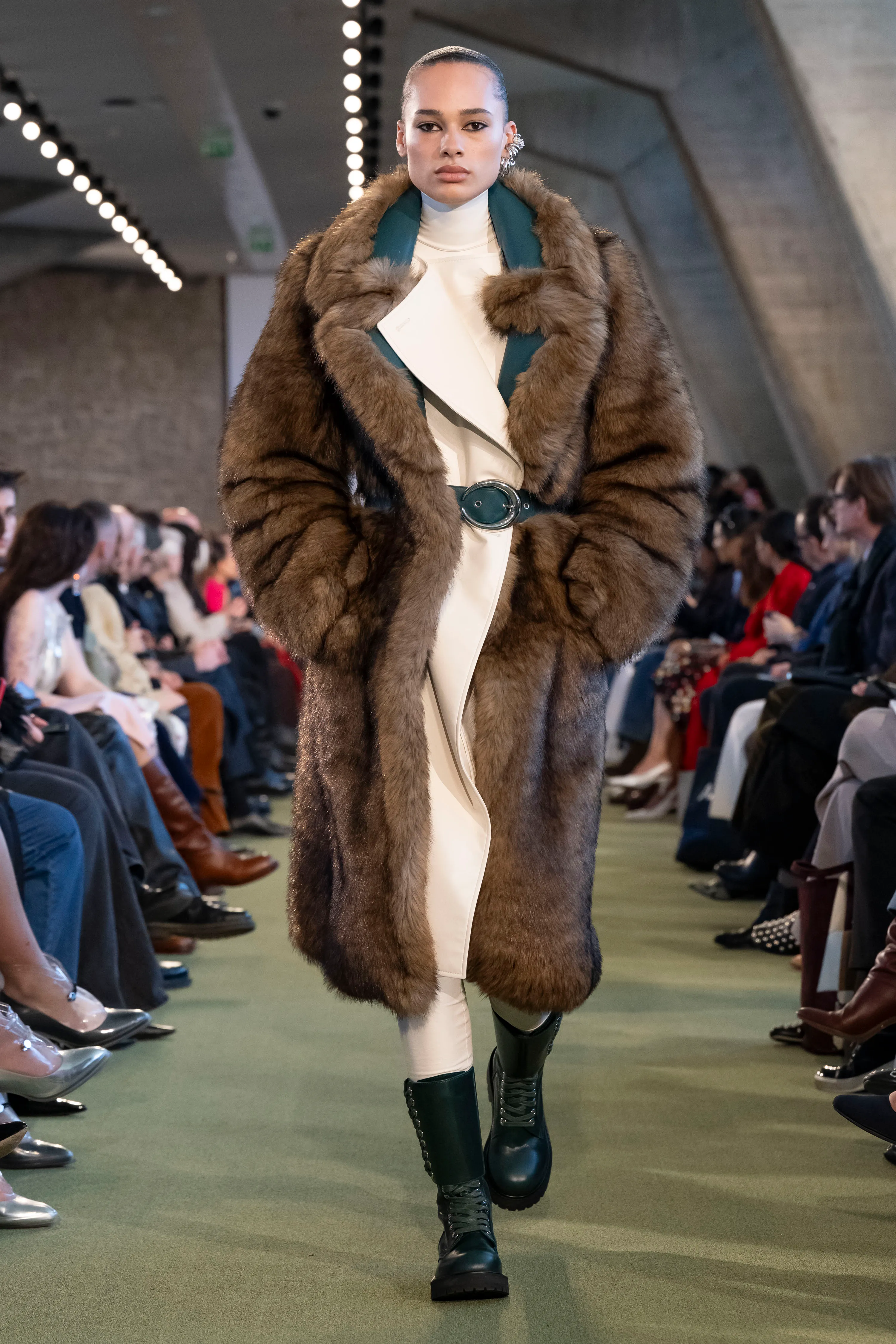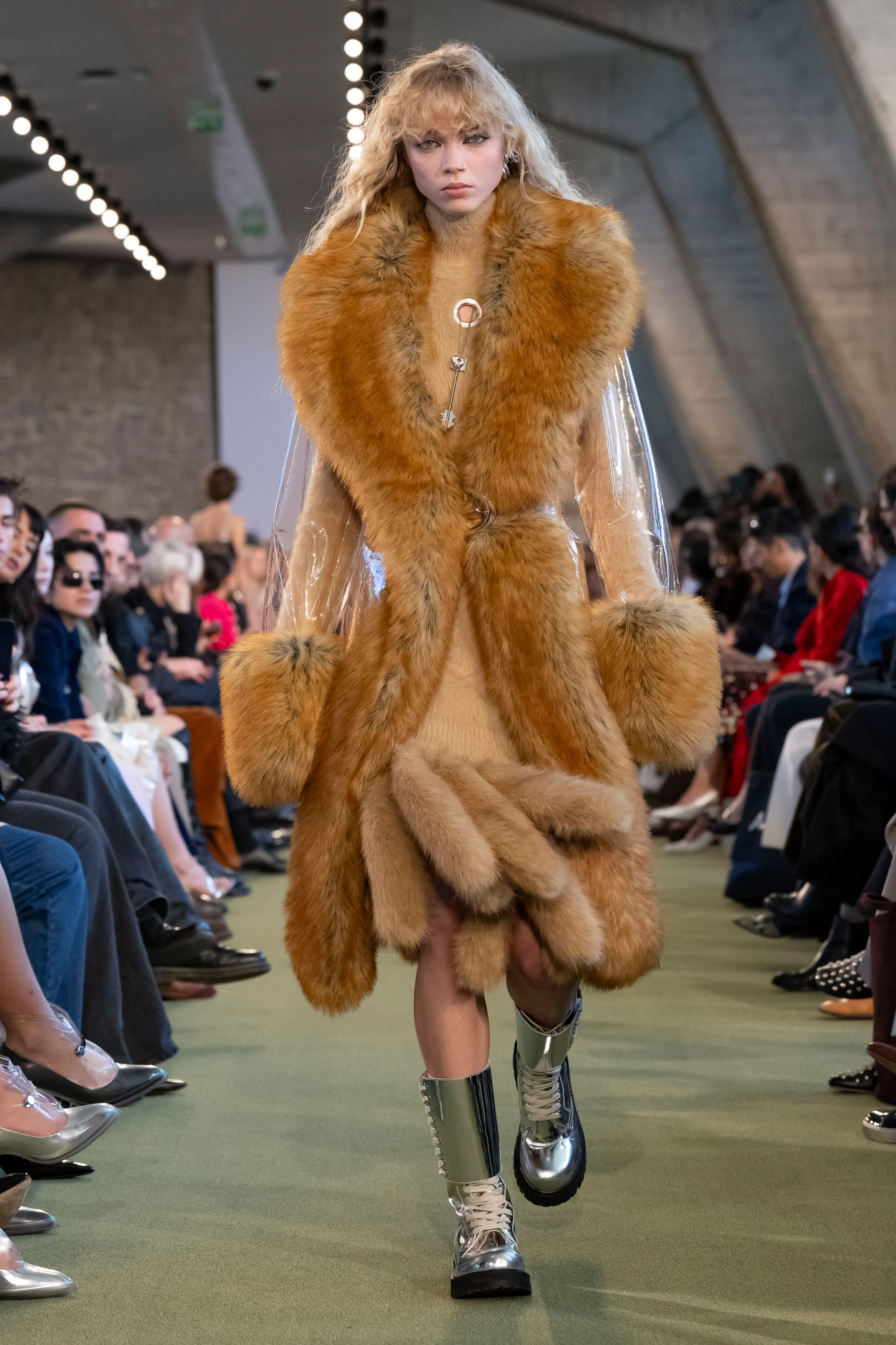 Deux états qui agissent l’un sur l’autre. Un cadre qui se brise. La collection rabanne automne-hiver 2025-2026 nous invite à tout garder près de nous – notre histoire, nos trésors, notre force – pour ensuite tout lâcher au bon moment. Articulée autour d’associations de matières, de formes et de couleurs, Julien Dossena place la préciosité et la protection dans un dialogue constant. La fourrure moderne est élégamment enveloppante, mais aussi sauvage et déchaînée, des somptueux manteaux naturalistes aux jupes composées de queues touffues se balancent en mouvement. Des silhouettes plus strictes en laines classiques et cotons enduits explorent différentes notions de territoire entre extérieur et intérieur. Des explosions contrôlées de fourrure sous les kilts, des surfaces argentées rayonnantes se décollent, des foulards perlés soulignent les lignes, et des panneaux déconstruits s’enroulent autour d’une brillance seconde peau. L'ambiguïté de cet excès se retrouve dans un imprimé explosif de pilules colorées rendues comme un costume élégant. Aux côtés des silhouettes structurées, on retrouve des dualités de flou comme des incrustations de mailles métalliques avec de la dentelle protégée par des coques ceinturées en plastique teinté.