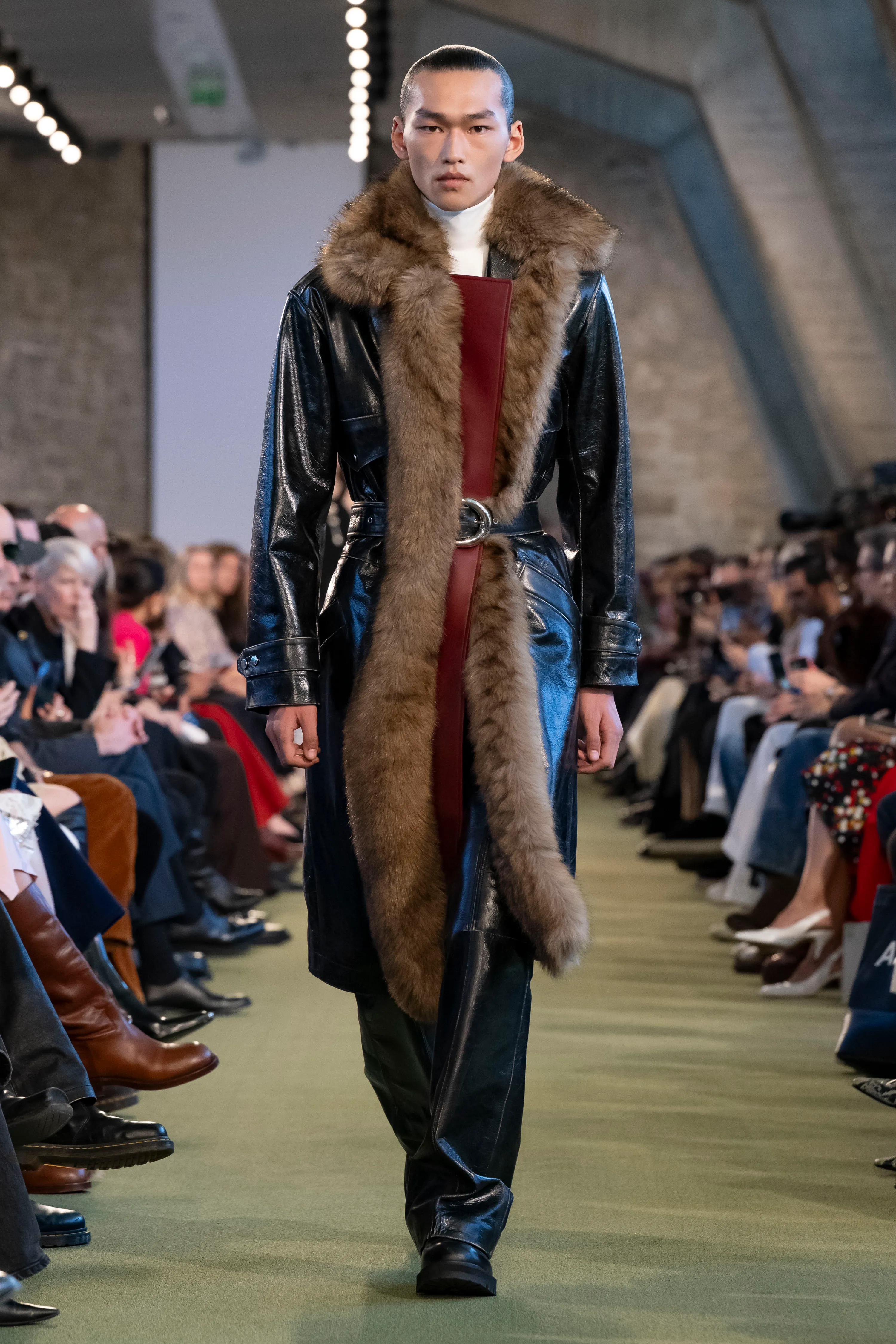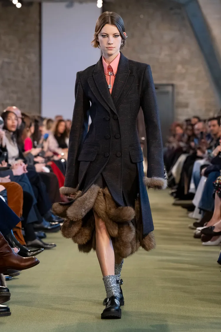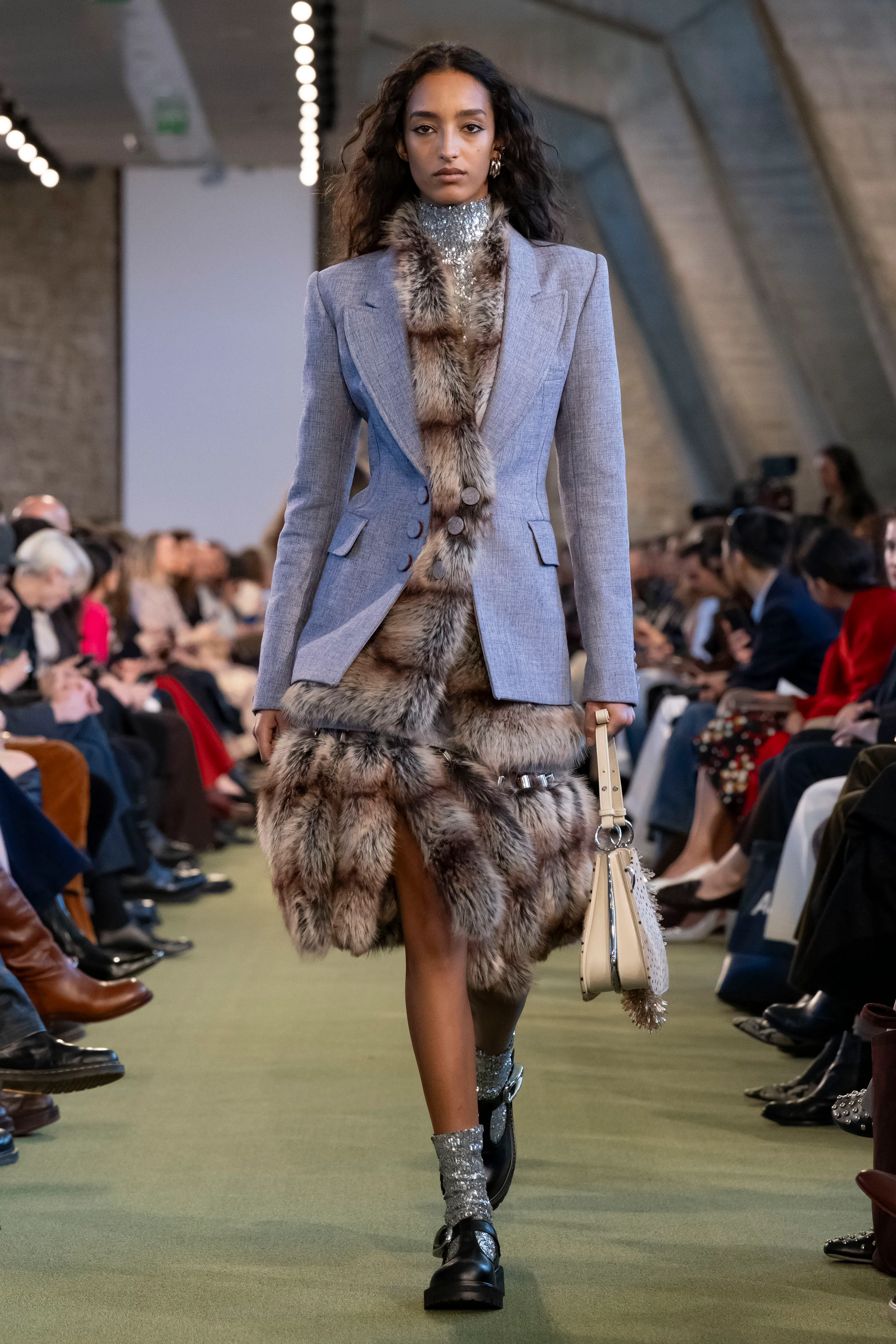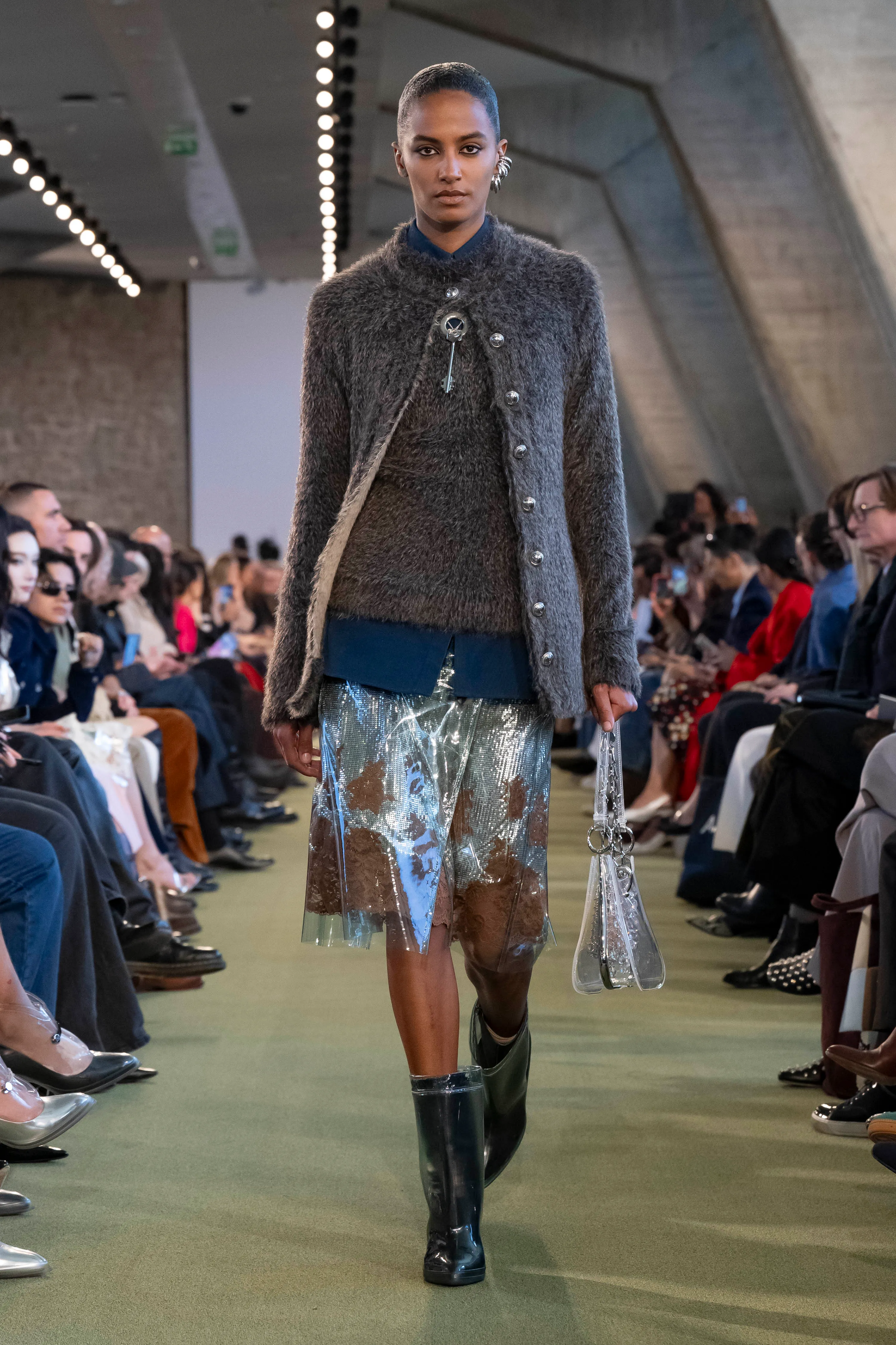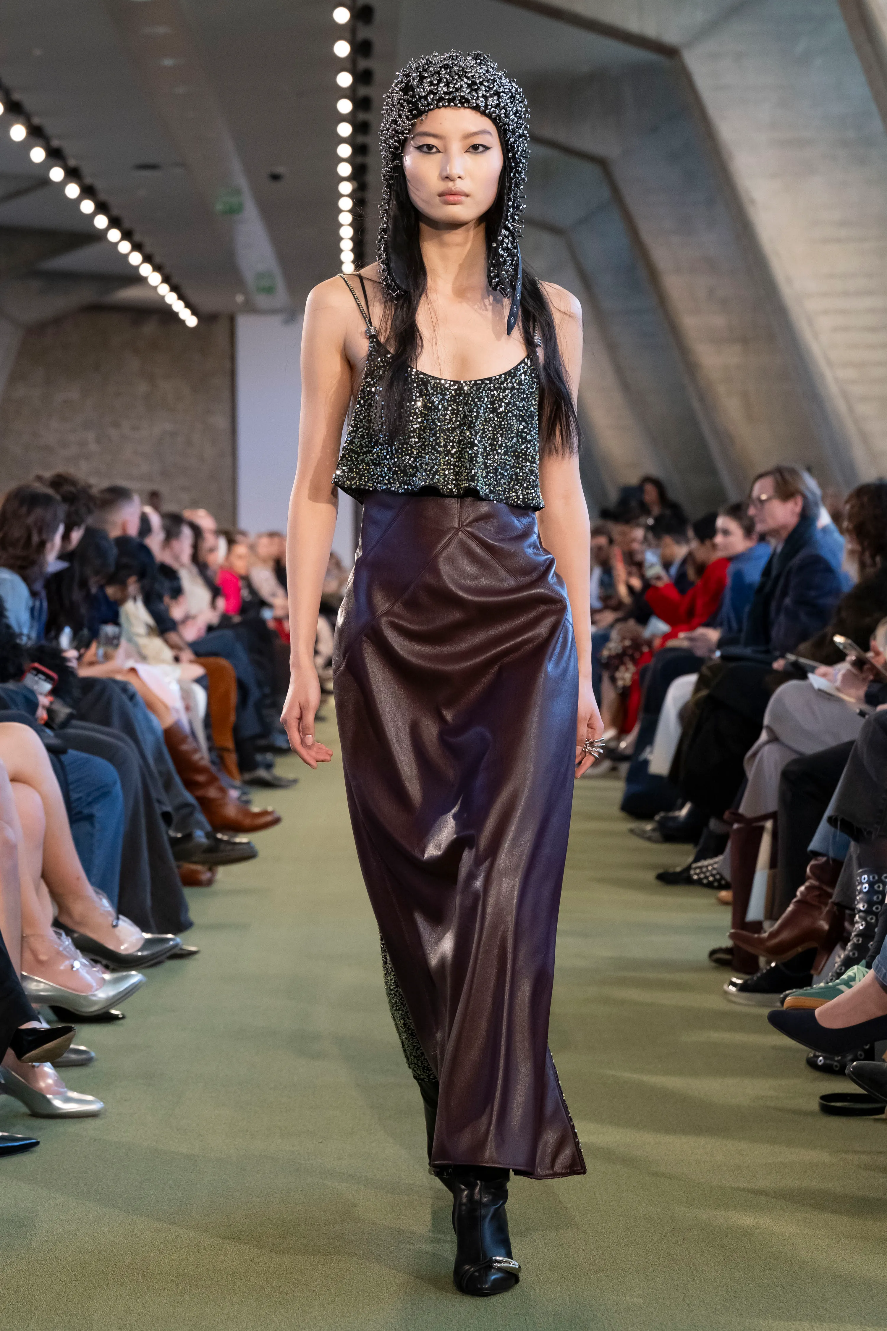 Deux états qui agissent l’un sur l’autre. Un cadre qui se brise. La collection rabanne automne-hiver 2025-2026 nous invite à tout garder près de nous – notre histoire, nos trésors, notre force – pour ensuite tout lâcher au bon moment. Articulée autour d’associations de matières, de formes et de couleurs, Julien Dossena place la préciosité et la protection dans un dialogue constant. La fourrure moderne est élégamment enveloppante, mais aussi sauvage et déchaînée, des somptueux manteaux naturalistes aux jupes composées de queues touffues se balancent en mouvement. Des silhouettes plus strictes en laines classiques et cotons enduits explorent différentes notions de territoire entre extérieur et intérieur. Des explosions contrôlées de fourrure sous les kilts, des surfaces argentées rayonnantes se décollent, des foulards perlés soulignent les lignes, et des panneaux déconstruits s’enroulent autour d’une brillance seconde peau. L'ambiguïté de cet excès se retrouve dans un imprimé explosif de pilules colorées rendues comme un costume élégant. Aux côtés des silhouettes structurées, on retrouve des dualités de flou comme des incrustations de mailles métalliques avec de la dentelle protégée par des coques ceinturées en plastique teinté.