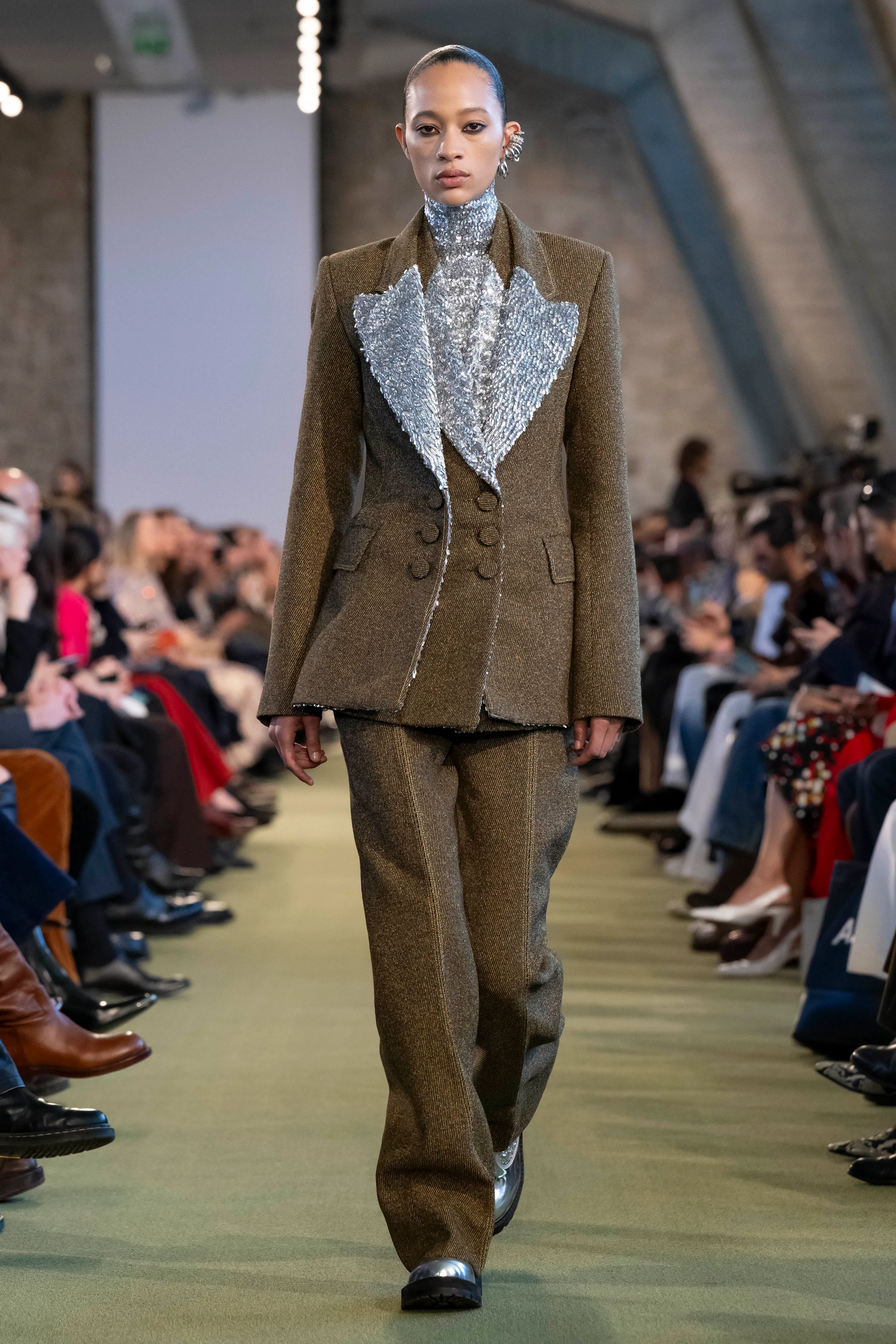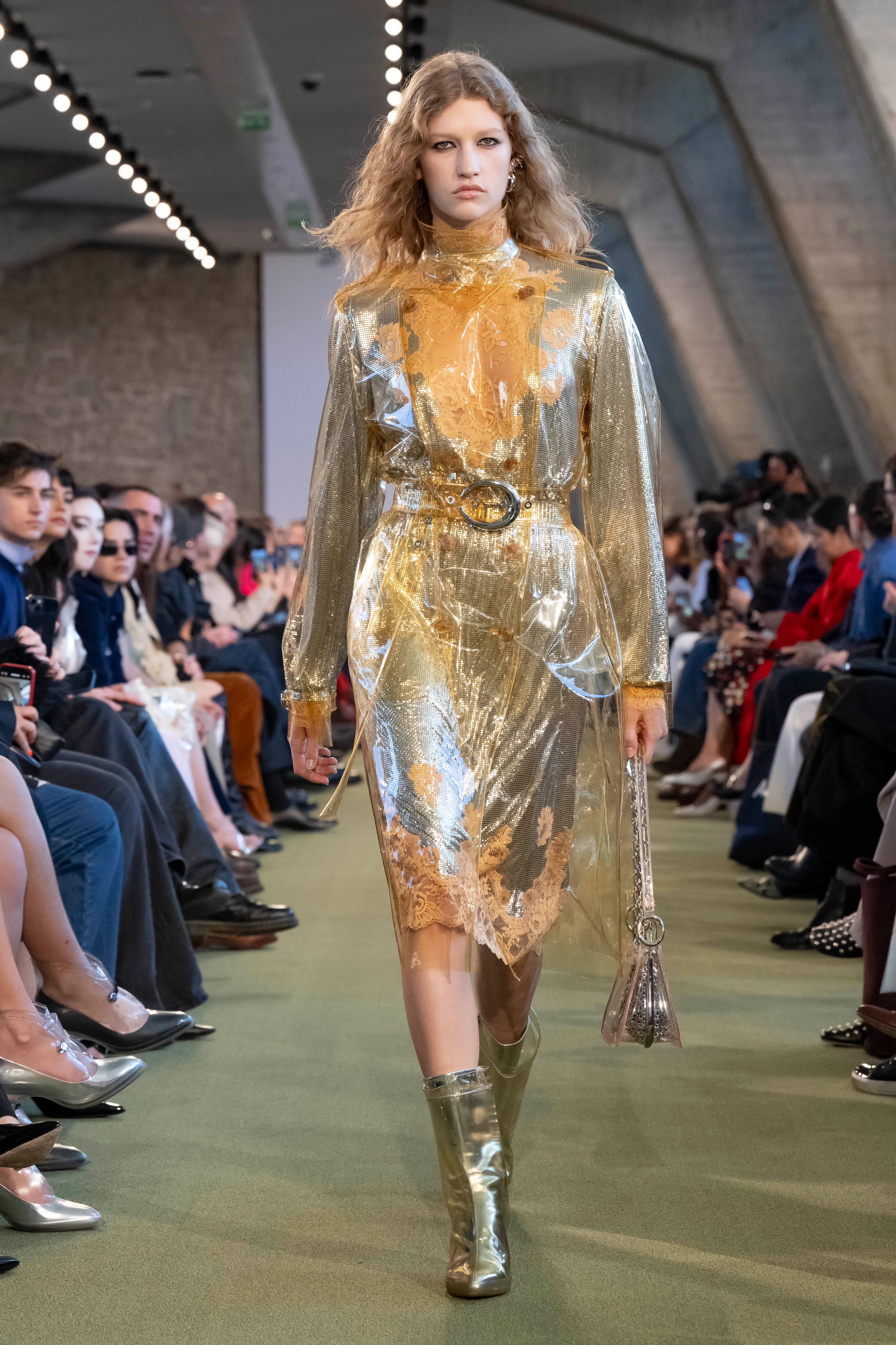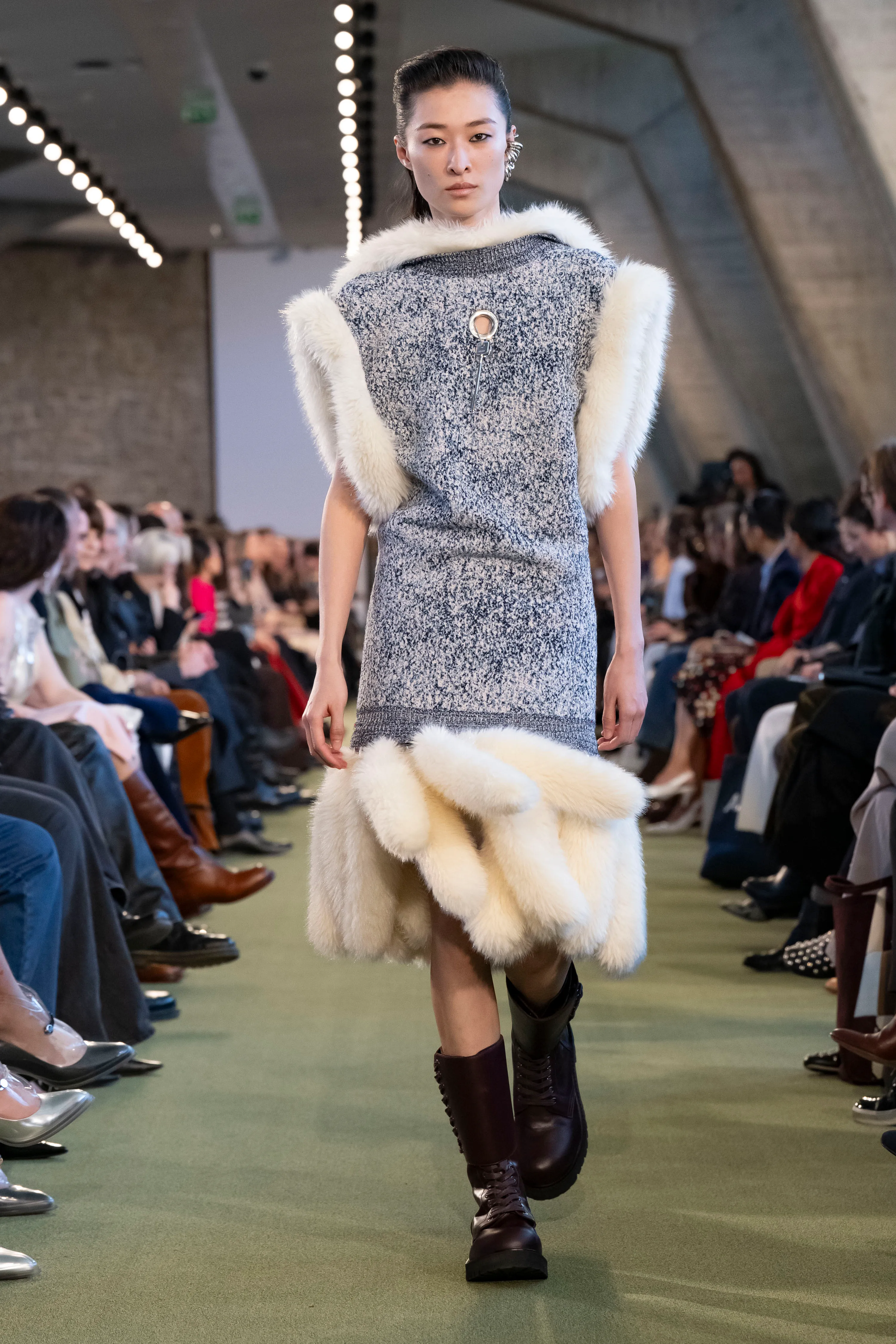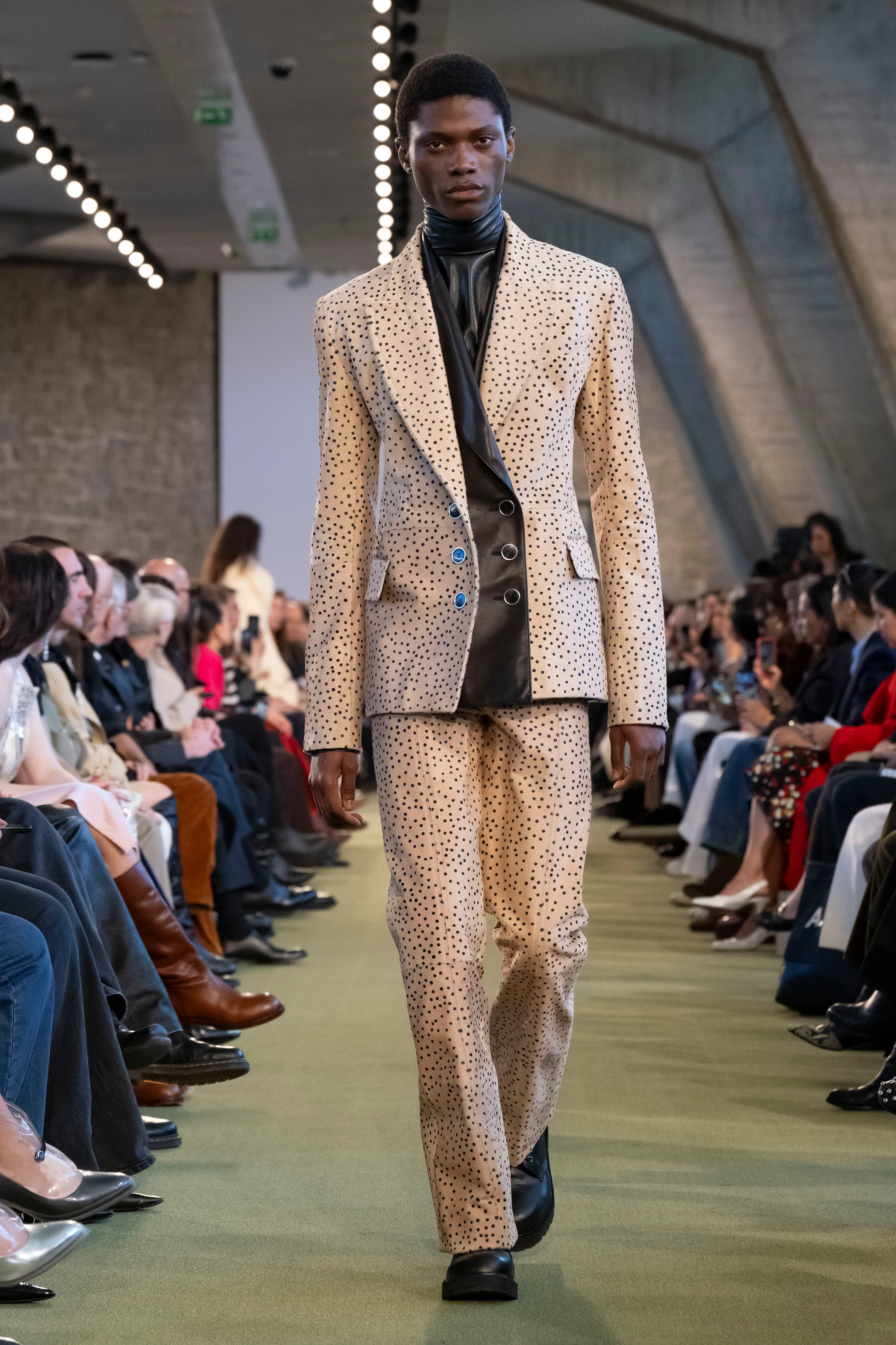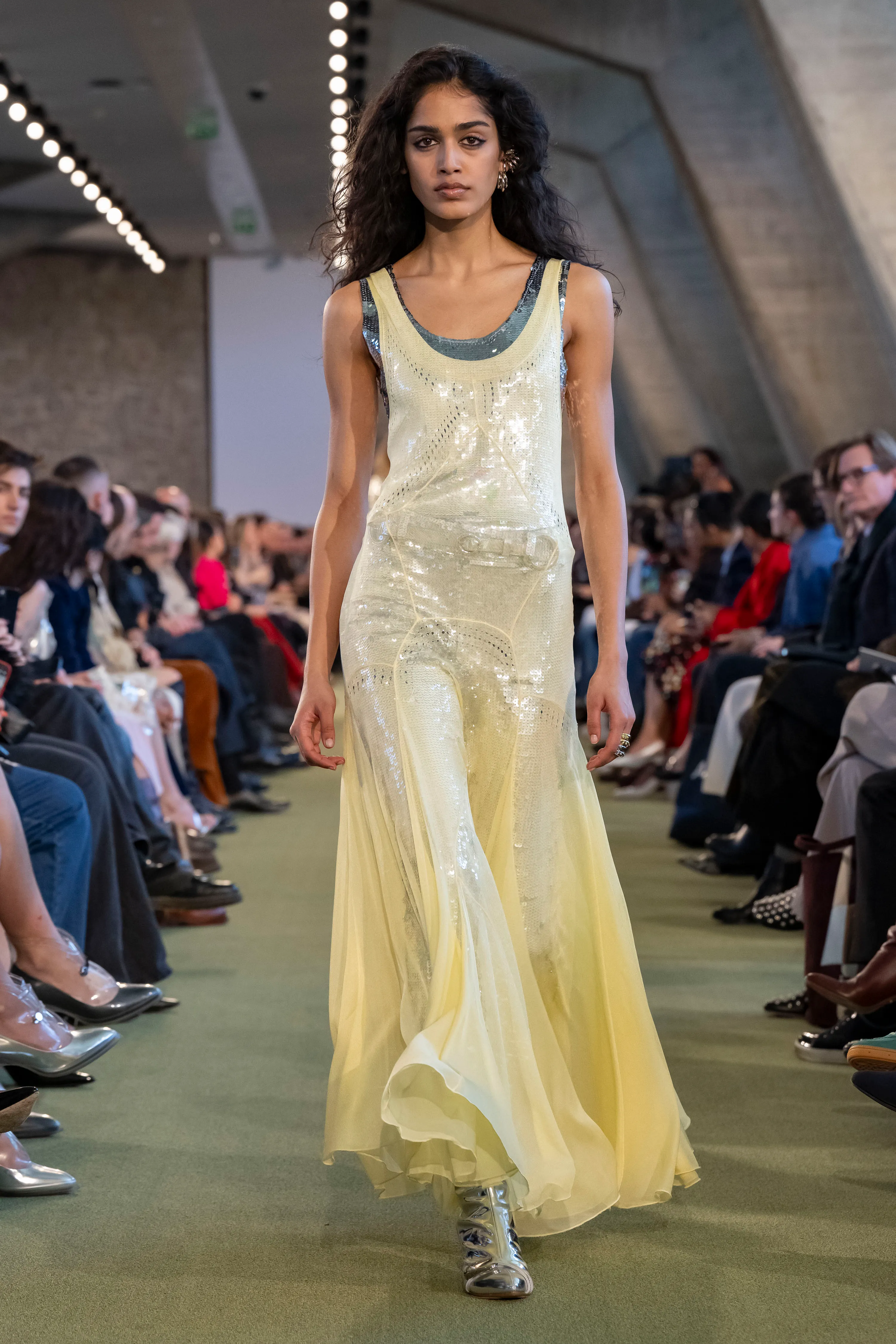 Deux états qui agissent l’un sur l’autre. Un cadre qui se brise. La collection rabanne automne-hiver 2025-2026 nous invite à tout garder près de nous – notre histoire, nos trésors, notre force – pour ensuite tout lâcher au bon moment. Articulée autour d’associations de matières, de formes et de couleurs, Julien Dossena place la préciosité et la protection dans un dialogue constant. La fourrure moderne est élégamment enveloppante, mais aussi sauvage et déchaînée, des somptueux manteaux naturalistes aux jupes composées de queues touffues se balancent en mouvement. Des silhouettes plus strictes en laines classiques et cotons enduits explorent différentes notions de territoire entre extérieur et intérieur. Des explosions contrôlées de fourrure sous les kilts, des surfaces argentées rayonnantes se décollent, des foulards perlés soulignent les lignes, et des panneaux déconstruits s’enroulent autour d’une brillance seconde peau. L'ambiguïté de cet excès se retrouve dans un imprimé explosif de pilules colorées rendues comme un costume élégant. Aux côtés des silhouettes structurées, on retrouve des dualités de flou comme des incrustations de mailles métalliques avec de la dentelle protégée par des coques ceinturées en plastique teinté.