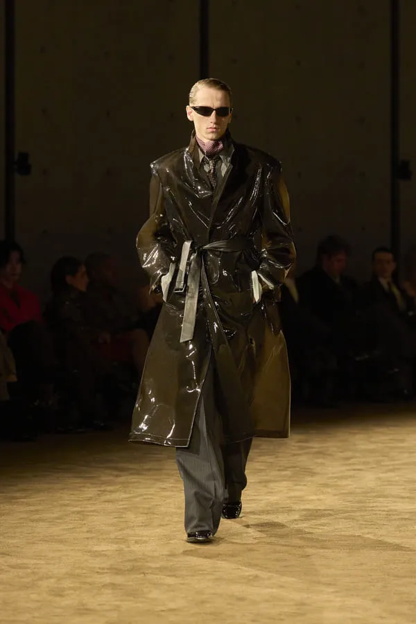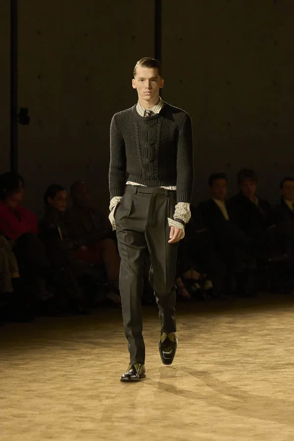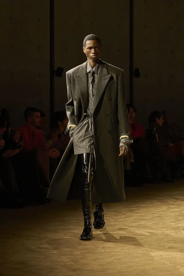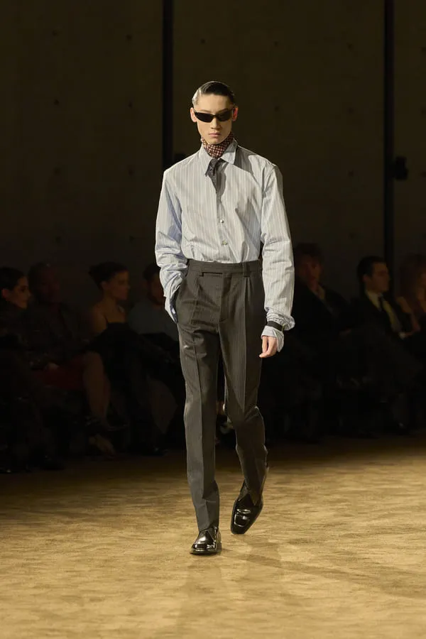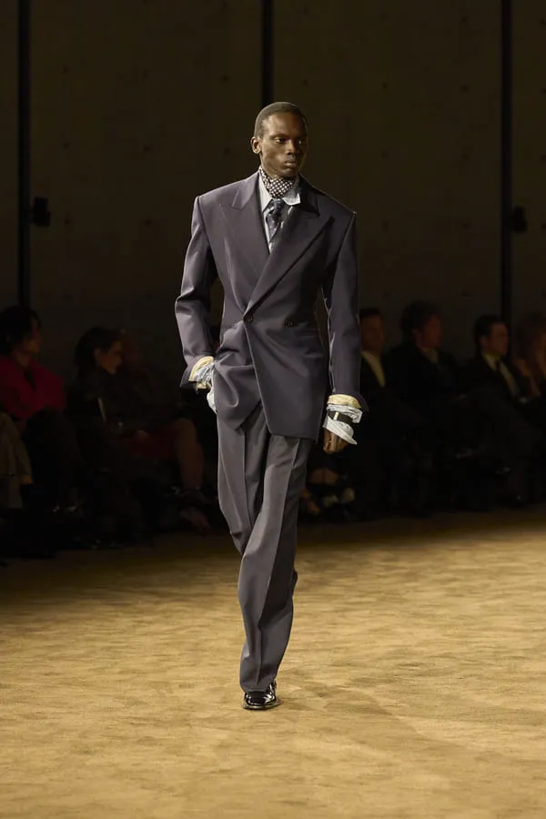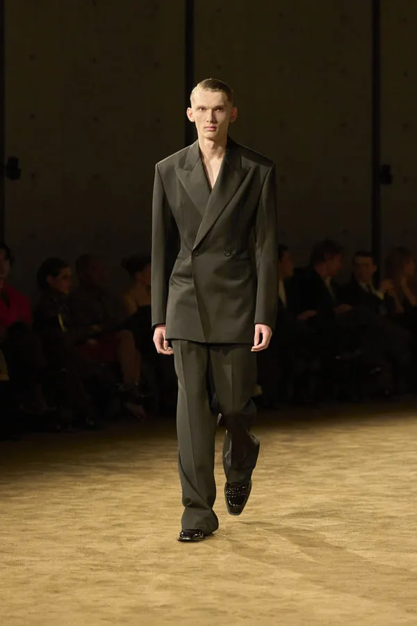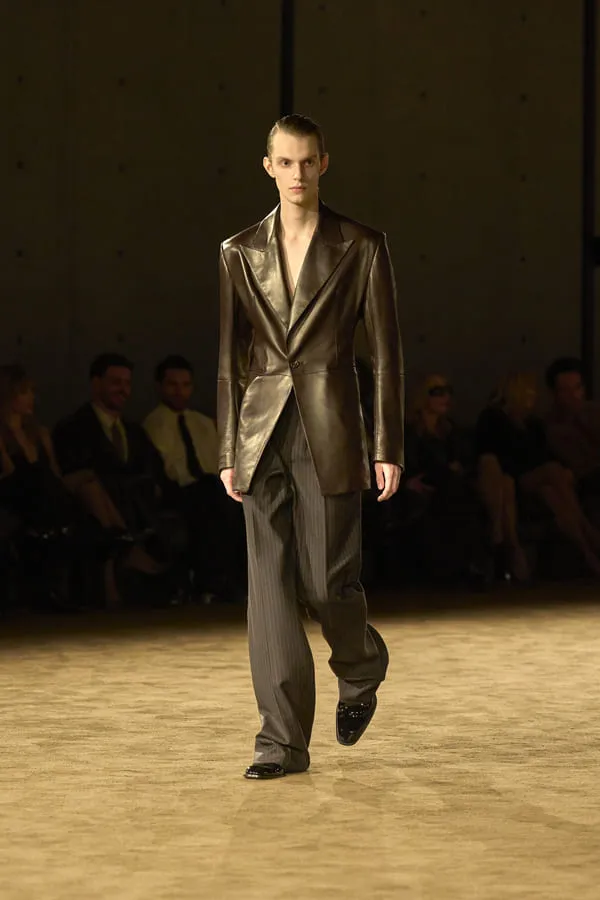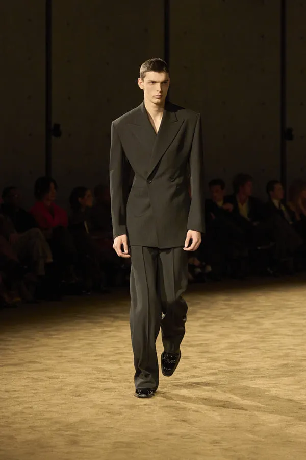 Anthony Vaccarello signe une collection masculine automne-hiver 2026-2027 qui explore l'intimité et la vulnérabilité à travers le prisme de l'aube parisienne. Inspiré par le roman emblématique de James Baldwin, Giovanni's Room (1956), le directeur artistique de Saint Laurent questionne la masculinité contemporaine en capturant ce moment liminal entre la nuit et le jour, entre la nudité et l'habit. La silhouette se fait élancée et sinueuse, à la fois fragile et forte, avec des textures froissées qui témoignent du passage du temps et des épaules structurées qui protègent sans nier la vulnérabilité. Le smoking iconique de la maison prend des allures d'armure moderne, tandis que les bottes hautes ancrent fermement la silhouette. Fidèle à l'ADN Saint Laurent, Vaccarello choisit le noir comme couleur dominante, symbole à la fois de classicisme et d'iconoclasme, pour une collection qui célèbre l'expression personnelle plutôt que le spectacle sensationnaliste.