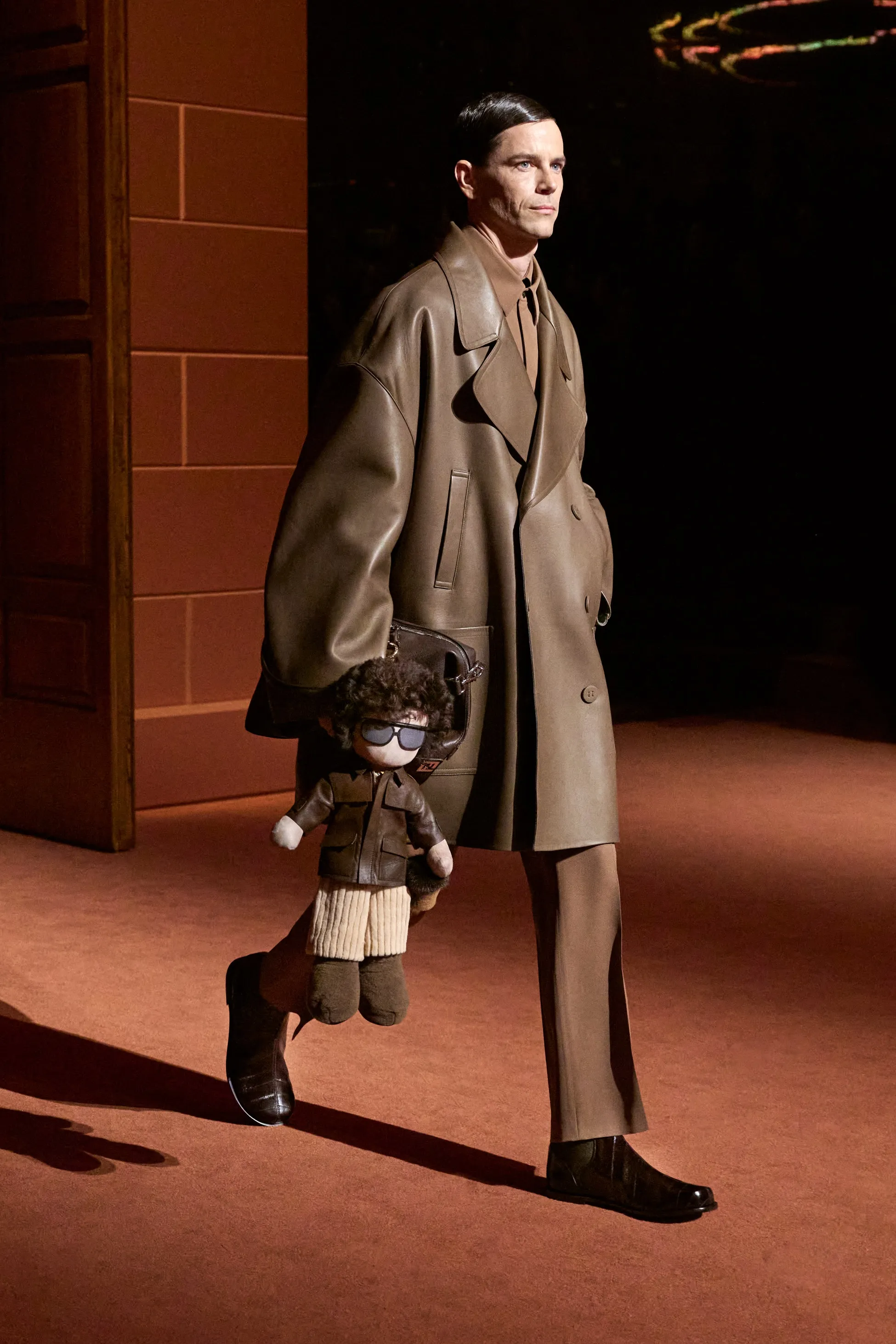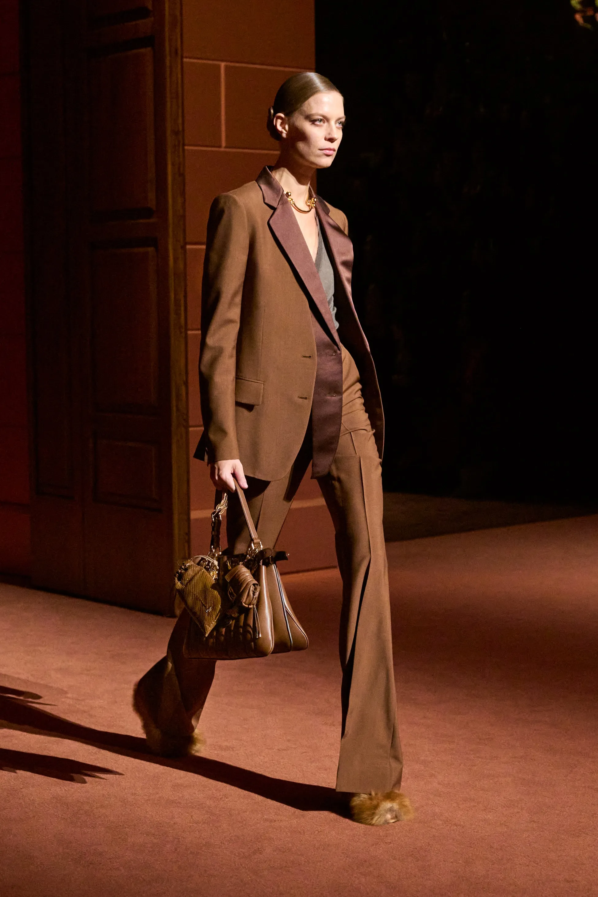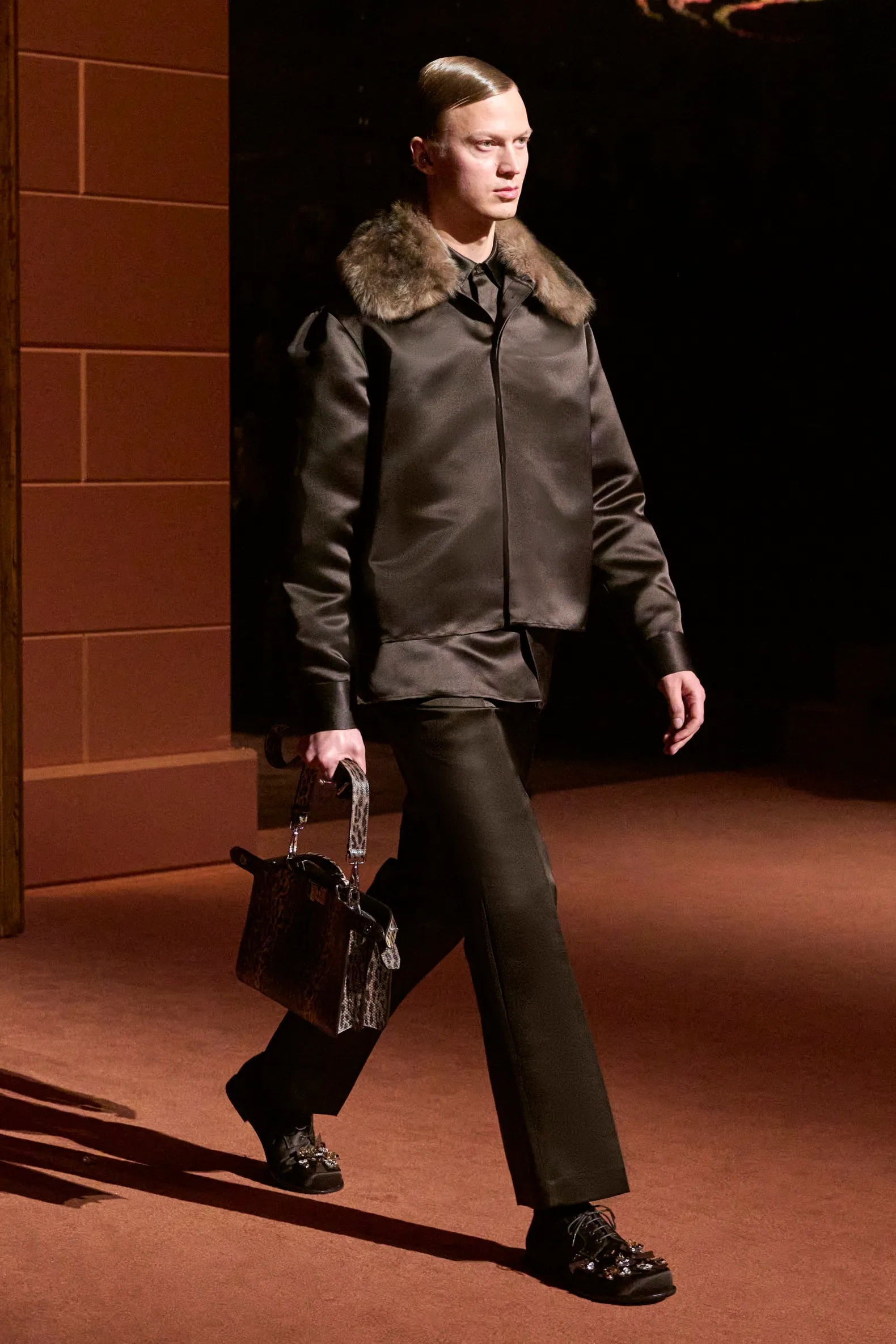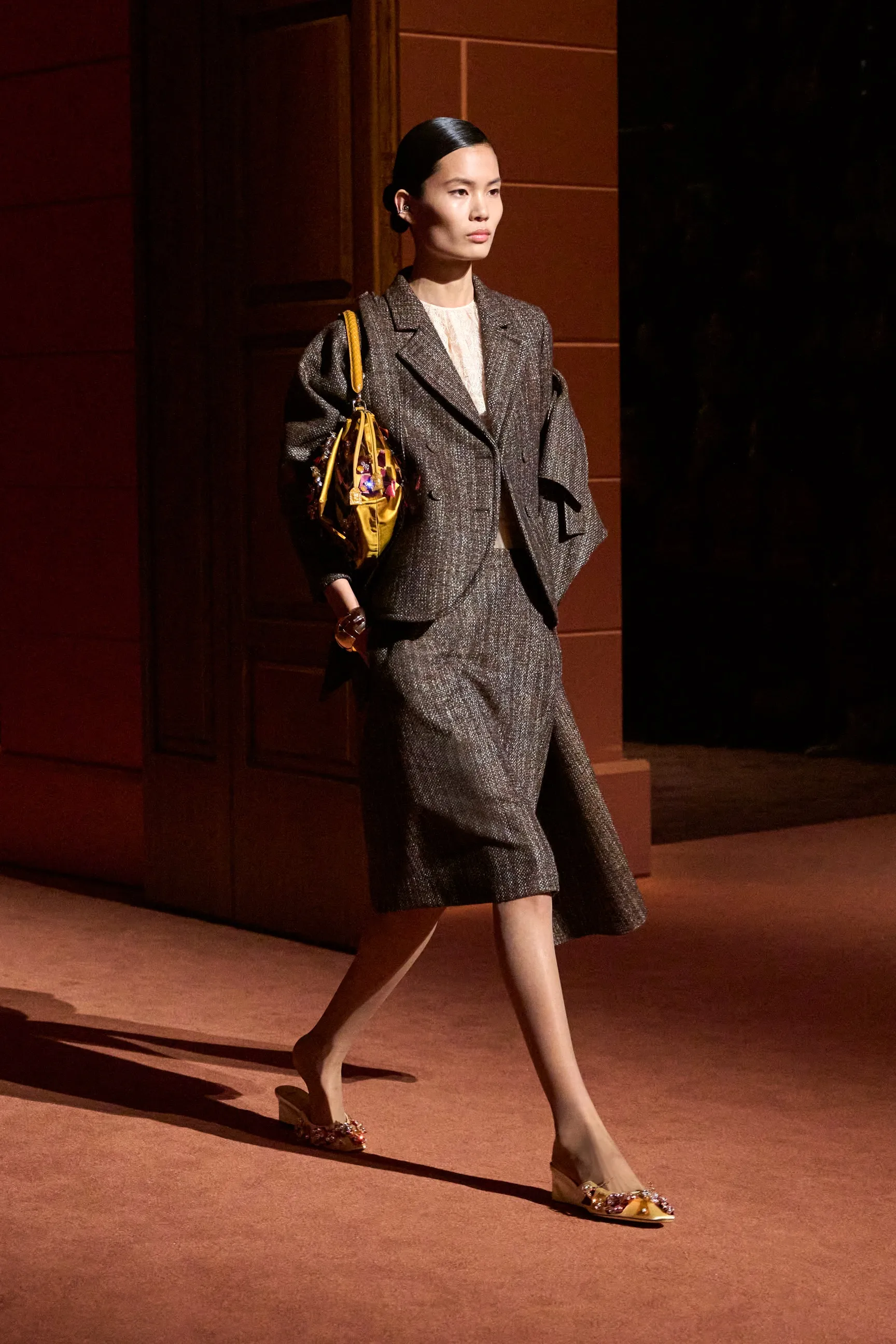 Pour la collection Fendi automne-hiver 2025-2026, Silvia Venturini Fendi active des souvenirs ludiques et profonds, célébrant 5 générations et 100 ans de la maison FENDI fondée à Rome par ses grands-parents, Edoardo Fendi et Adele Casagrande Fendi, en 1925. "Fendi me rappelle le futur. Je ne voulais pas m’attarder trop longtemps sur les archives physiques. Pour moi, Fendi 100 concerne davantage mes souvenirs personnels – réels ou imaginaires – de ce qu’était Fendi et de ce que Fendi signifie aujourd’hui", explique-t-elle. La collection rayonne entre ironie et humour avec sobriété et sensualité sous couvert d'une rigueur romaine. Les vêtements deviennent des personnages, et les personnages deviennent leurs vêtements, car les collections femme et homme sont entremêlées de traditions vestimentaires et de versions subversives de la sophistication italienne. Dès la silhouette d’ouverture, les textures primaires trompent l’œil. Un manteau évasé se porte comme une robe – son col haut et sa taille cintrée par une fine ceinture dorée. Les robes en maille plissée et côtelée marbrées se dissolvent dans des ourlets frisés, les patchworks de cuir d'anguille et d'agneau s'évasent dans les jupes trapèze à chevrons et les manteaux pour hommes coupés bruts s'enveloppent d'une martingale cachée à l'effet opératique.