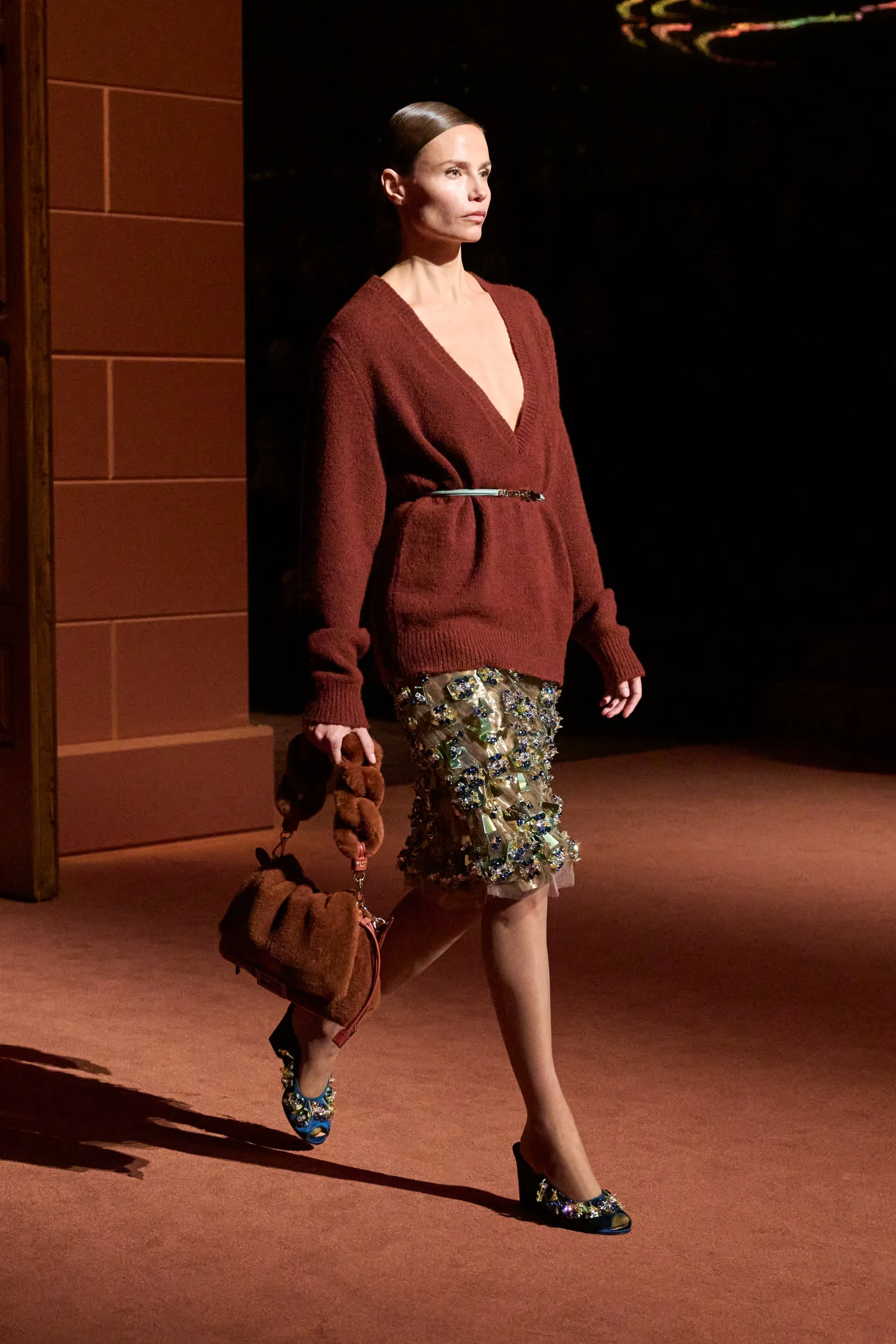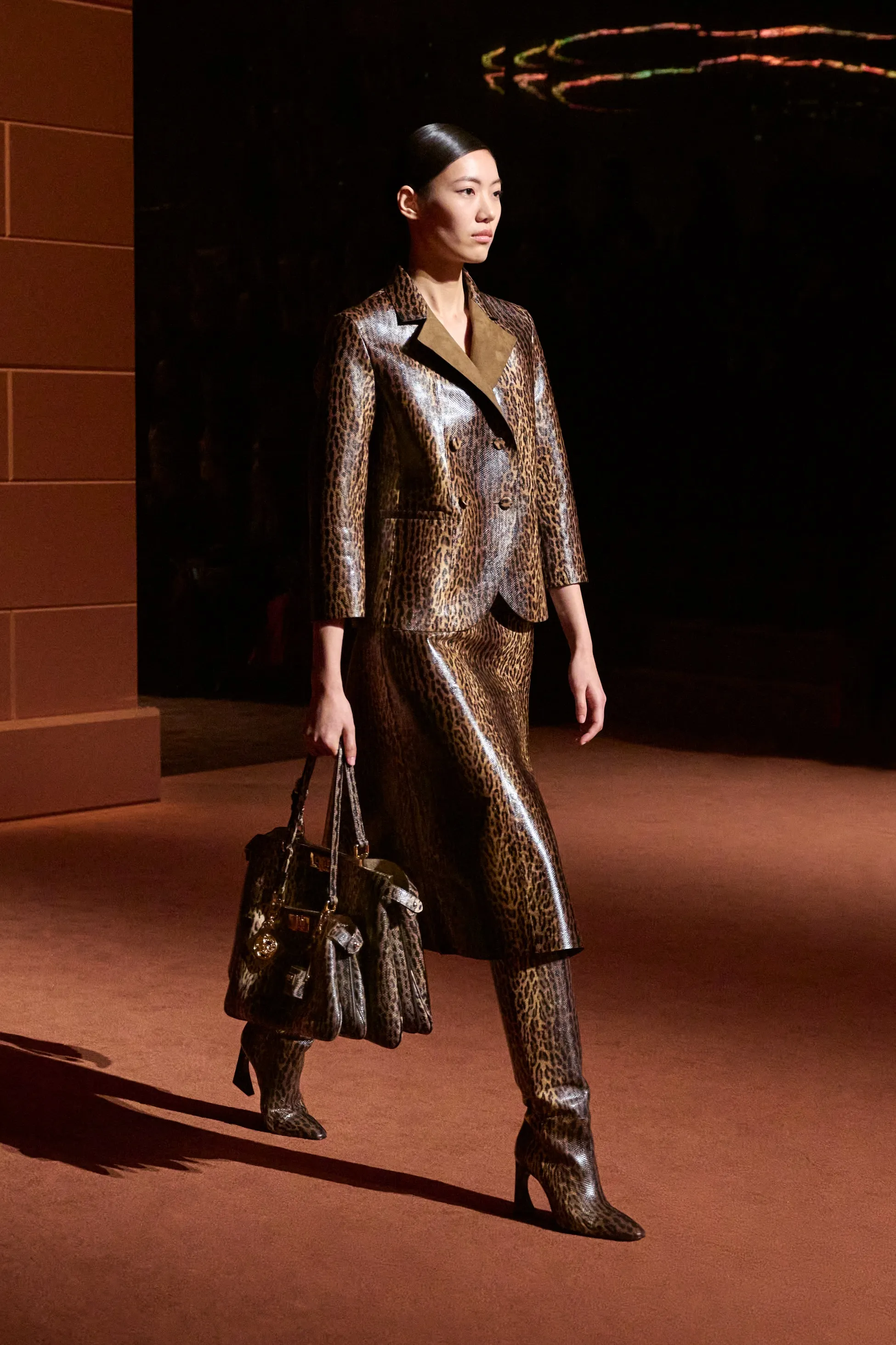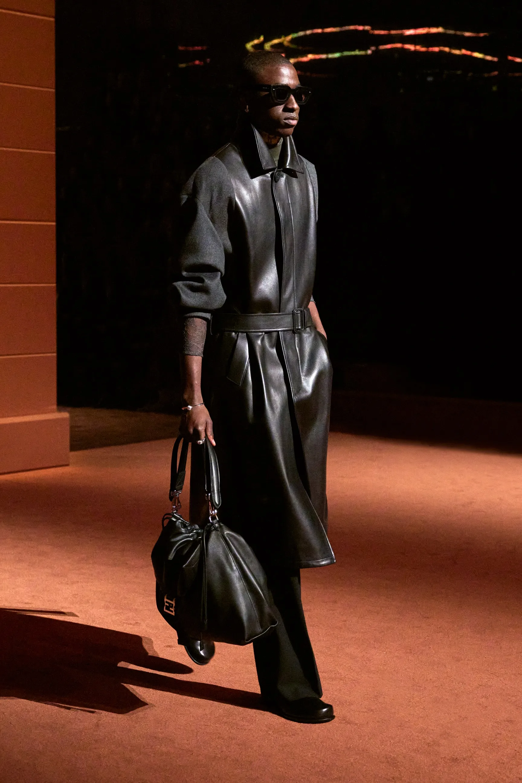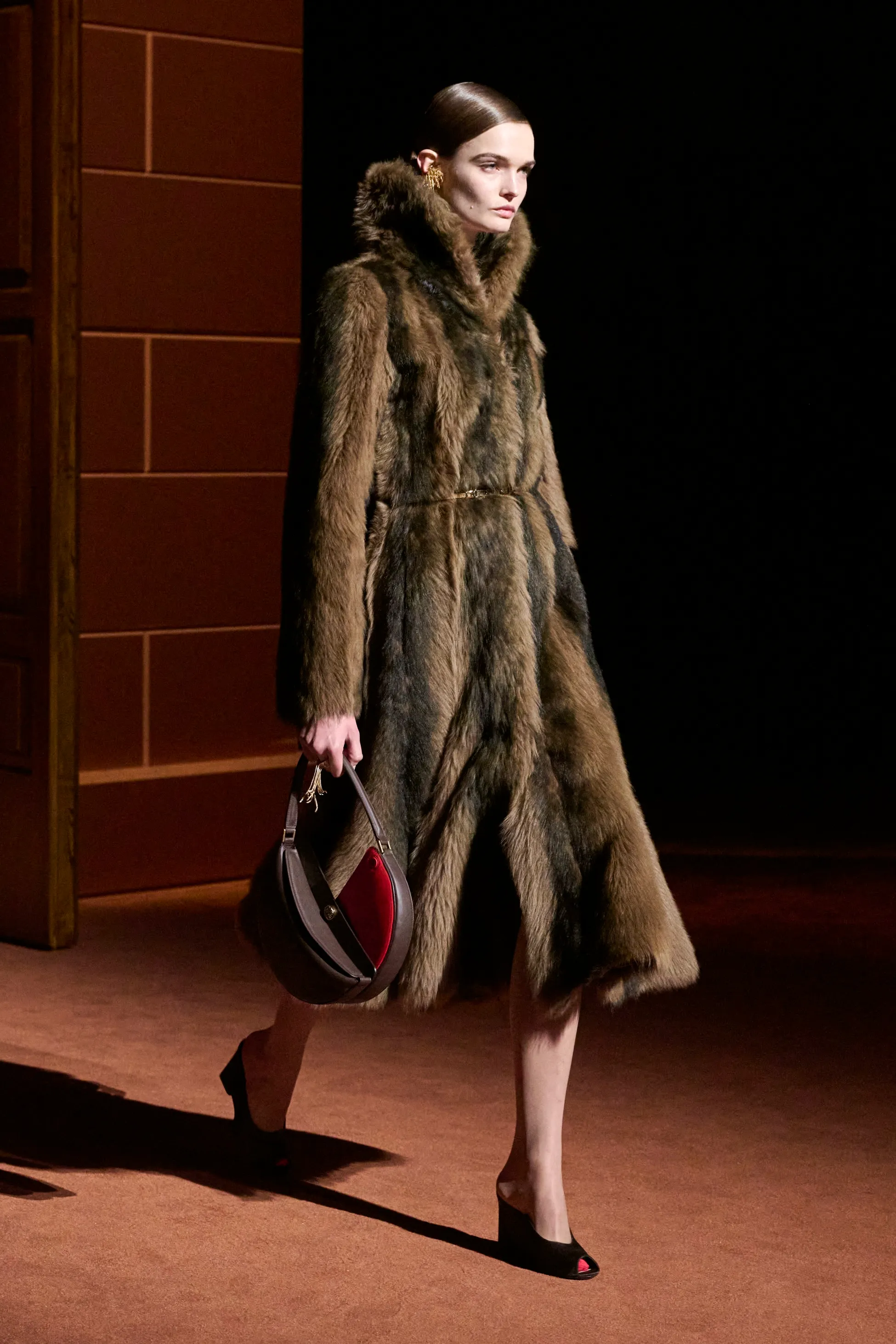 Pour la collection Fendi automne-hiver 2025-2026, Silvia Venturini Fendi active des souvenirs ludiques et profonds, célébrant 5 générations et 100 ans de la maison FENDI fondée à Rome par ses grands-parents, Edoardo Fendi et Adele Casagrande Fendi, en 1925. "Fendi me rappelle le futur. Je ne voulais pas m’attarder trop longtemps sur les archives physiques. Pour moi, Fendi 100 concerne davantage mes souvenirs personnels – réels ou imaginaires – de ce qu’était Fendi et de ce que Fendi signifie aujourd’hui", explique-t-elle. La collection rayonne entre ironie et humour avec sobriété et sensualité sous couvert d'une rigueur romaine. Les vêtements deviennent des personnages, et les personnages deviennent leurs vêtements, car les collections femme et homme sont entremêlées de traditions vestimentaires et de versions subversives de la sophistication italienne. Dès la silhouette d’ouverture, les textures primaires trompent l’œil. Un manteau évasé se porte comme une robe – son col haut et sa taille cintrée par une fine ceinture dorée. Les robes en maille plissée et côtelée marbrées se dissolvent dans des ourlets frisés, les patchworks de cuir d'anguille et d'agneau s'évasent dans les jupes trapèze à chevrons et les manteaux pour hommes coupés bruts s'enveloppent d'une martingale cachée à l'effet opératique.