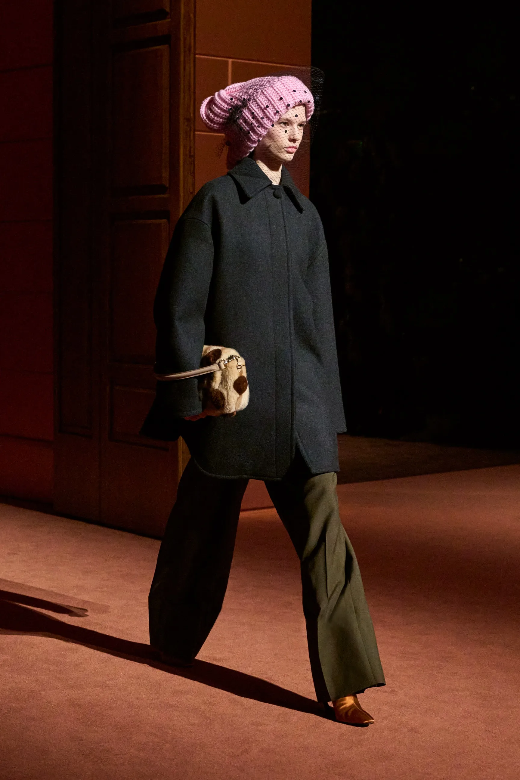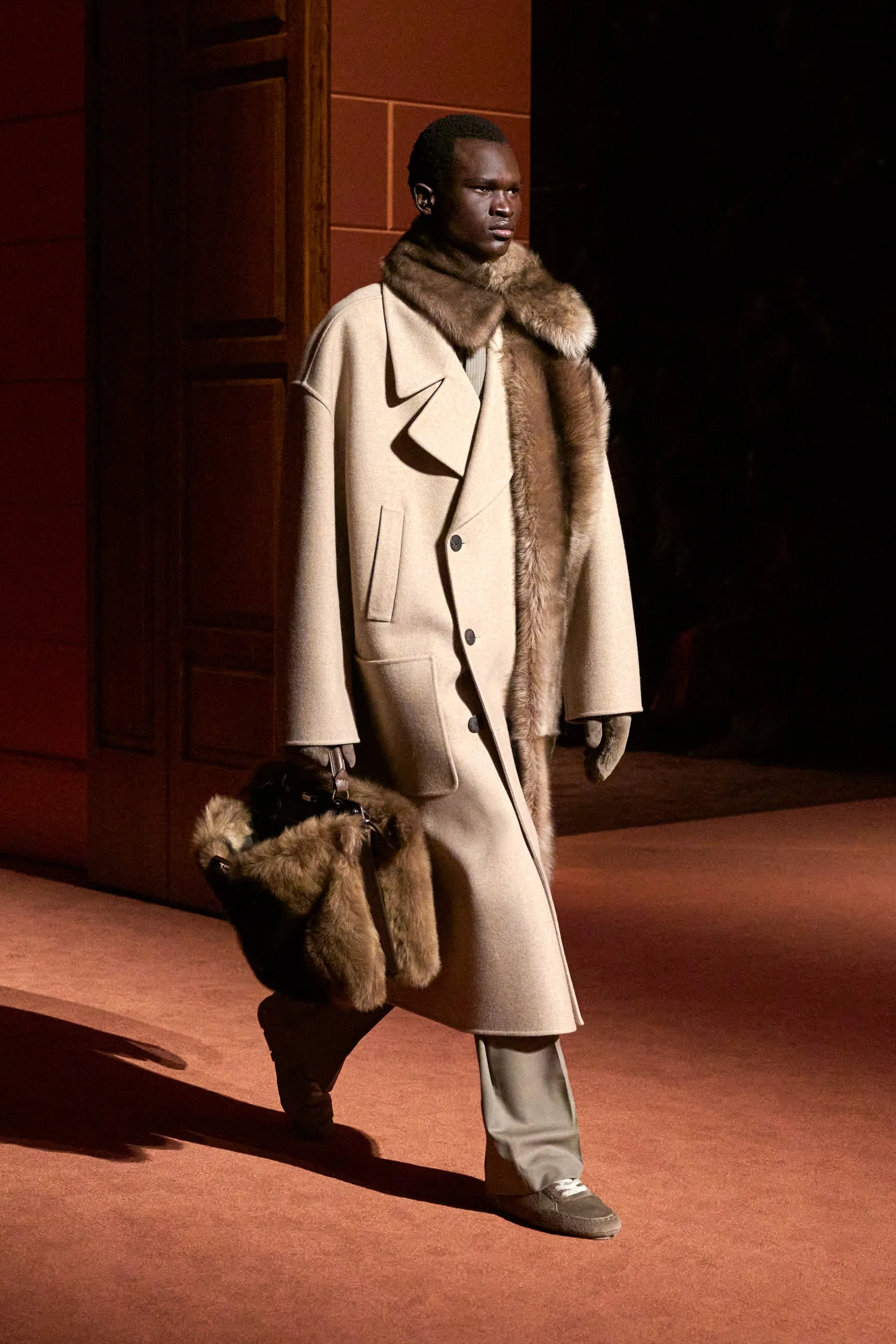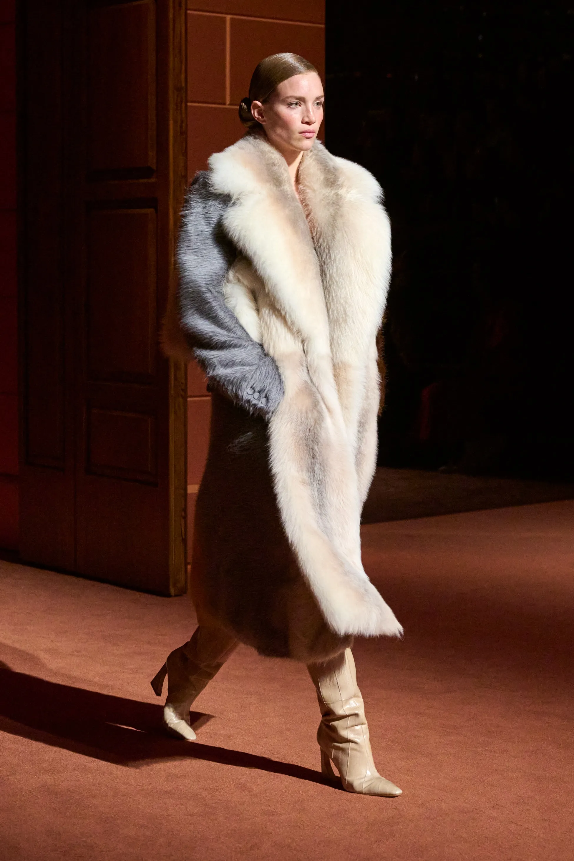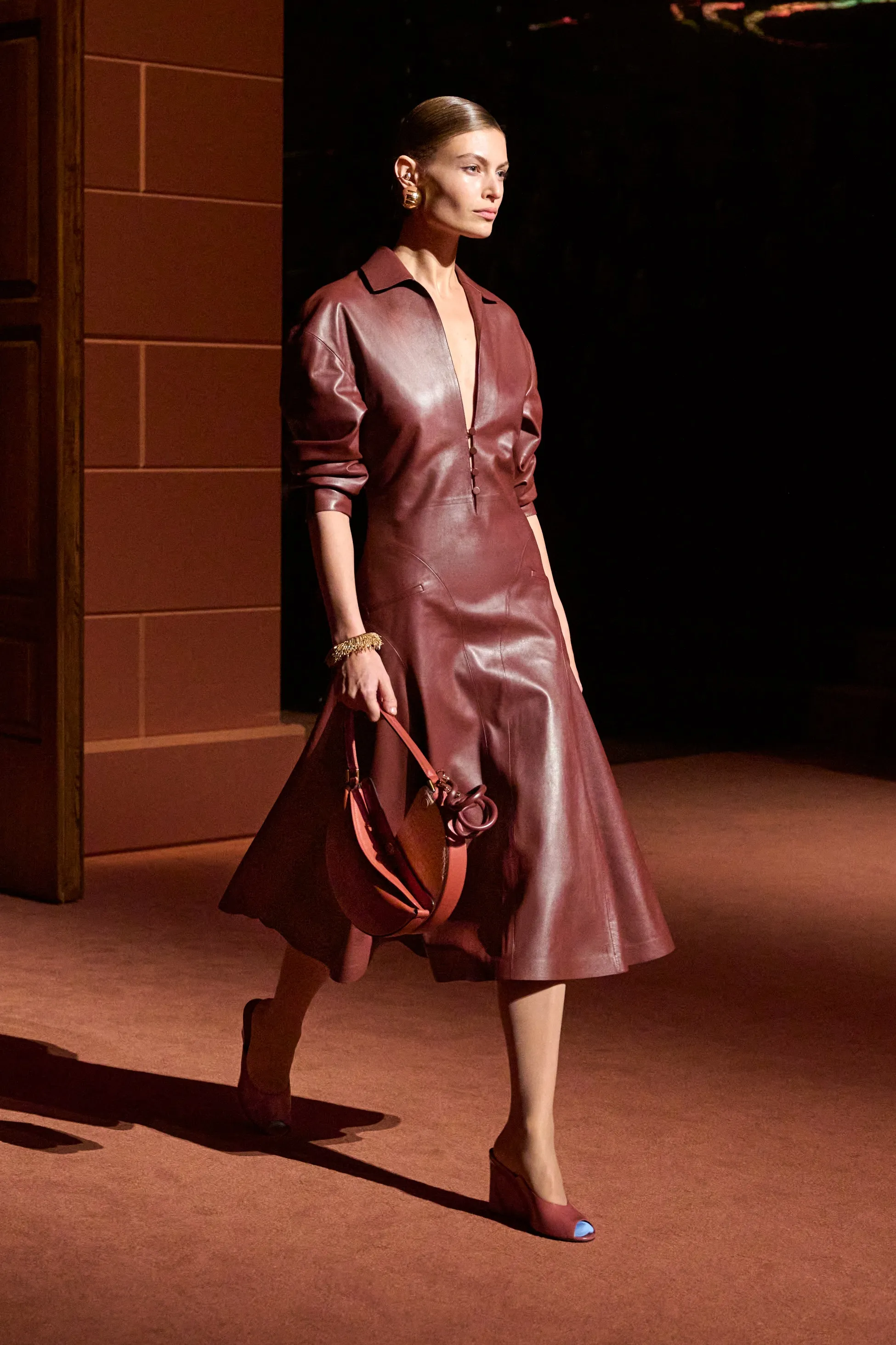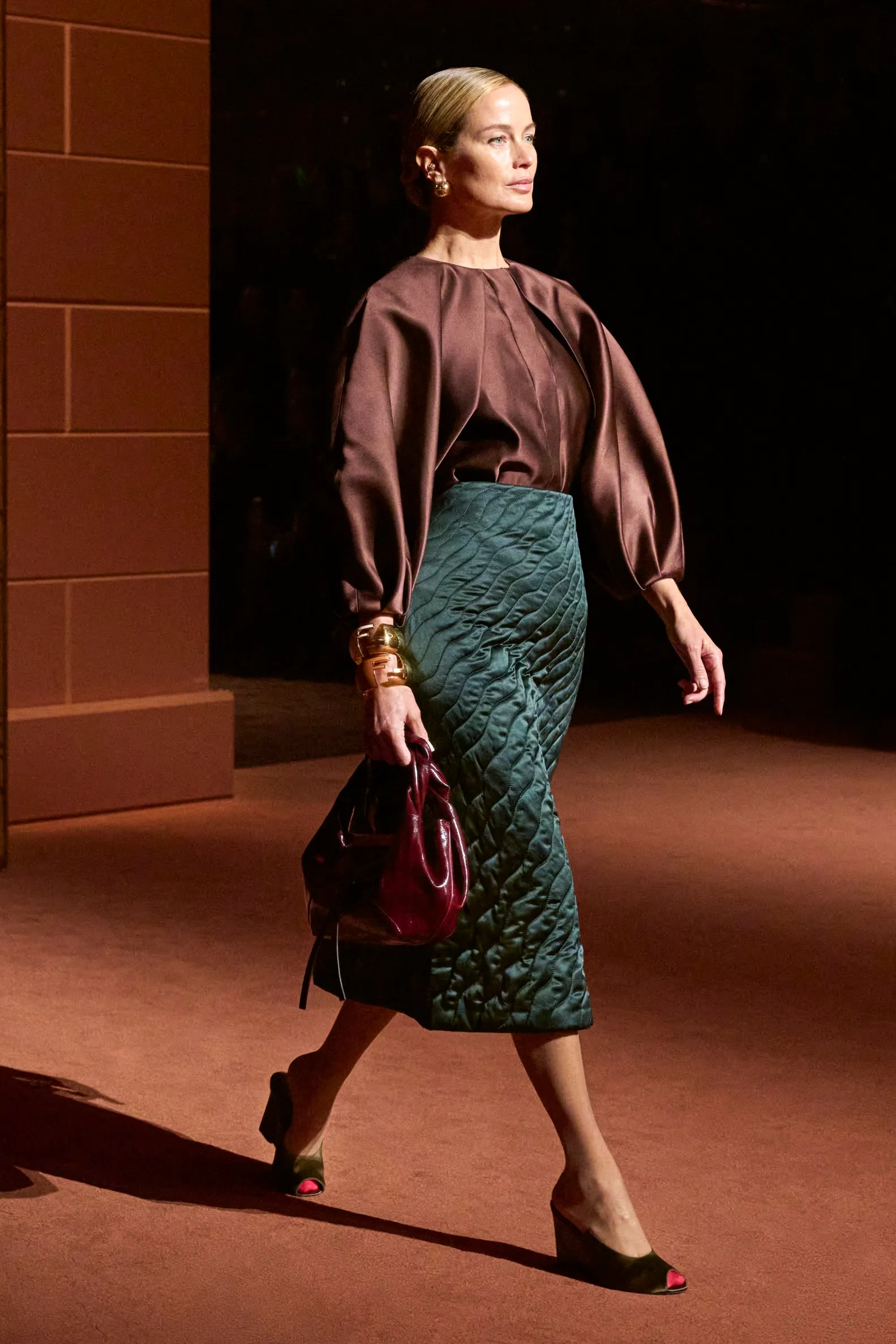 Pour la collection Fendi automne-hiver 2025-2026, Silvia Venturini Fendi active des souvenirs ludiques et profonds, célébrant 5 générations et 100 ans de la maison FENDI fondée à Rome par ses grands-parents, Edoardo Fendi et Adele Casagrande Fendi, en 1925. "Fendi me rappelle le futur. Je ne voulais pas m’attarder trop longtemps sur les archives physiques. Pour moi, Fendi 100 concerne davantage mes souvenirs personnels – réels ou imaginaires – de ce qu’était Fendi et de ce que Fendi signifie aujourd’hui", explique-t-elle. La collection rayonne entre ironie et humour avec sobriété et sensualité sous couvert d'une rigueur romaine. Les vêtements deviennent des personnages, et les personnages deviennent leurs vêtements, car les collections femme et homme sont entremêlées de traditions vestimentaires et de versions subversives de la sophistication italienne. Dès la silhouette d’ouverture, les textures primaires trompent l’œil. Un manteau évasé se porte comme une robe – son col haut et sa taille cintrée par une fine ceinture dorée. Les robes en maille plissée et côtelée marbrées se dissolvent dans des ourlets frisés, les patchworks de cuir d'anguille et d'agneau s'évasent dans les jupes trapèze à chevrons et les manteaux pour hommes coupés bruts s'enveloppent d'une martingale cachée à l'effet opératique.