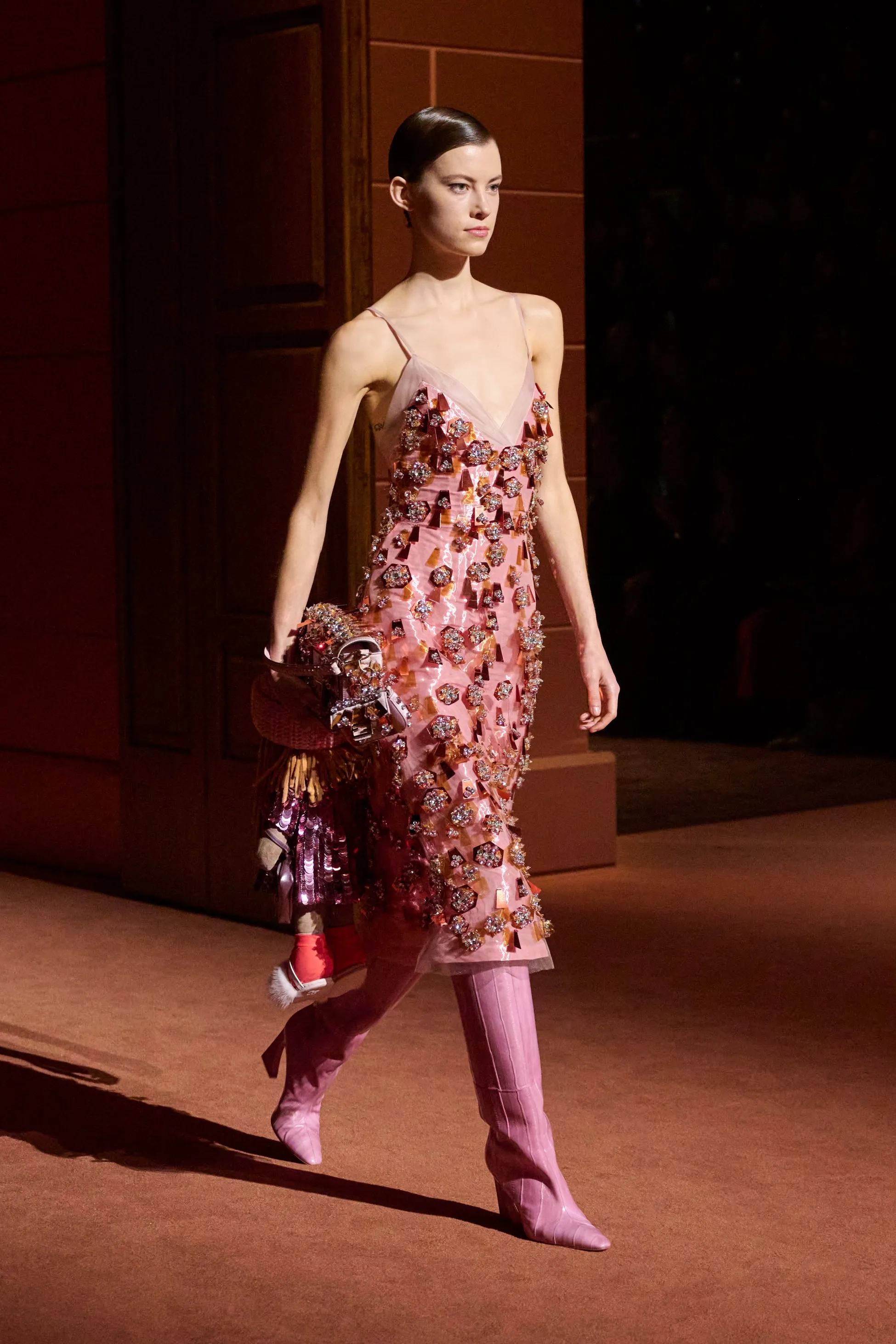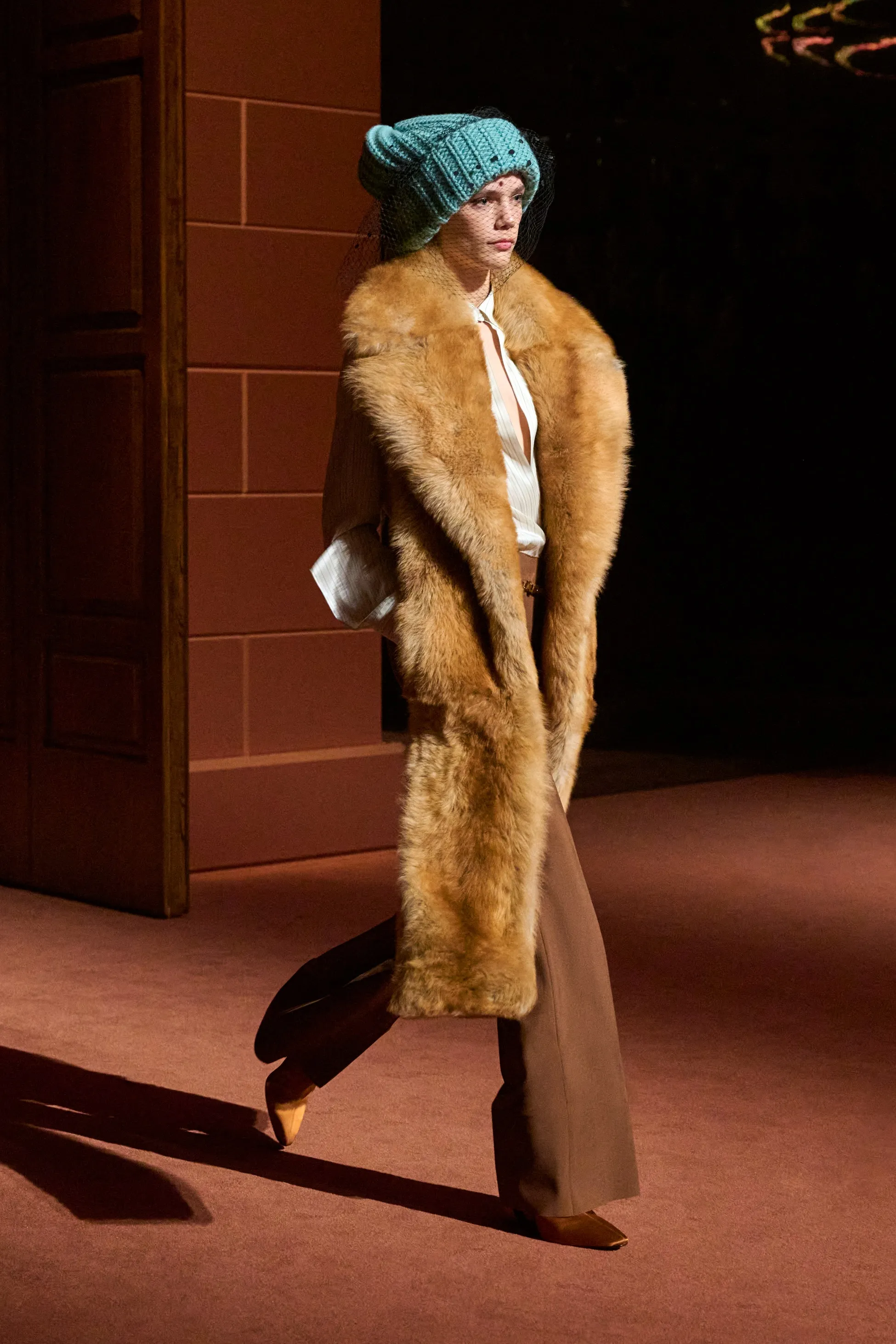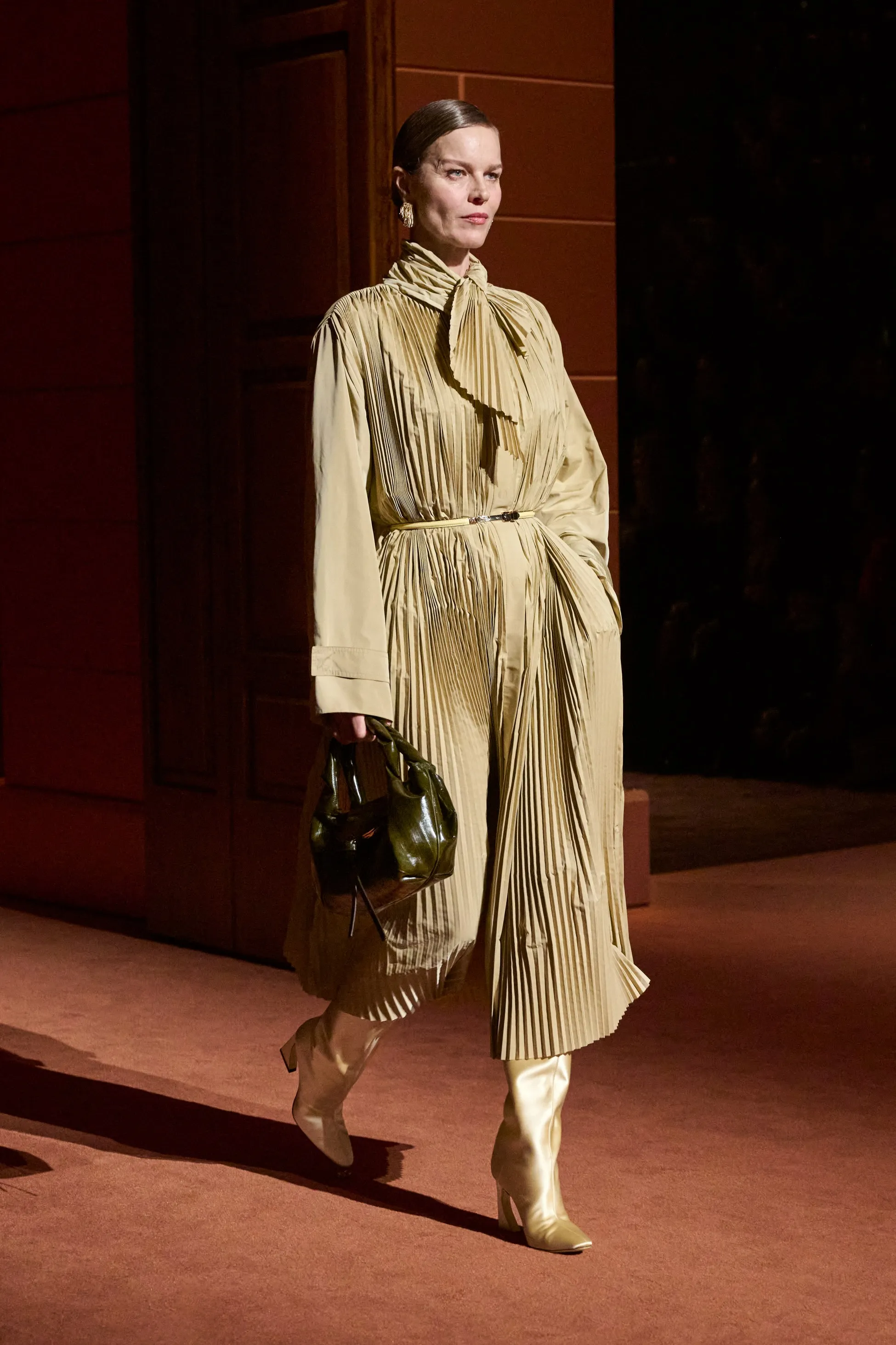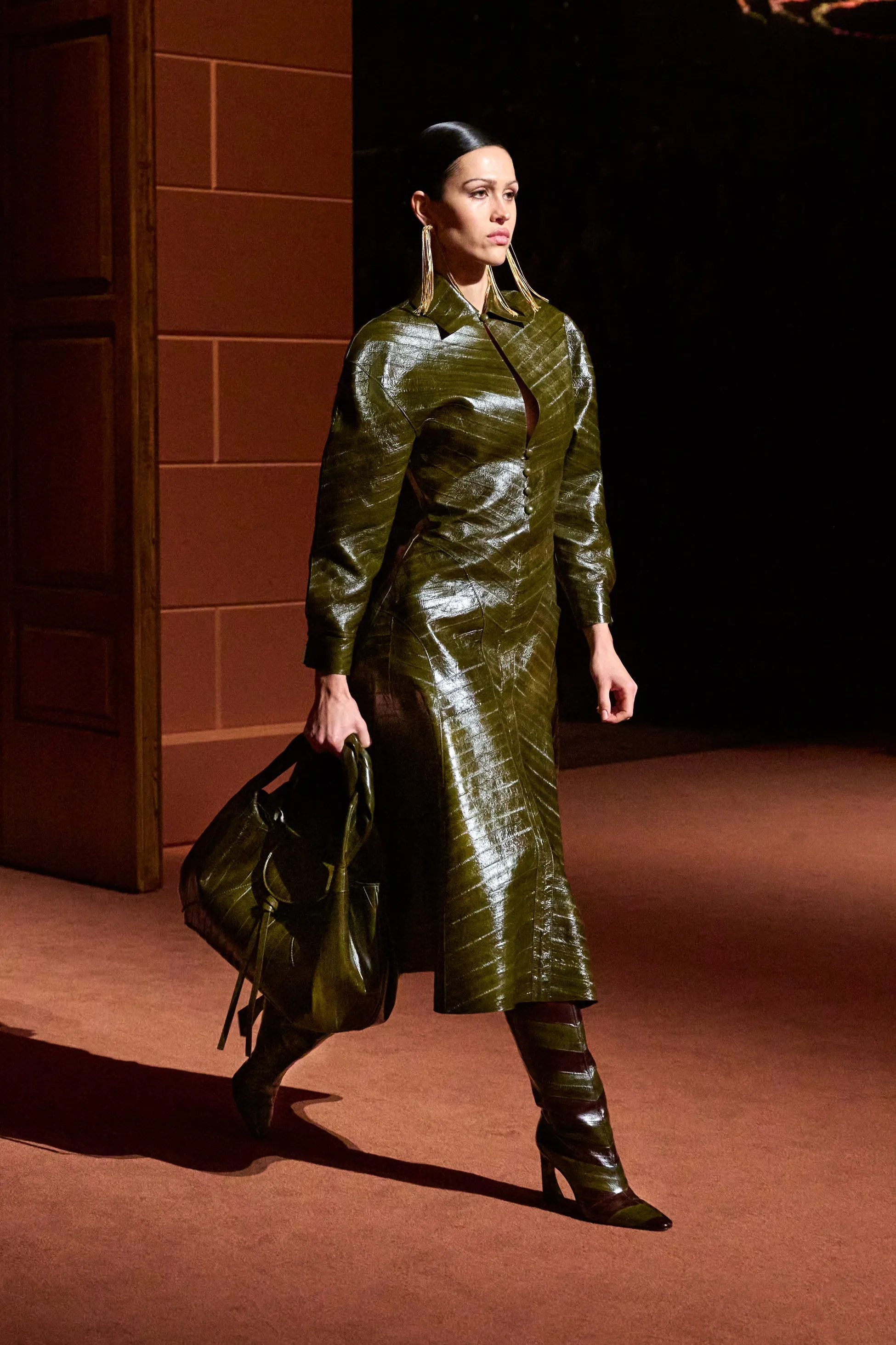 Pour la collection Fendi automne-hiver 2025-2026, Silvia Venturini Fendi active des souvenirs ludiques et profonds, célébrant 5 générations et 100 ans de la maison FENDI fondée à Rome par ses grands-parents, Edoardo Fendi et Adele Casagrande Fendi, en 1925. "Fendi me rappelle le futur. Je ne voulais pas m’attarder trop longtemps sur les archives physiques. Pour moi, Fendi 100 concerne davantage mes souvenirs personnels – réels ou imaginaires – de ce qu’était Fendi et de ce que Fendi signifie aujourd’hui", explique-t-elle. La collection rayonne entre ironie et humour avec sobriété et sensualité sous couvert d'une rigueur romaine. Les vêtements deviennent des personnages, et les personnages deviennent leurs vêtements, car les collections femme et homme sont entremêlées de traditions vestimentaires et de versions subversives de la sophistication italienne. Dès la silhouette d’ouverture, les textures primaires trompent l’œil. Un manteau évasé se porte comme une robe – son col haut et sa taille cintrée par une fine ceinture dorée. Les robes en maille plissée et côtelée marbrées se dissolvent dans des ourlets frisés, les patchworks de cuir d'anguille et d'agneau s'évasent dans les jupes trapèze à chevrons et les manteaux pour hommes coupés bruts s'enveloppent d'une martingale cachée à l'effet opératique.