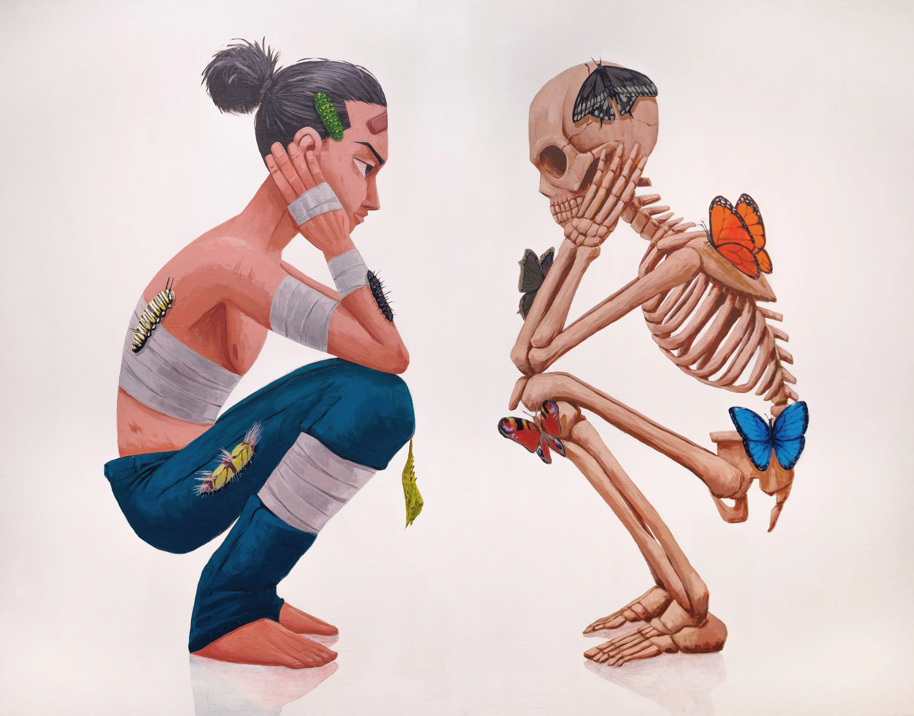 Ça vient de la phrase en italien : "Tutto passa", qui veut dire que tout est voué à passer. Je trouve ça rassurant de se dire que les bons moments, comme les mauvais, sont voués à passer. Je l’ai relié à l’épreuve de la mort et à la certitude, parce que dans le Coran, la mort est désignée comme la certitude. La seule chose dont on est sûrs, c’est qu’on va mourir un jour. Toute l’exposition parle des épreuves, mais elle prône un certain stoïcisme. Il y a un personnage qui pleure, un personnage qui souffre, parce qu’on a le droit de pleurer, c’est humain, mais ce n’est pas la fin, il faut essayer d’affronter la chose et d’avancer. Sur ce tableau, il y a certain stoïcisme, le personnage regarde la mort et il est serein, il accepte un peu son destin. Autour de lui, la vie continue, les papillons et les chenilles représentent la nature et l’évolution. L’idée, c’est de montrer qu’on n’est pas grand-chose, des petites poussières à l’échelle de l’univers, qu’il y aura une vie avant et après nous, et que ça ne sert à rien de se faire une montagne pour des choses insignifiantes. Même si on ne dirait pas comme ça, je pense que c’est le tableau le plus optimiste de l’exposition.