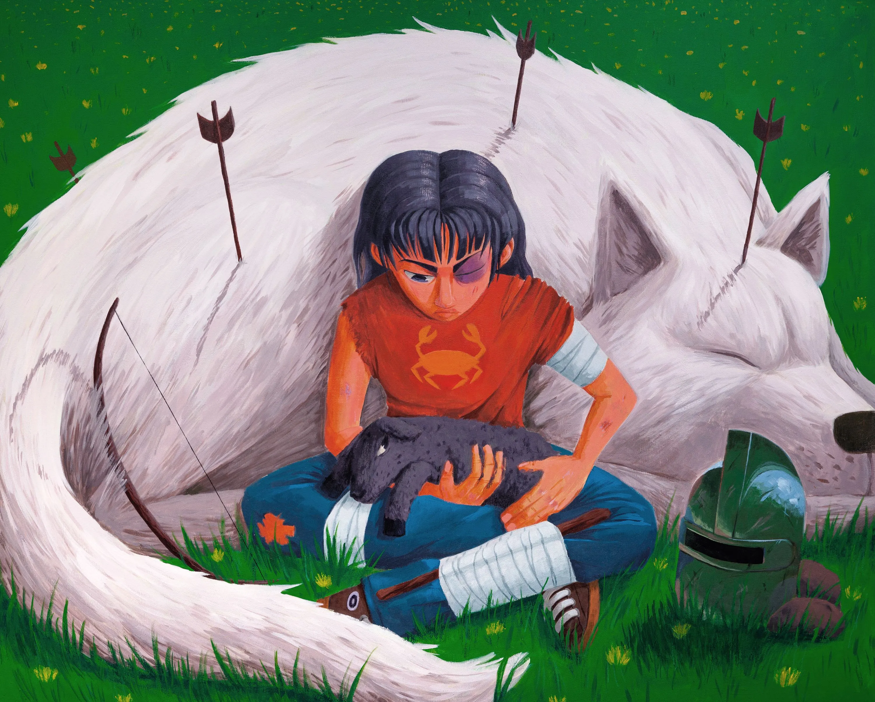 Cette œuvre-là, c’est une allégorie du capitalisme et de notre rapport à la nature. Tout le monde me parle de l’inspiration de "Princesse Mononoké" des studios Ghibli, mais je n’avais pas forcément prévu de faire le loup en blanc, ce n’était pas une référence, et la vraie narration, c’est que la petite fille s’est battue contre le loup pour sauver l’agneau. J’avais envie d’inverser le fait que le blanc représente la pureté, et le noir le mal, en choisissant de le faire en blanc. Pour condenser un peu, le loup représente le capitalisme, mais il représente surtout toutes ces forces qui nous empêchent de disposer de notre temps comme on veut. Ça passe beaucoup par le système capitaliste, dans le sens où on est poussés à une recherche du profit, à une compétition, au détriment de nos aspirations à nous et de notre rapport à la nature. Le loup a l’air assez neutre parce qu’on ne peut pas mettre de visage sur le capitalisme. Comme un animal, c’est quelque chose qui n’a pas de sentiments, il fait ce qu’il doit faire, il répond à son instinct. Toute cette histoire, ça me faisait penser à l’expression "rat race" en anglais, l’équivalent français du "panier de crabes". C’est le fait, qu’on évolue - dans un panier de crabes ou dans un petit labyrinthe de rat - dans un cadre extrêmement limitant mais qu’on nous présente comme étant le seul horizon. Et on ne cherche pas à aller au-delà, voire dans le cadre du panier de crabes, on se marche dessus les uns les autres au lieu de faire preuve d’intelligence collective pour s’élever mutuellement et sortir. D’où le crabe sur le t-shirt de la fille, c’est un crabe qui a réussi à sortir du panier. Enfin, pour l’agneau, j’étais tombé sur la chaîne Youtube d’un gars qui vit à la campagne et qui recueille des bébés animaux qu’il soigne – Bon, c’est beaucoup moins profond que le reste ! [Rires] Mais je me disais, c’est ça la vraie vie ! La vie, ce n’est pas remplir des tableaux Excel.
